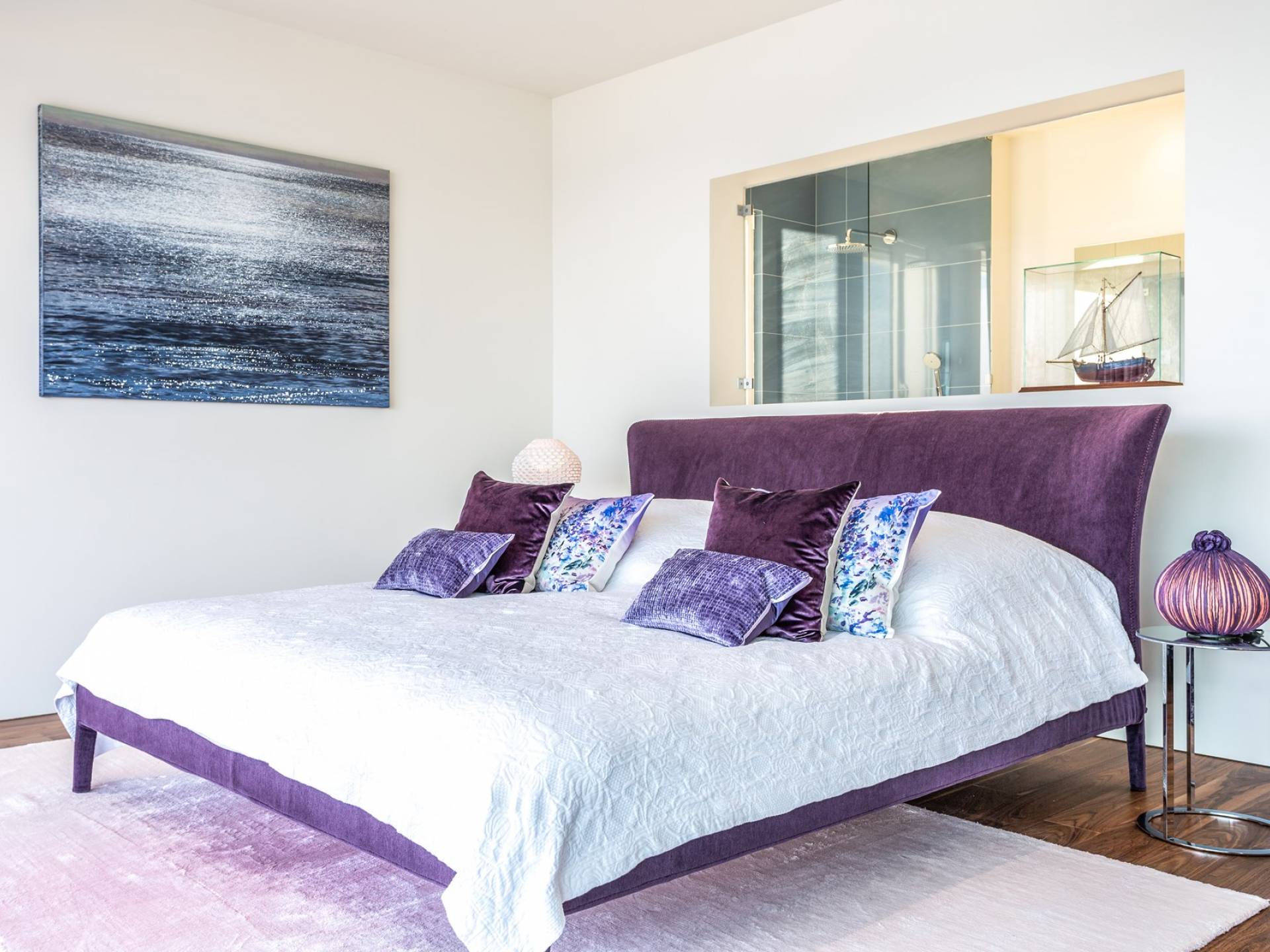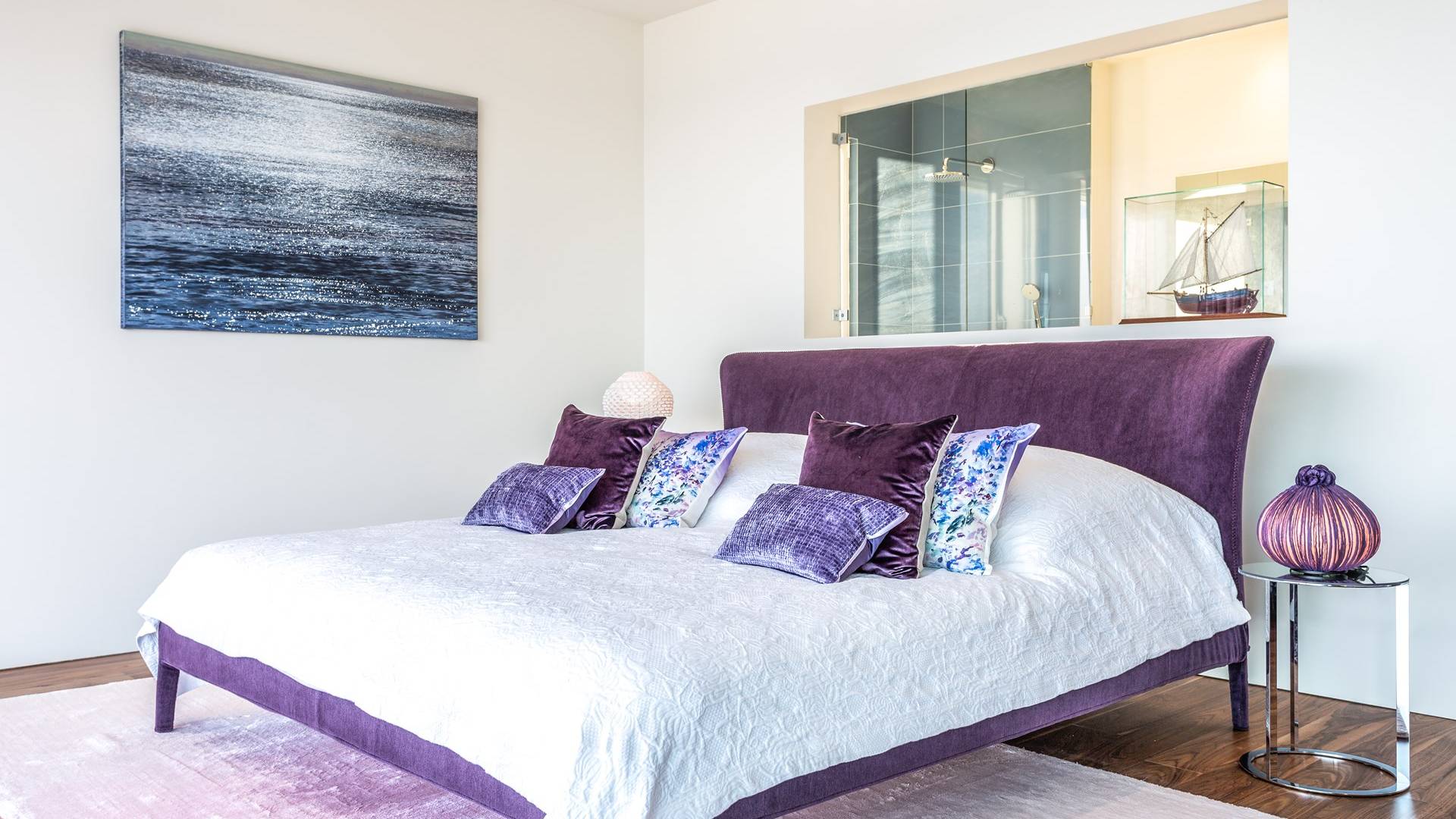 A la izquierda, el dormitorio principal, que cuenta con una cama doble grande, TV de pantalla plana, baño / ducha en suite, baño de vapor y bañera independiente, todos con impresionantes vistas frontales al agua.