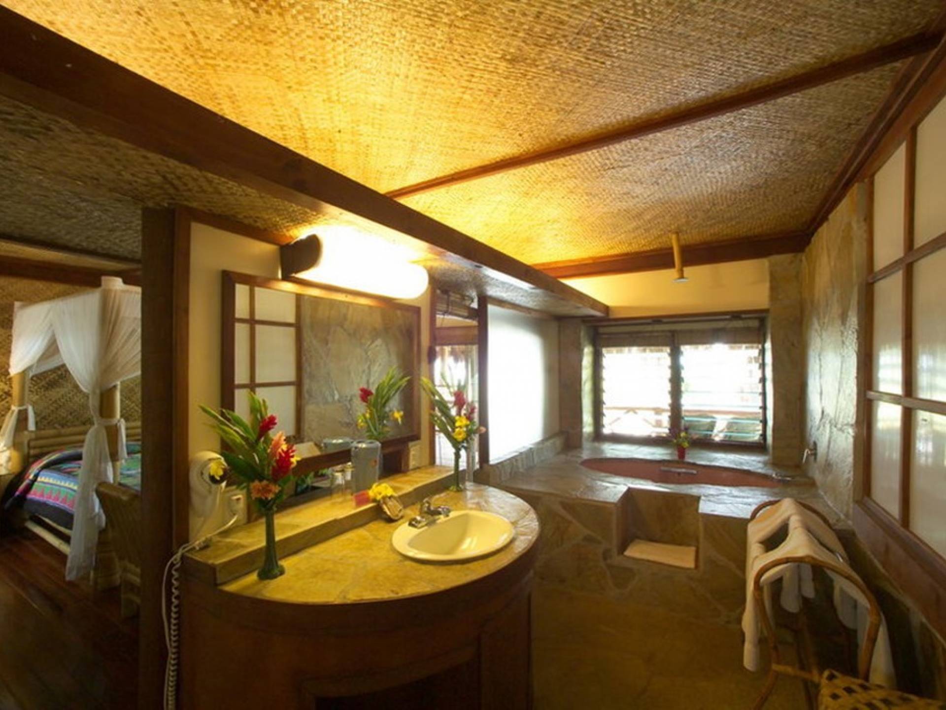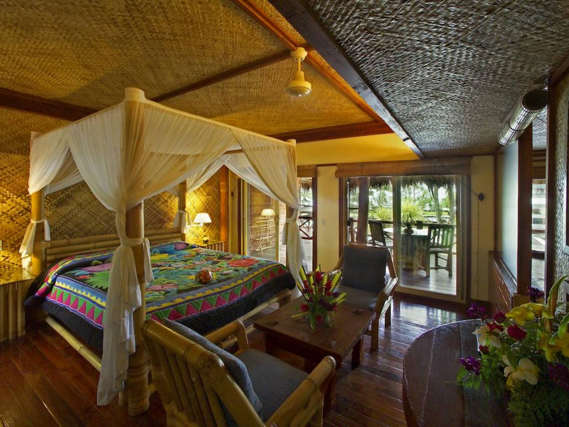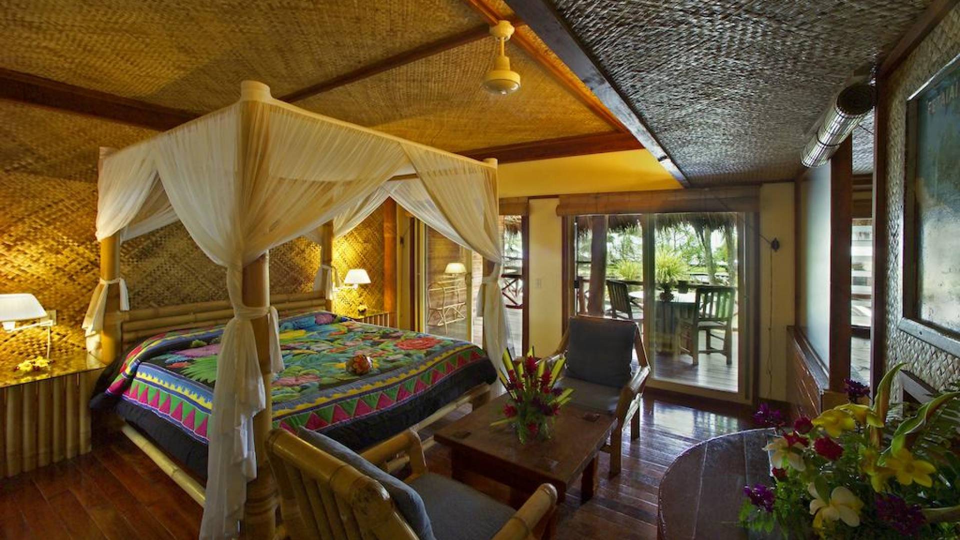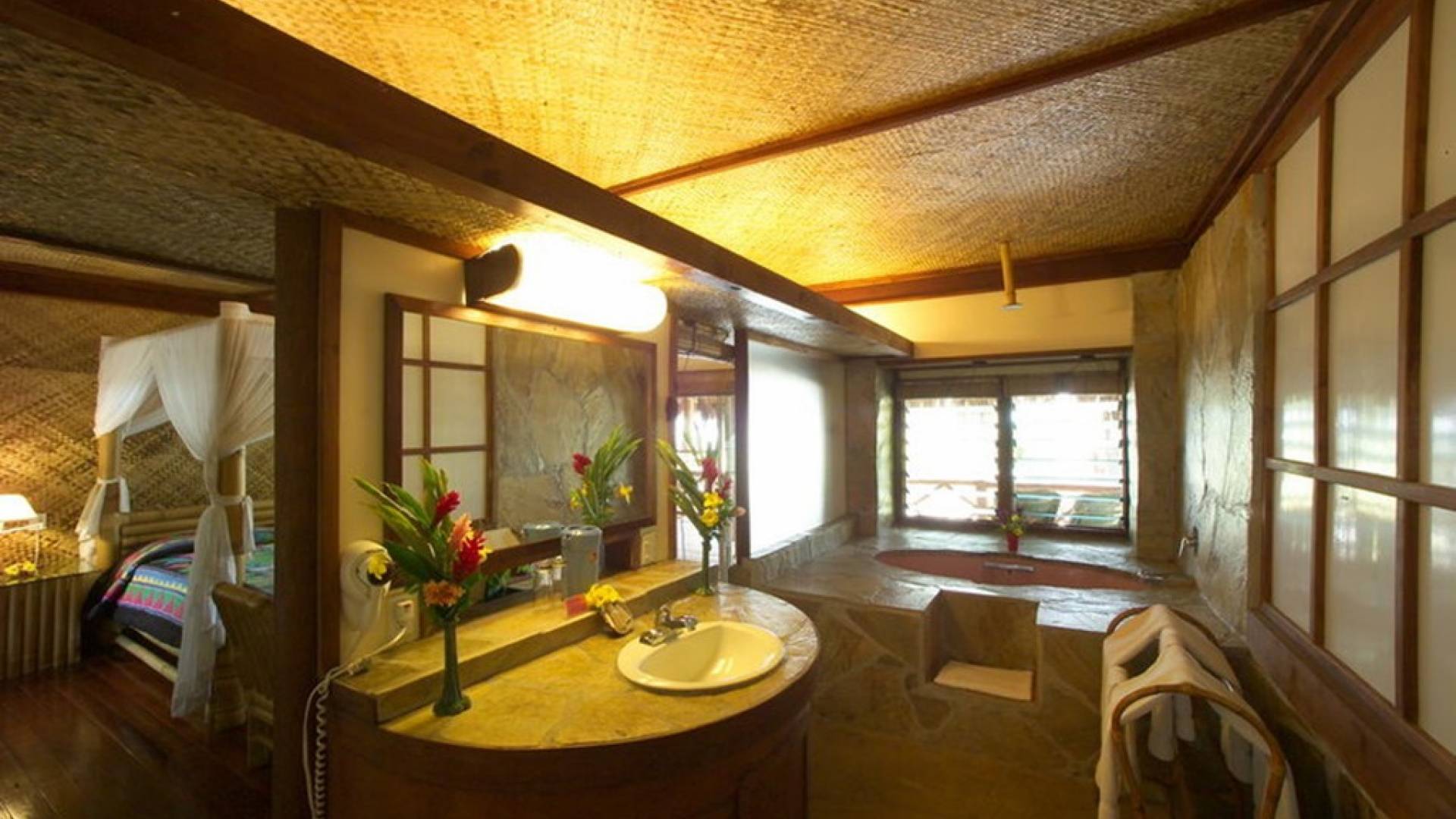 El famoso Treehouse Building con vista al mar ha sido durante mucho tiempo uno de los favoritos de los Returns Nuts y ofrece un alojamiento espacioso y vistas impresionantes. Con su entrada a la jungla y la copa de los árboles, las suites con estilo distintivo cuentan con pisos de madera y pizarra, decoración polinesia, aire acondicionado y amplias terrazas con cómodas tumbonas y hamacas privadas. El espacioso dormitorio cuenta con camas de bambú con dosel, ya sea con una cama king-size (habitaciones de arriba) o una cama doble y una cama individual (habitaciones de abajo). Los baños de estilo único cuentan con hermosos pisos y paredes de piedra de cuarcita, y una bañera para dos personas con ducha en cascada, ¡y una vista increíble!