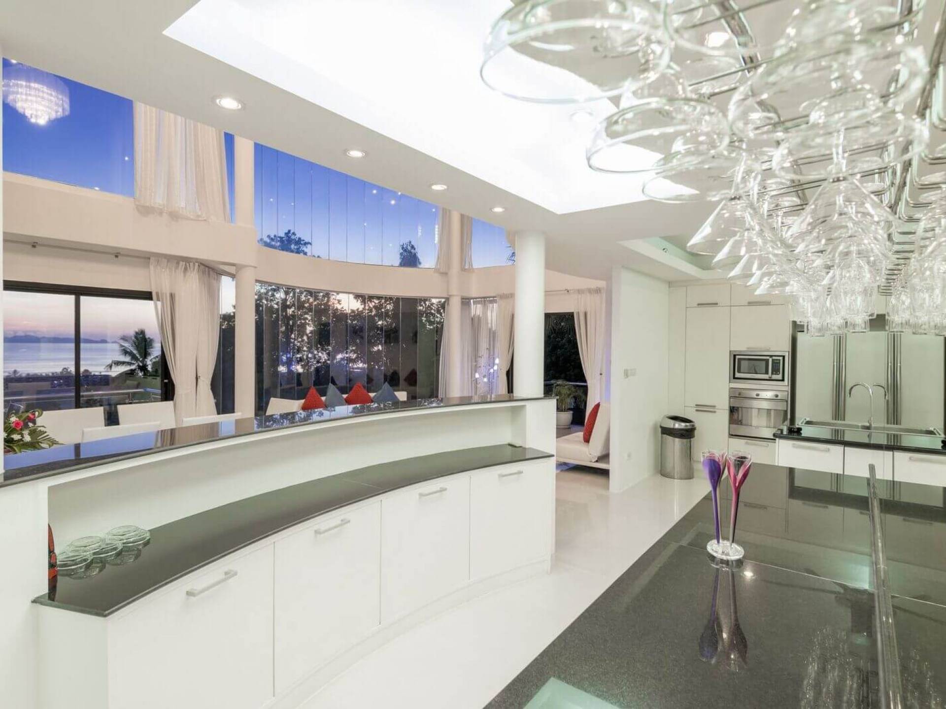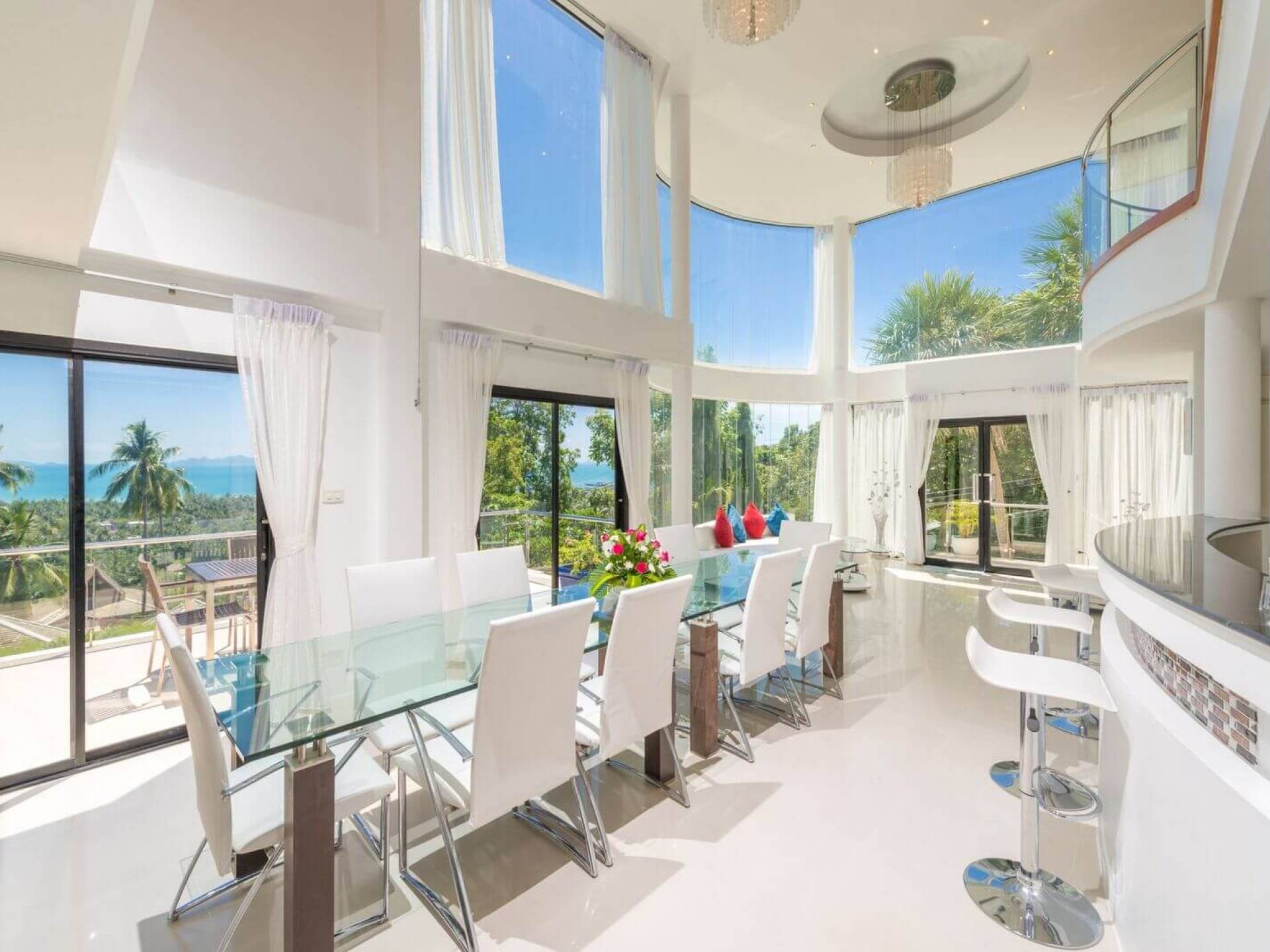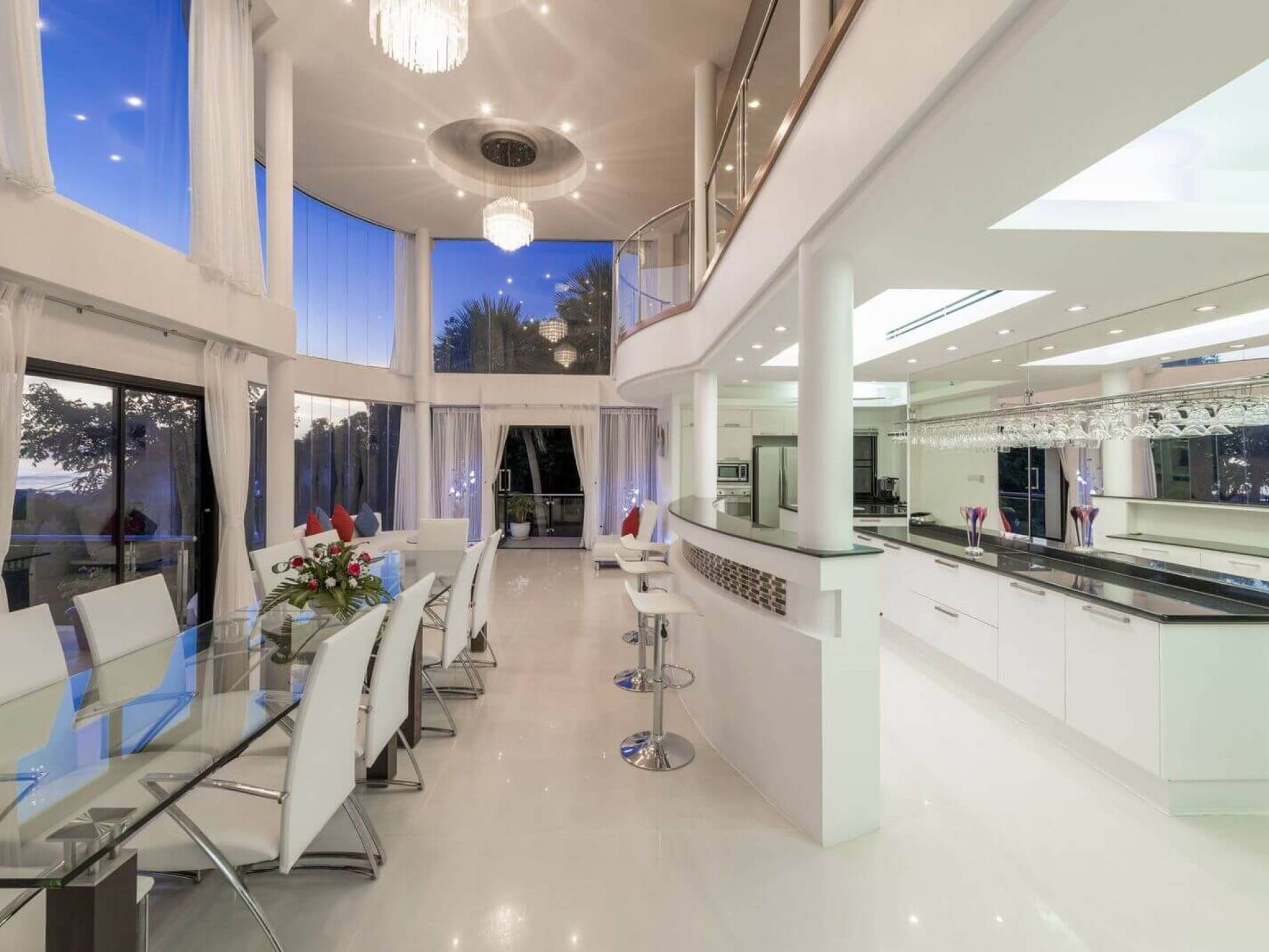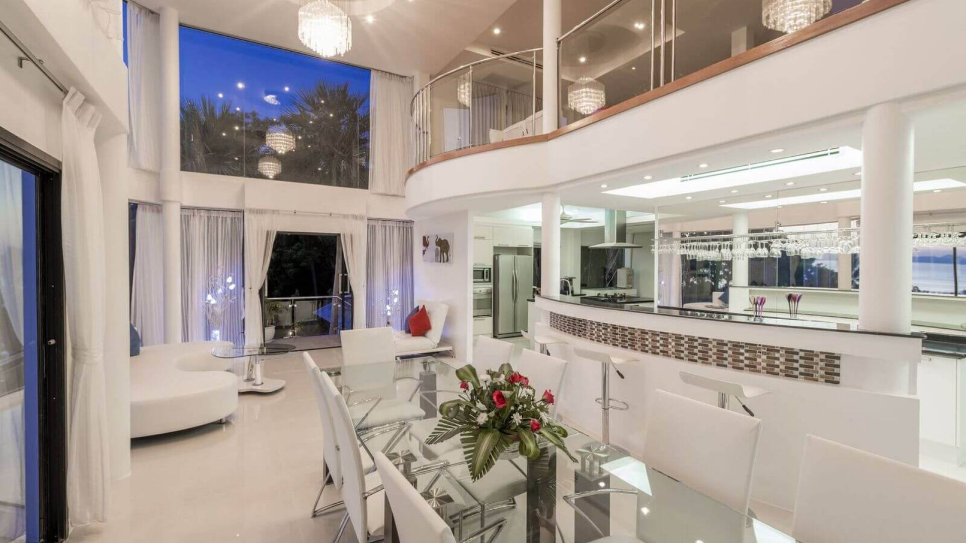 La grandeza de Villa White Stone Samui se hace evidente de manera asombrosa por los lujosos adornos y dos exquisitos candelabros que cuelgan del alto techo de la sala de estar. El elegante sofá blanco se apoya sobre paneles de vidrio de cuerpo entero que permiten una vista espectacular de uno de los fondos más pintorescos que jamás haya visto. La exuberante vegetación del exterior pinta el tema blanco predominantemente sofisticado de esta sala de estar. Por supuesto, usted tiene el control de su propio paisaje de vacaciones, por lo que si desea un tiempo más tenue lejos de la luz del sol, simplemente cierre sus inmaculadas cortinas blancas. Un equilibrio perfecto entre estilo y comodidad.