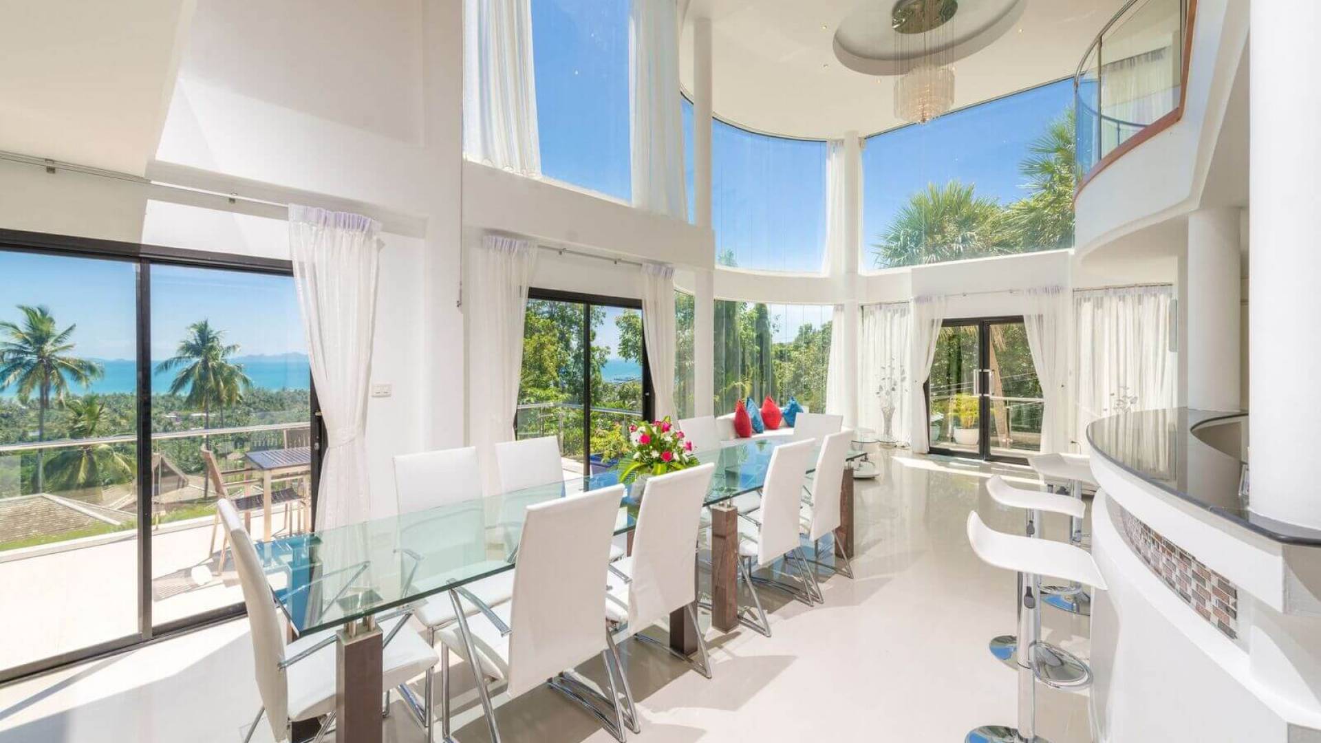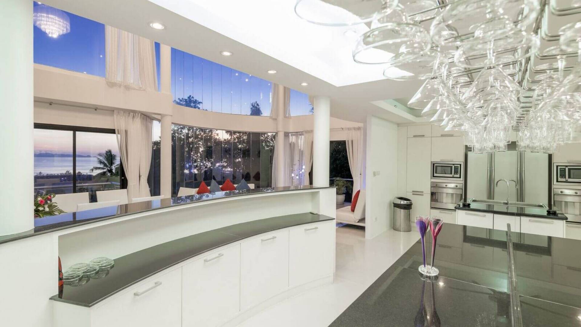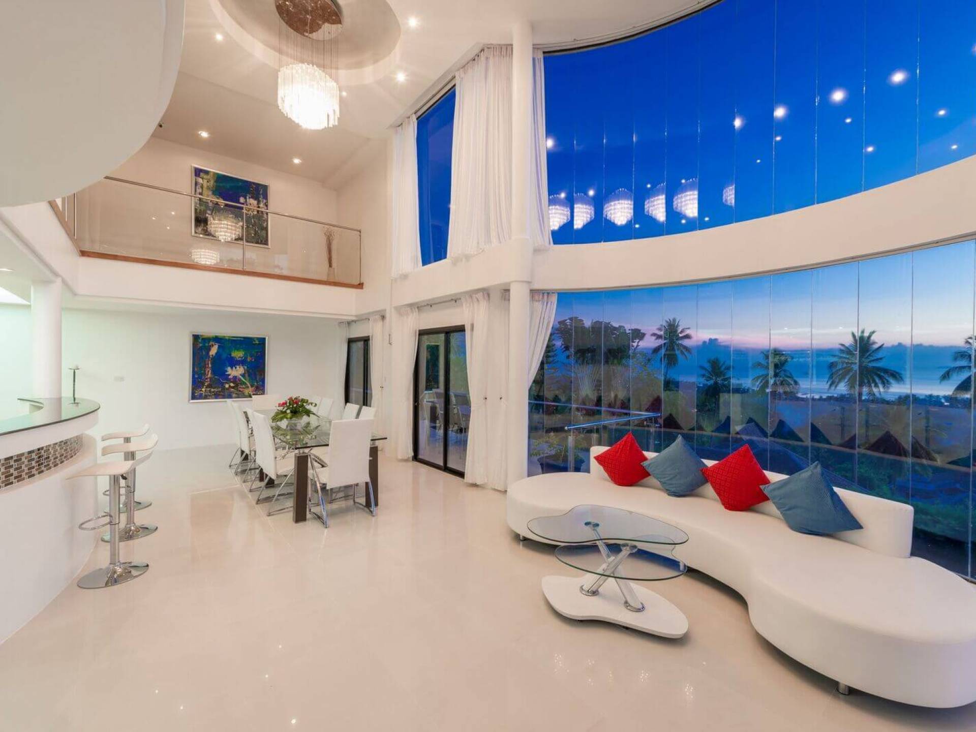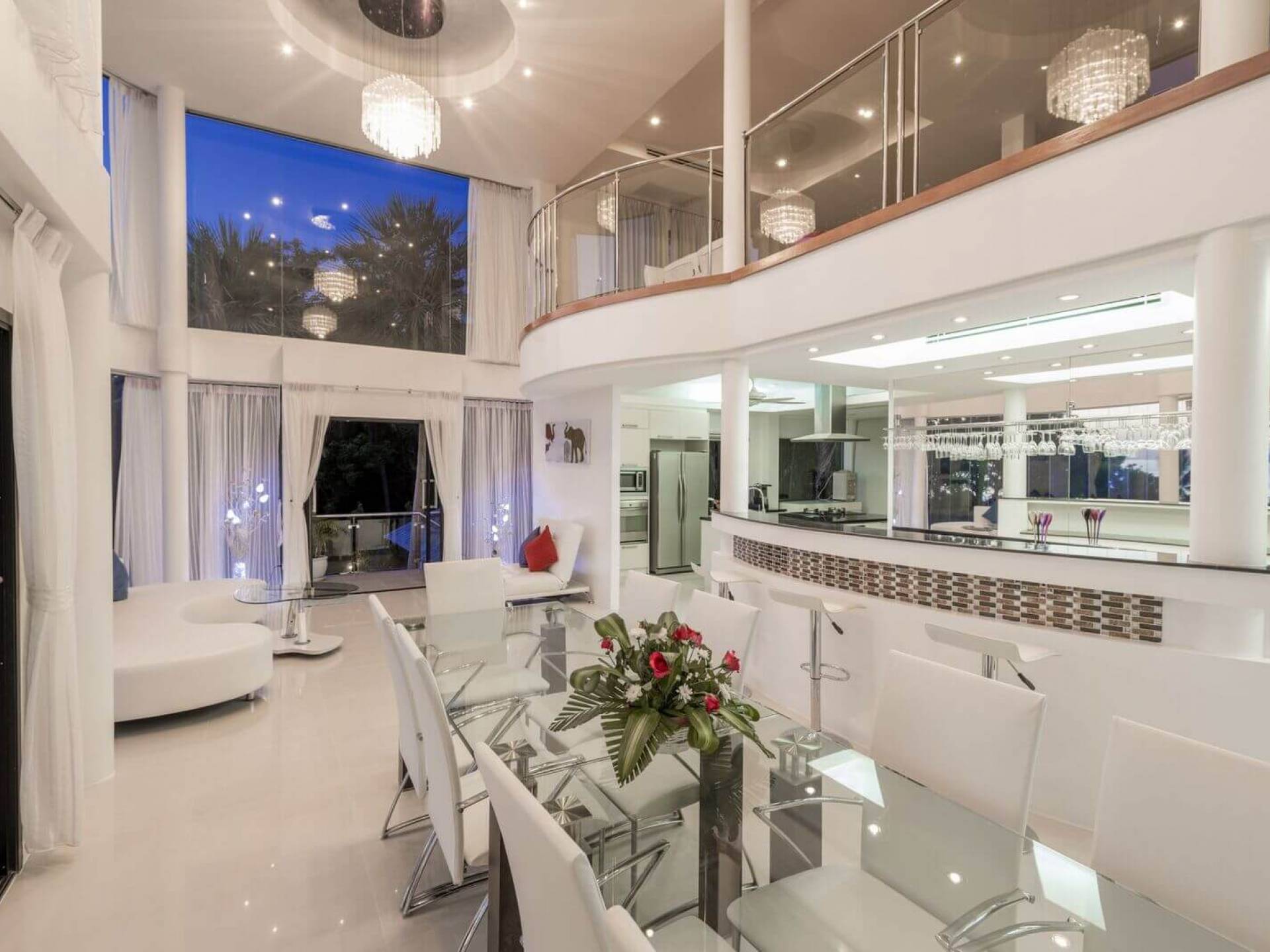La grandeza de Villa White Stone Samui se hace evidente de manera asombrosa por los lujosos adornos y dos exquisitos candelabros que cuelgan del alto techo de la sala de estar. El elegante sofá blanco se apoya sobre paneles de vidrio de cuerpo entero que permiten una vista espectacular de uno de los fondos más pintorescos que jamás haya visto. La exuberante vegetación del exterior pinta el tema blanco predominantemente sofisticado de esta sala de estar. Por supuesto, usted tiene el control de su propio paisaje de vacaciones, por lo que si desea un tiempo más tenue lejos de la luz del sol, simplemente cierre sus inmaculadas cortinas blancas. Un equilibrio perfecto entre estilo y comodidad.