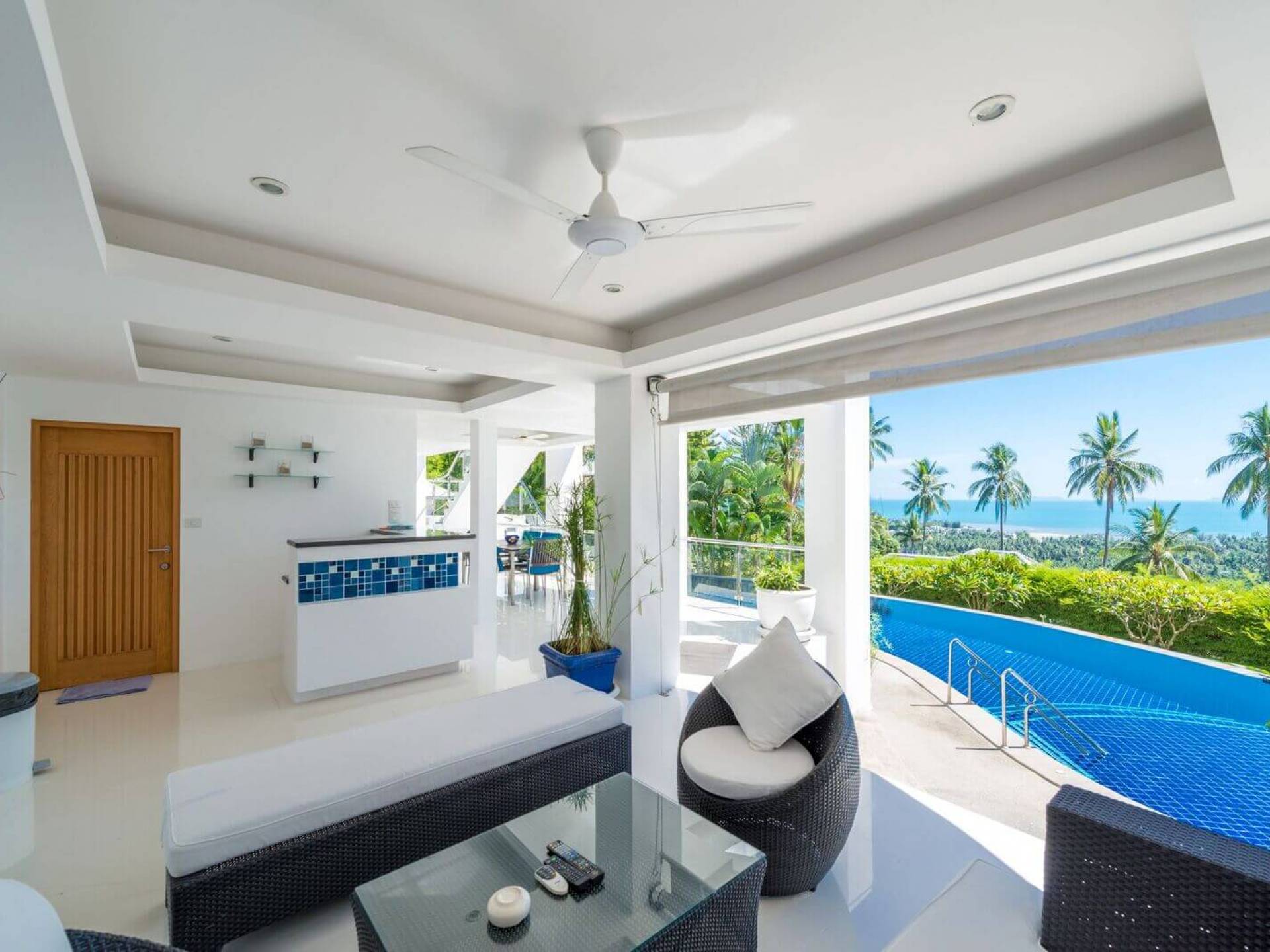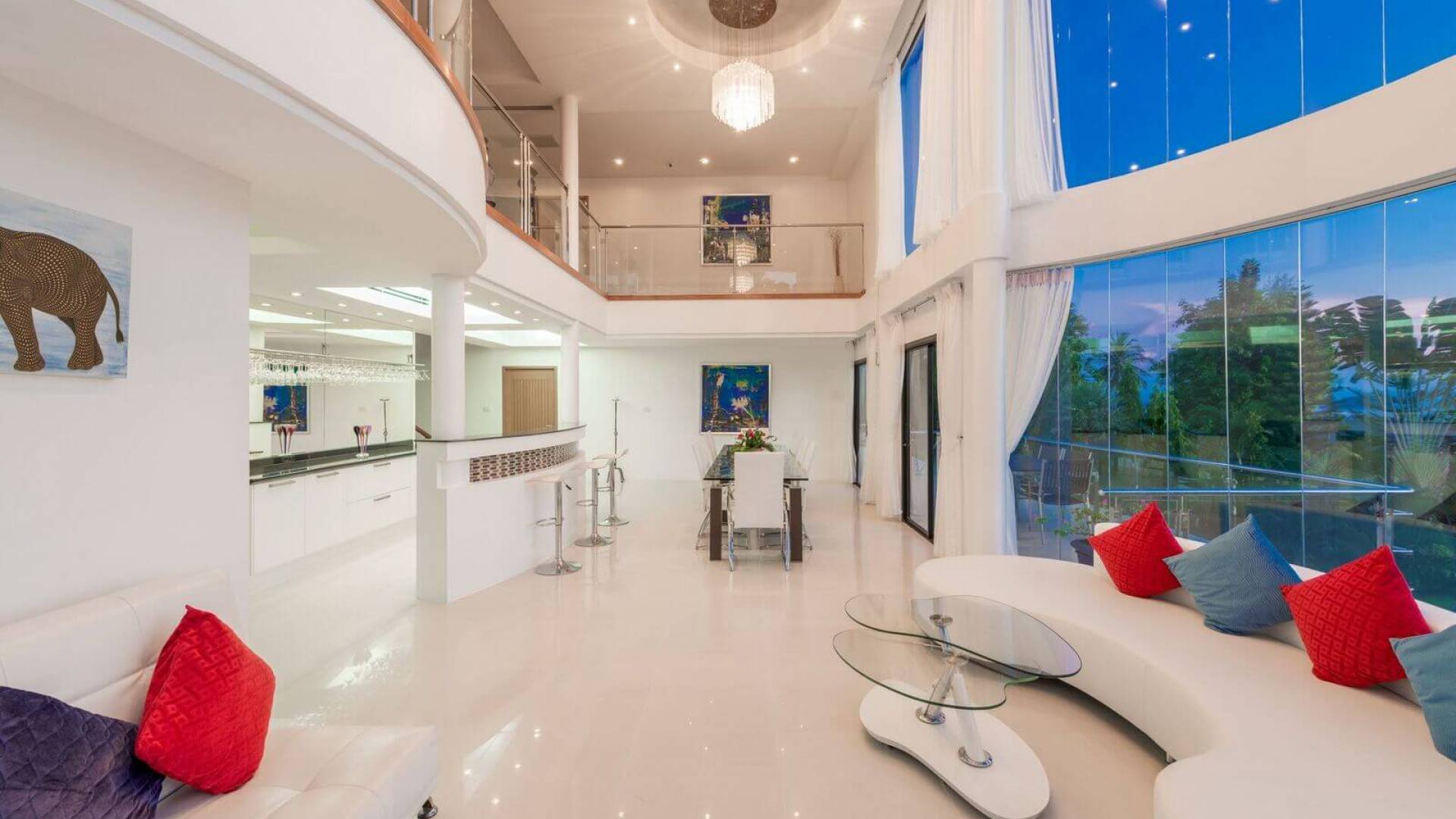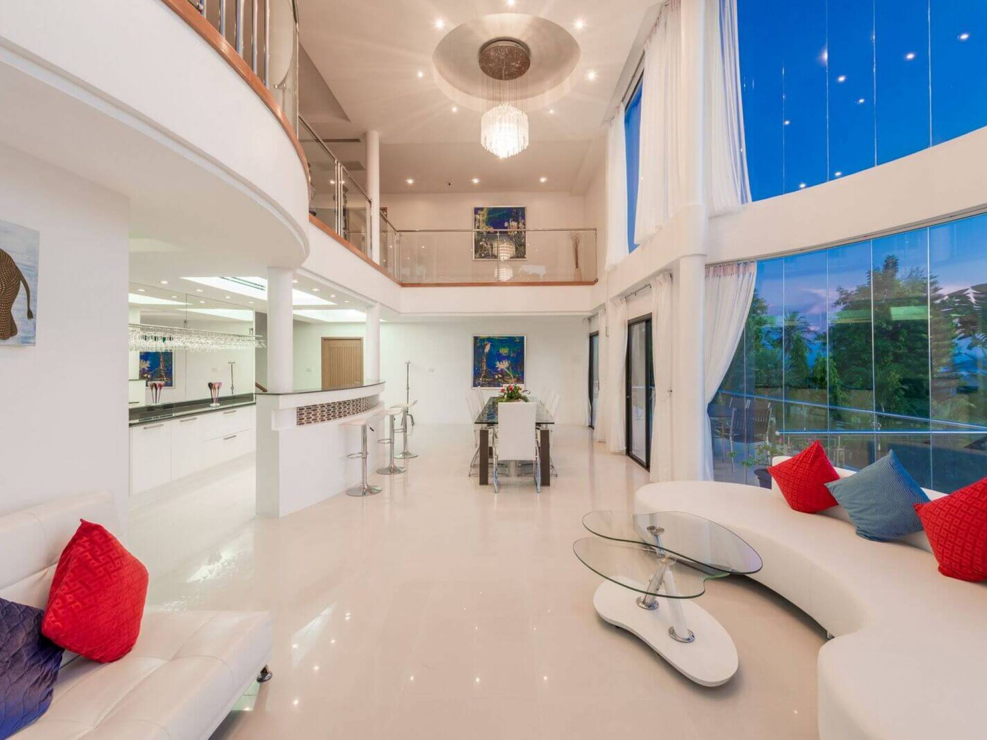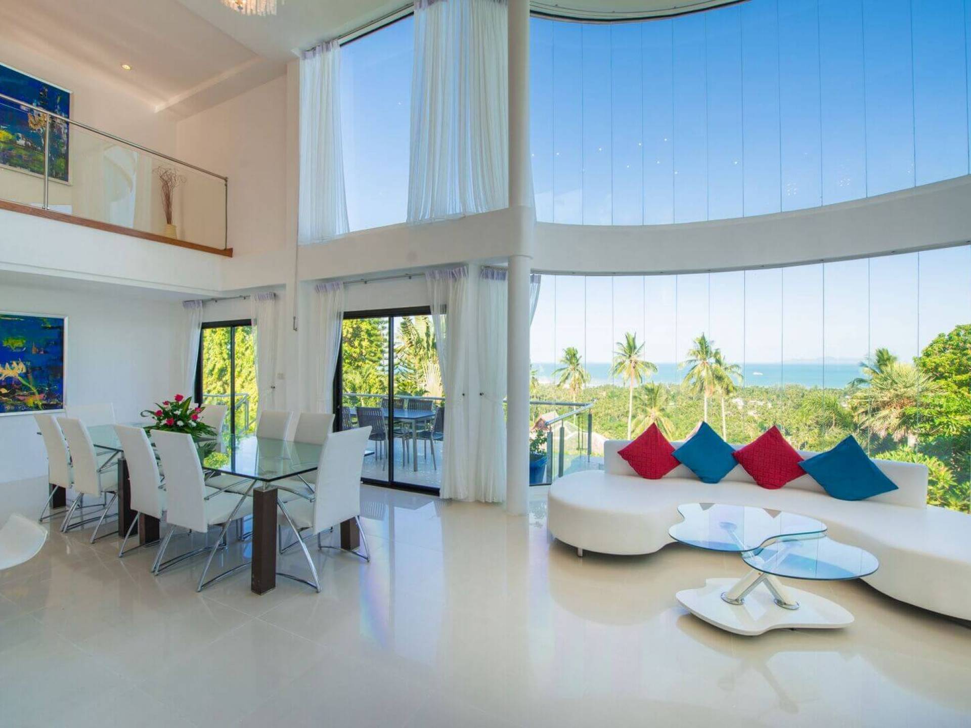 La grandeza de Villa White Stone Samui se hace evidente de manera asombrosa por los lujosos adornos y dos exquisitos candelabros que cuelgan del alto techo de la sala de estar. El elegante sofá blanco se apoya sobre paneles de vidrio de cuerpo entero que permiten una vista espectacular de uno de los fondos más pintorescos que jamás haya visto. La exuberante vegetación del exterior pinta el tema blanco predominantemente sofisticado de esta sala de estar. Por supuesto, usted tiene el control de su propio paisaje de vacaciones, por lo que si desea un tiempo más tenue lejos de la luz del sol, simplemente cierre sus inmaculadas cortinas blancas. Un equilibrio perfecto entre estilo y comodidad.