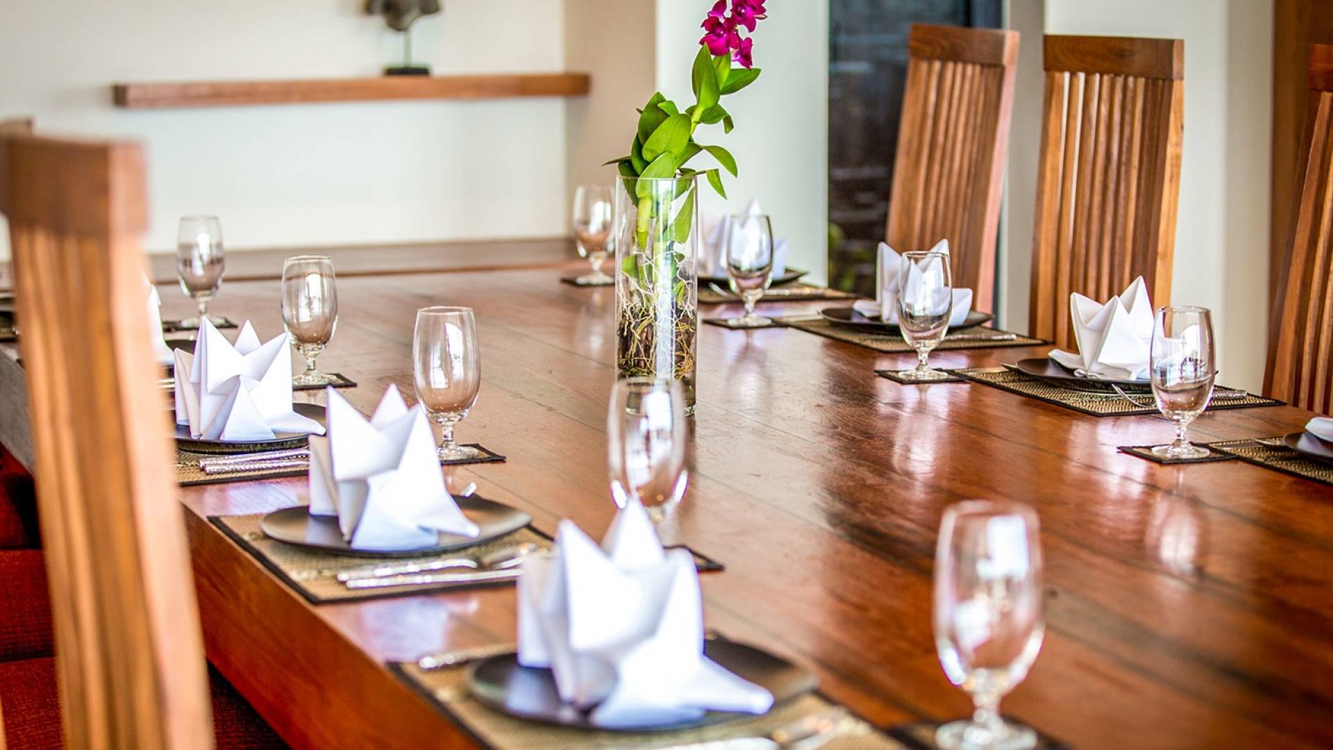 Una espaciosa área de cocina junto con enfriador de vinos, encimeras de granito, isla, vitrocerámica, horno y fregadero de dos senos que complementan un área de comedor con una hermosa mesa de comedor grande de madera de teca (con capacidad para doce personas cómodamente), iluminada por una impresionante lámpara de araña que es la pieza central de la habitación lo hace ideal para el entretenimiento privado. La sala de entretenimiento en la ladera de la montaña ofrece la posibilidad de atender a otras 10 personas y está acompañada por un sistema de sonido envolvente de última generación, enfriador de vinos, nevera y cocinas eléctricas.