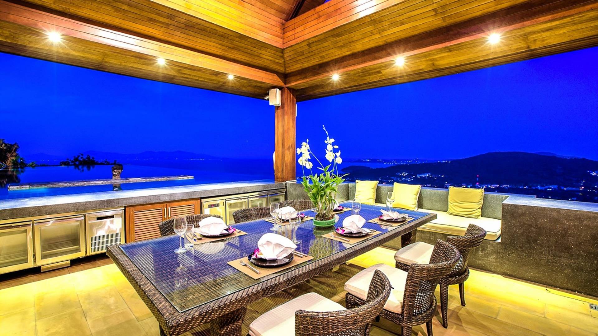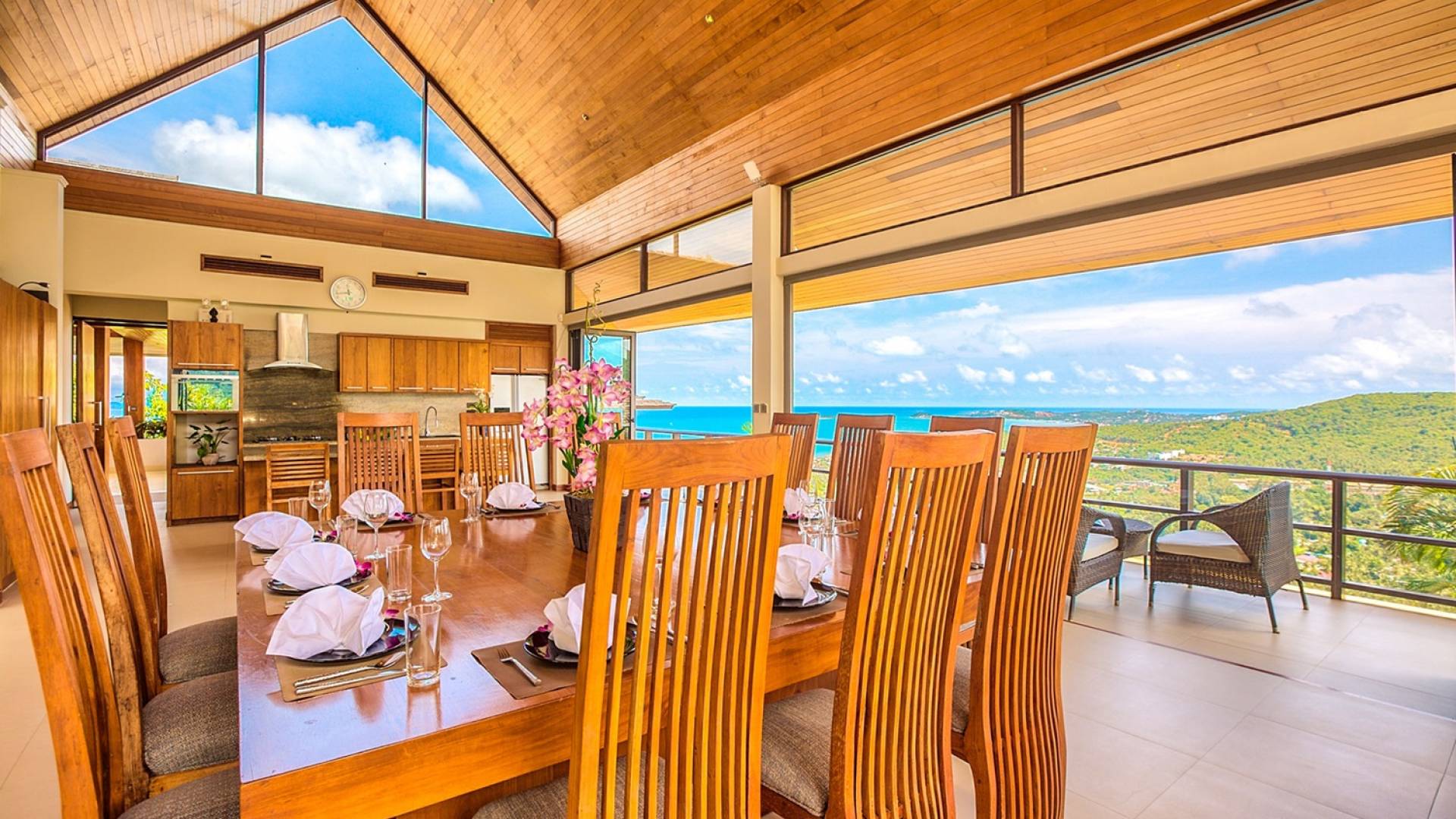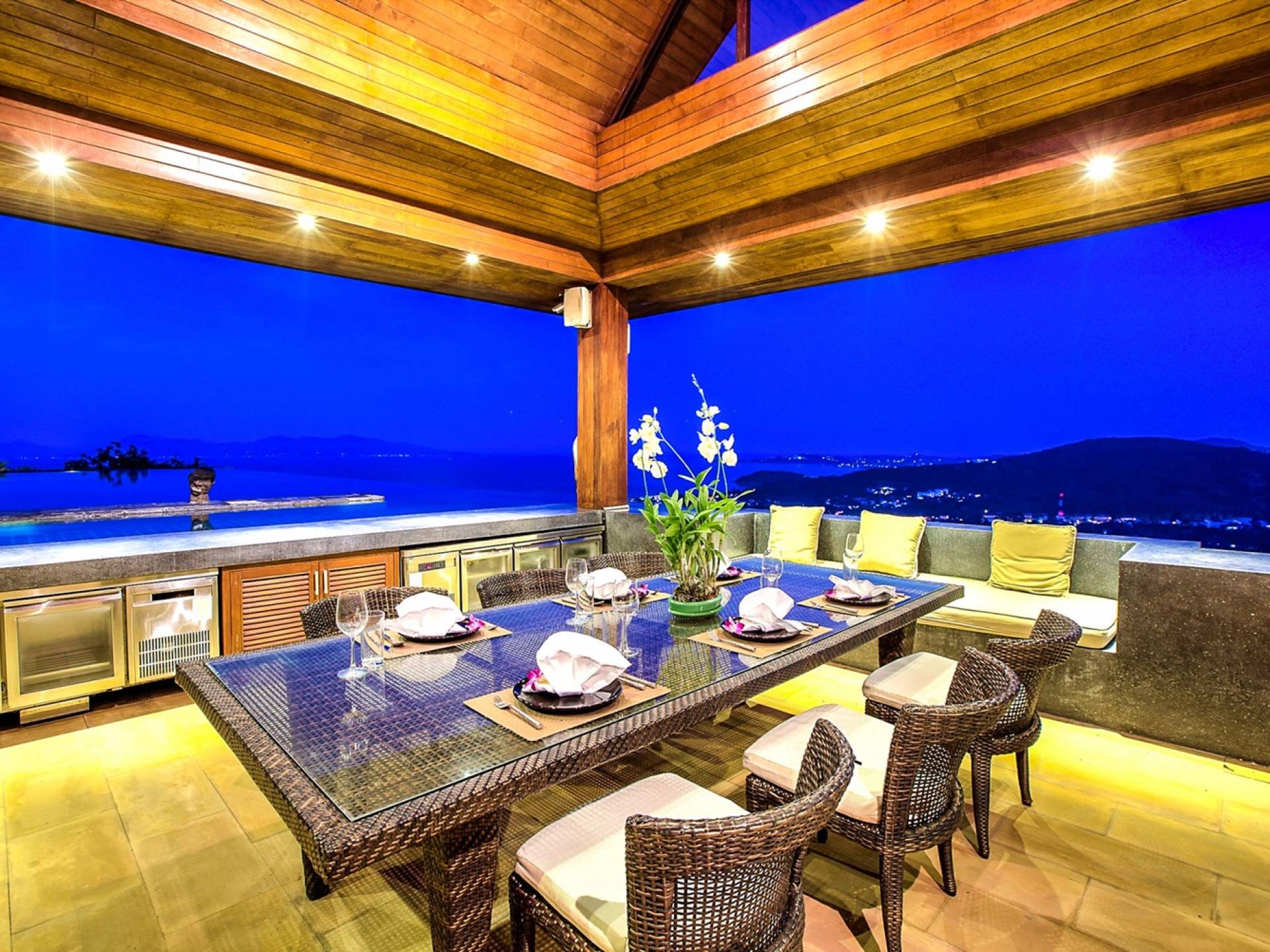 Para aquellos que buscan entretenerse, Villa Grand Vista Samui tiene una gran área de cocina equipada con todos los electrodomésticos necesarios, como enfriador de vinos, placas de cocción, encimeras de granito, horno y fregadero de dos senos. En el gran comedor, hay una hermosa mesa de comedor grande de teca y la habitación está marcada por una impresionante lámpara de araña de cristal como pieza central.