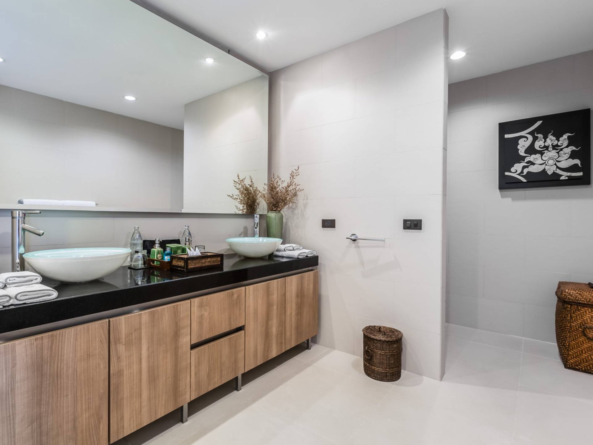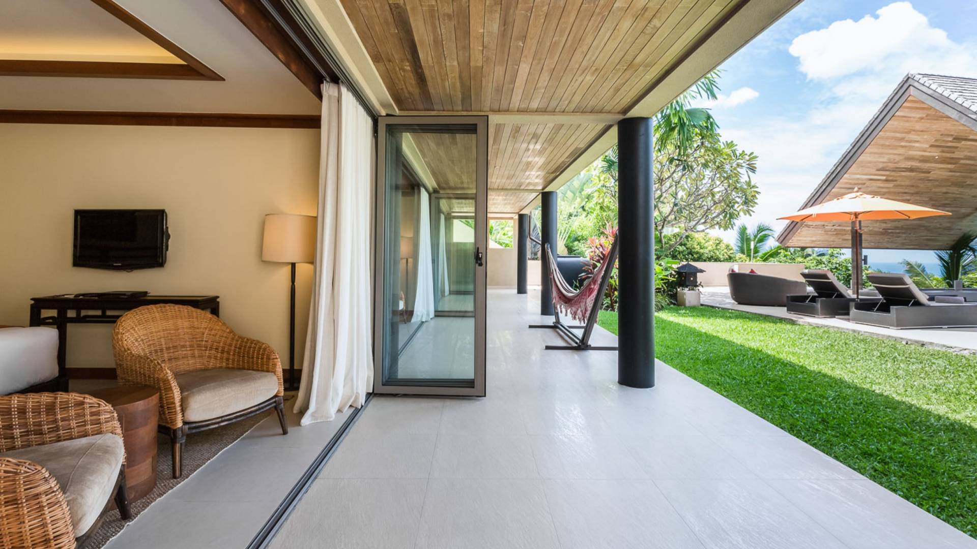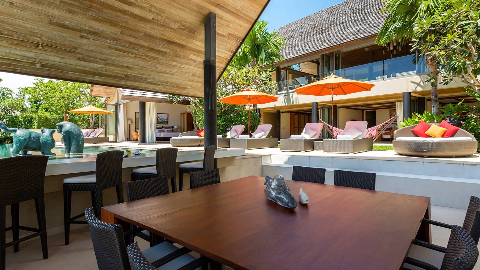 Las escaleras a ambos lados del balcón conducen al nivel inferior de la villa, donde tres glamorosos dormitorios de invitados dan al jardín, la piscina infinita privada y las vistas. Una pasarela cubierta conecta las habitaciones y funciona como una terraza al aire libre con sombra. Cada uno de los cuatro dormitorios tiene un amplio espacio de almacenamiento incorporado y un cuarto de ducha tipo lluvia en suite. Todas las habitaciones tienen camas dobles tamaño king, lo que la convierte en una villa ideal para familias o grupos. Los muebles y accesorios de alta calidad, los interiores lujosos y elegantes hacen que las habitaciones sean mucho más que simples espacios para dormir. Frente a este nivel de dormitorio, un jardín con césped conduce a la terraza de la piscina. A un lado de la piscina, los taburetes hundidos son servidos por una barra empotrada, incorporada a una sala cubierta o mirador, que también alberga una mesa de comedor y bancos acolchados.