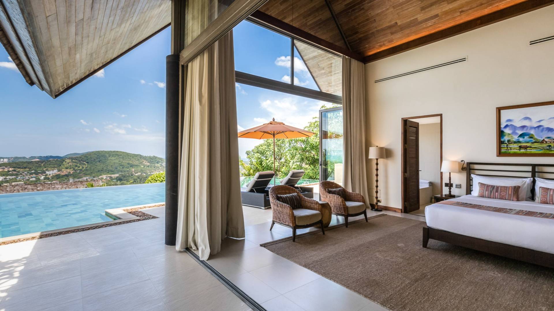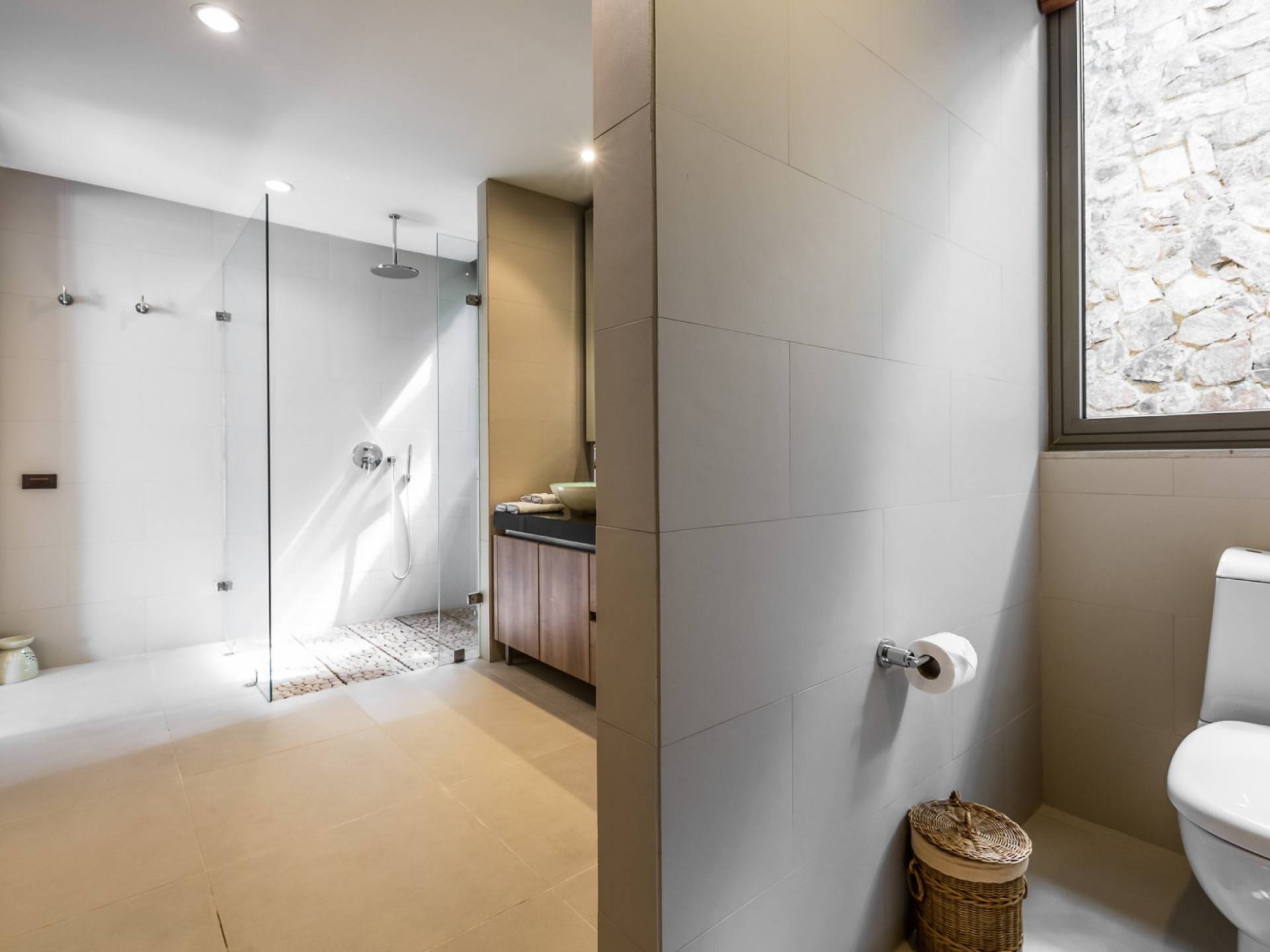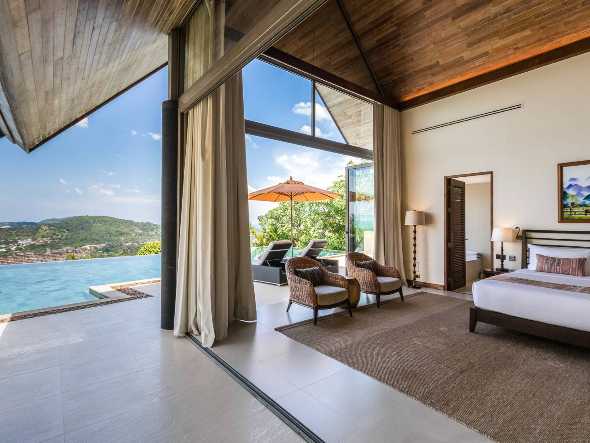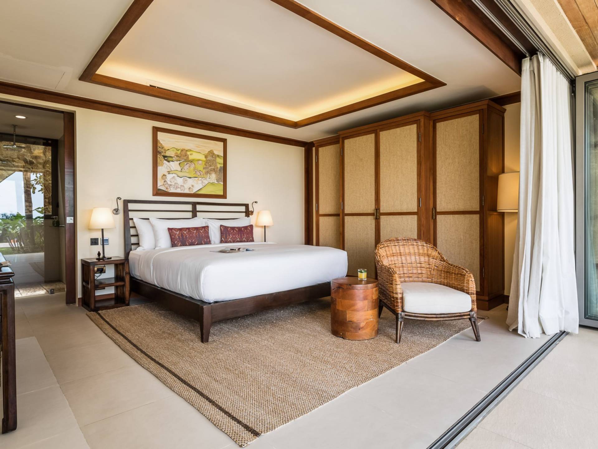 Al otro lado de la piscina privada, la suite principal ofrece una experiencia extraordinariamente magnífica. Un techo abovedado de madera con vidrio en la parte delantera y trasera crea un ambiente aireado y luminoso con puertas que se abren directamente a la terraza de la piscina y atraen las espectaculares vistas. Un vestidor separado detrás de la cama tamaño king conduce a un baño en suite con dos lavabos, una ducha de lluvia y una agradable bañera de terrazo con ventanas que dan directamente al océano.