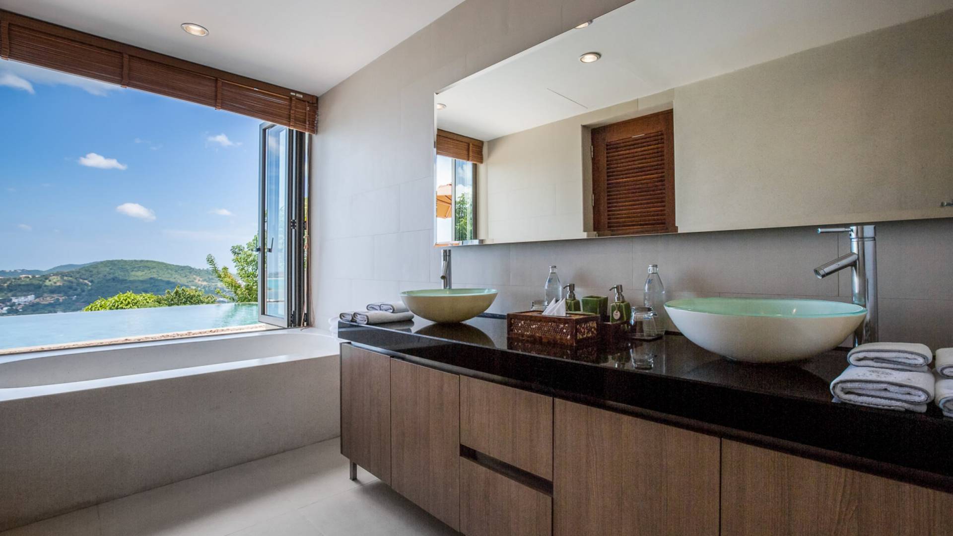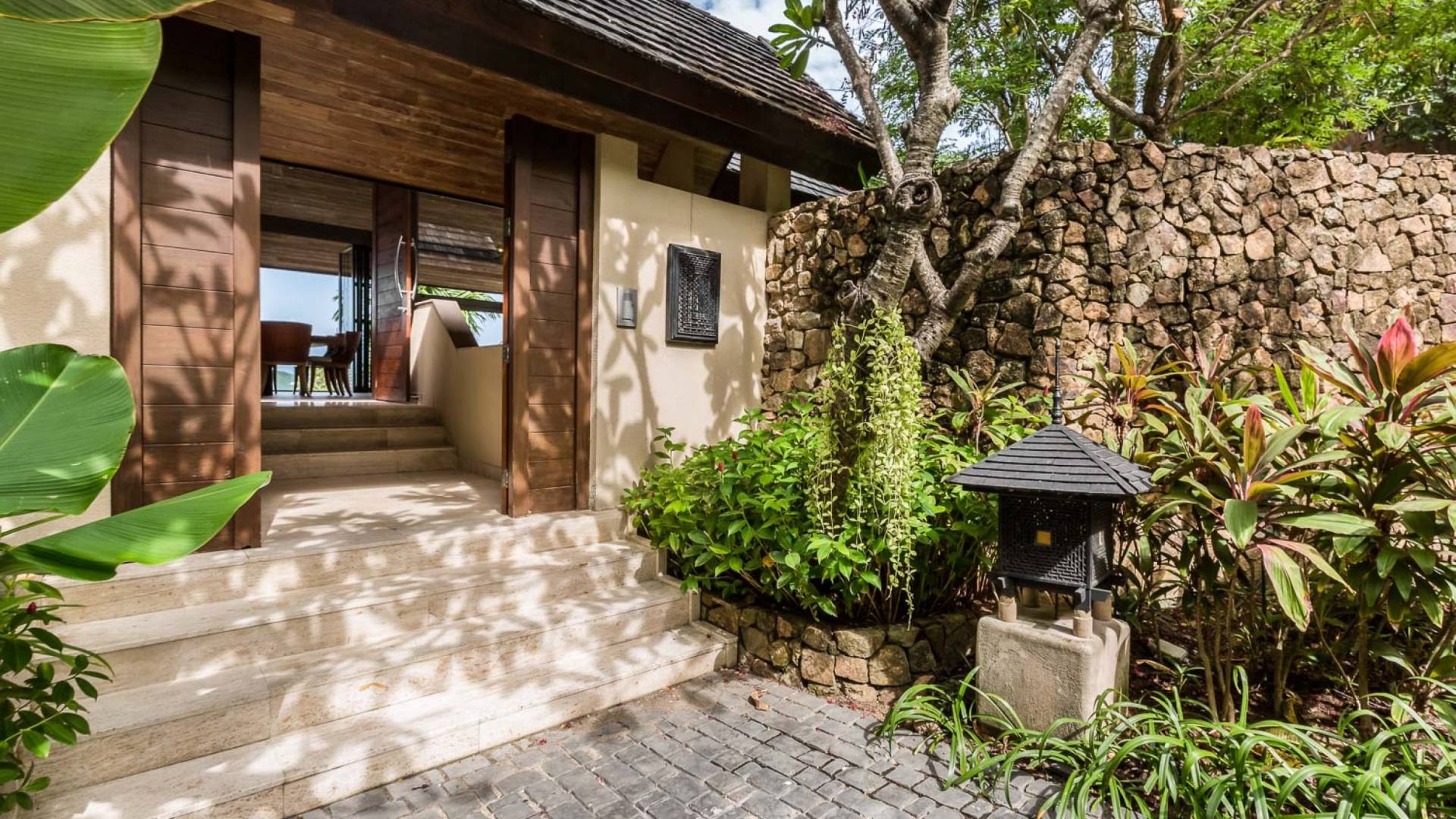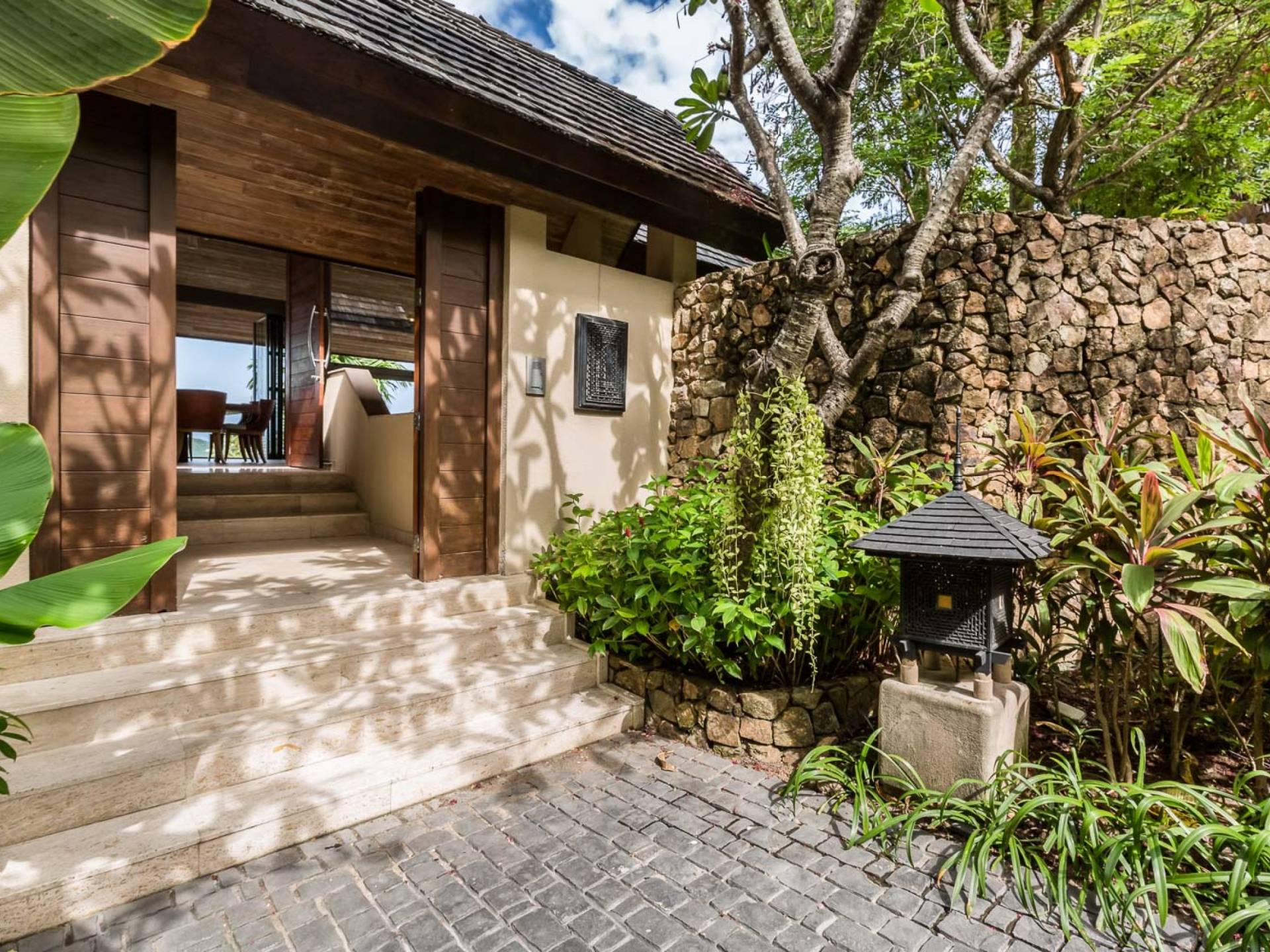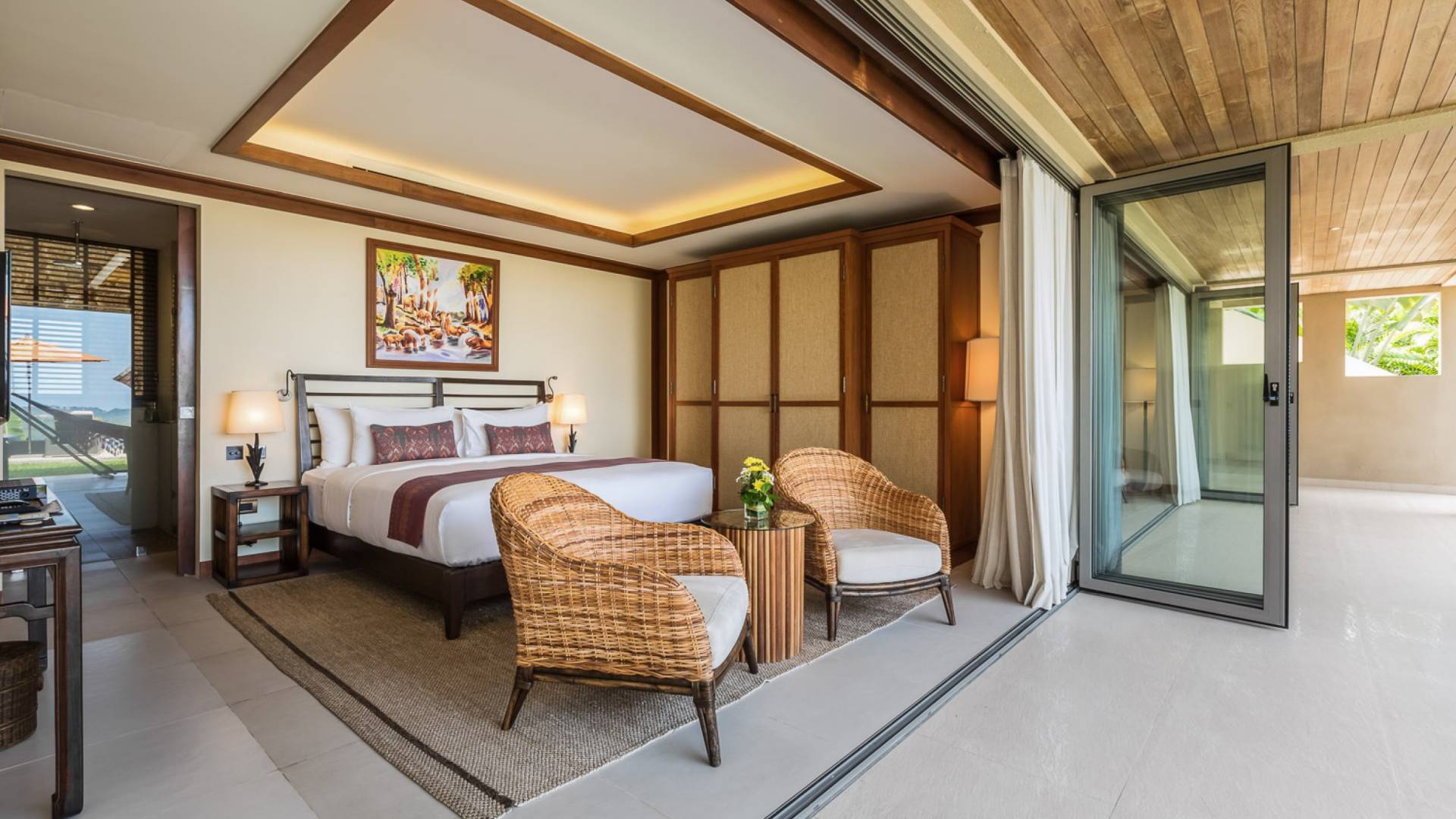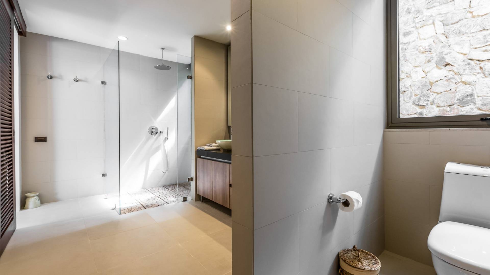 Al otro lado de la piscina privada, la suite principal ofrece una experiencia extraordinariamente magnífica. Un techo abovedado de madera con vidrio en la parte delantera y trasera crea un ambiente aireado y luminoso con puertas que se abren directamente a la terraza de la piscina y atraen las espectaculares vistas. Un vestidor separado detrás de la cama tamaño king conduce a un baño en suite con dos lavabos, una ducha de lluvia y una agradable bañera de terrazo con ventanas que dan directamente al océano.