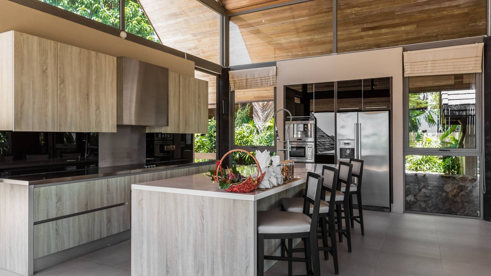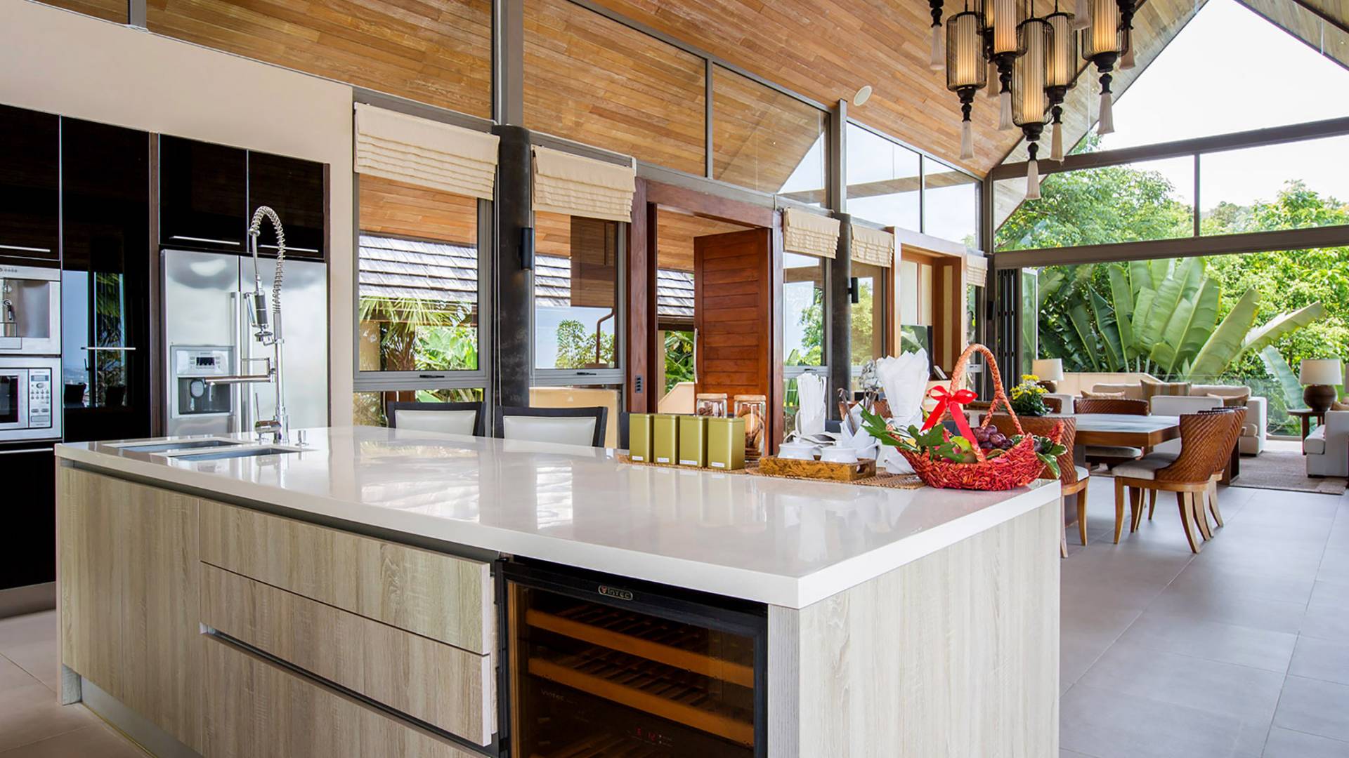 La elegante cocina está diseñada con muebles de madera, accesorios cromados y superficies de mármol y está equipada con todos los electrodomésticos de alta gama para incluir todo lo que los huéspedes puedan necesitar durante su estadía. Incluso hay un enfriador de vino incorporado para refrescos.