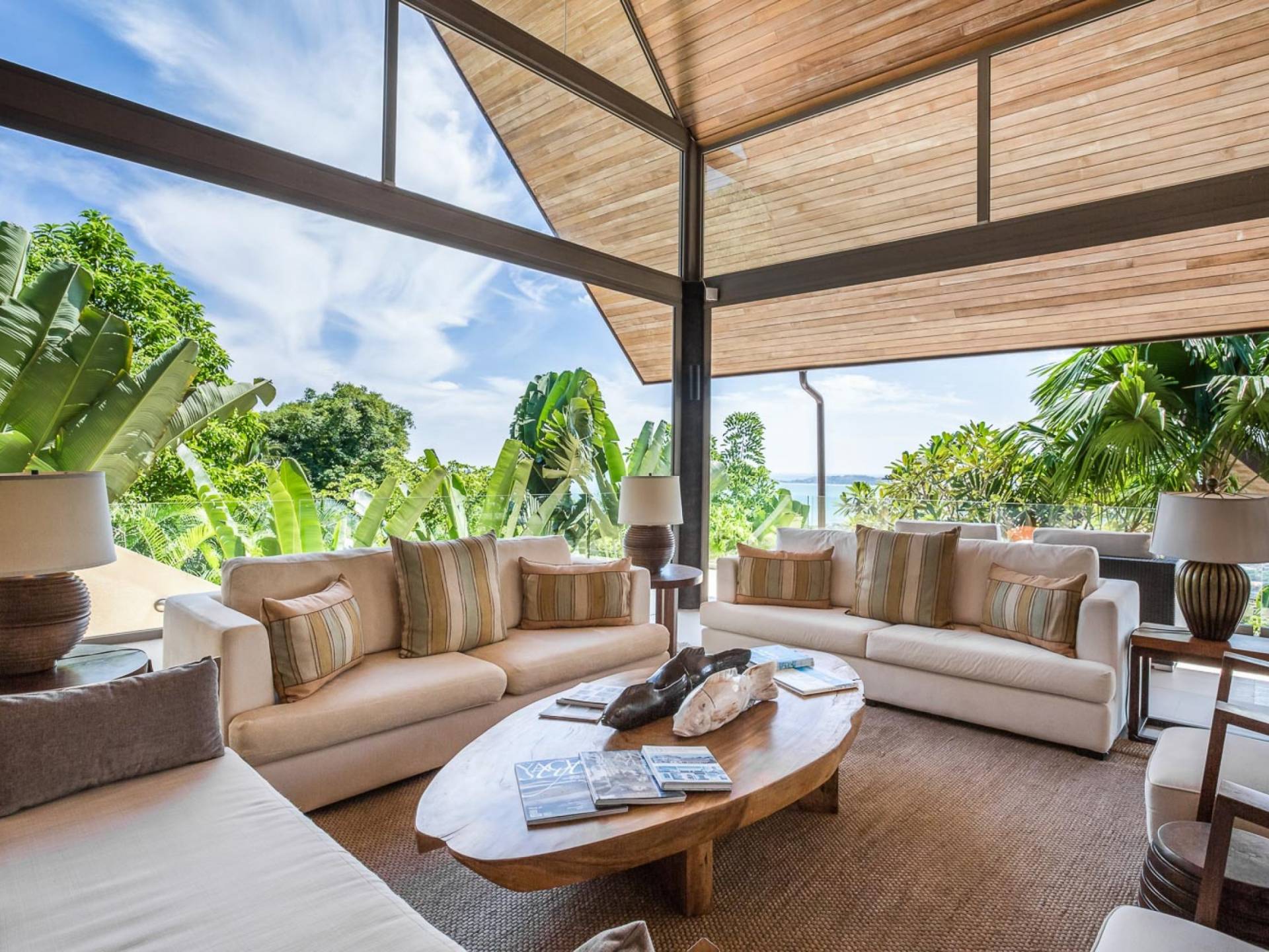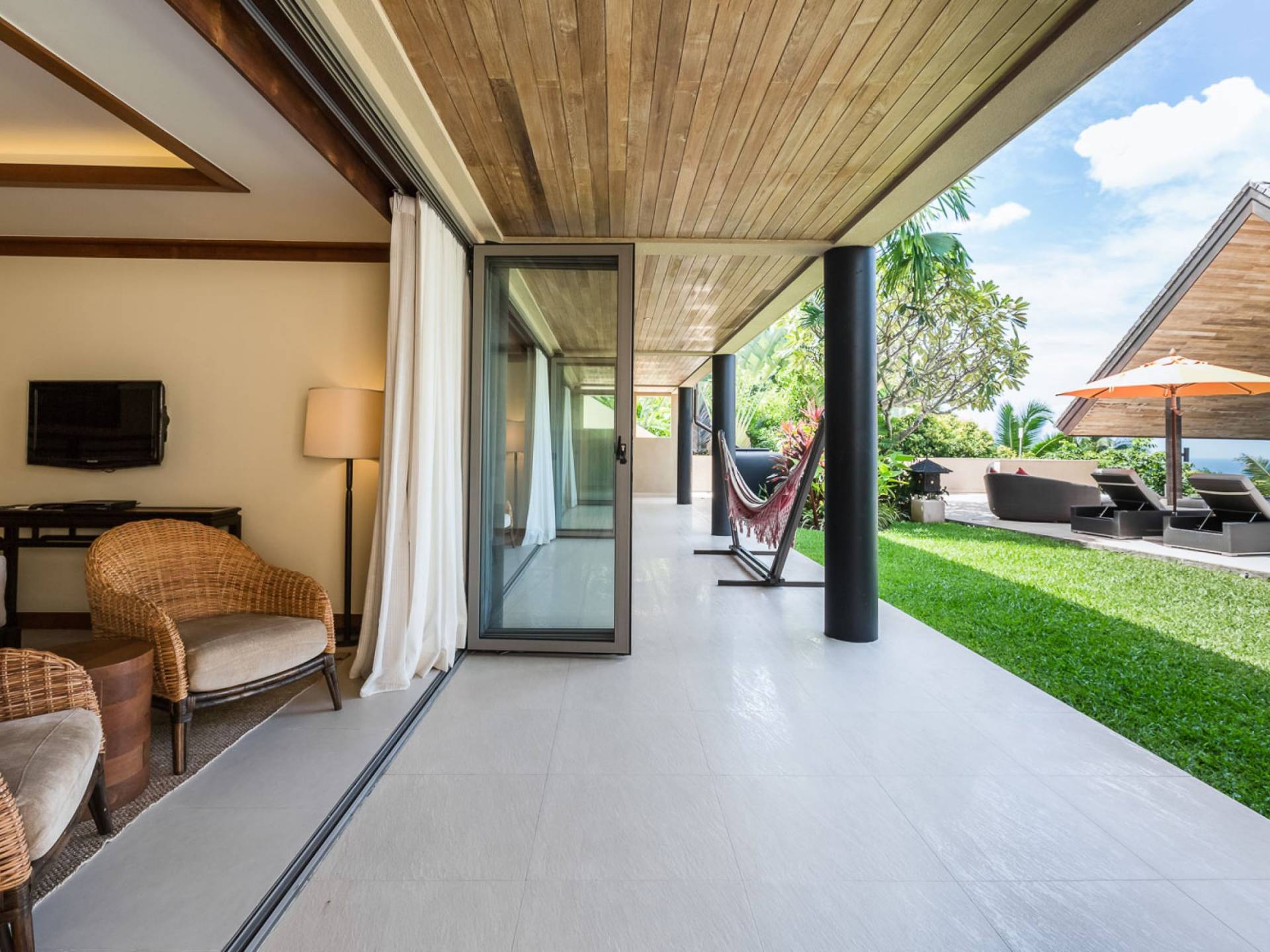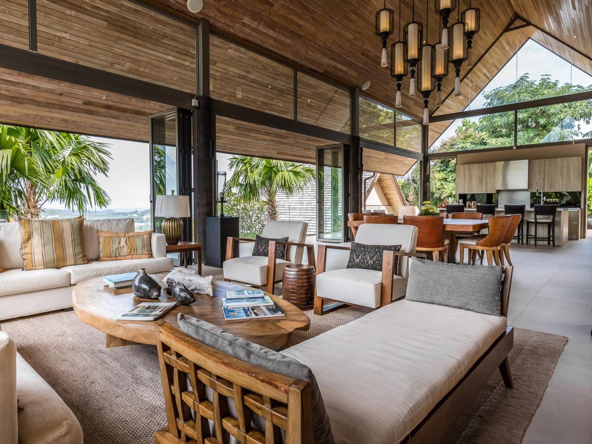 En el lado opuesto de la mesa del comedor, el voluminoso salón cuenta con un televisor de pantalla plana montado en la pared rodeado de cómodos sofás y sillones, con todo el espacio decorado con adornos contemporáneos y obras de arte excepcionales. Las superficies de madera rubia bellamente elaboradas se mezclan armónicamente con los colores tierra de las fibras para crear una atmósfera relajante que contrasta deliciosamente con los vibrantes azules turquesas y los verdes exuberantes de la zona. A lo largo de toda la habitación, un balcón cubierto con una barrera de vidrio casi invisible mira hacia el jardín tropical y la piscina infinita privada. Relájese y pase un momento agradable con sus seres queridos haciendo uso de las modernas instalaciones de entretenimiento que incluyen libros, reproductor de DVD, base para iPod, cine en casa, televisión por satélite y un sistema estéreo. Las sillas para todo clima están colocadas para disfrutar de las vistas y también ofrecen el lugar perfecto para descansar por la tarde o tomar el sol al atardecer.