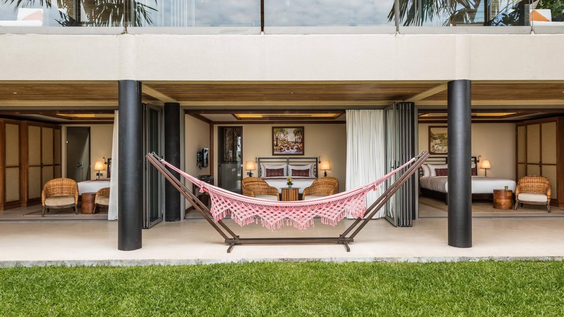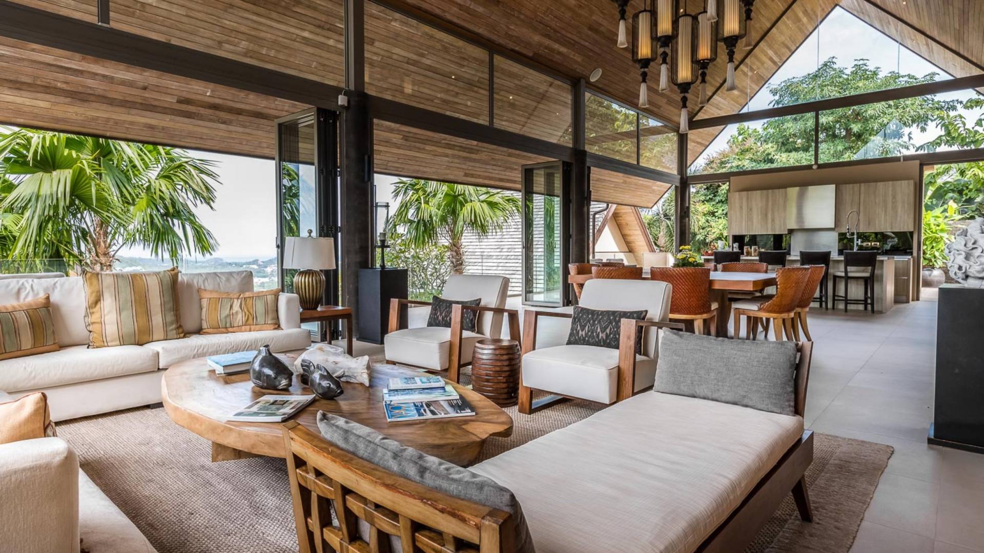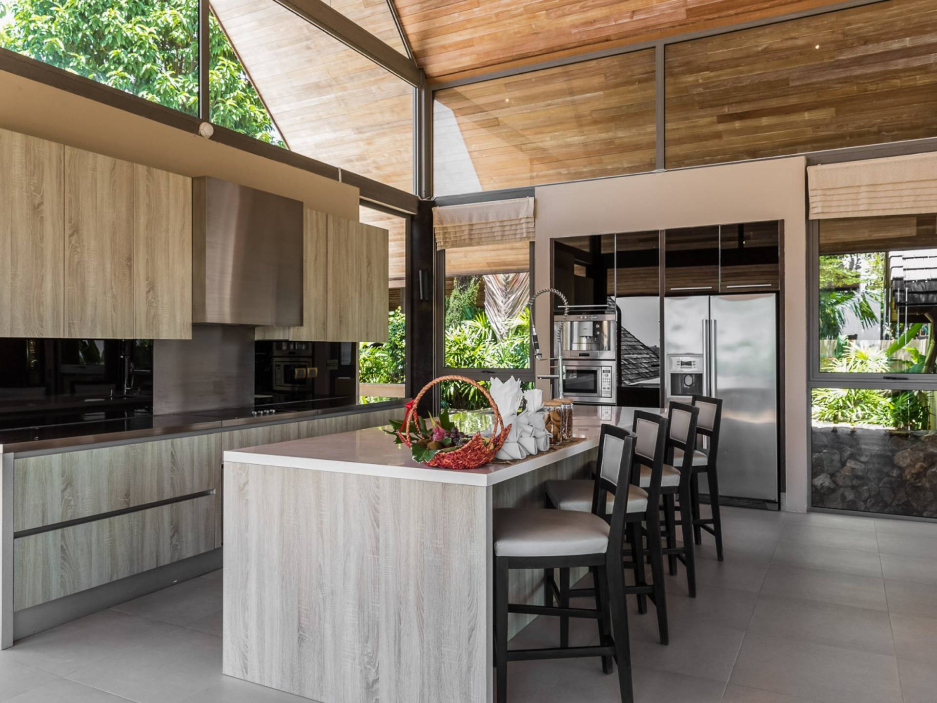 En el lado opuesto de la mesa del comedor, el voluminoso salón cuenta con un televisor de pantalla plana montado en la pared rodeado de cómodos sofás y sillones, con todo el espacio decorado con adornos contemporáneos y obras de arte excepcionales. Las superficies de madera rubia bellamente elaboradas se mezclan armónicamente con los colores tierra de las fibras para crear una atmósfera relajante que contrasta deliciosamente con los vibrantes azules turquesas y los verdes exuberantes de la zona. A lo largo de toda la habitación, un balcón cubierto con una barrera de vidrio casi invisible mira hacia el jardín tropical y la piscina infinita privada. Relájese y pase un momento agradable con sus seres queridos haciendo uso de las modernas instalaciones de entretenimiento que incluyen libros, reproductor de DVD, base para iPod, cine en casa, televisión por satélite y un sistema estéreo. Las sillas para todo clima están colocadas para disfrutar de las vistas y también ofrecen el lugar perfecto para descansar por la tarde o tomar el sol al atardecer.