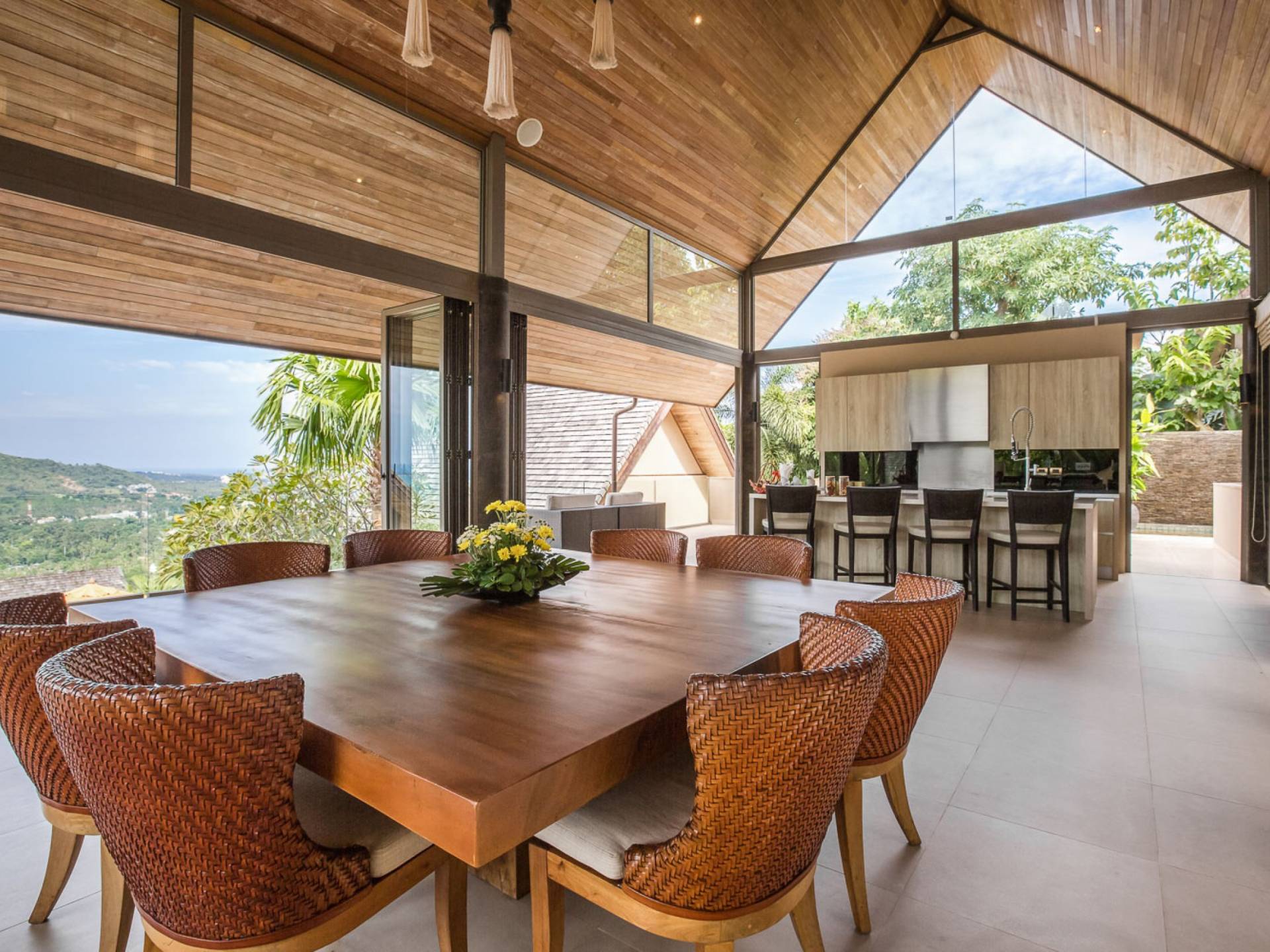 Las grandes puertas de madera en Purana Residence se abren a una asombrosa sala de estar elevada. Esta amplia habitación ocupa prácticamente todo el ancho de la propiedad y cuenta con un techo alto abovedado, revestido de madera, con ventanas a ambos lados que amplían el espacio hacia las vistas y se suman al ambiente único de una habitación ya impresionante. Una llamativa mesa de comedor rectangular ocupa un lugar central, servida por un área de cocina moderna y bien equipada con una barra de desayuno, un excelente lugar para comidas más informales.