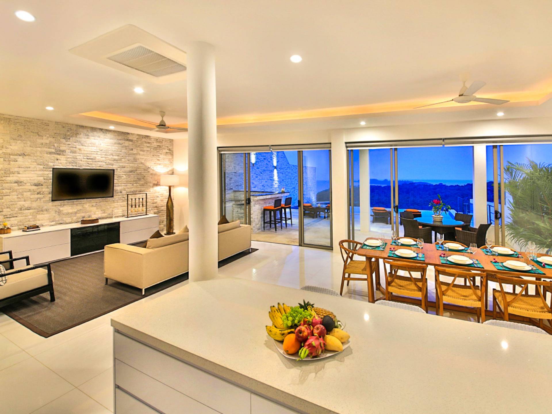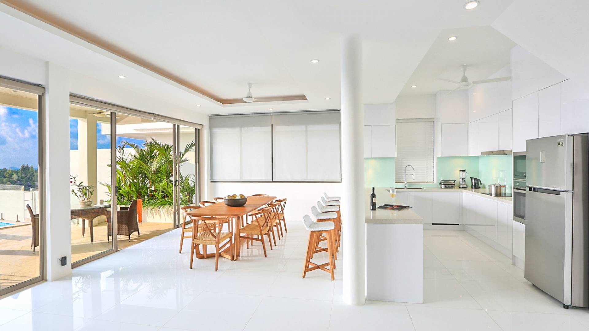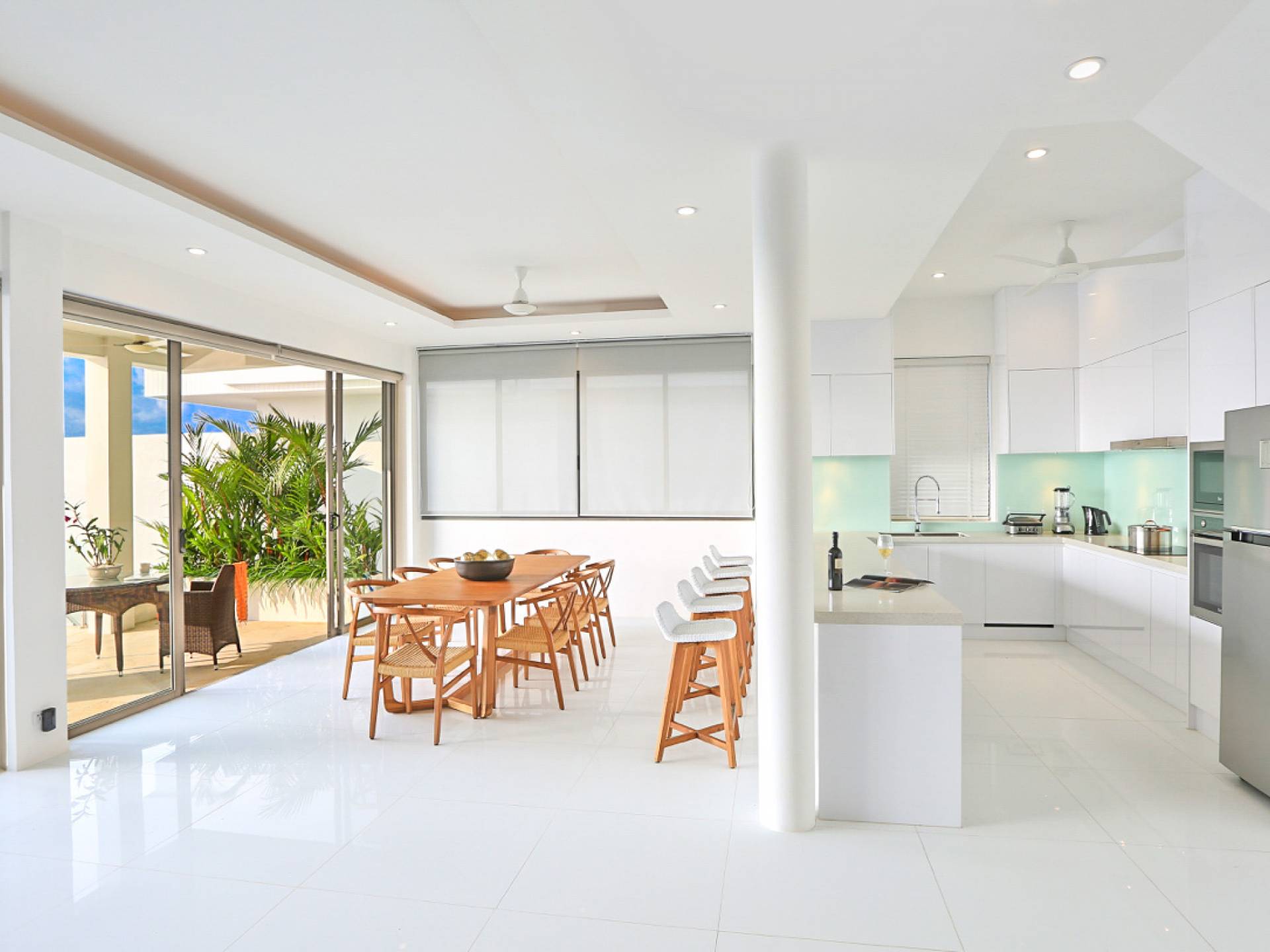 Las primeras impresiones son duraderas. Y a medida que se acerca a la villa, comienza a sentir la exuberante vegetación, las hermosas playas y las impresionantes vistas que han hecho que Koh Samui sea mundialmente famoso. Y a medida que ingresa a la villa y baja a la sala de estar principal de paredes blancas y al comedor, el mundo comienza a emerger más allá de las puertas del patio hasta el techo.