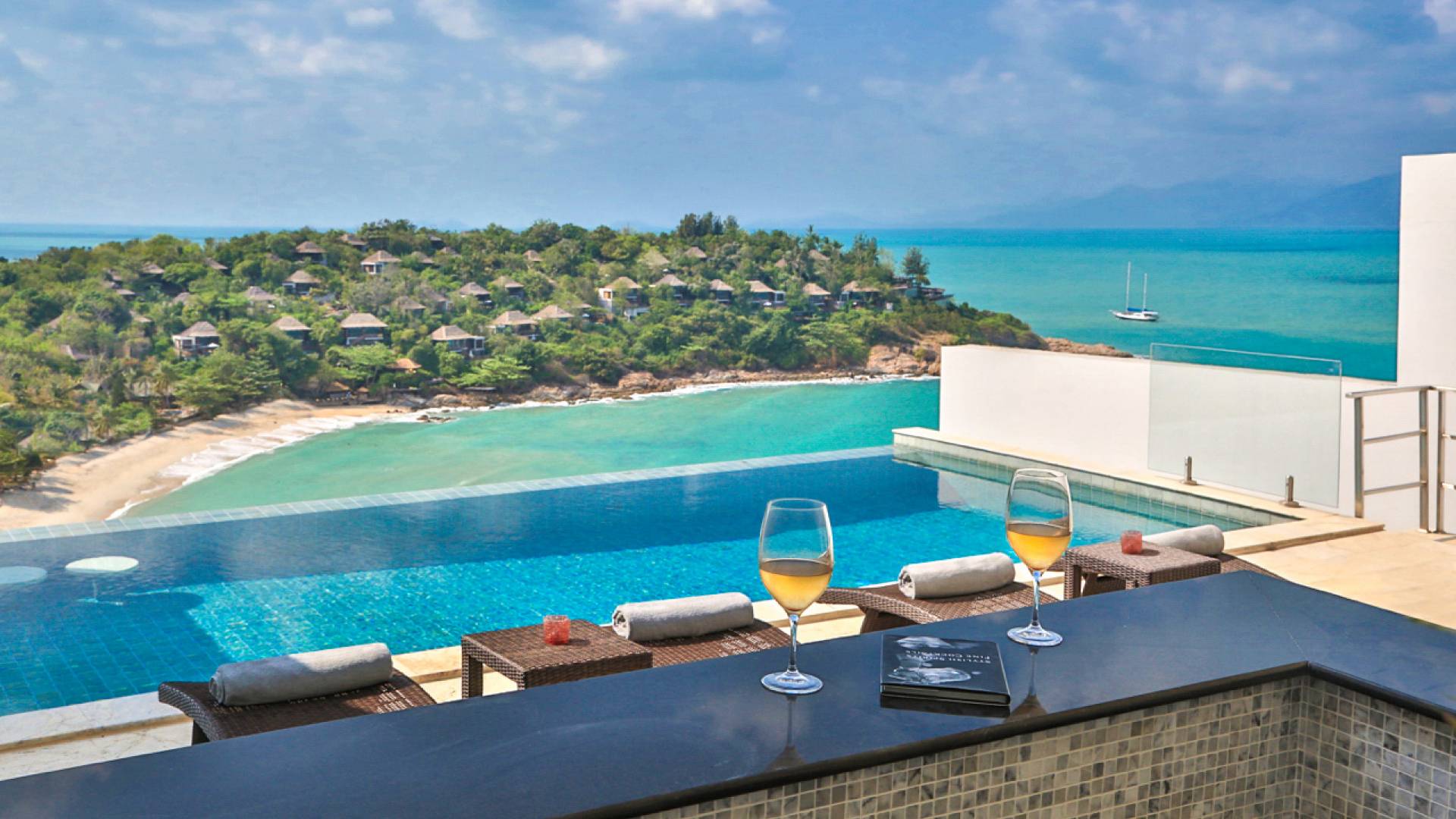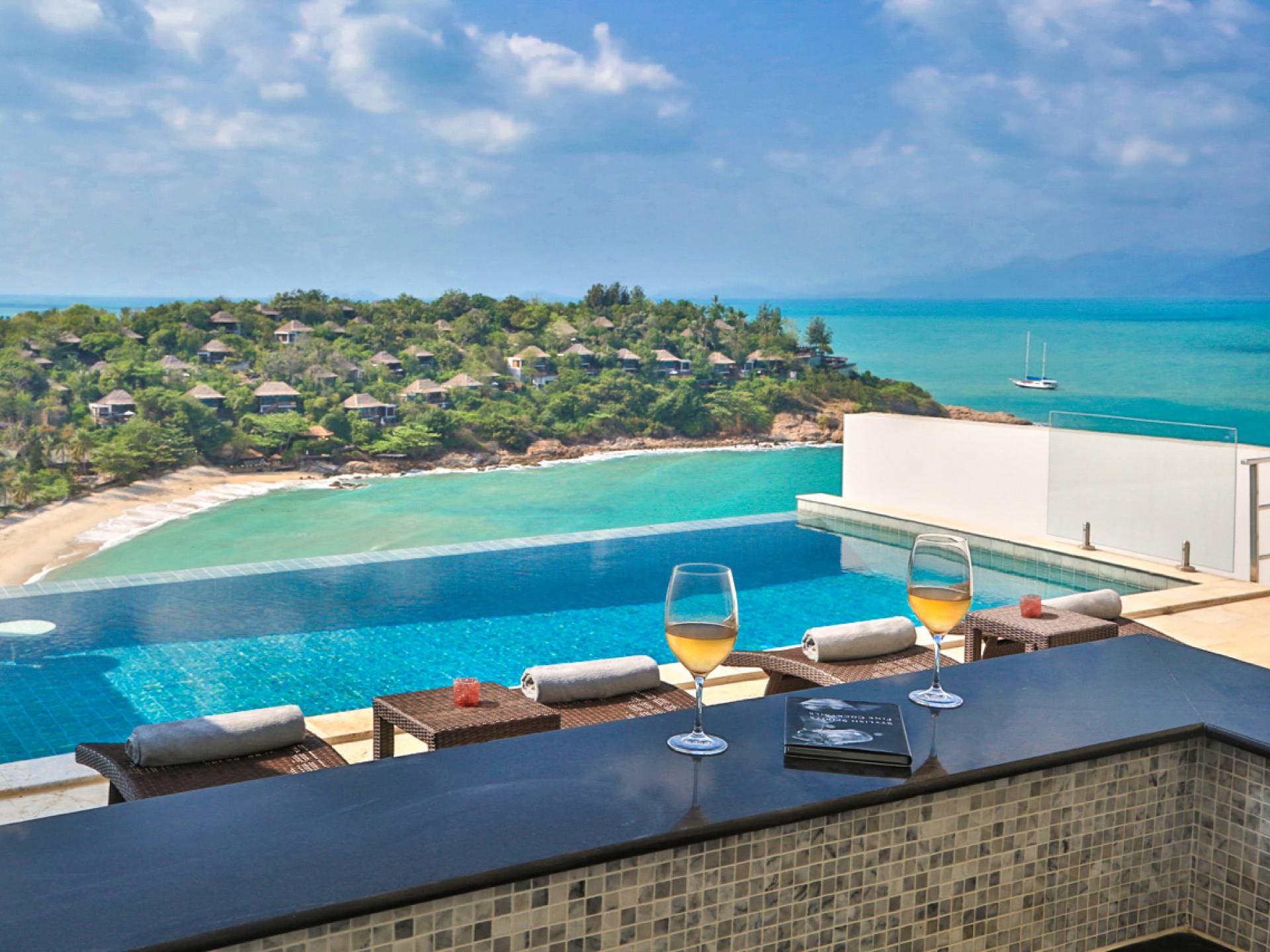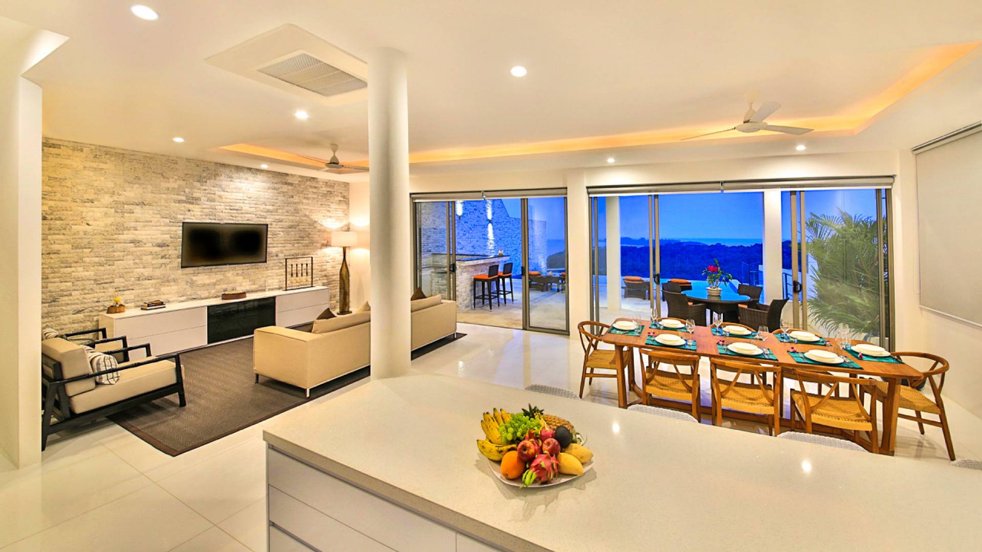 Las primeras impresiones son duraderas. Y a medida que se acerca a la villa, comienza a sentir la exuberante vegetación, las hermosas playas y las impresionantes vistas que han hecho que Koh Samui sea mundialmente famoso. Y a medida que ingresa a la villa y baja a la sala de estar principal de paredes blancas y al comedor, el mundo comienza a emerger más allá de las puertas del patio hasta el techo.
