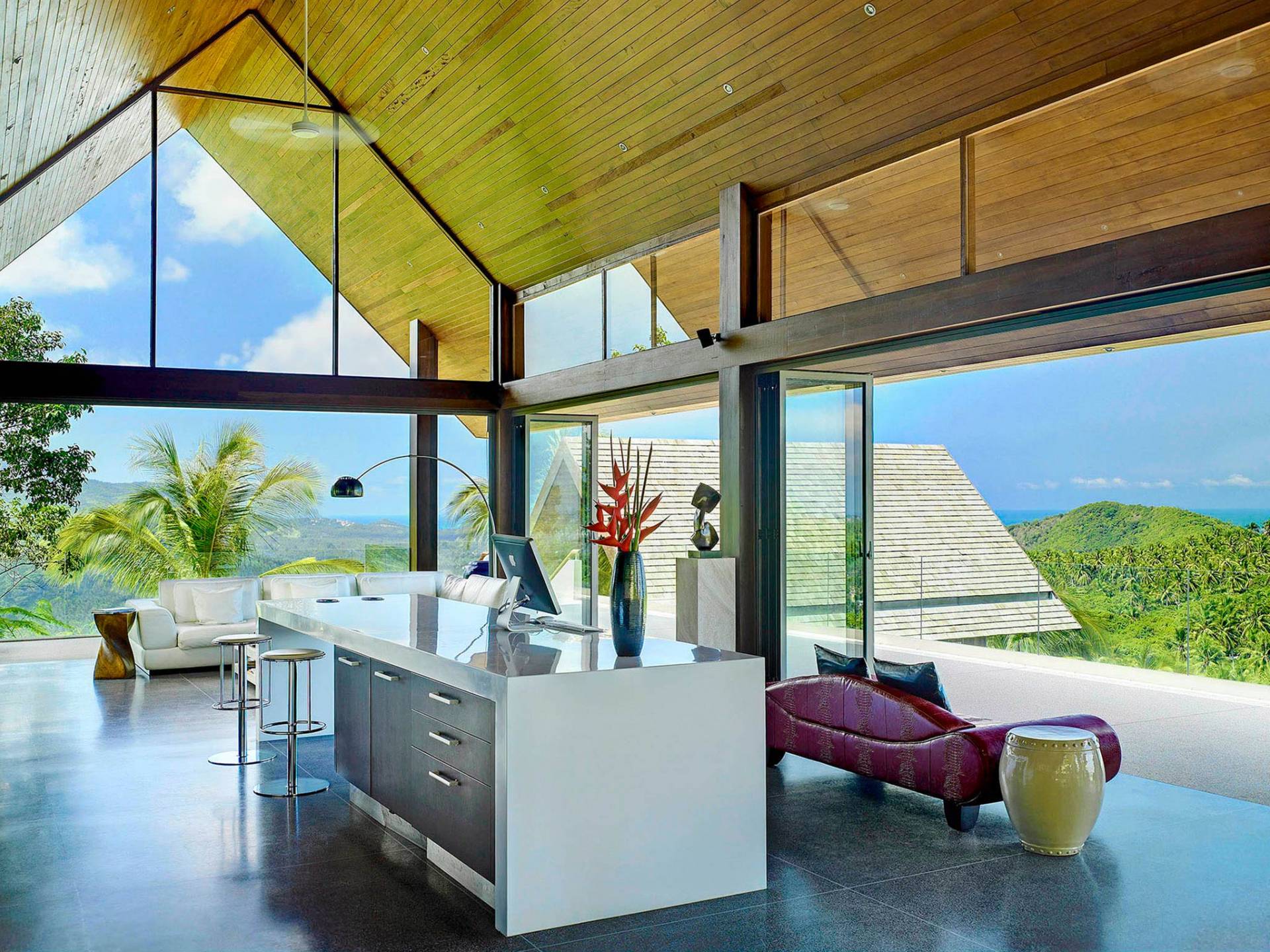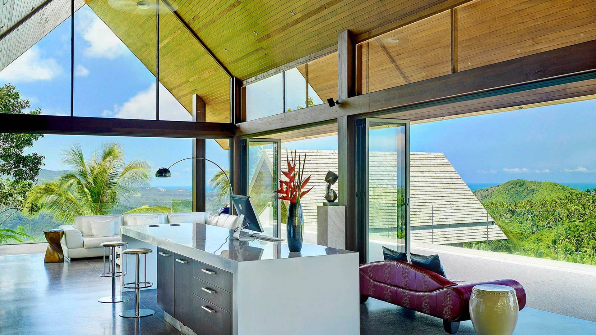 Al entrar en Villa Suralai Samui, los huéspedes se sentirán como si estuvieran en la cima del mundo cuando sean recibidos por el personal de la villa que les ofrecerá toallas frescas y refrescantes y cócteles exóticos. La sala principal cuenta con un impresionante techo estilo catedral revestido con moderna madera tropical. Este pabellón tiene vistas a la piscina al aire libre, el césped, el jardín y una sala privada ubicada en el extremo este de la piscina.