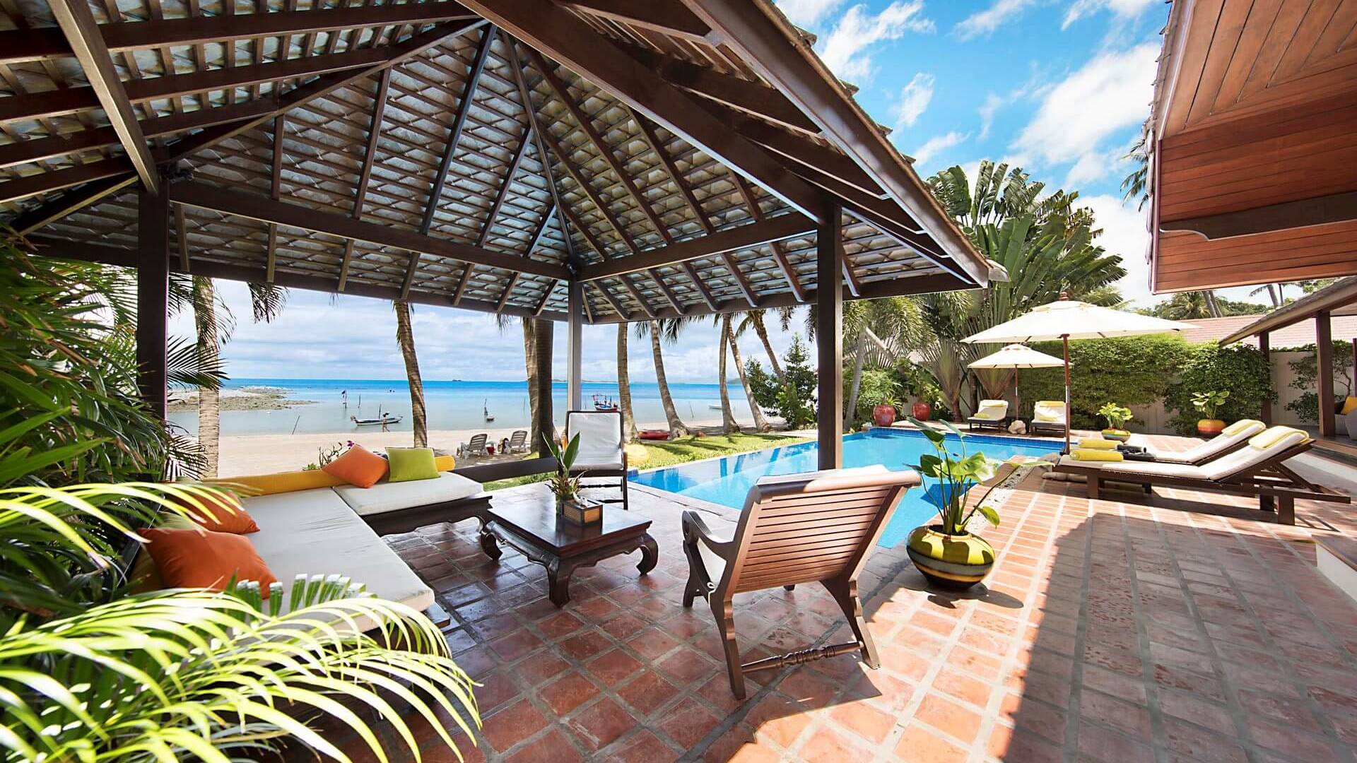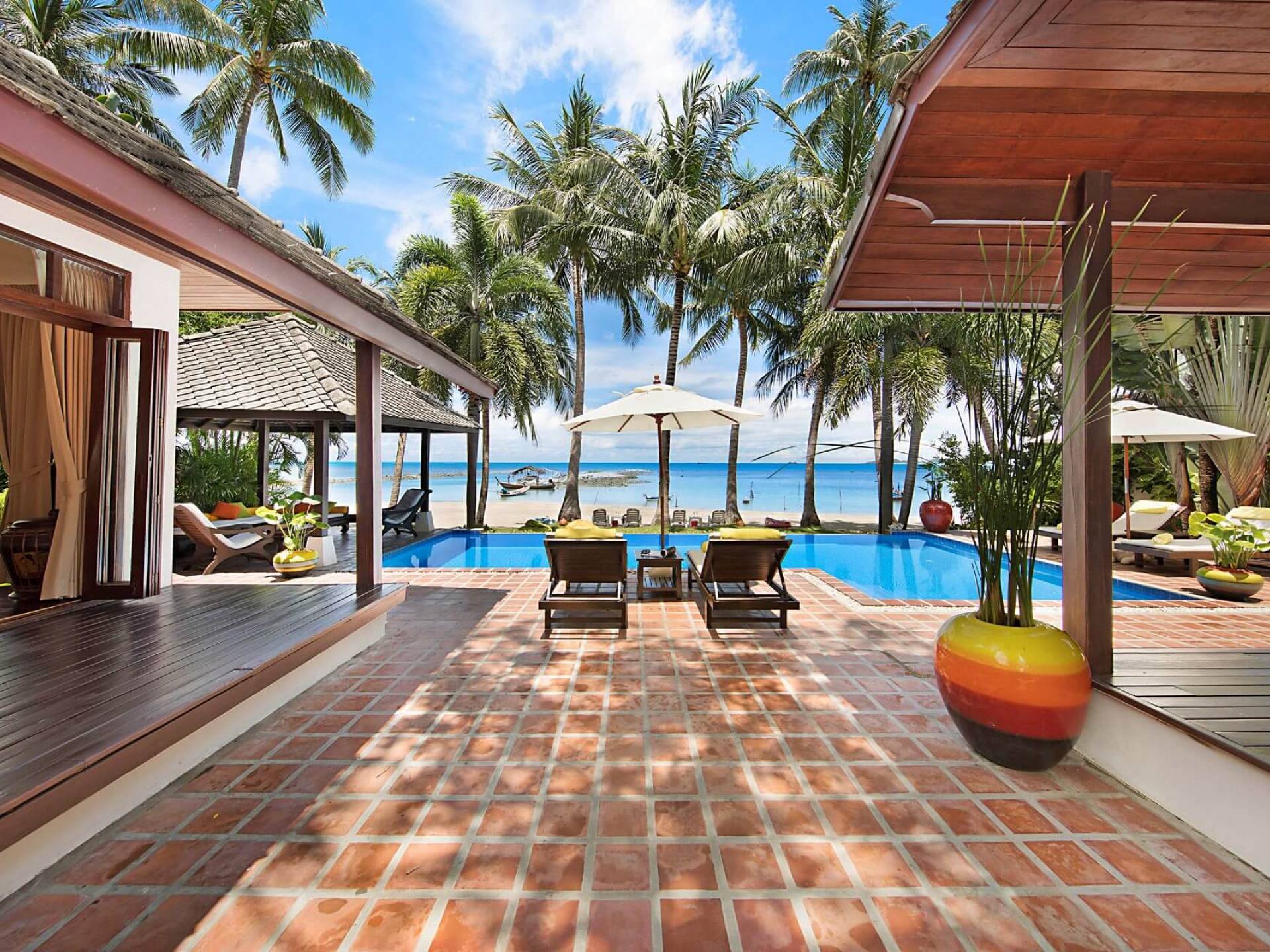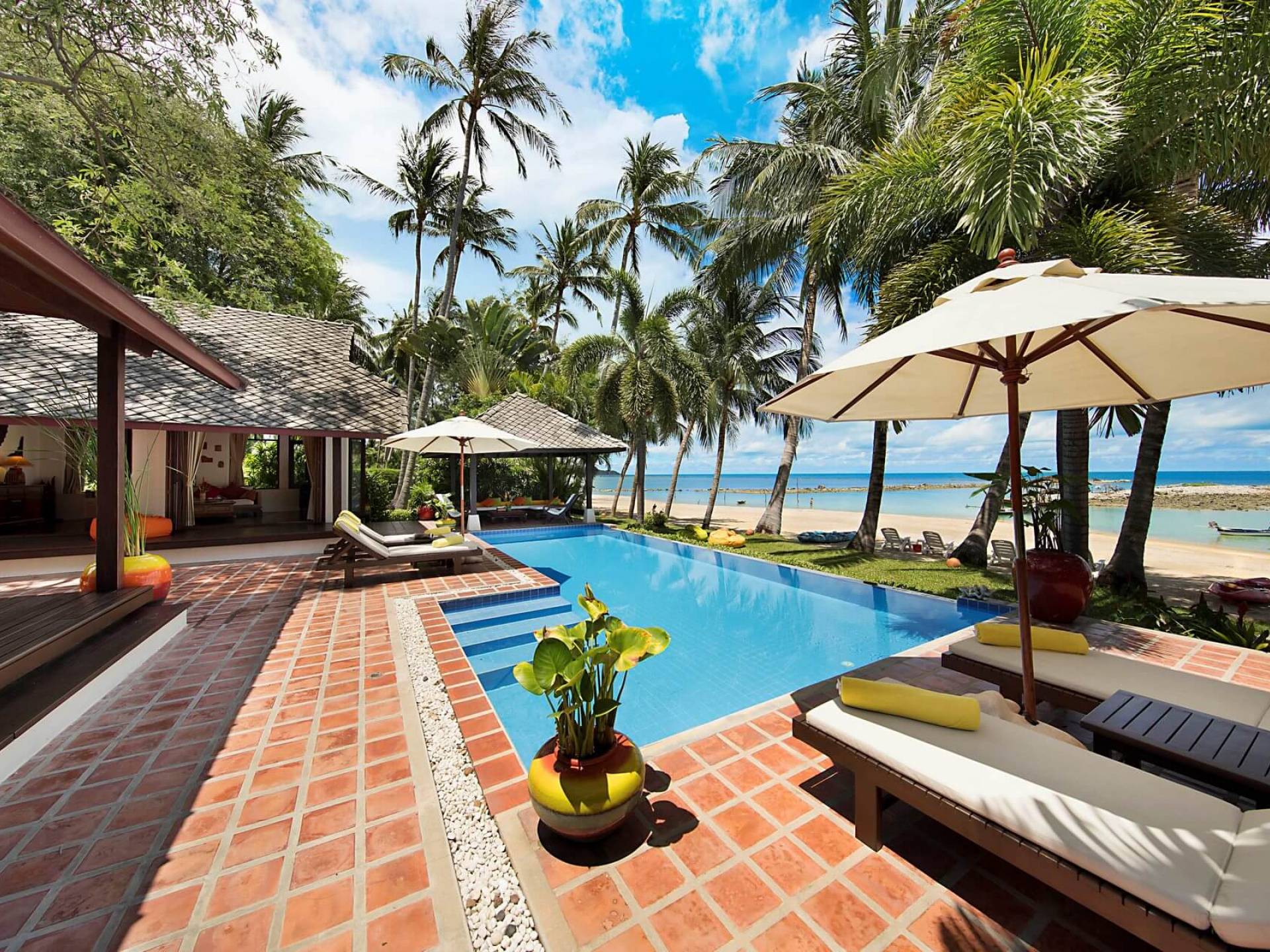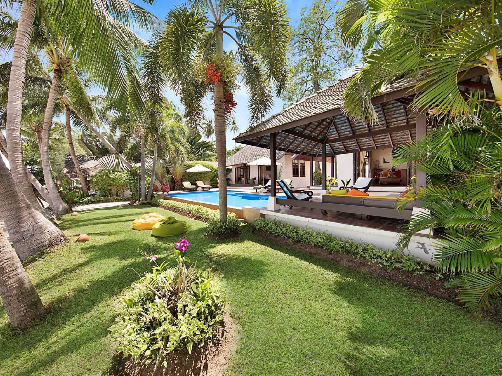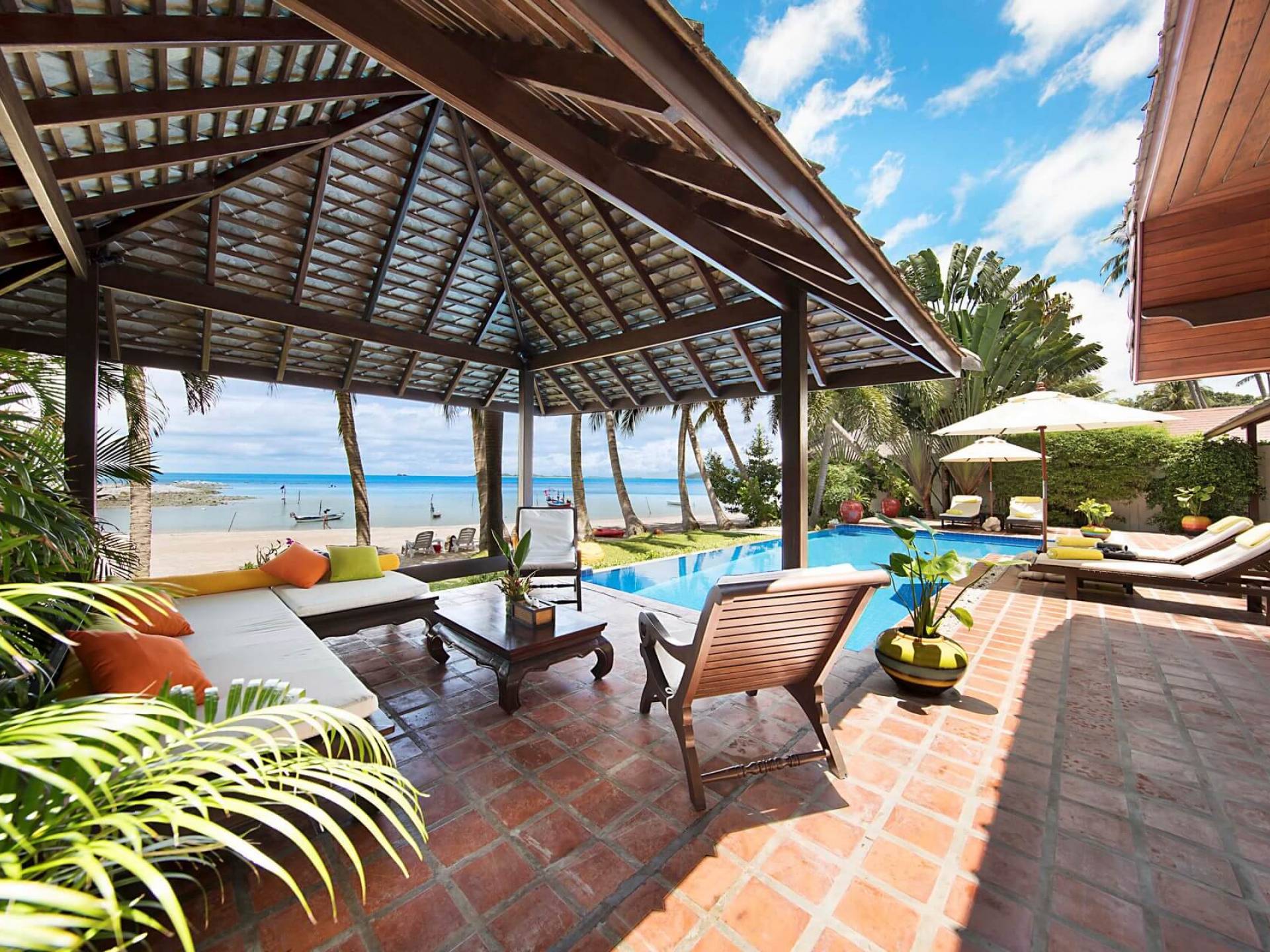 Villa Ban Laem Sor Samui se basa en una fusión tropical y un concepto de vida al aire libre. Ban Laem Sor se basa en una fusión tropical y un concepto de vida al aire libre. La villa se divide en cuatro pabellones. Más cerca de la playa se encuentra el pabellón de estar en un lado y los dos dormitorios principales en el otro. Un poco más atrás se encuentran los otros dos pabellones que albergan la cocina, el comedor y dos dormitorios más. El resto de la propiedad está cubierto con baldosas de terracota lisas y terrazas de madera.