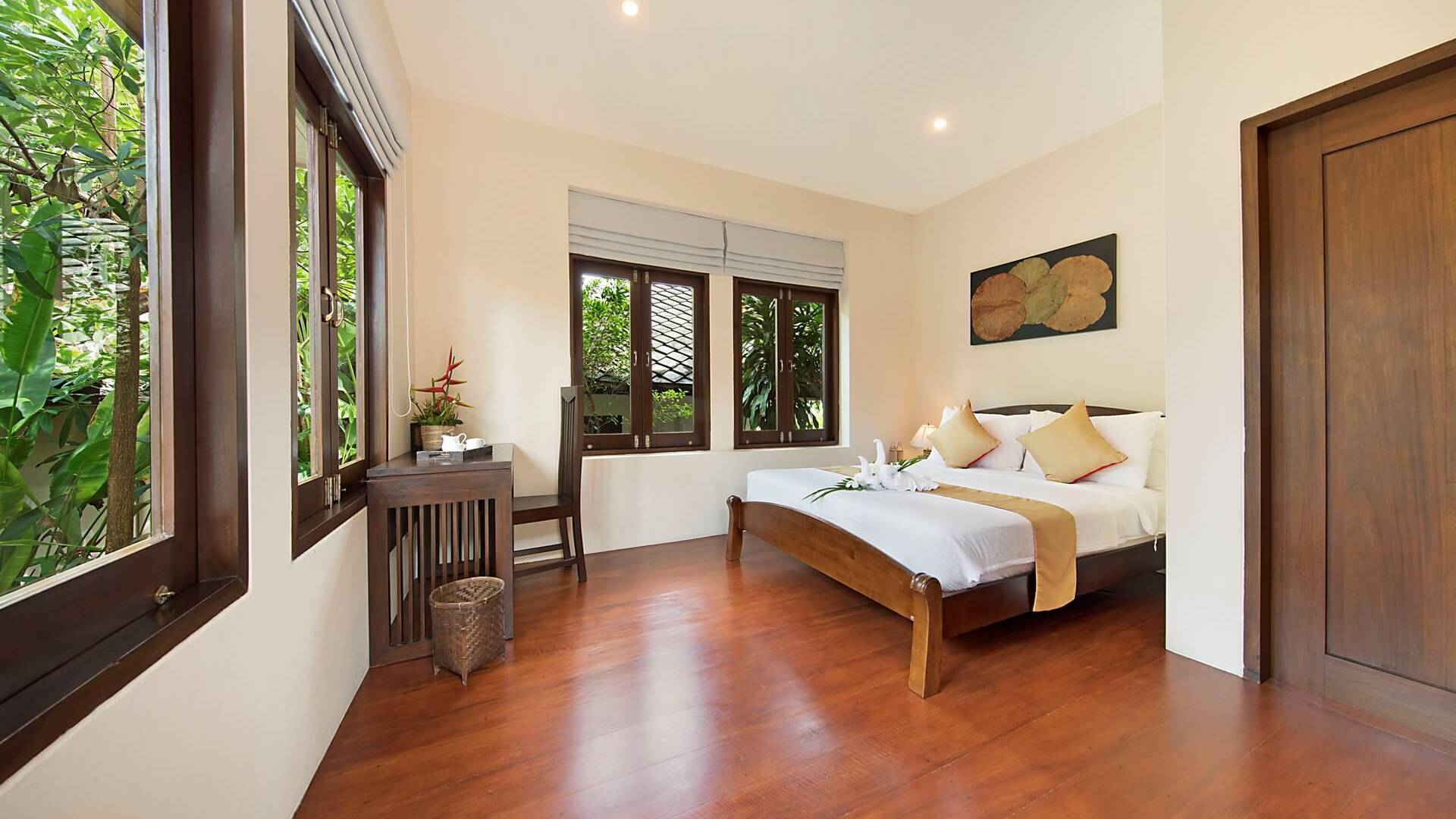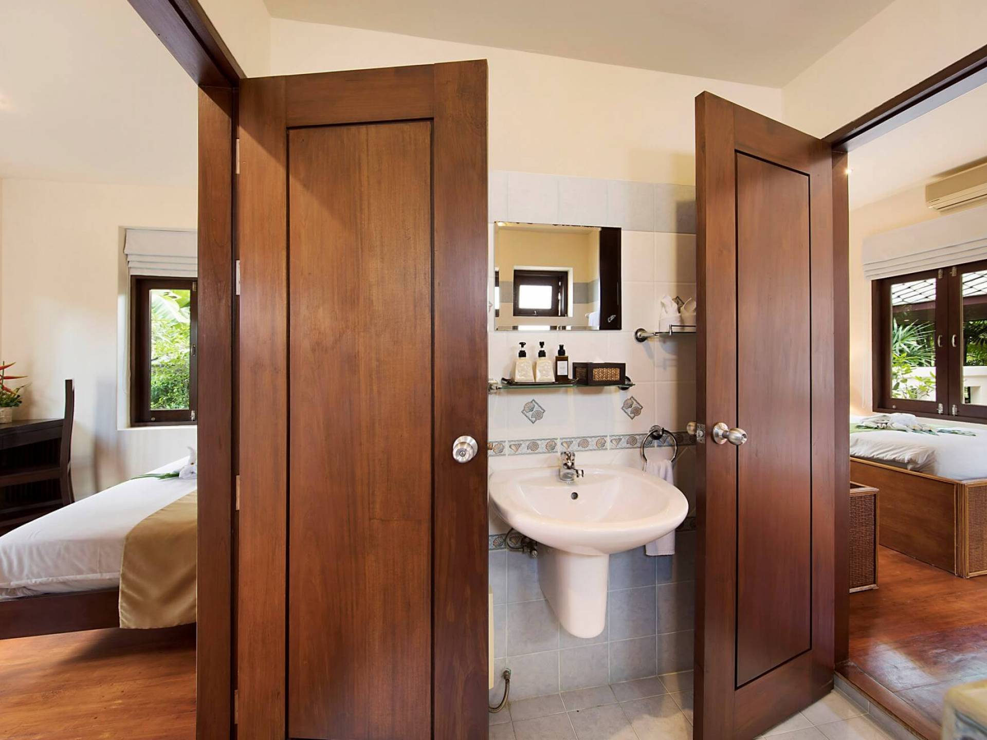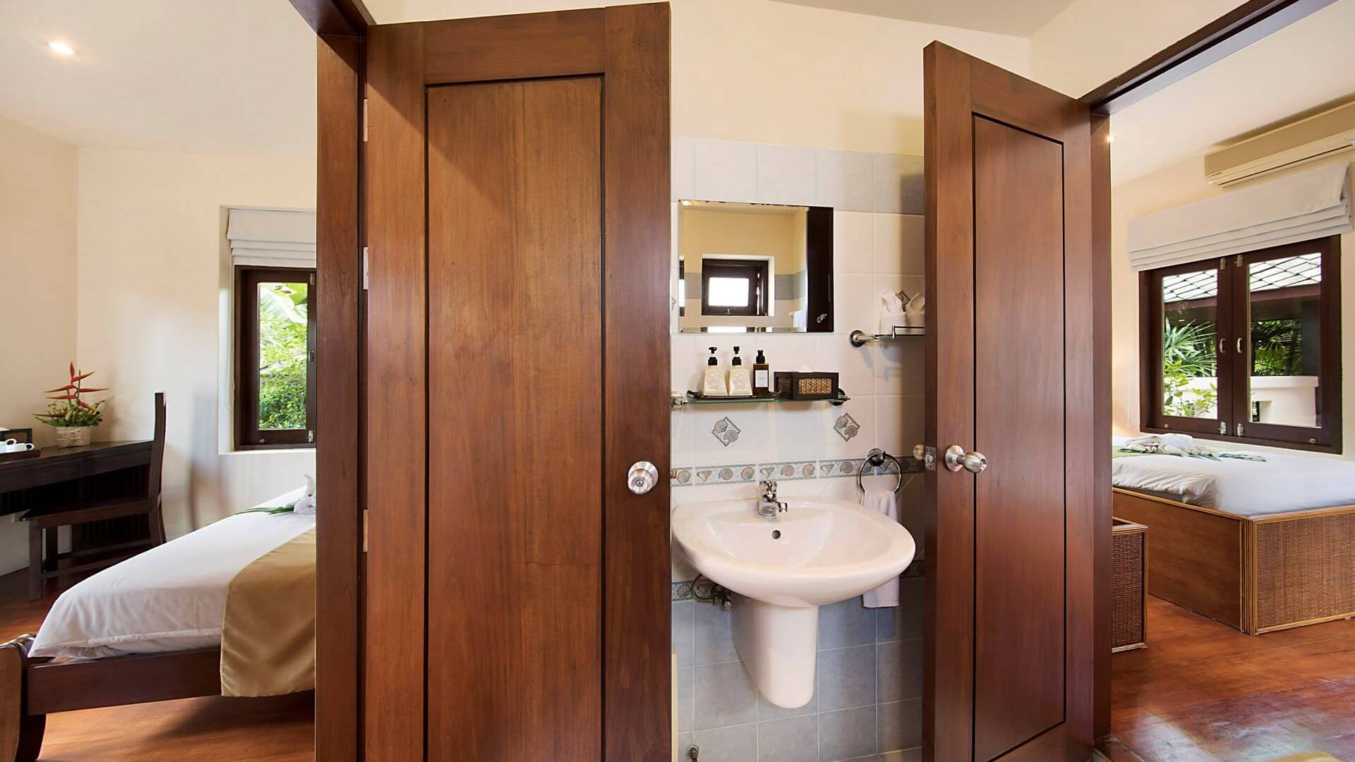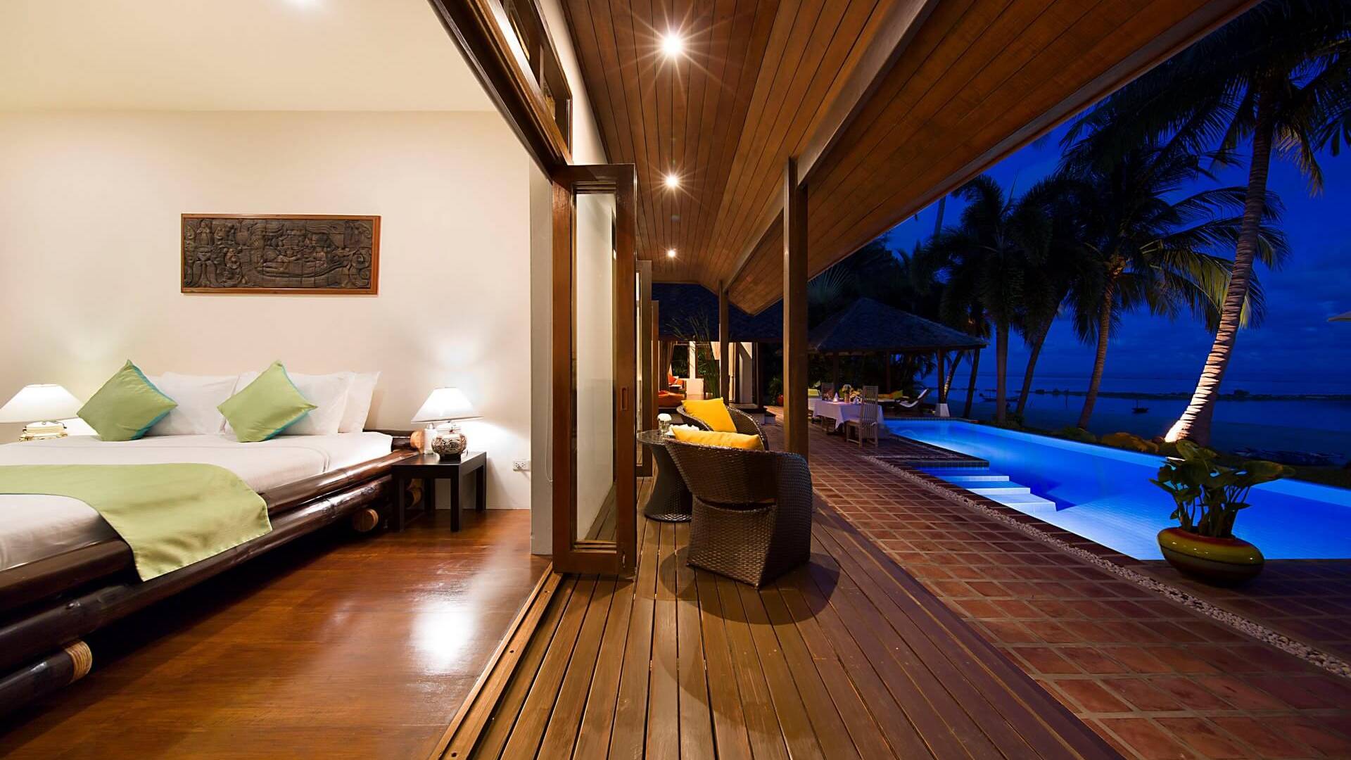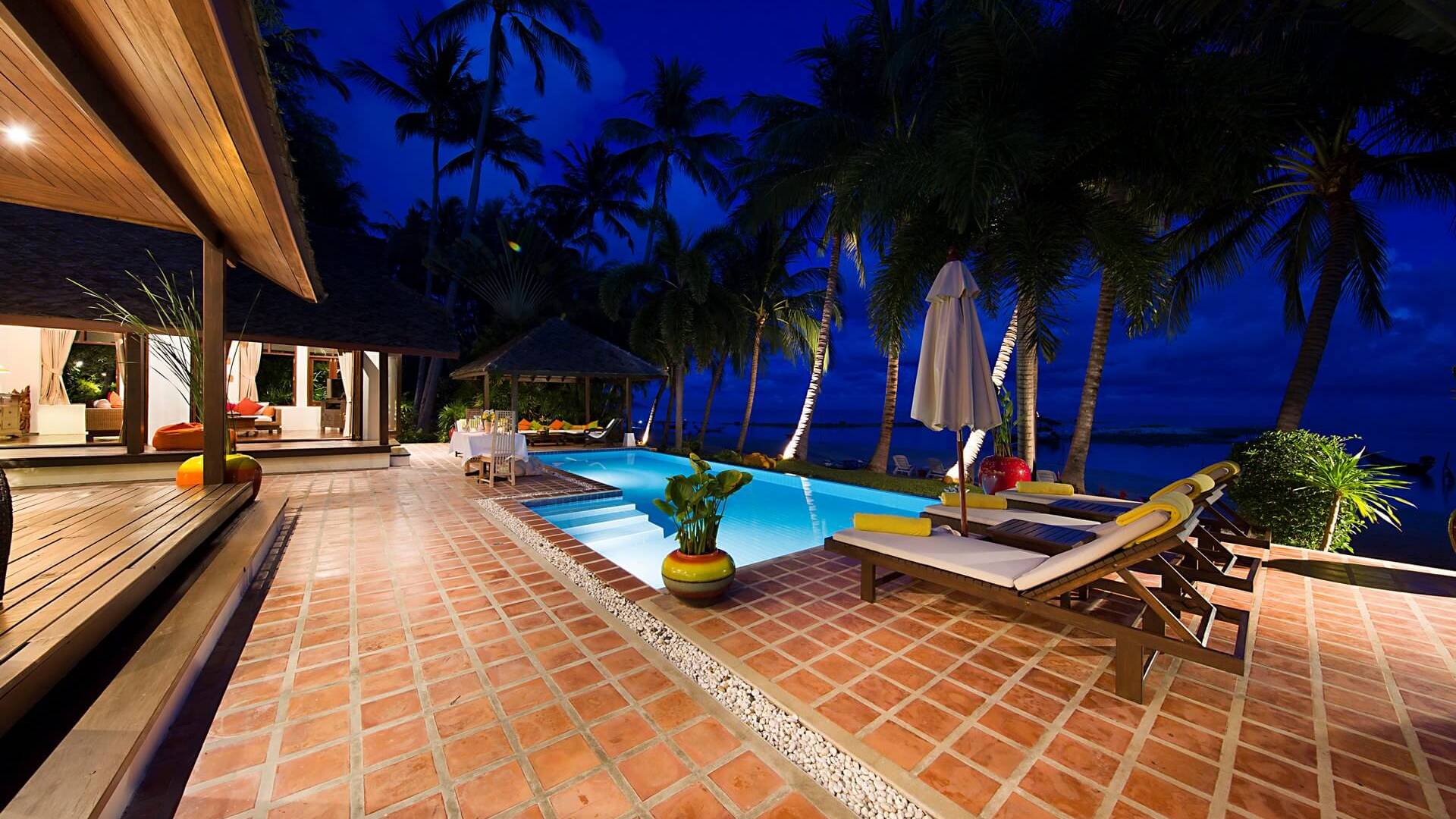 Villa Ban Laem Sor Samui se basa en una fusión tropical y un concepto de vida al aire libre. Ban Laem Sor se basa en una fusión tropical y un concepto de vida al aire libre. La villa se divide en cuatro pabellones. Más cerca de la playa se encuentra el pabellón de estar en un lado y los dos dormitorios principales en el otro. Un poco más atrás se encuentran los otros dos pabellones que albergan la cocina, el comedor y dos dormitorios más. El resto de la propiedad está cubierto con baldosas de terracota lisas y terrazas de madera.
