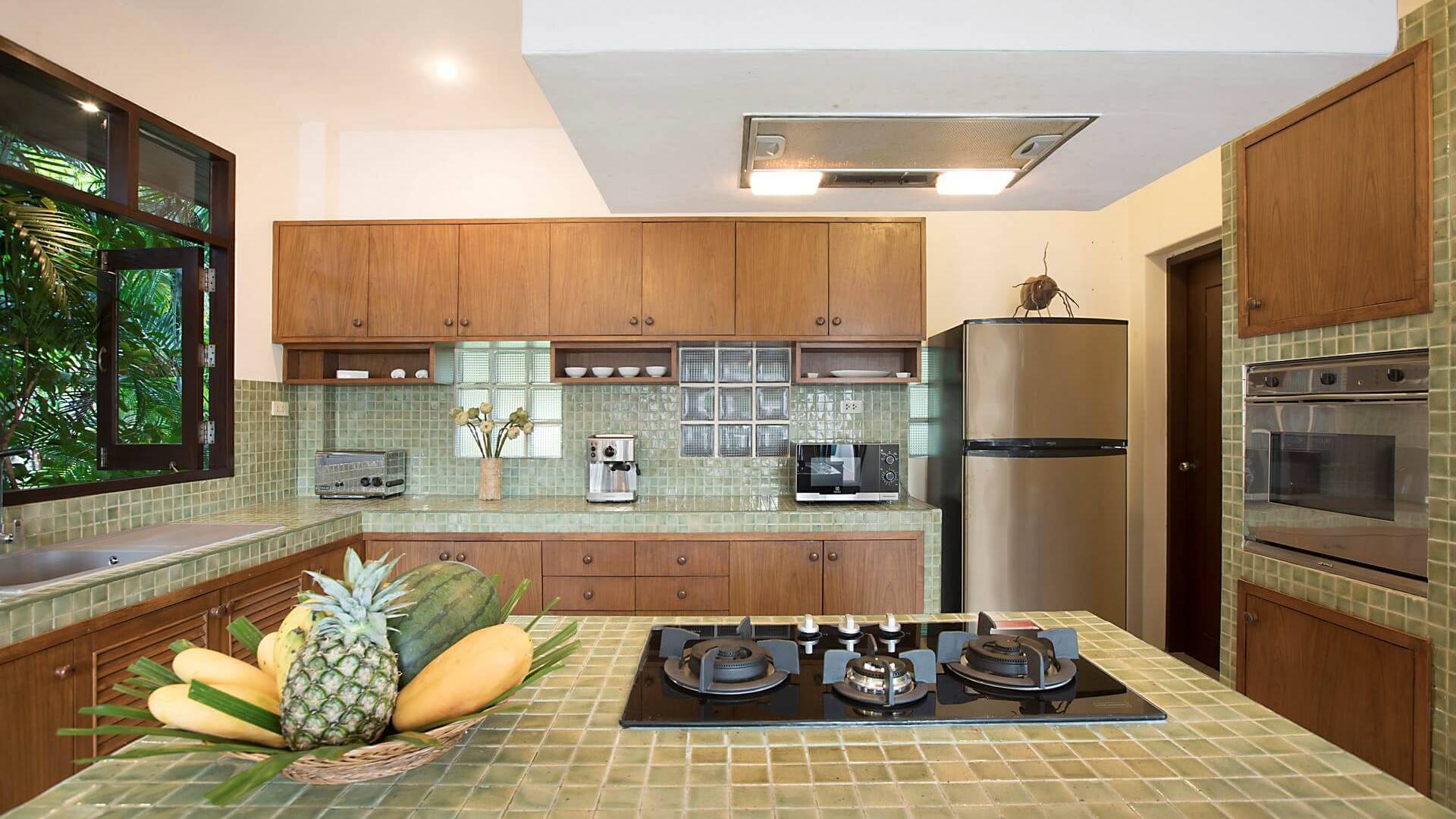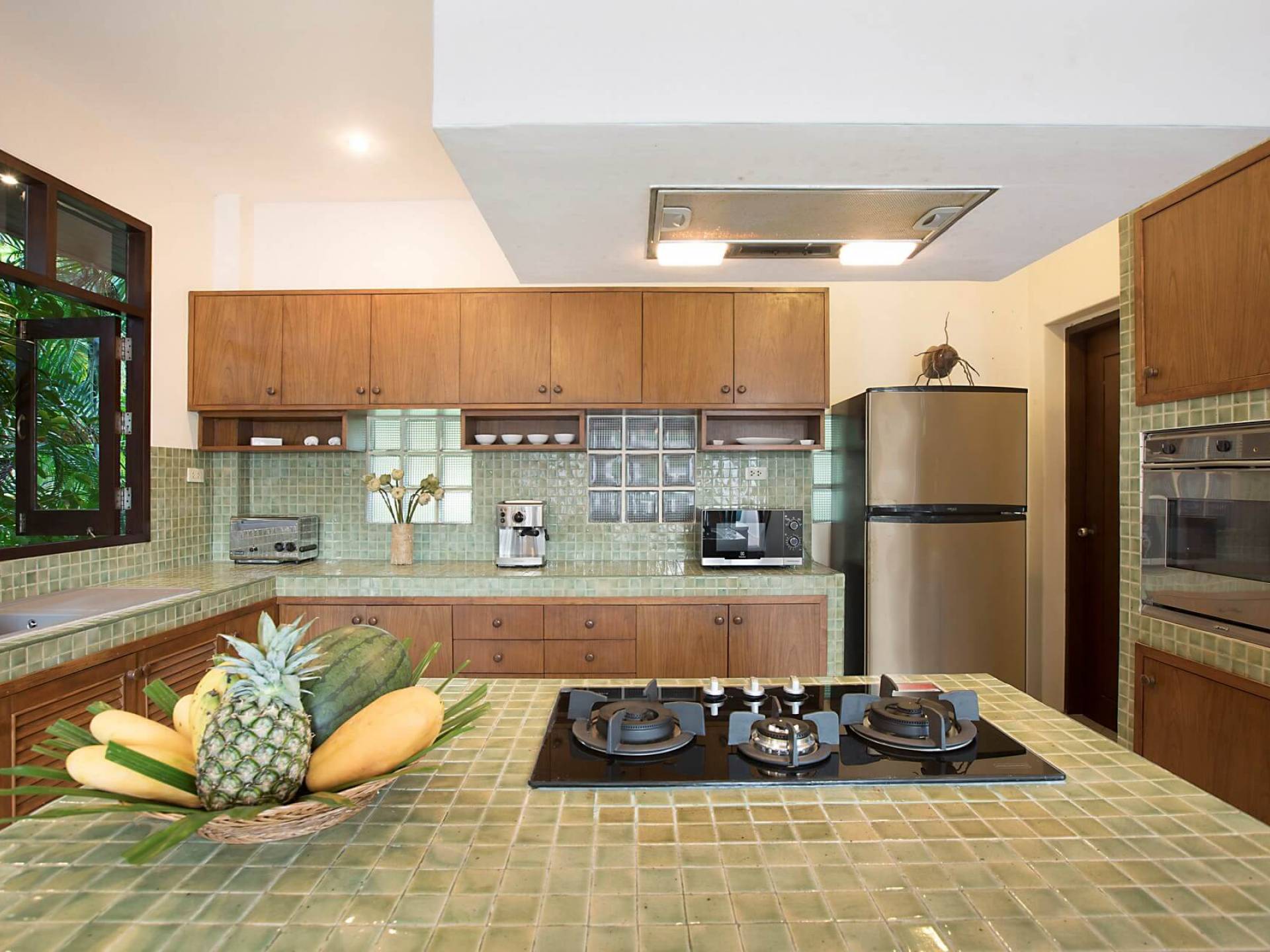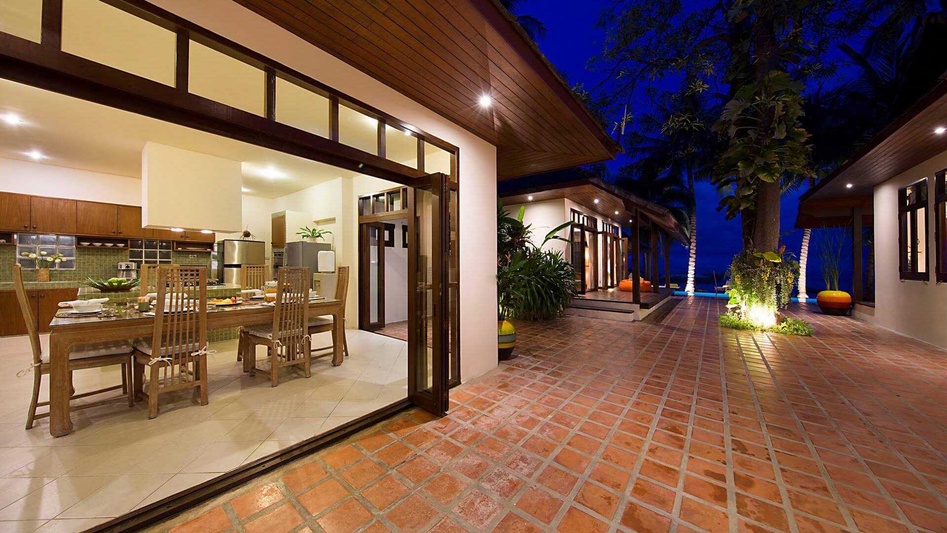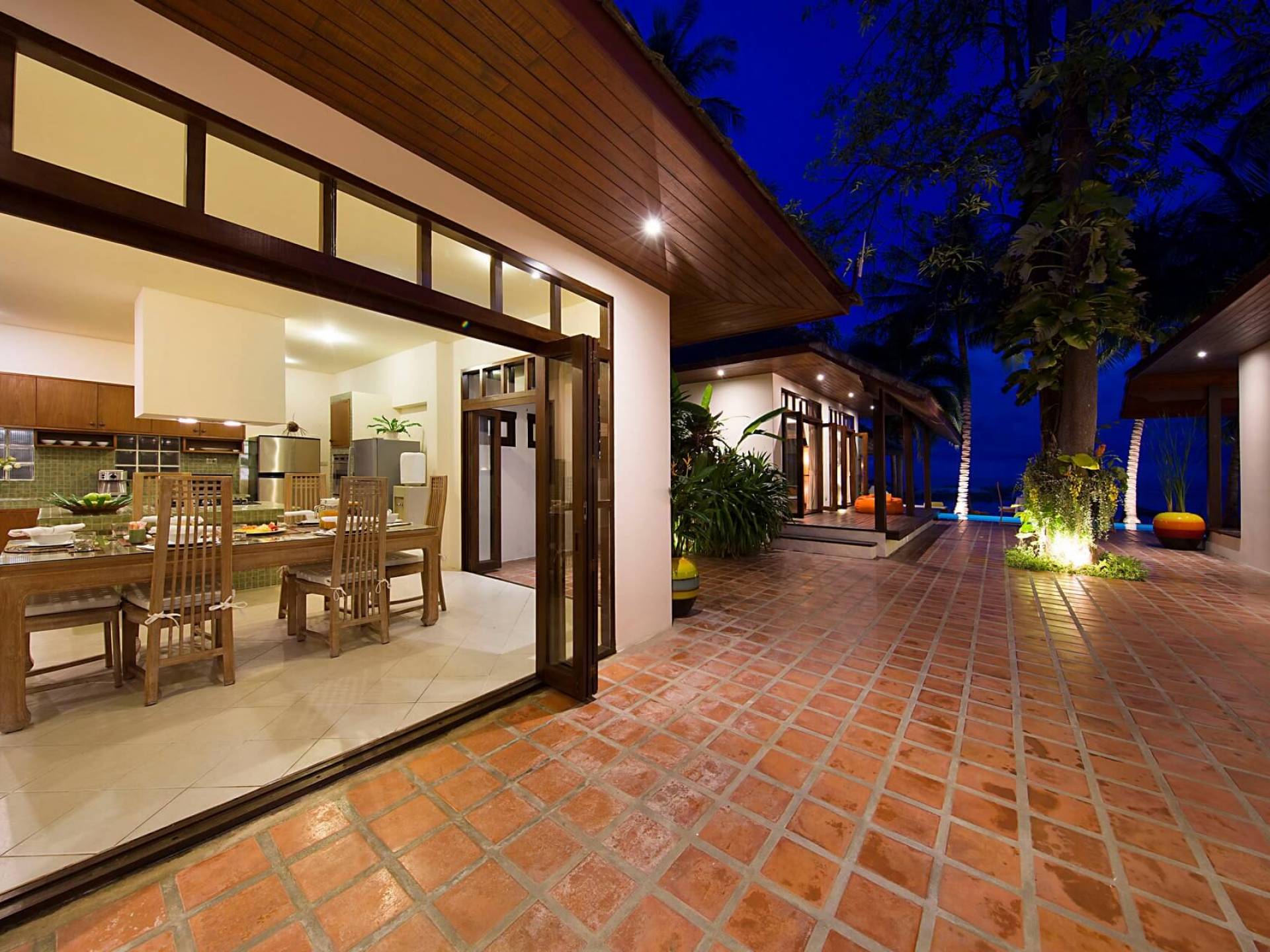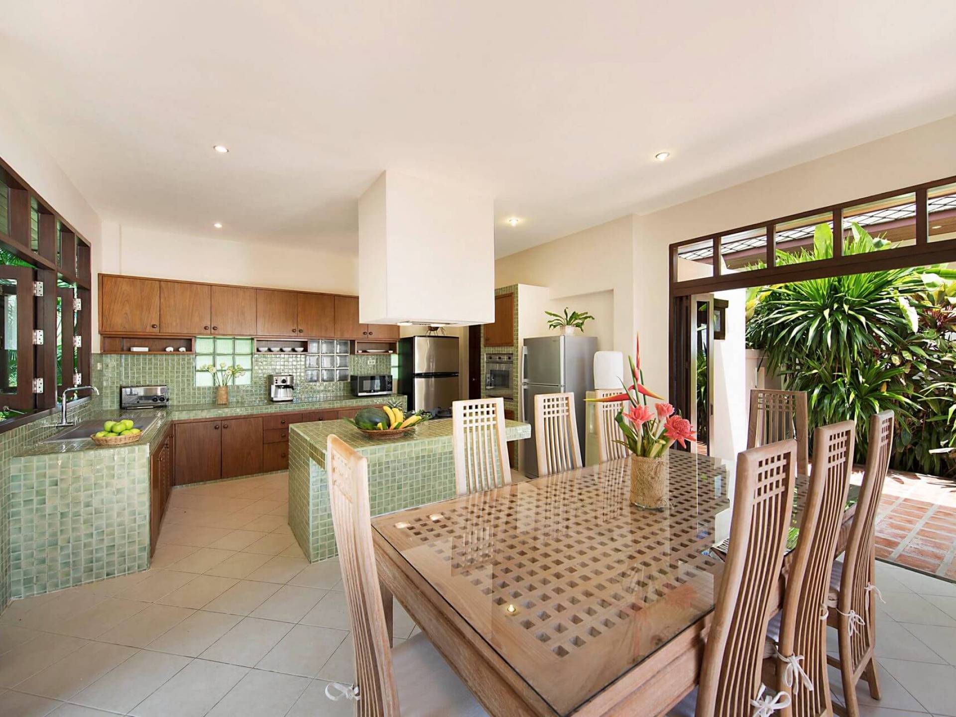 Para completar las instalaciones, la gran cocina y su mueble de cocina en isla aportan funcionalidad, espacio y comodidad. También es muy apreciado por aquellos que están aprendiendo a cocinar comida tailandesa, ya que está bien diseñada para que pueda participar más activamente con nuestro chef tailandés de lo que normalmente es posible en una cocina estándar. La mesa de comedor larga tiene vistas al mar y tiene capacidad para ocho personas.