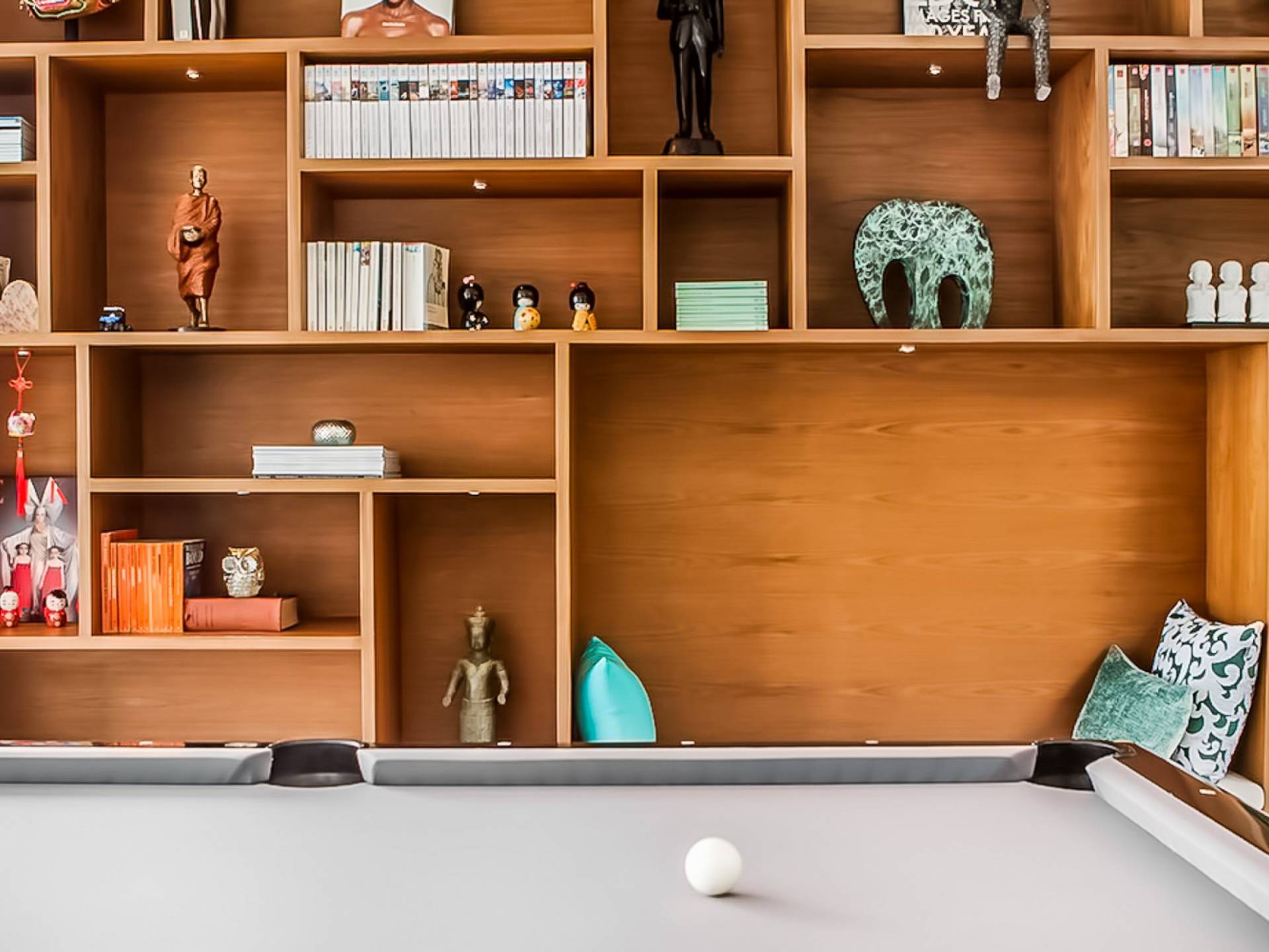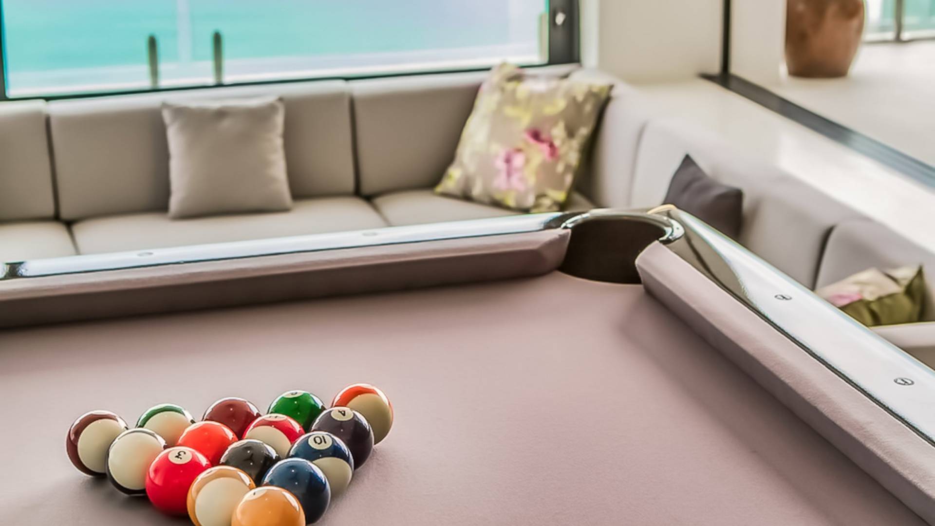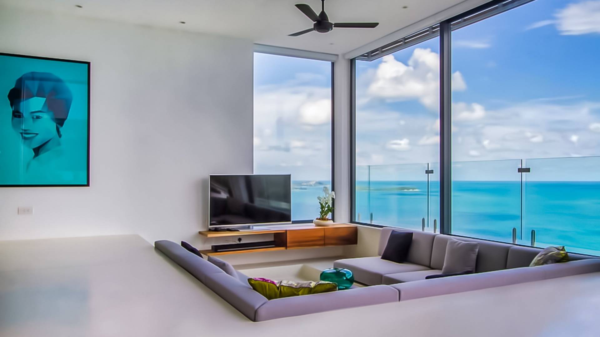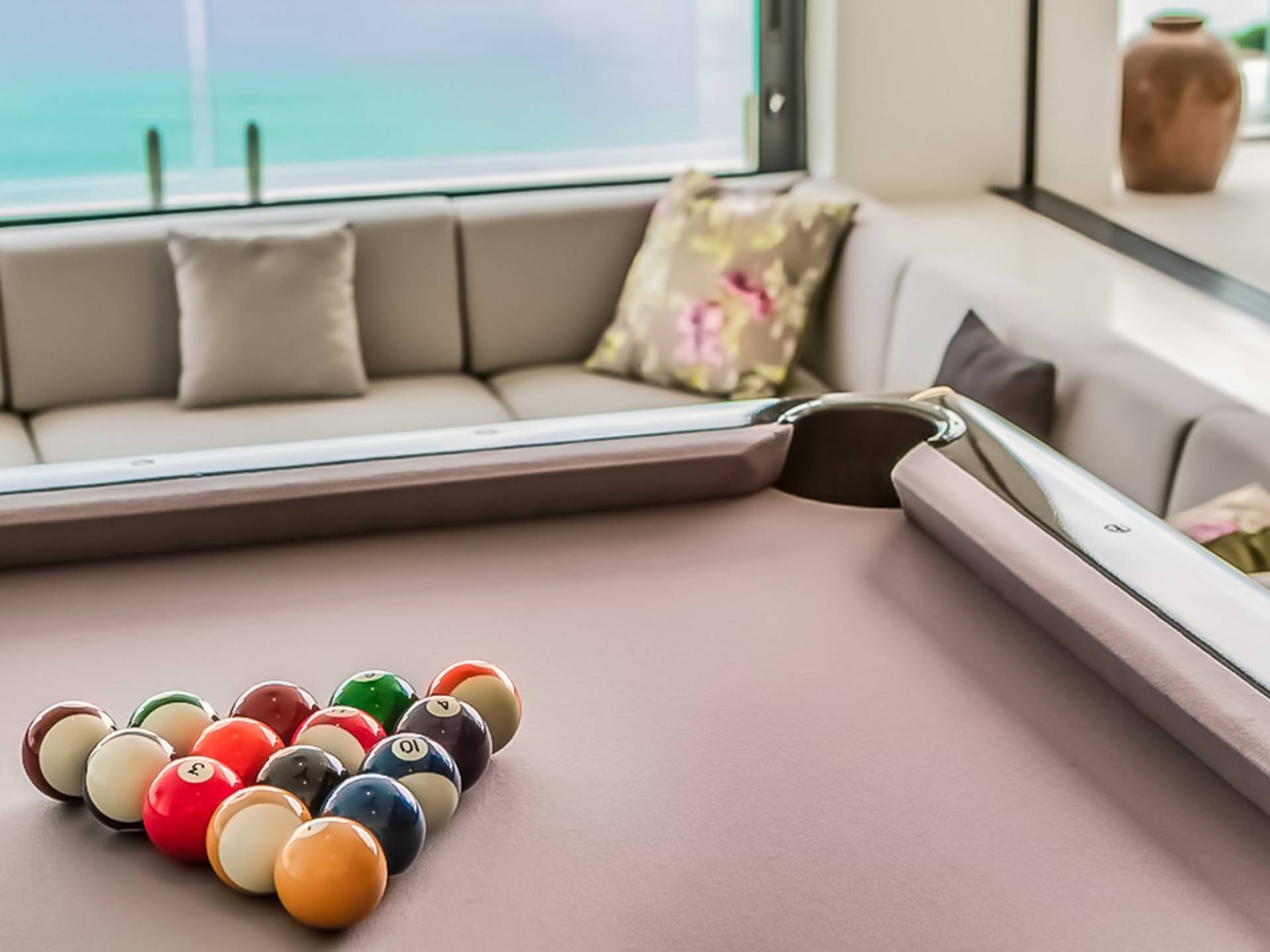El salón de la piscina tiene un área de asientos hundida que lo coloca en línea con el horizonte. Si puede apartar la vista de la vista, hay un televisor inteligente 3D de 55 ”, IPTV que ofrece 500 canales, todas las películas y series de televisión más recientes a pedido. Barra de sonido SONOS wifi. Mesa de billar americano. Y una estantería del piso al techo llena de artefactos, libros y revistas.