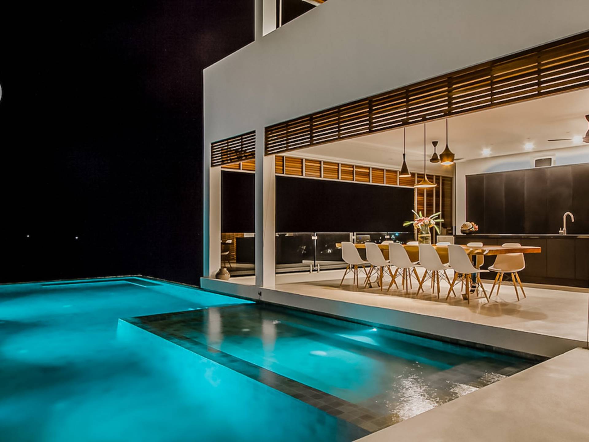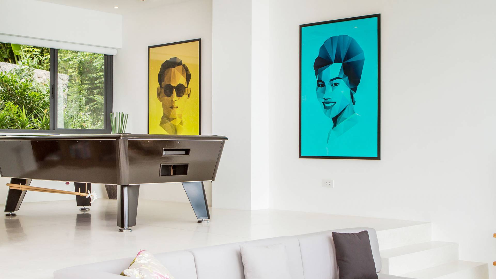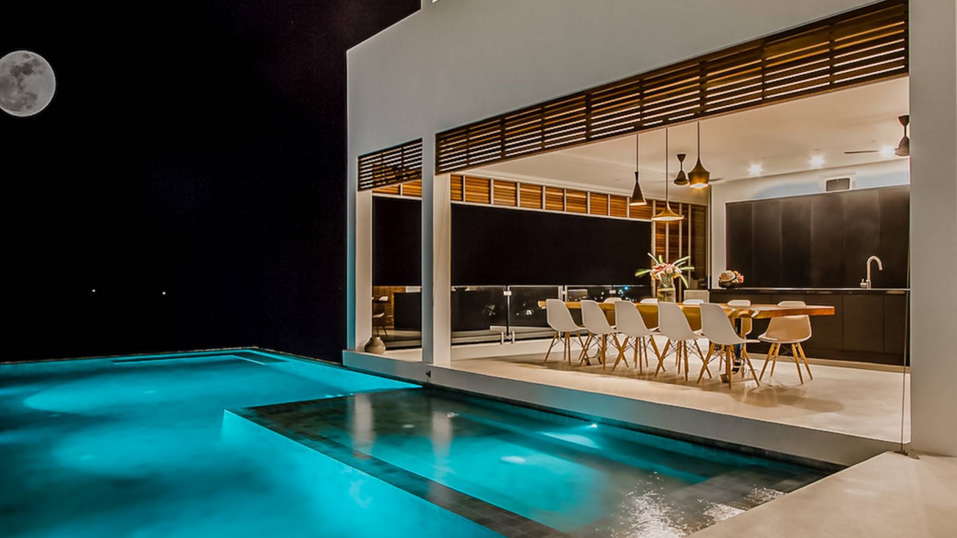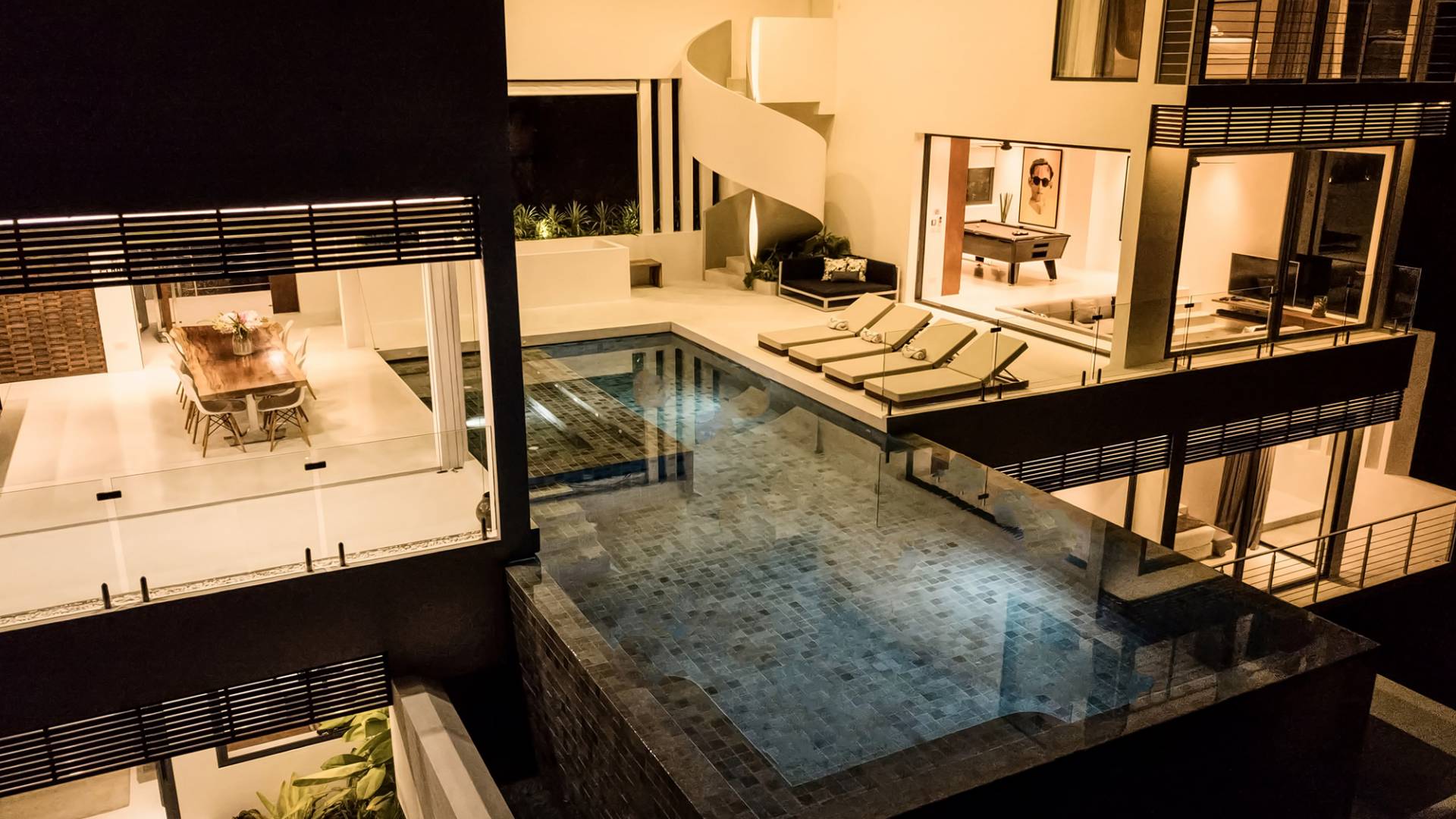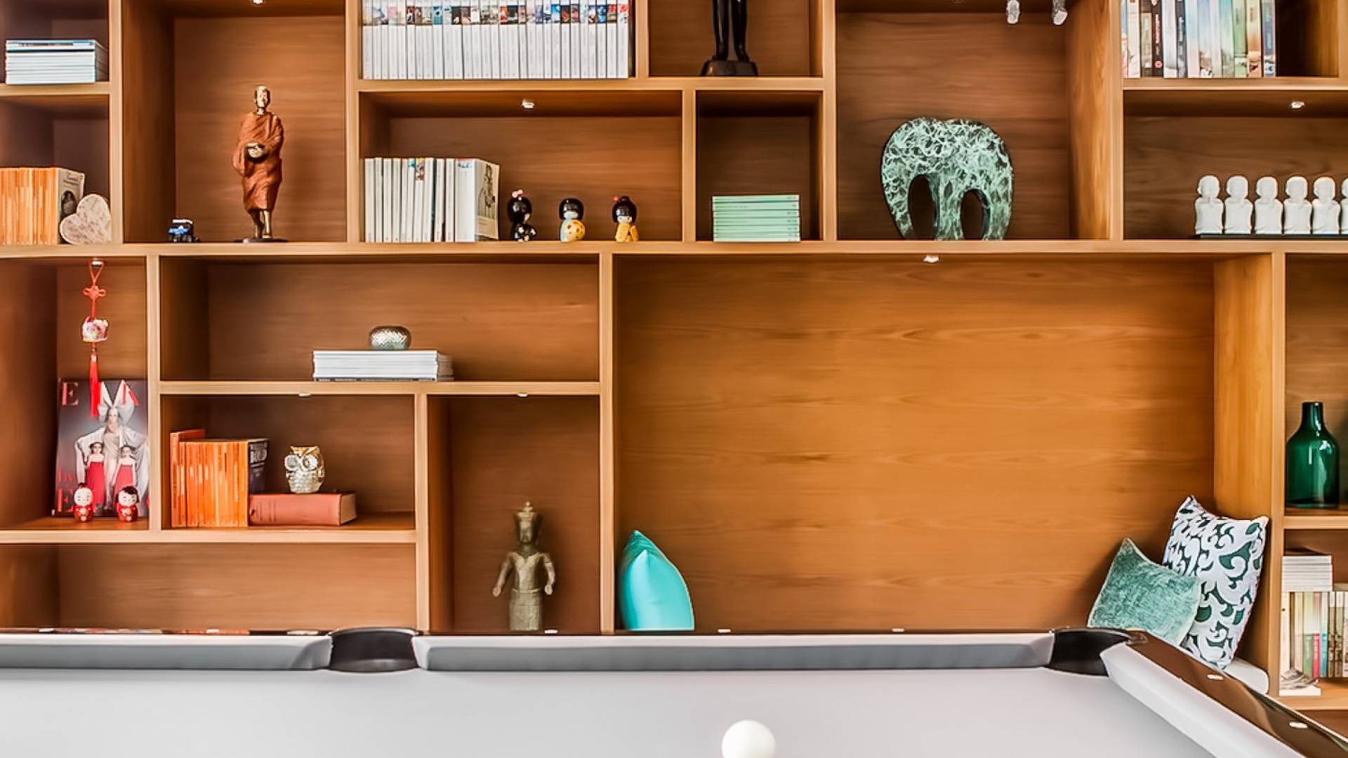 El salón de la piscina tiene un área de asientos hundida que lo coloca en línea con el horizonte. Si puede apartar la vista de la vista, hay un televisor inteligente 3D de 55 ”, IPTV que ofrece 500 canales, todas las películas y series de televisión más recientes a pedido. Barra de sonido SONOS wifi. Mesa de billar americano. Y una estantería del piso al techo llena de artefactos, libros y revistas.
