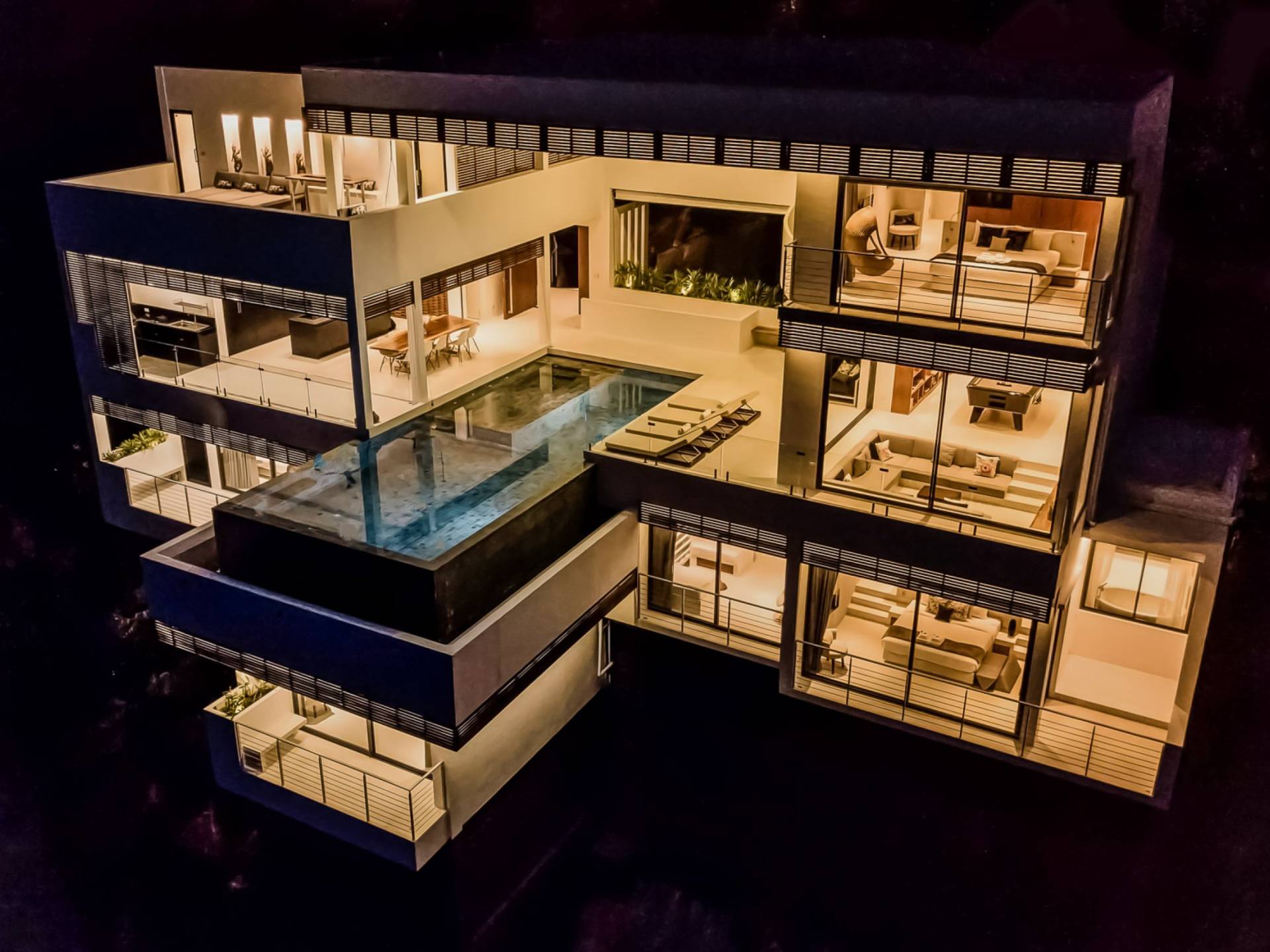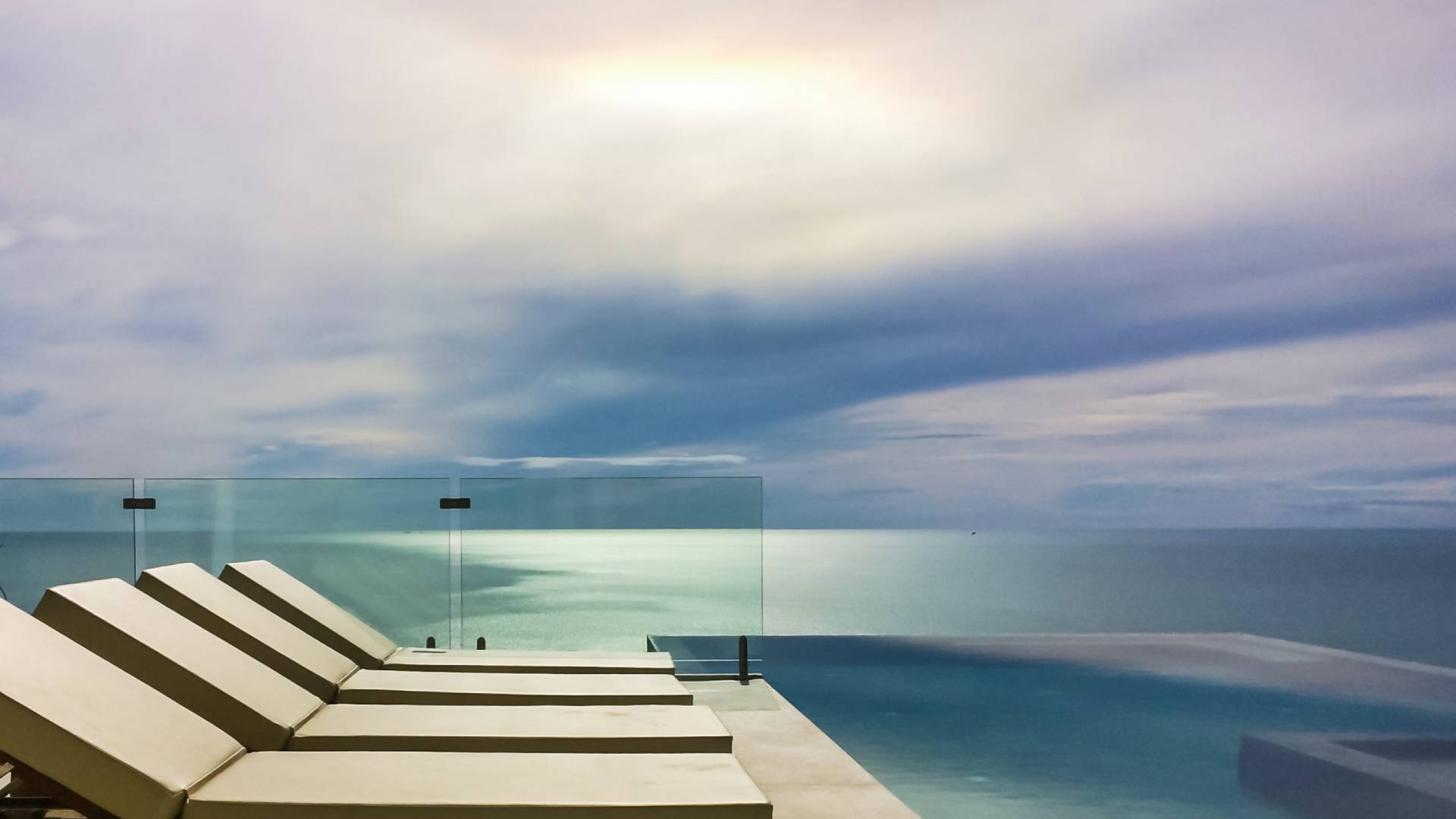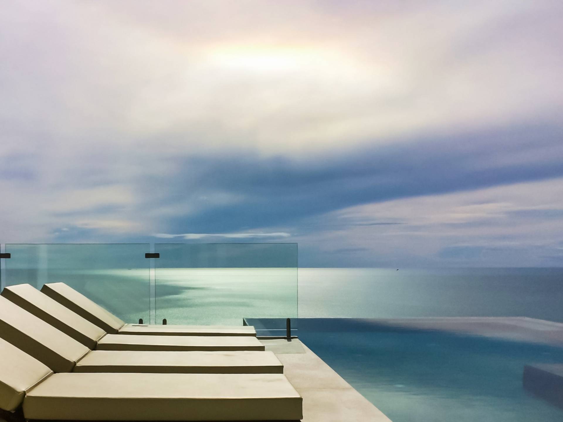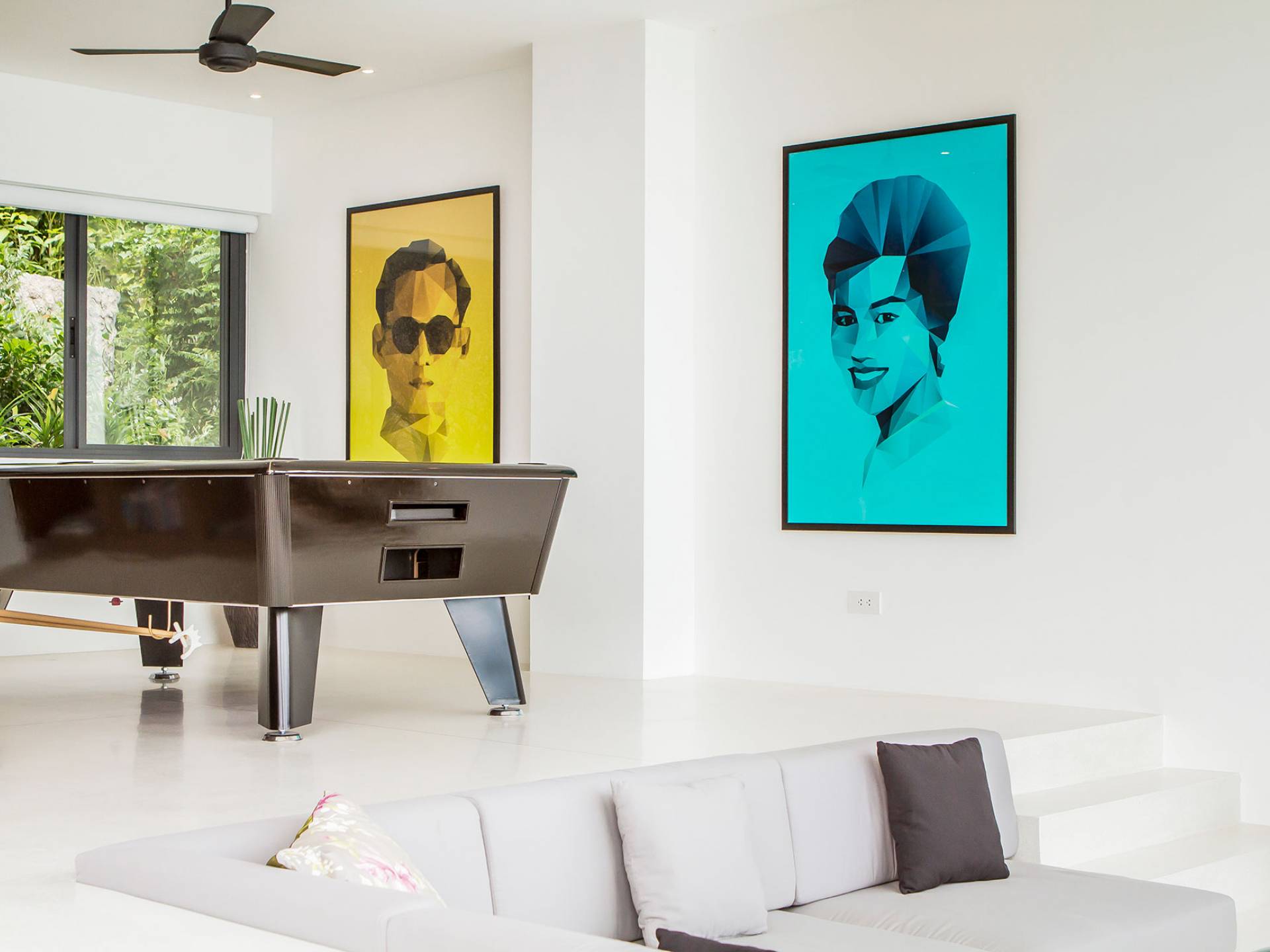 El salón de la piscina tiene un área de asientos hundida que lo coloca en línea con el horizonte. Si puede apartar la vista de la vista, hay un televisor inteligente 3D de 55 ”, IPTV que ofrece 500 canales, todas las películas y series de televisión más recientes a pedido. Barra de sonido SONOS wifi. Mesa de billar americano. Y una estantería del piso al techo llena de artefactos, libros y revistas.