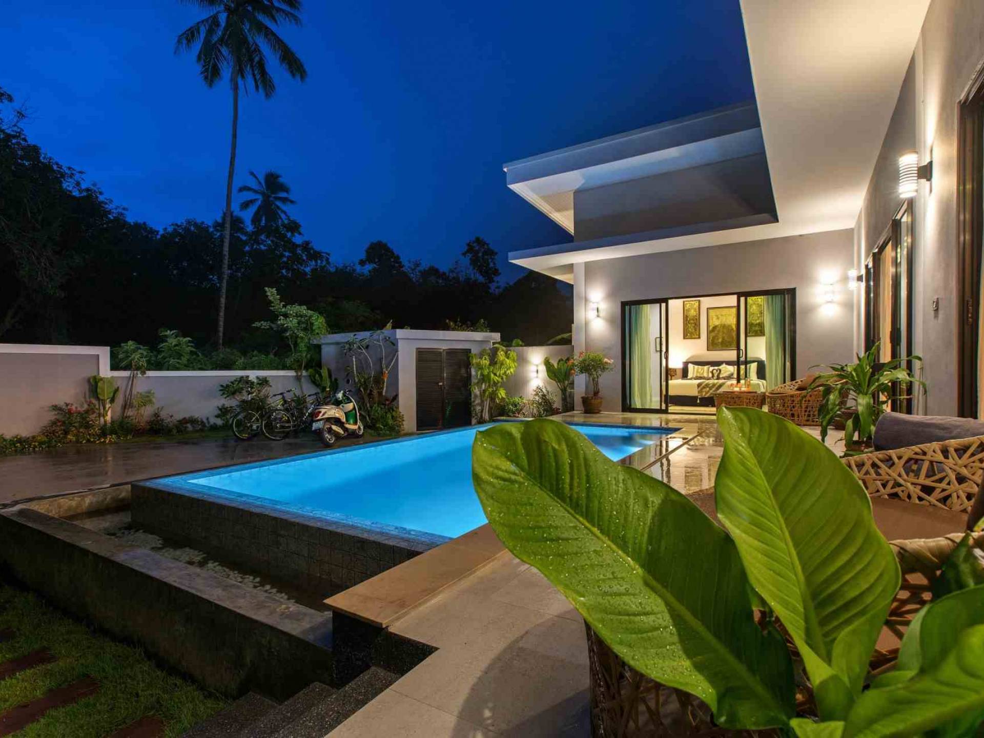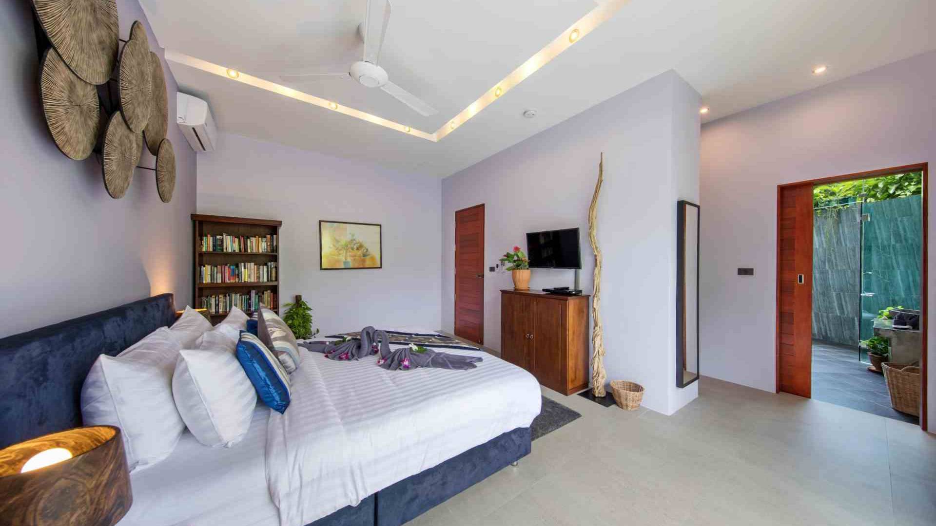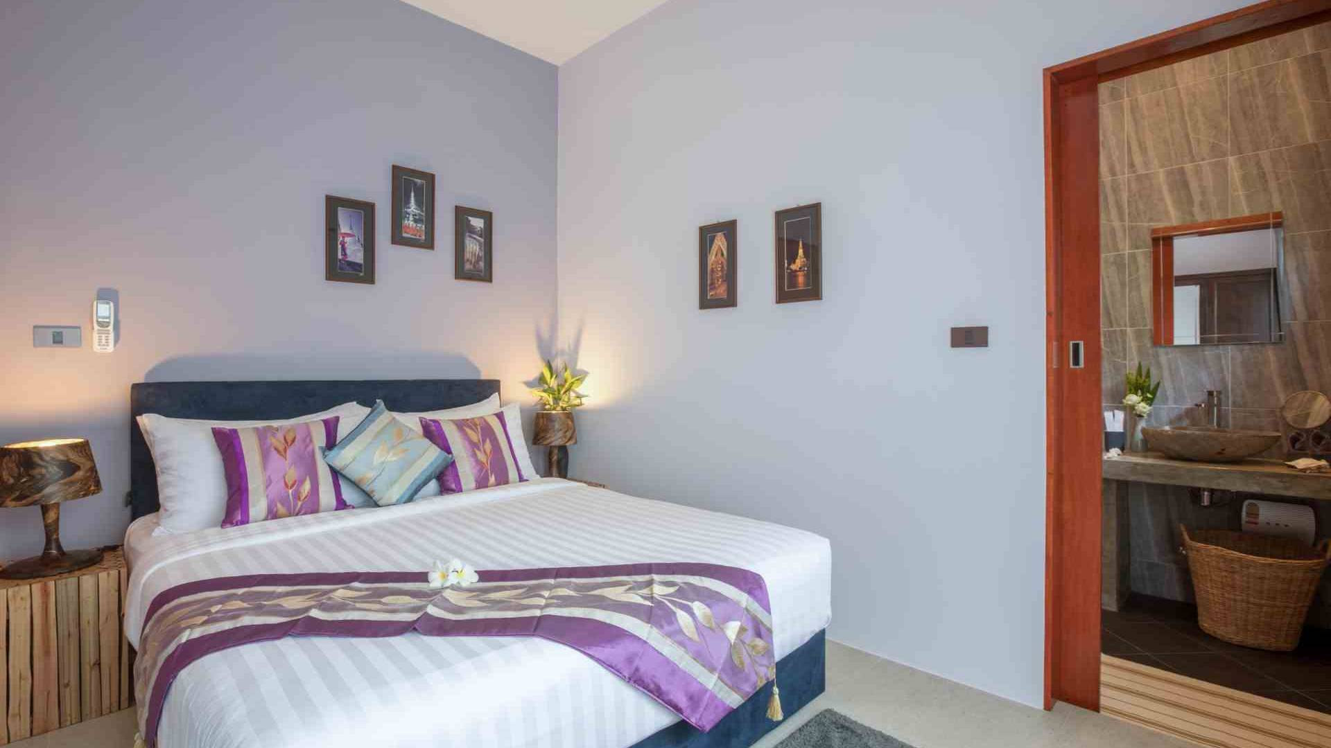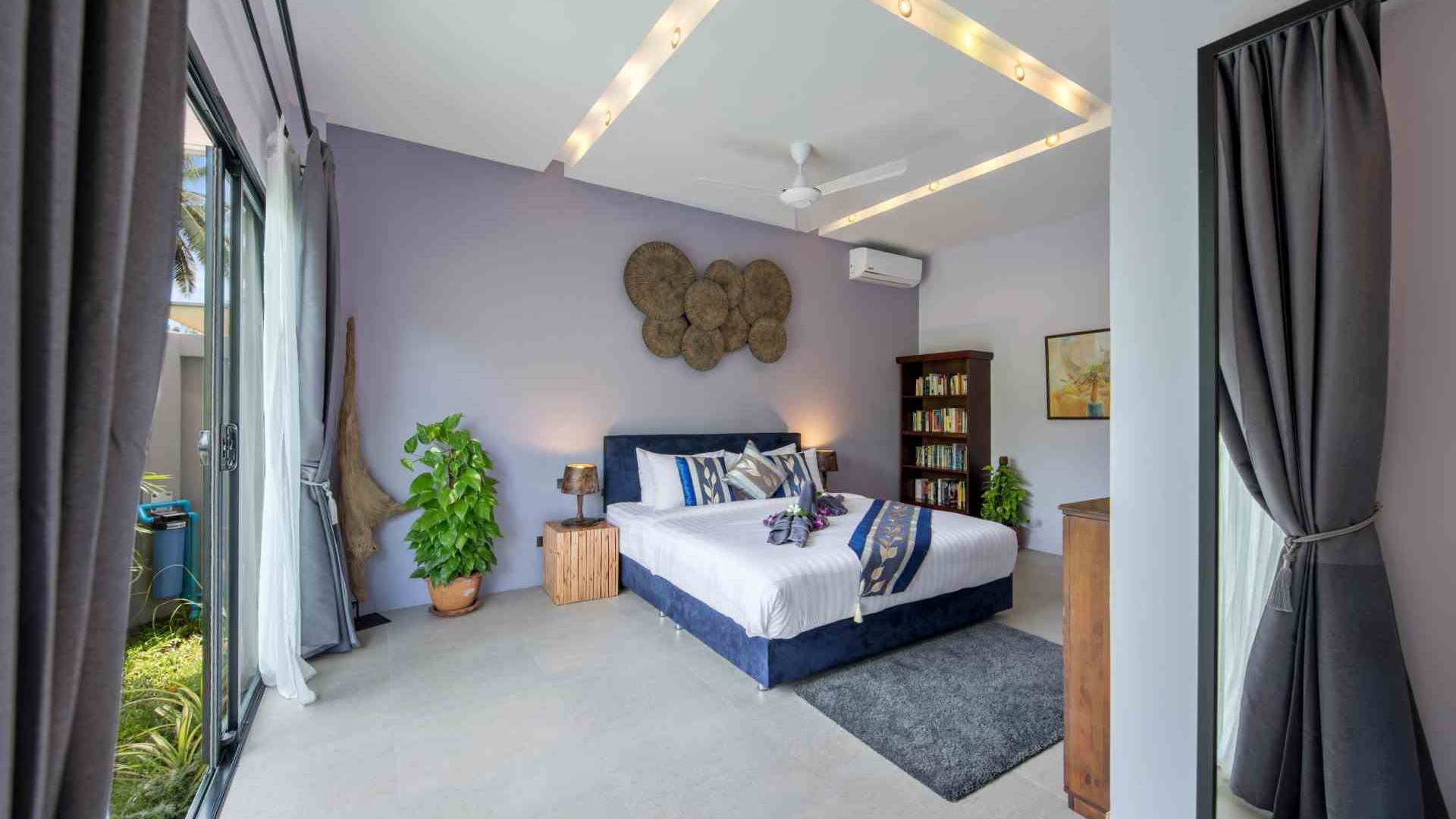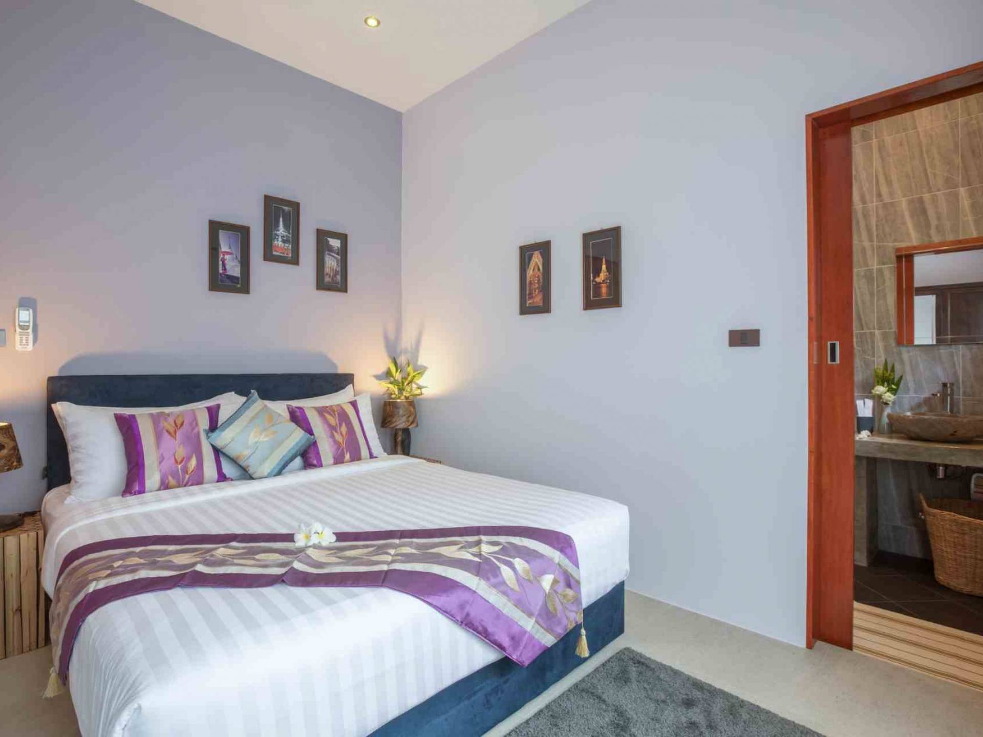 Baan Suaan Bua Villa Samui es una villa de lujo en alquiler con 3 dormitorios y piscina privada. Pool villa Baan Suaan Bua se encuentra en una tranquila zona tropical en el sur de la isla. Esta villa con todos los servicios está cerca no de 1, sino de 3 hermosas playas naturales e idílicas. Playa Leam Sor (500 m), playa Put Tal (150 m) y playa Thong Krut (300 m). Baan Suaan Bua Villa Samui tiene 3 dormitorios con baño. 2 de los cuales tienen sus propios jardines privados. Sala de estar espaciosa con cómodos sofás, televisor de pantalla grande y una moderna cocina / comedor totalmente equipada.