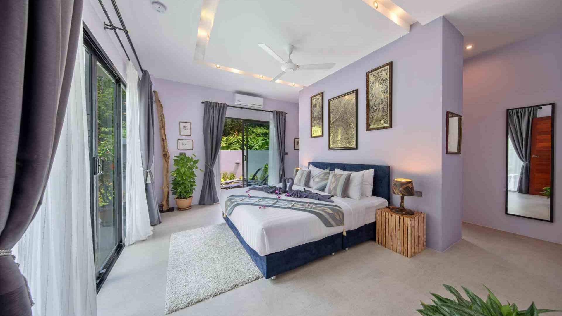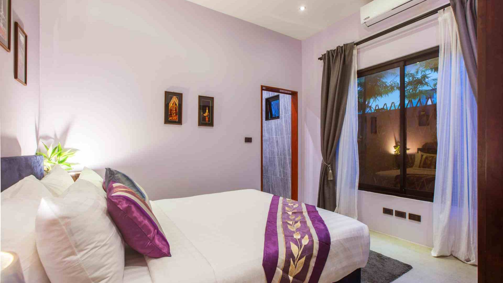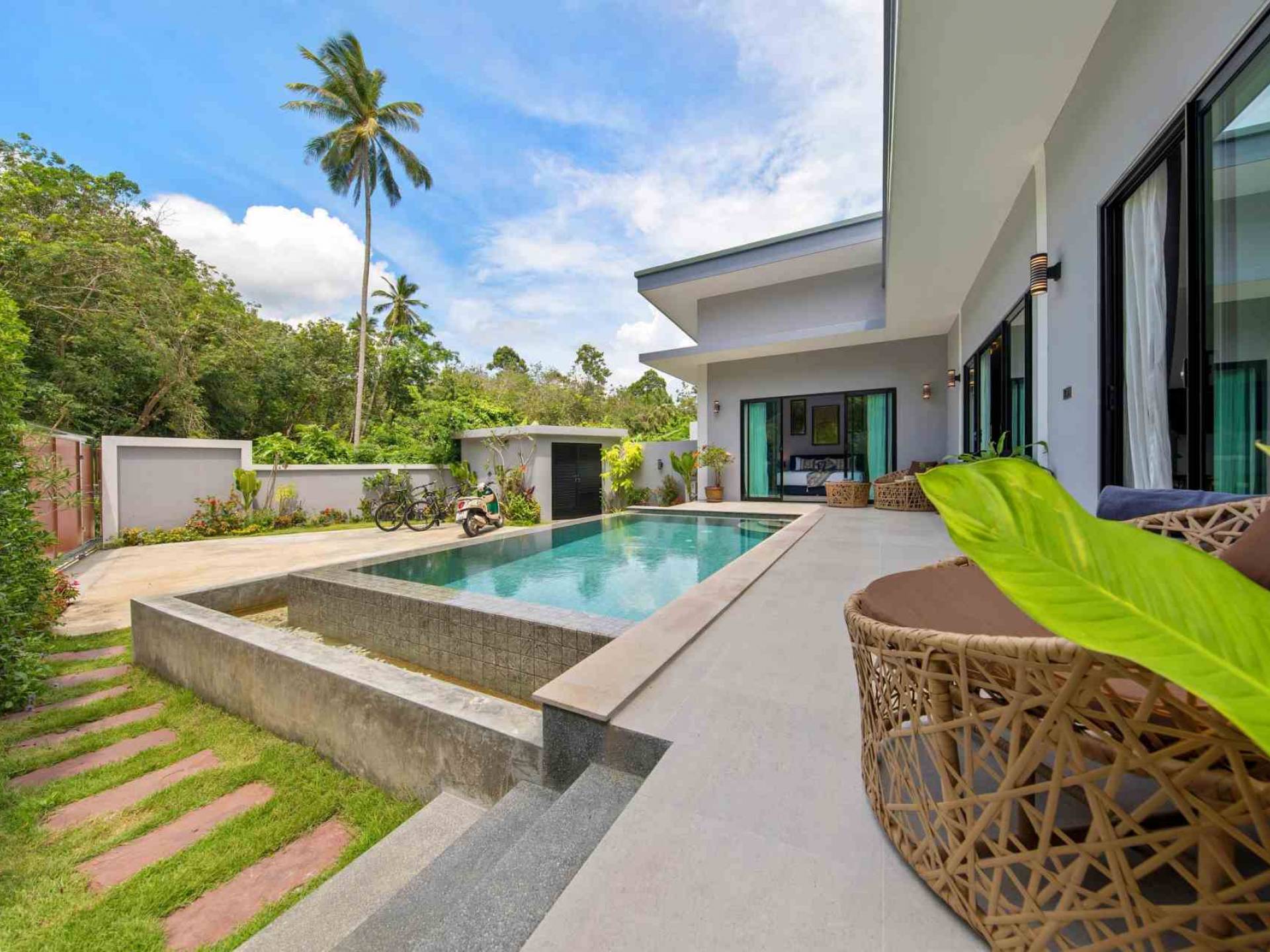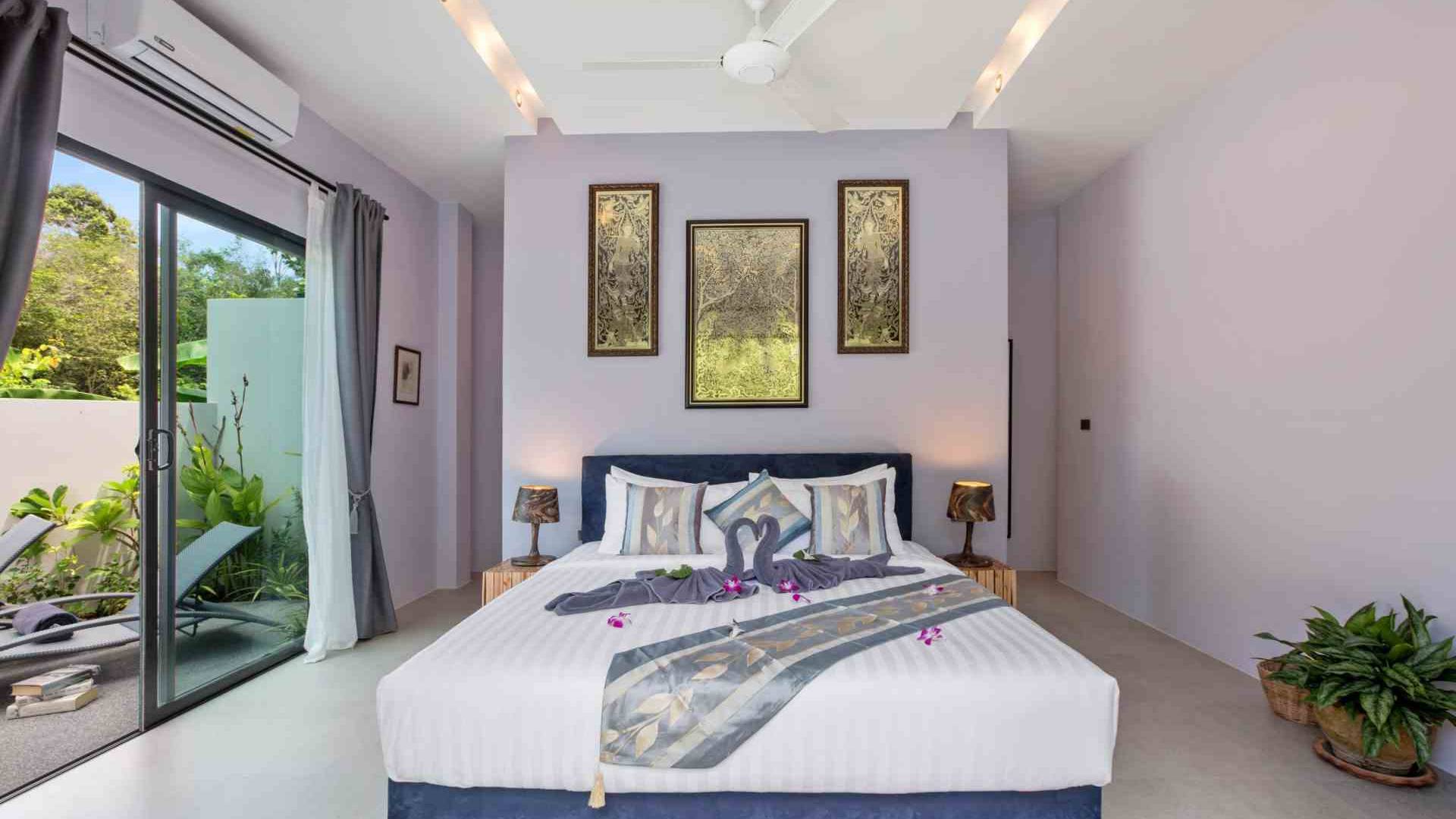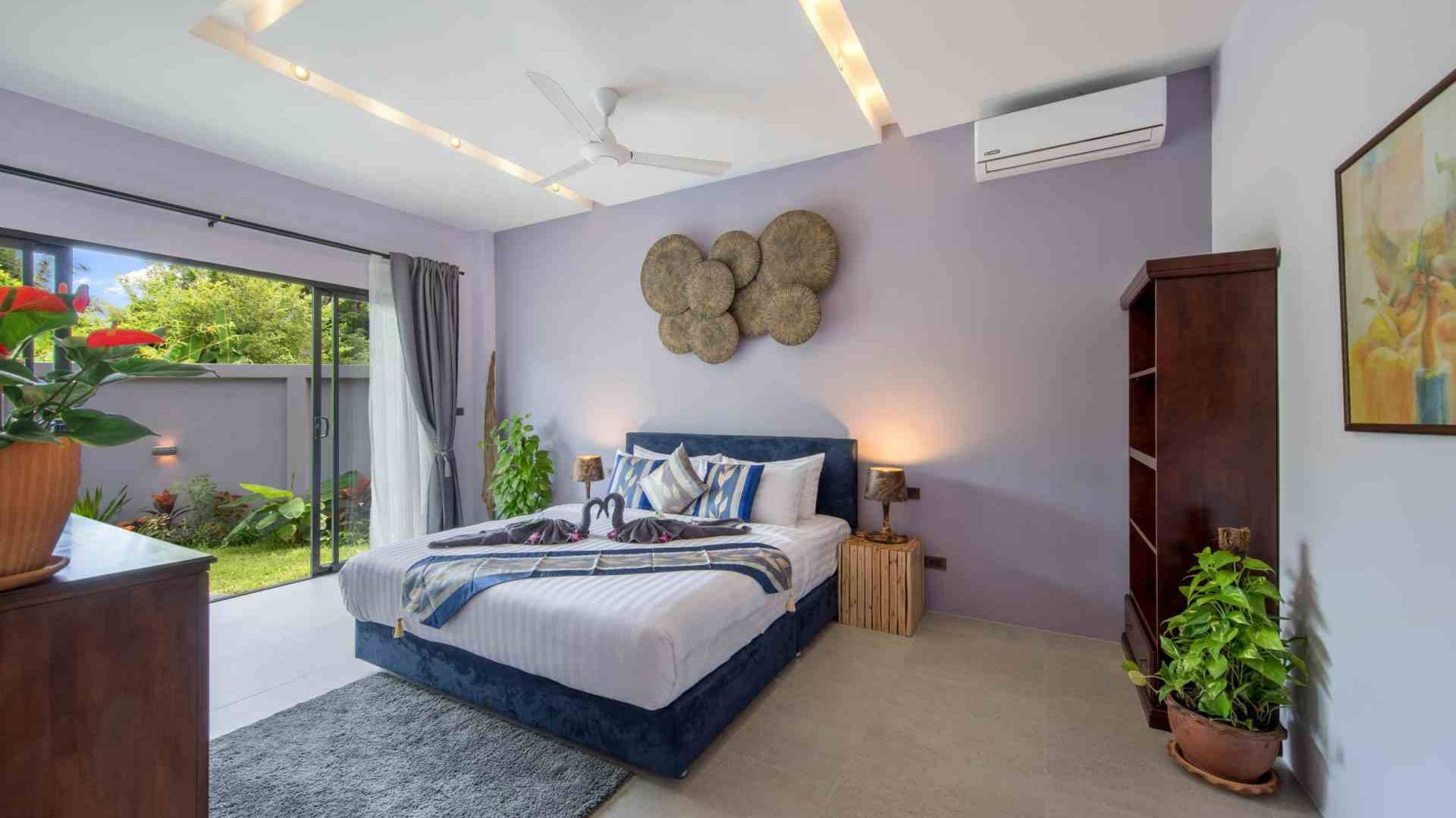 Baan Suaan Bua Villa Samui es una villa de lujo en alquiler con 3 dormitorios y piscina privada. Pool villa Baan Suaan Bua se encuentra en una tranquila zona tropical en el sur de la isla. Esta villa con todos los servicios está cerca no de 1, sino de 3 hermosas playas naturales e idílicas. Playa Leam Sor (500 m), playa Put Tal (150 m) y playa Thong Krut (300 m). Baan Suaan Bua Villa Samui tiene 3 dormitorios con baño. 2 de los cuales tienen sus propios jardines privados. Sala de estar espaciosa con cómodos sofás, televisor de pantalla grande y una moderna cocina / comedor totalmente equipada.