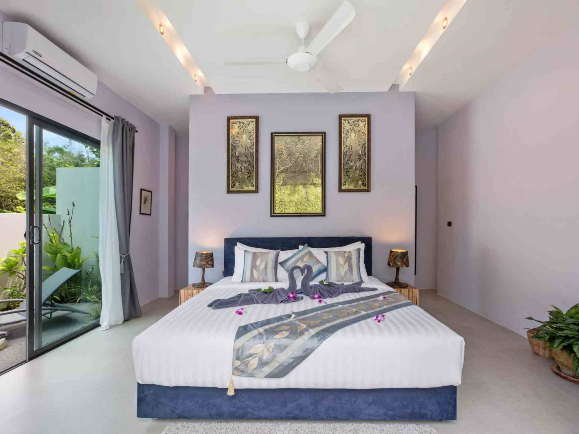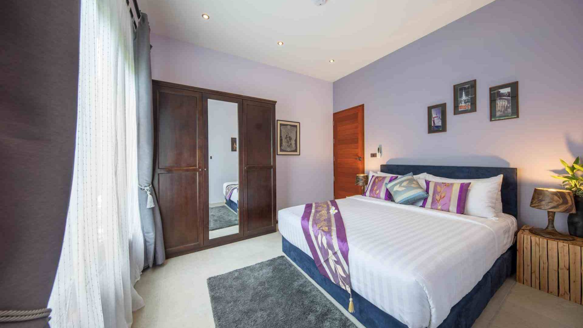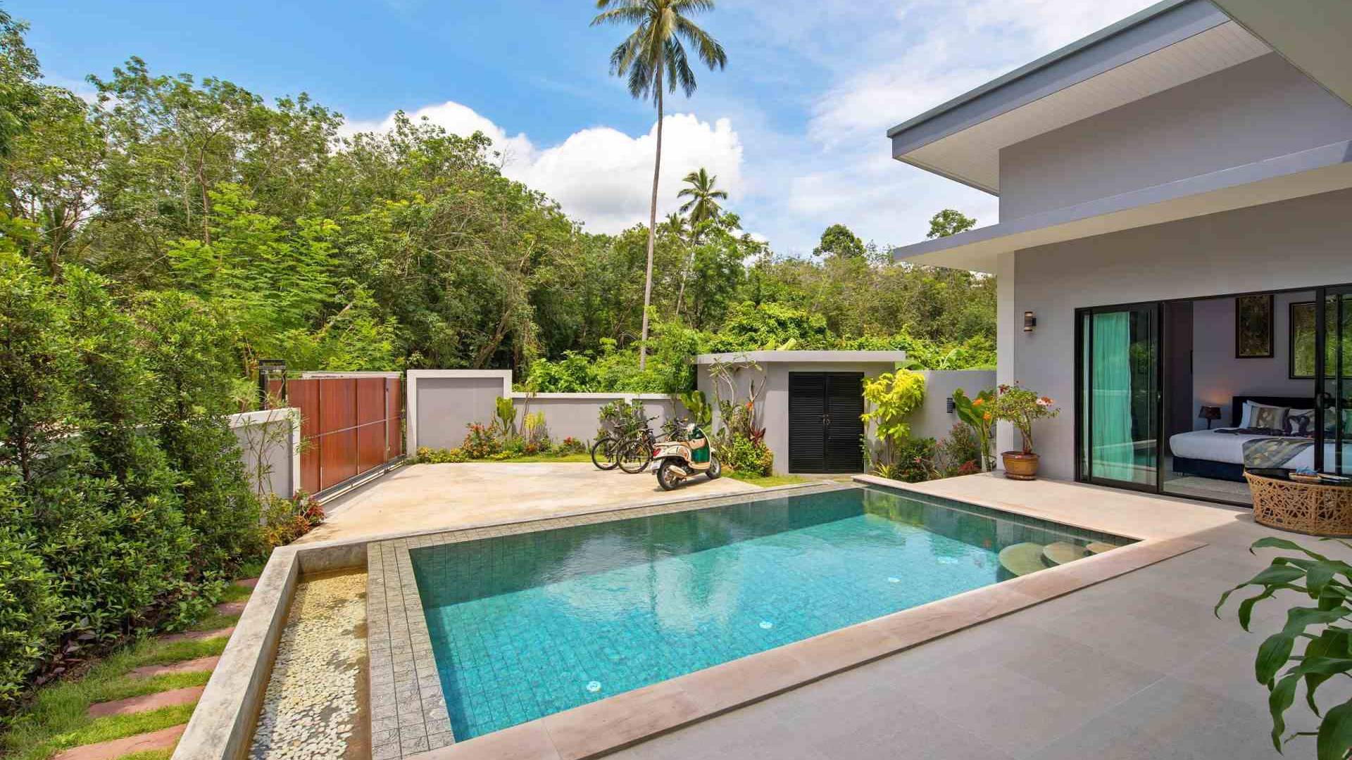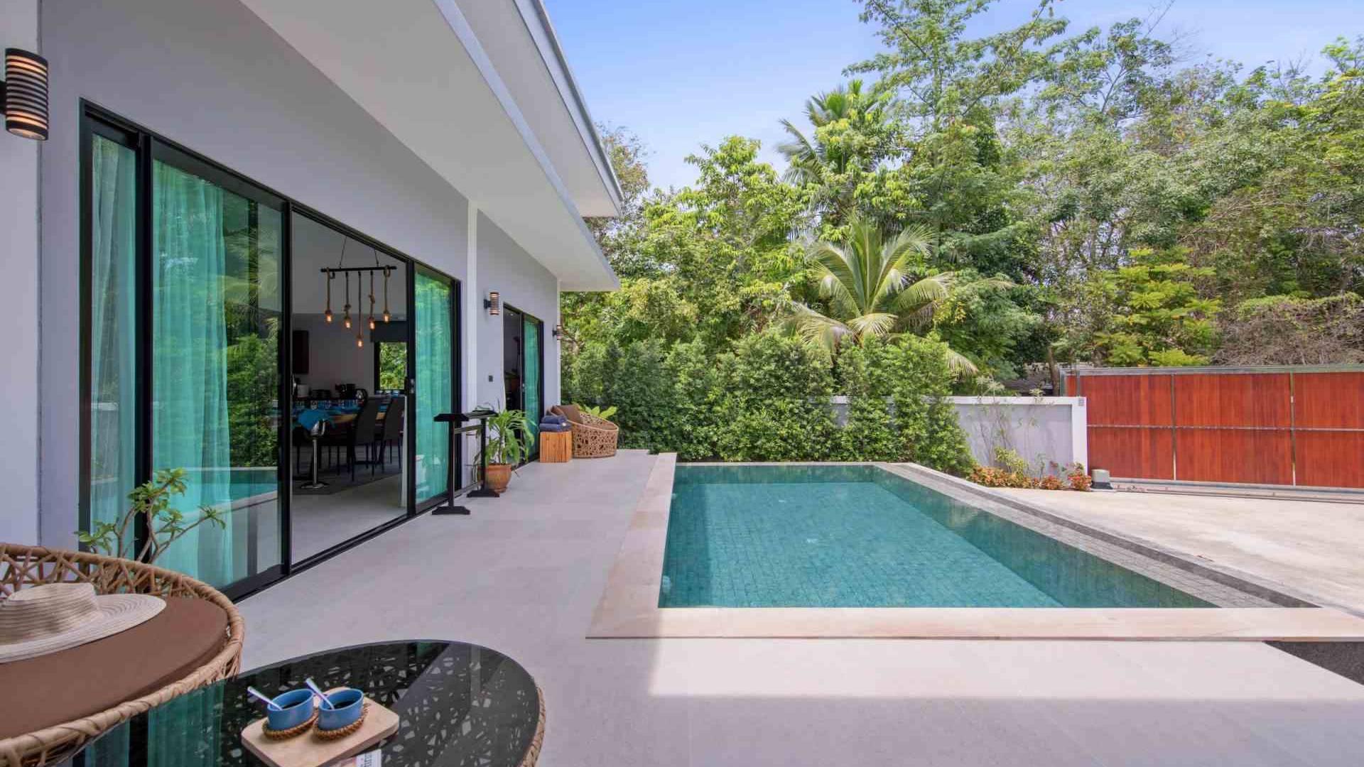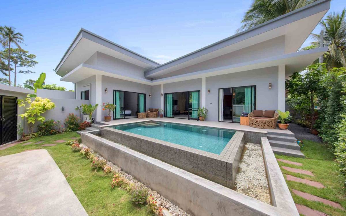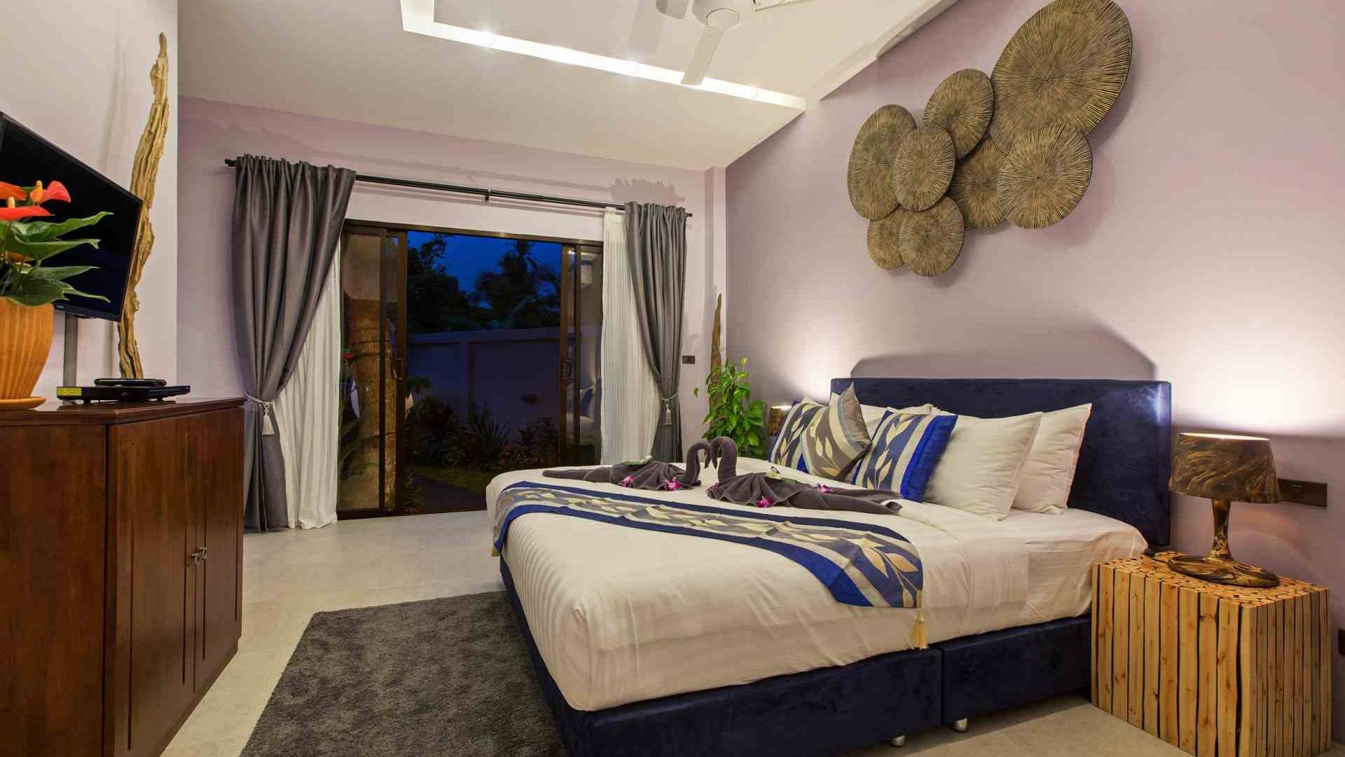Baan Suaan Bua Villa Samui es una villa de lujo en alquiler con 3 dormitorios y piscina privada. Pool villa Baan Suaan Bua se encuentra en una tranquila zona tropical en el sur de la isla. Esta villa con todos los servicios está cerca no de 1, sino de 3 hermosas playas naturales e idílicas. Playa Leam Sor (500 m), playa Put Tal (150 m) y playa Thong Krut (300 m). Baan Suaan Bua Villa Samui tiene 3 dormitorios con baño. 2 de los cuales tienen sus propios jardines privados. Sala de estar espaciosa con cómodos sofás, televisor de pantalla grande y una moderna cocina / comedor totalmente equipada.