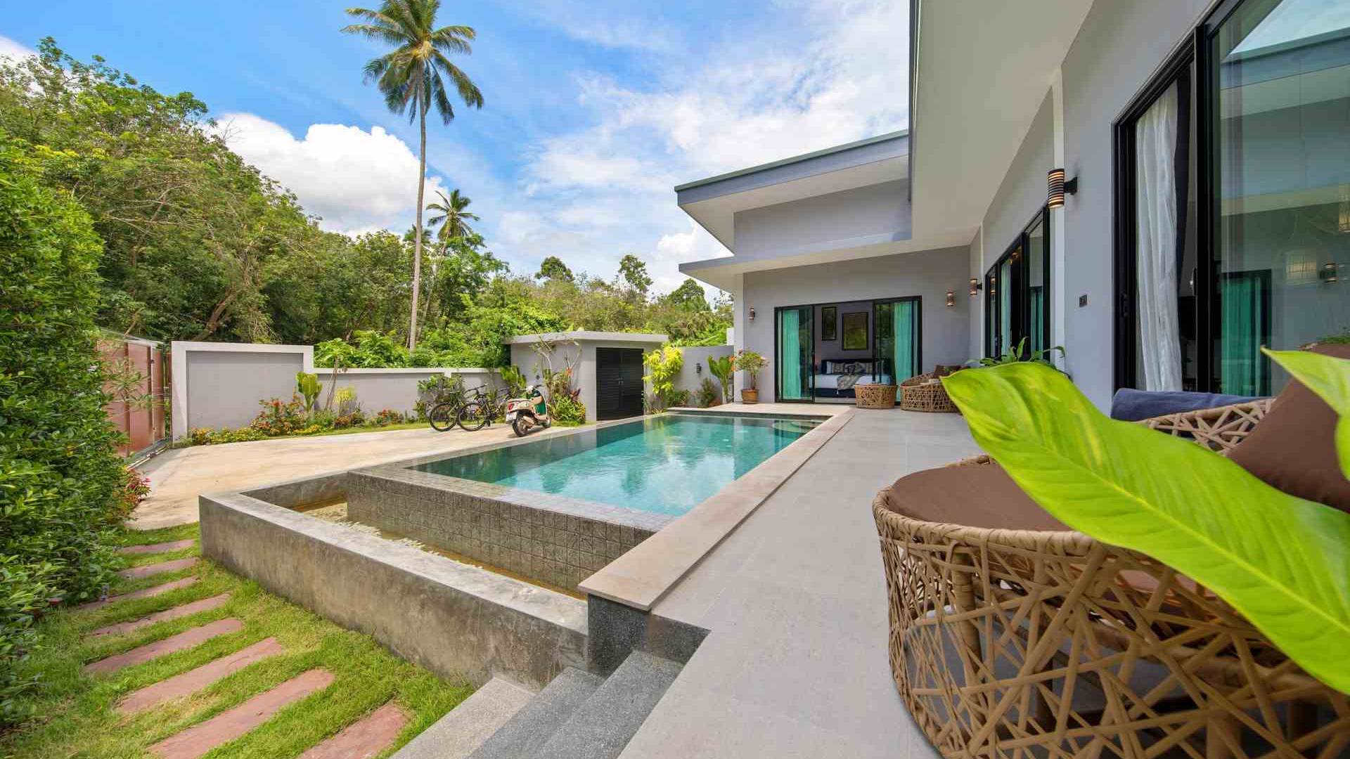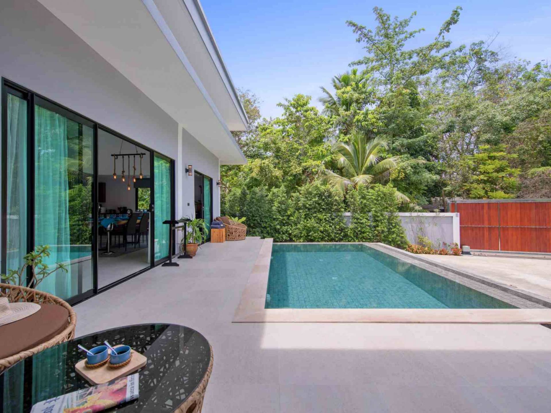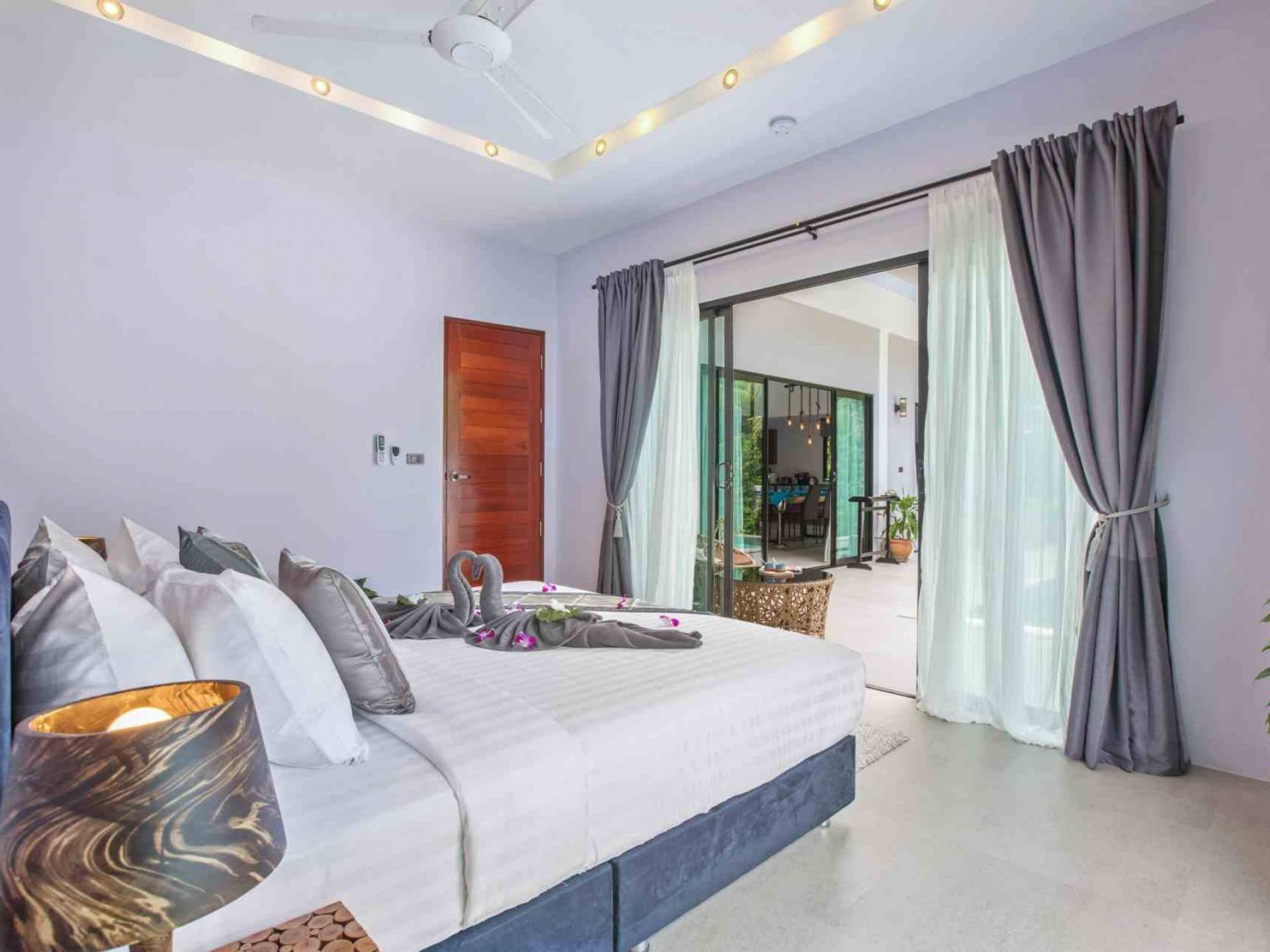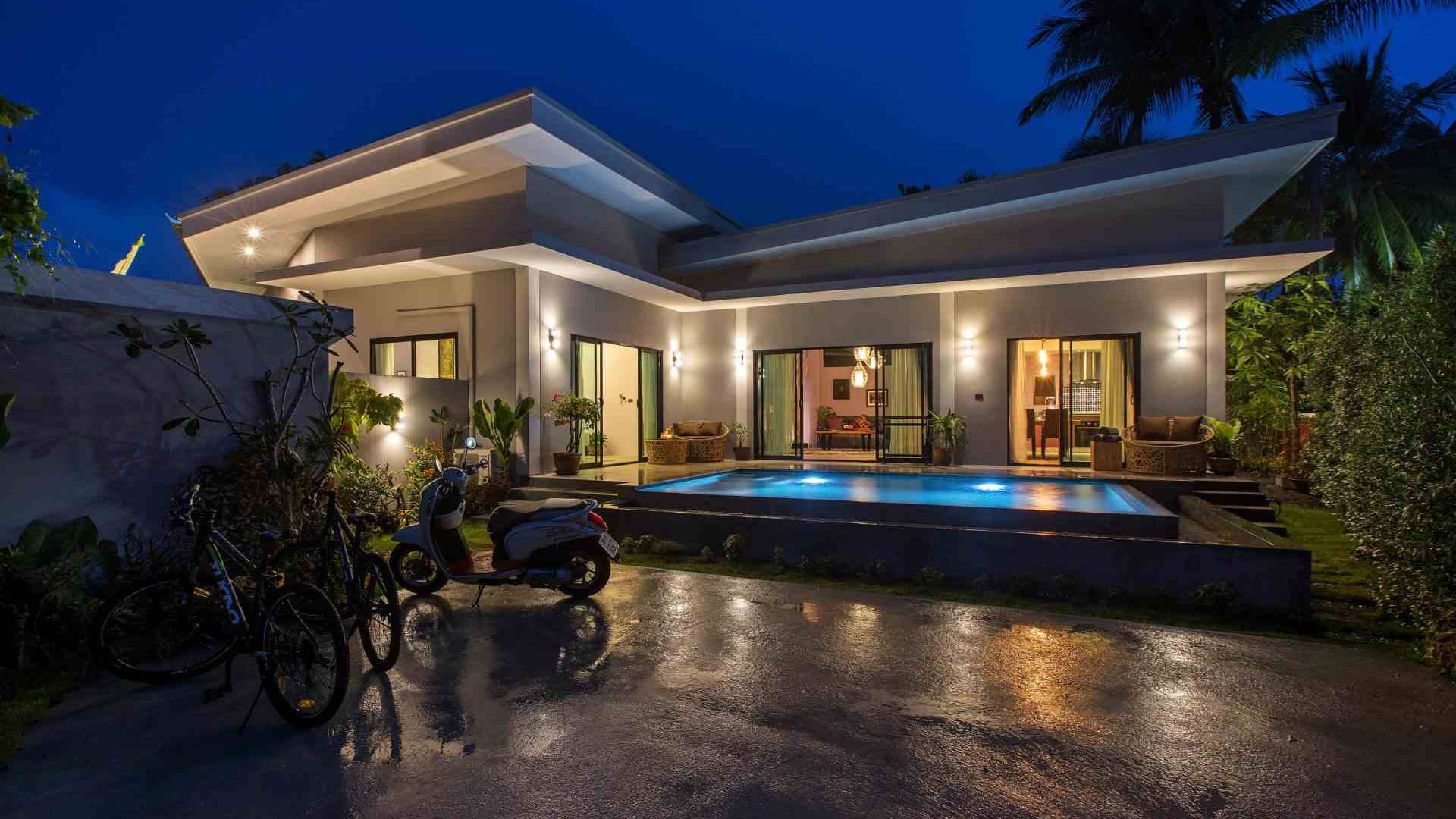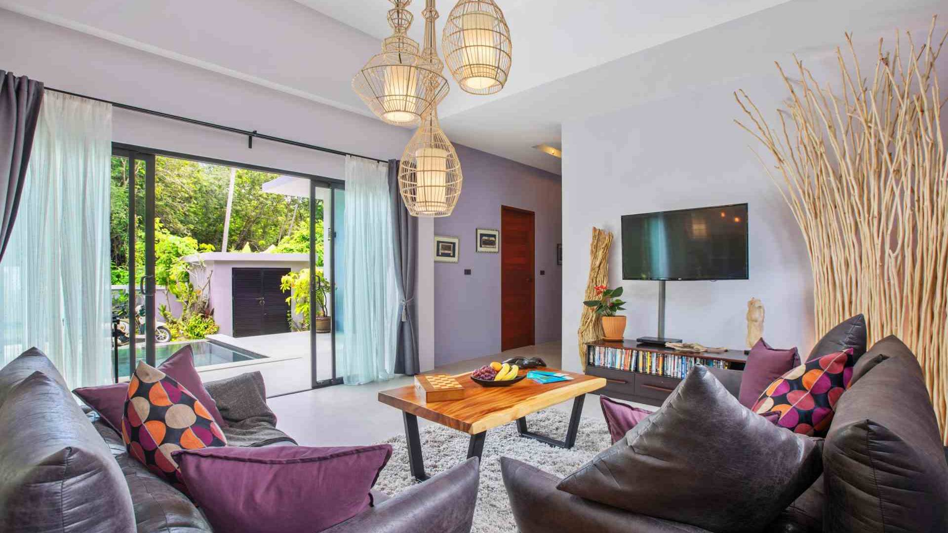 Baan Suaan Bua Villa Samui es una villa de lujo en alquiler con 3 dormitorios y piscina privada. Pool villa Baan Suaan Bua se encuentra en una tranquila zona tropical en el sur de la isla. Esta villa con todos los servicios está cerca no de 1, sino de 3 hermosas playas naturales e idílicas. Playa Leam Sor (500 m), playa Put Tal (150 m) y playa Thong Krut (300 m). Baan Suaan Bua Villa Samui tiene 3 dormitorios con baño. 2 de los cuales tienen sus propios jardines privados. Sala de estar espaciosa con cómodos sofás, televisor de pantalla grande y una moderna cocina / comedor totalmente equipada.