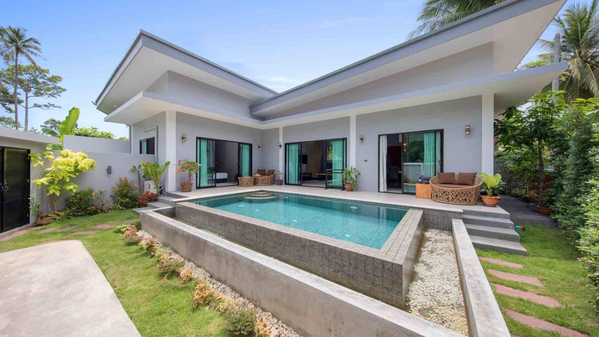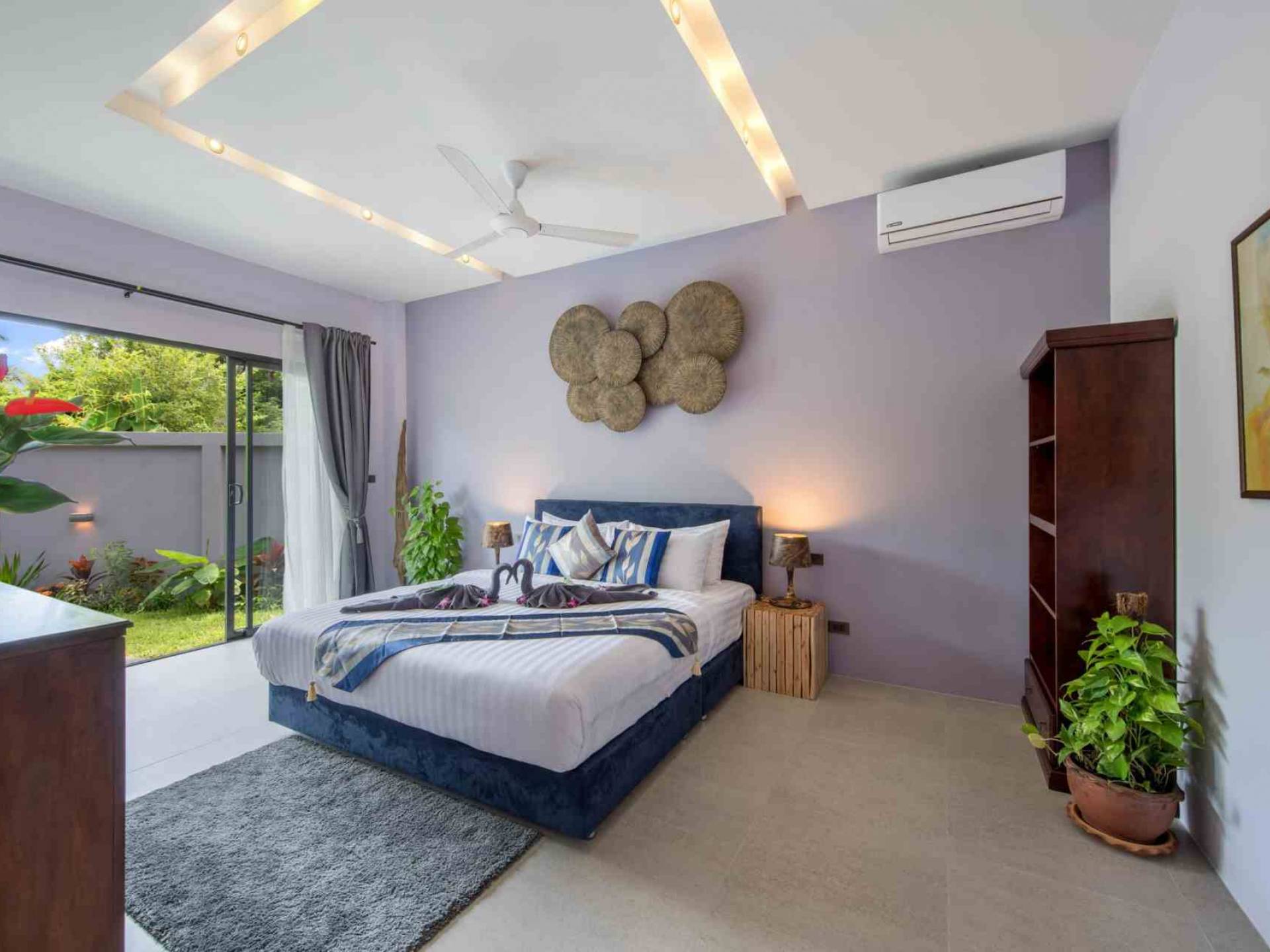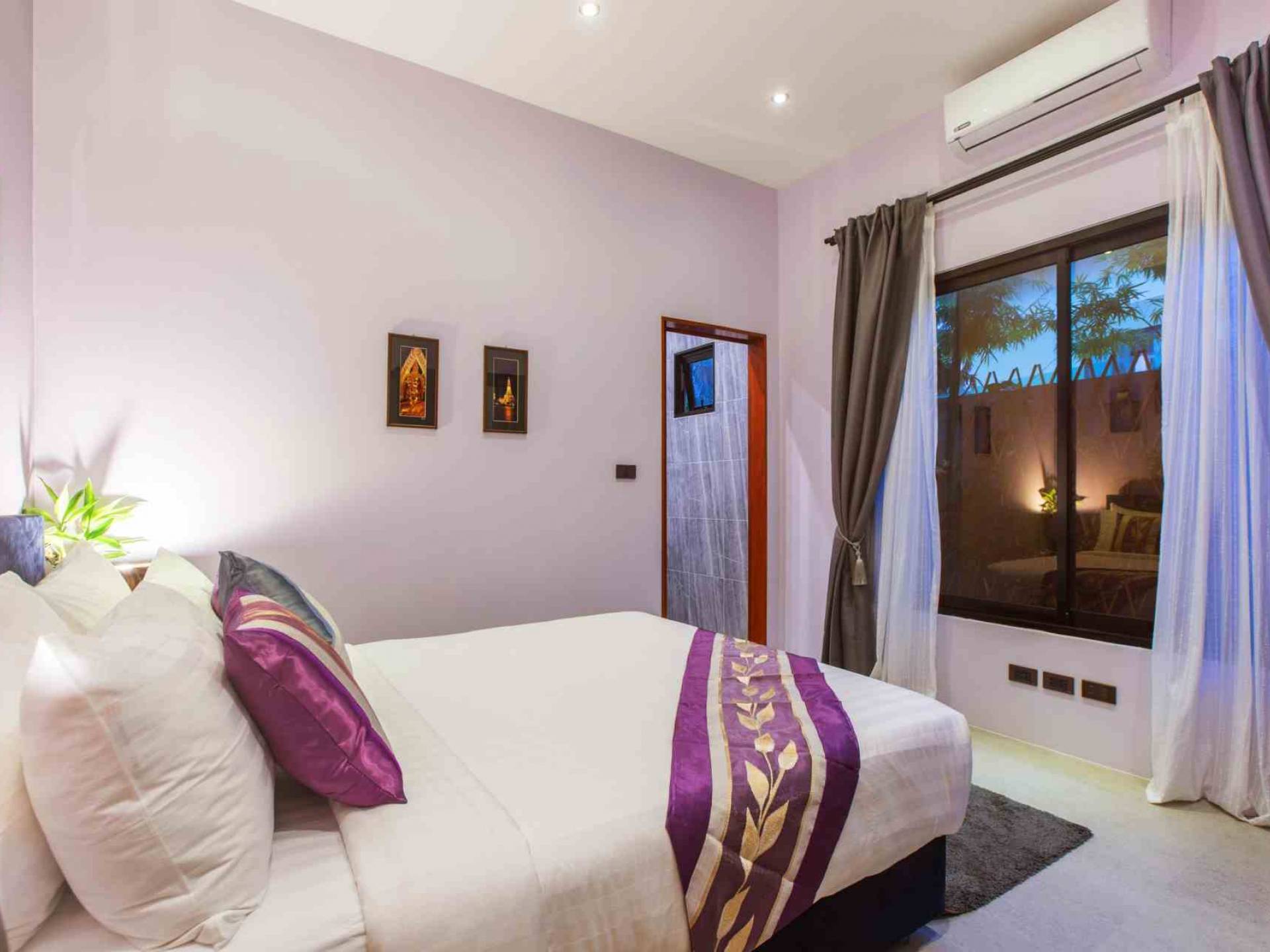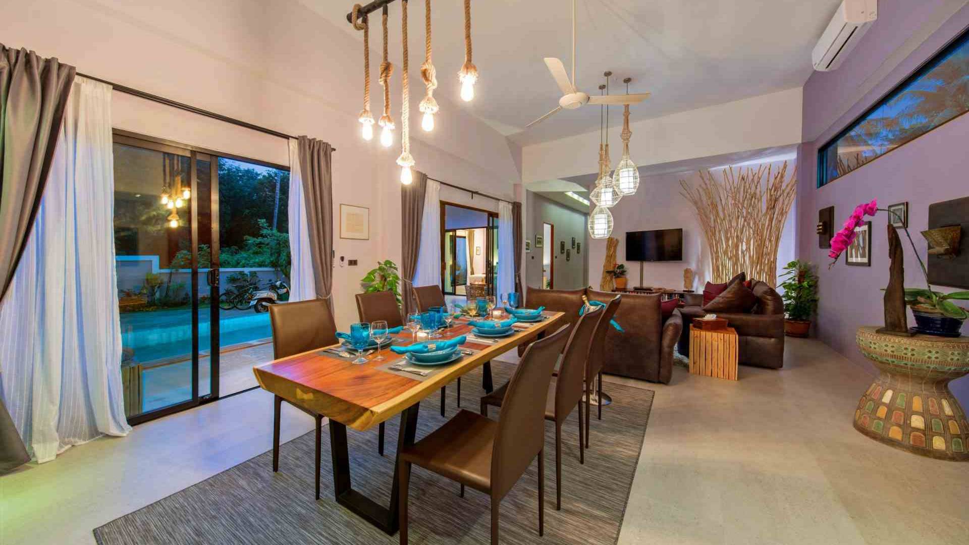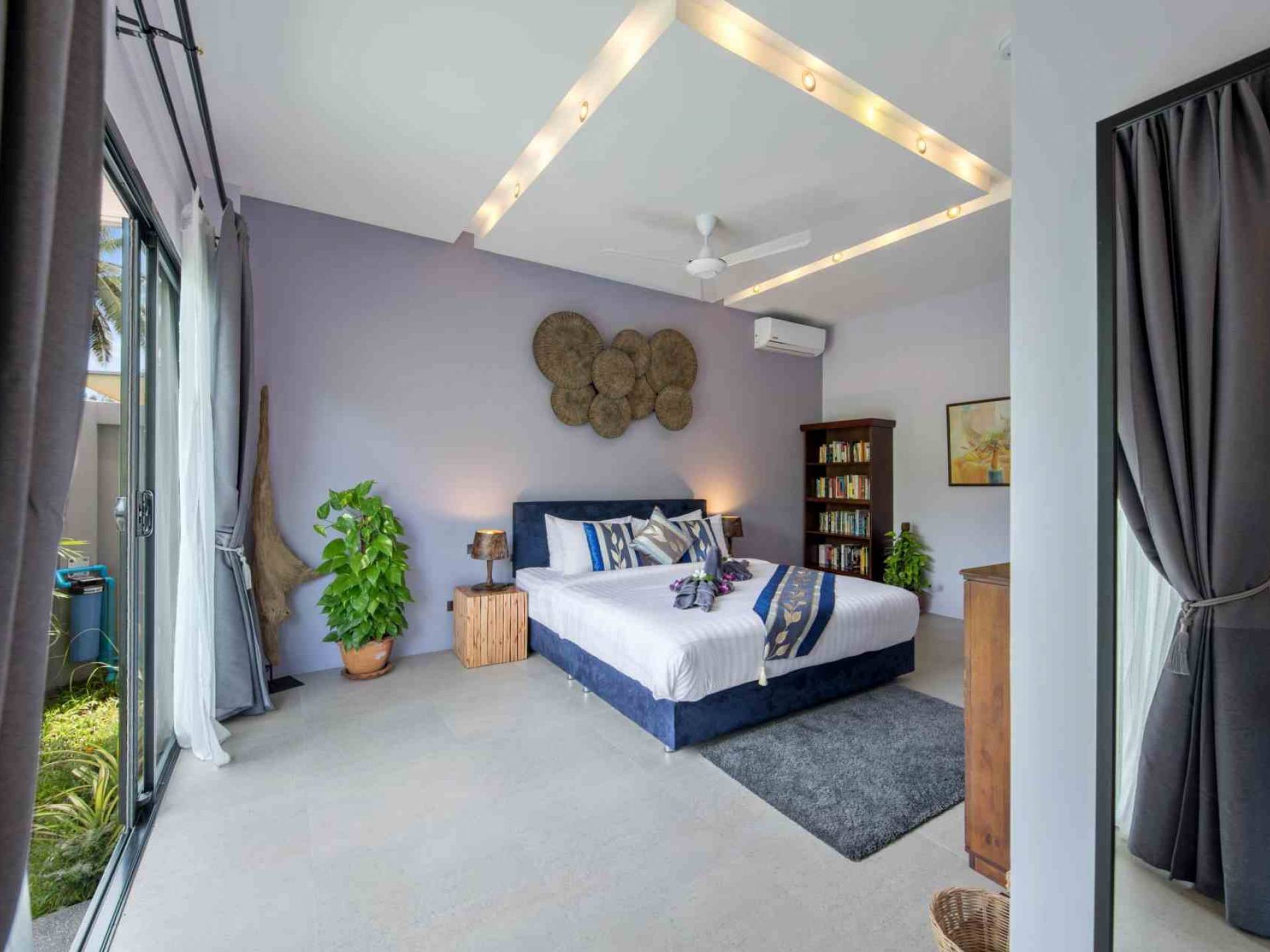 Baan Suaan Bua Villa Samui es una villa de lujo en alquiler con 3 dormitorios y piscina privada. Pool villa Baan Suaan Bua se encuentra en una tranquila zona tropical en el sur de la isla. Esta villa con todos los servicios está cerca no de 1, sino de 3 hermosas playas naturales e idílicas. Playa Leam Sor (500 m), playa Put Tal (150 m) y playa Thong Krut (300 m). Baan Suaan Bua Villa Samui tiene 3 dormitorios con baño. 2 de los cuales tienen sus propios jardines privados. Sala de estar espaciosa con cómodos sofás, televisor de pantalla grande y una moderna cocina / comedor totalmente equipada.