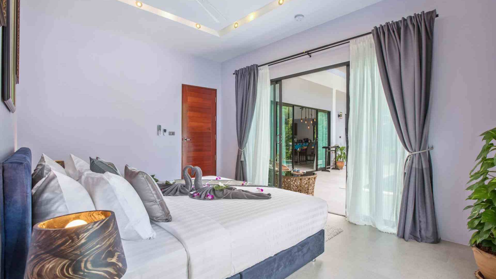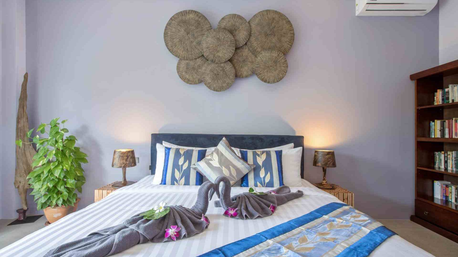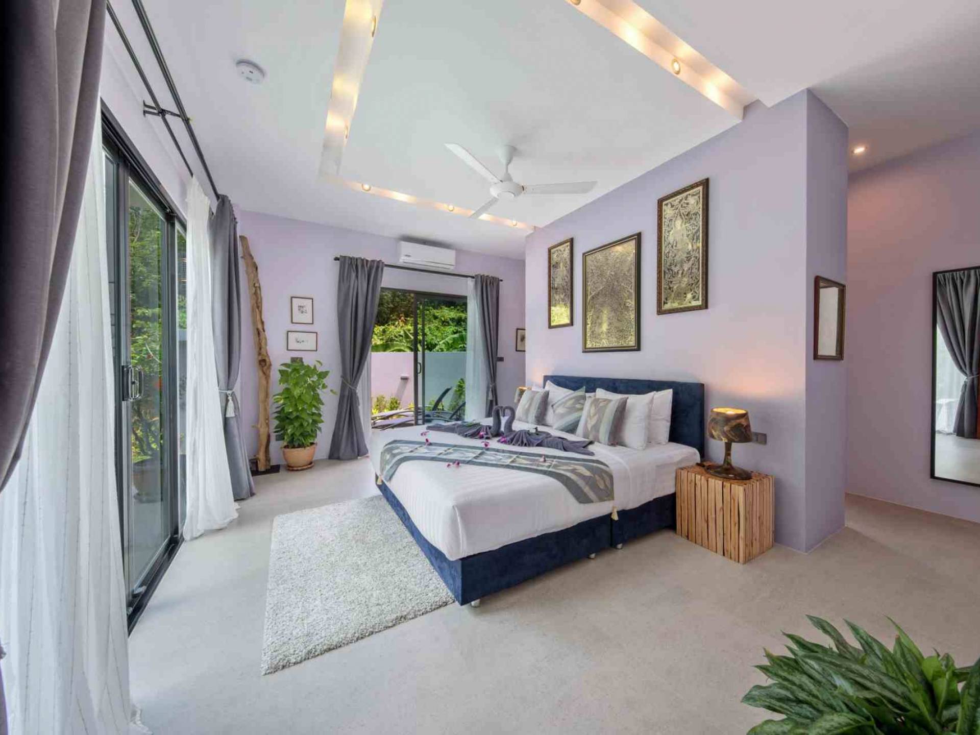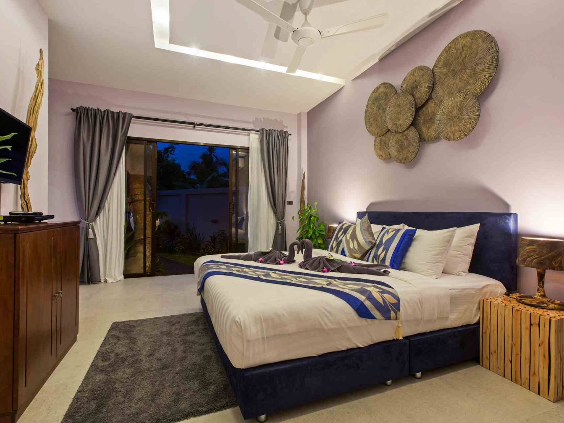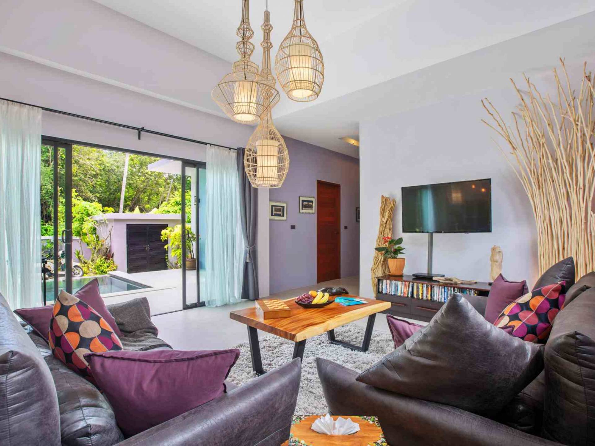 Baan Suaan Bua Villa Samui es una villa de lujo en alquiler con 3 dormitorios y piscina privada. Pool villa Baan Suaan Bua se encuentra en una tranquila zona tropical en el sur de la isla. Esta villa con todos los servicios está cerca no de 1, sino de 3 hermosas playas naturales e idílicas. Playa Leam Sor (500 m), playa Put Tal (150 m) y playa Thong Krut (300 m). Baan Suaan Bua Villa Samui tiene 3 dormitorios con baño. 2 de los cuales tienen sus propios jardines privados. Sala de estar espaciosa con cómodos sofás, televisor de pantalla grande y una moderna cocina / comedor totalmente equipada.
