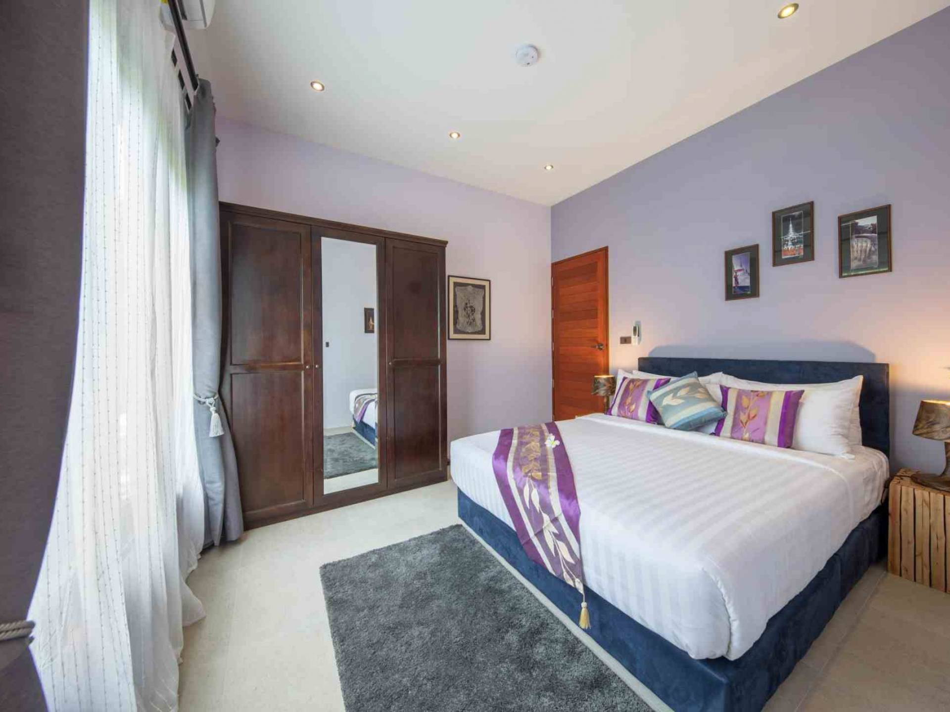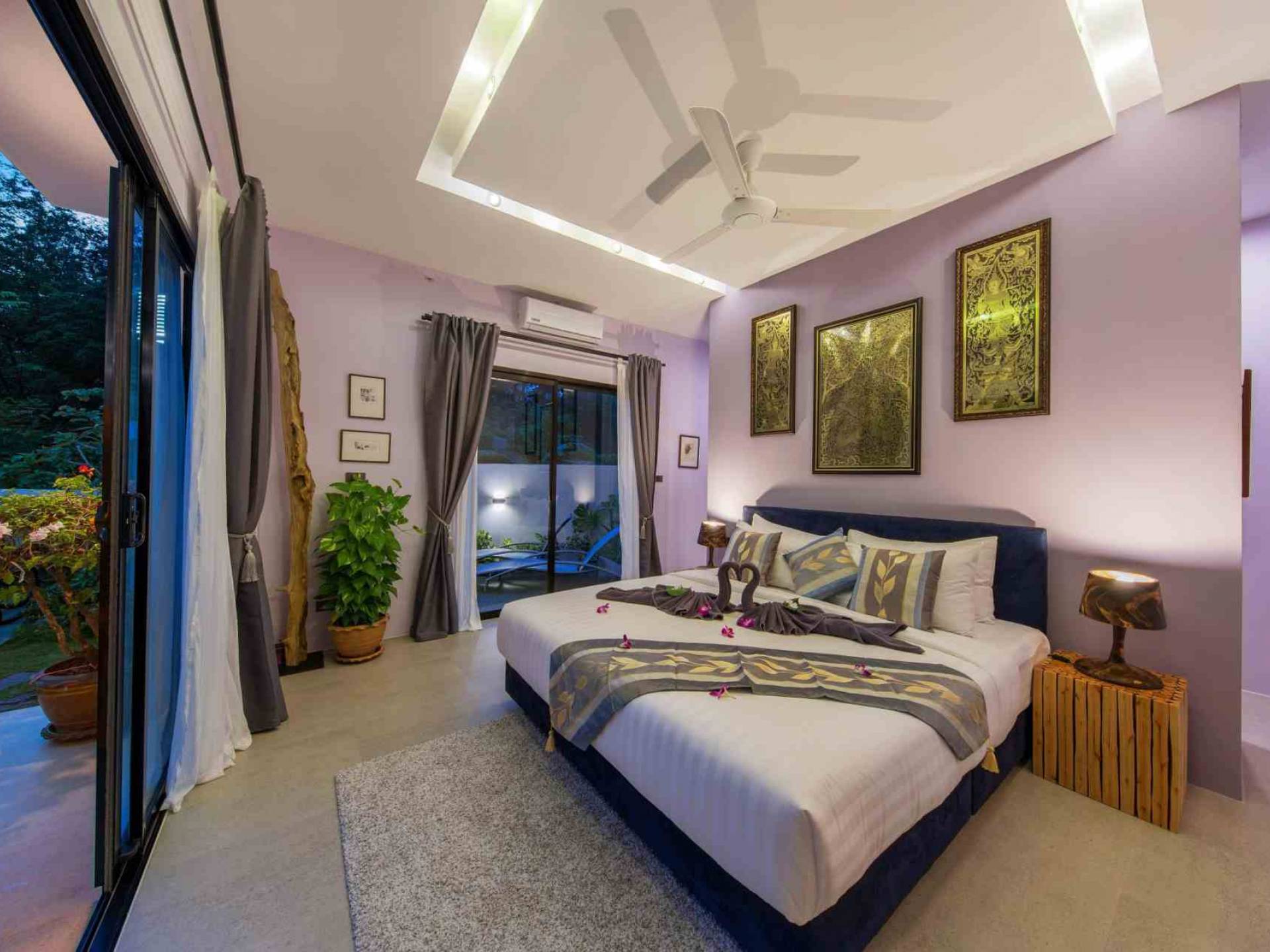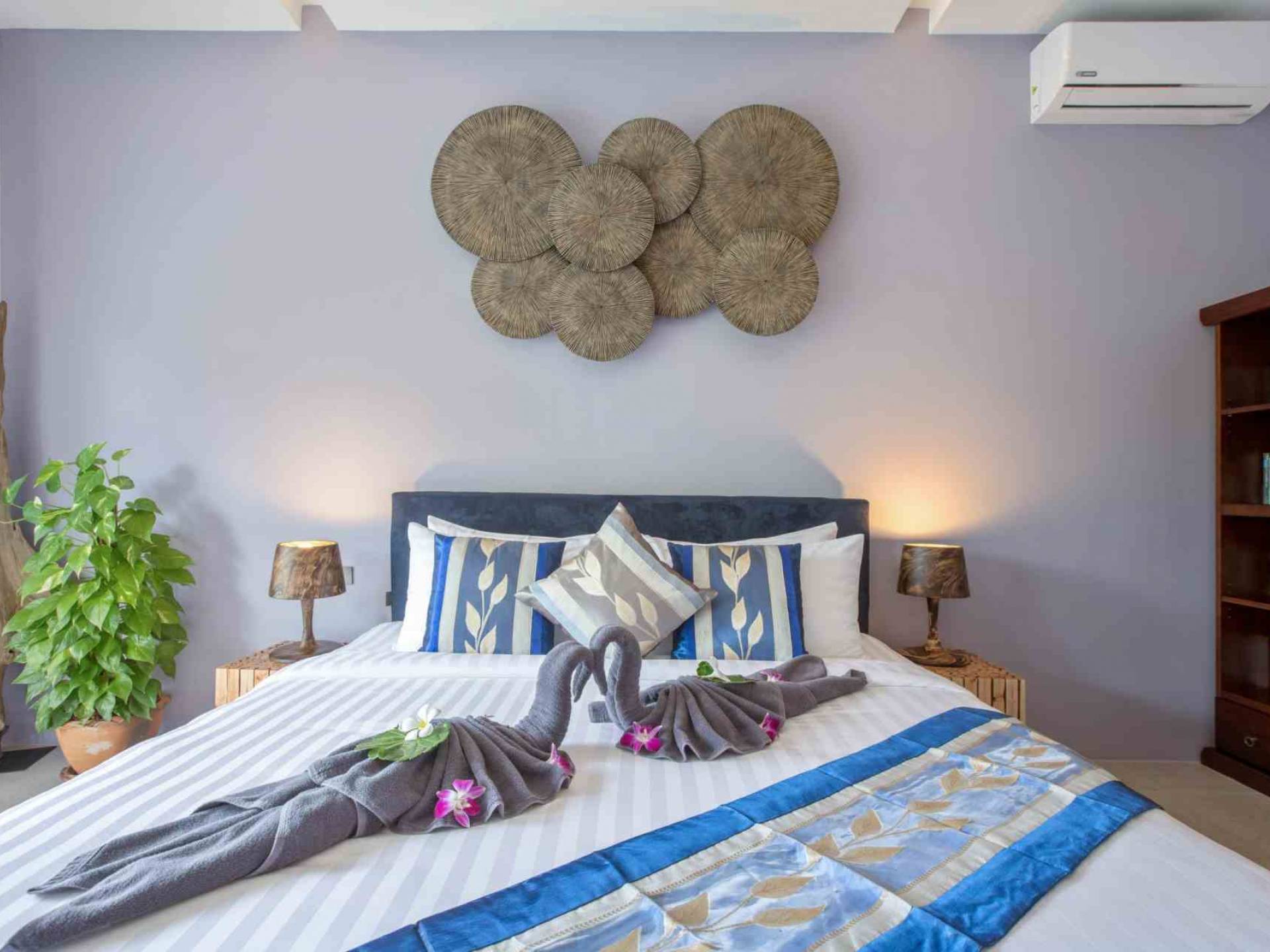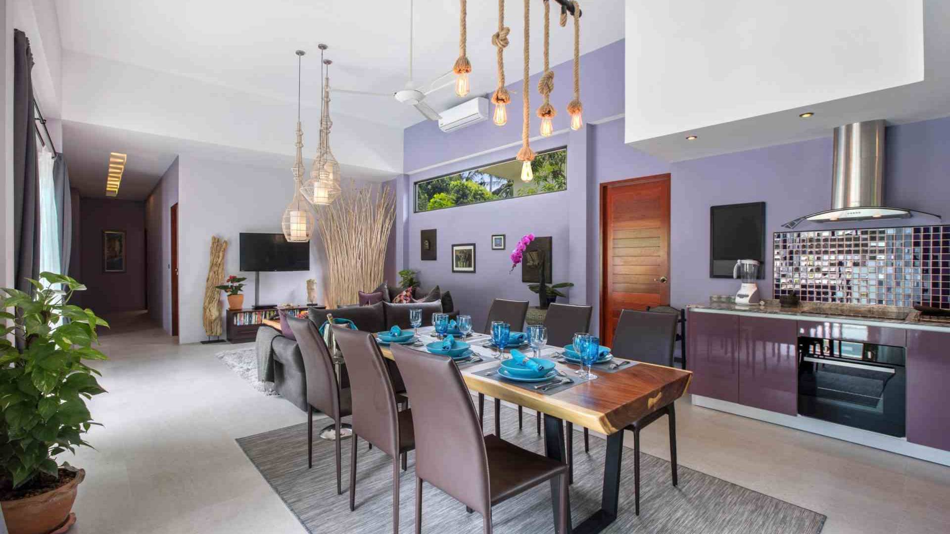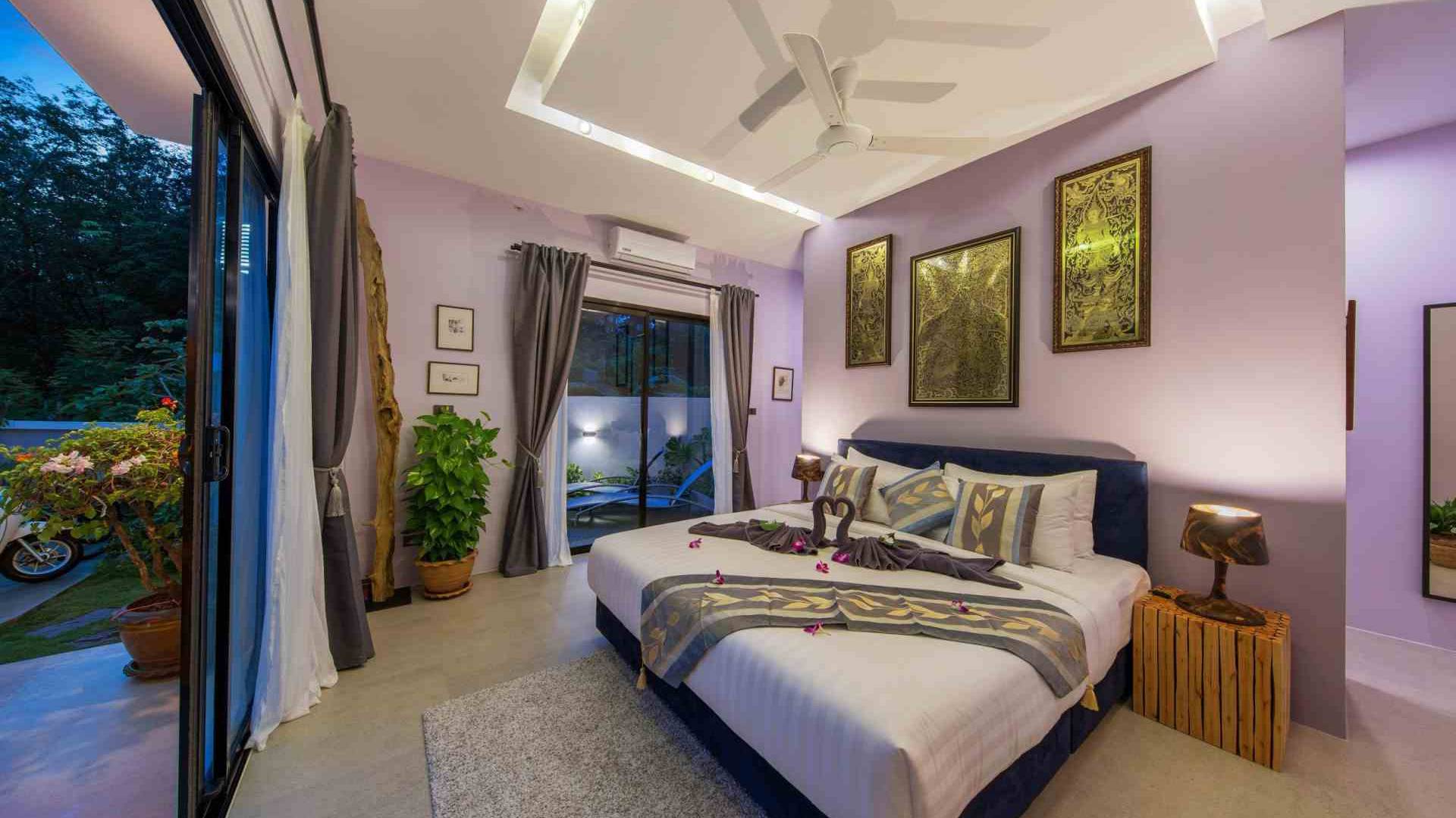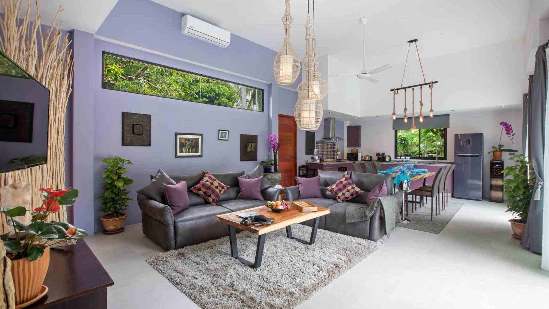 Baan Suaan Bua Villa Samui es una villa de lujo en alquiler con 3 dormitorios y piscina privada. Pool villa Baan Suaan Bua se encuentra en una tranquila zona tropical en el sur de la isla. Esta villa con todos los servicios está cerca no de 1, sino de 3 hermosas playas naturales e idílicas. Playa Leam Sor (500 m), playa Put Tal (150 m) y playa Thong Krut (300 m). Baan Suaan Bua Villa Samui tiene 3 dormitorios con baño. 2 de los cuales tienen sus propios jardines privados. Sala de estar espaciosa con cómodos sofás, televisor de pantalla grande y una moderna cocina / comedor totalmente equipada.