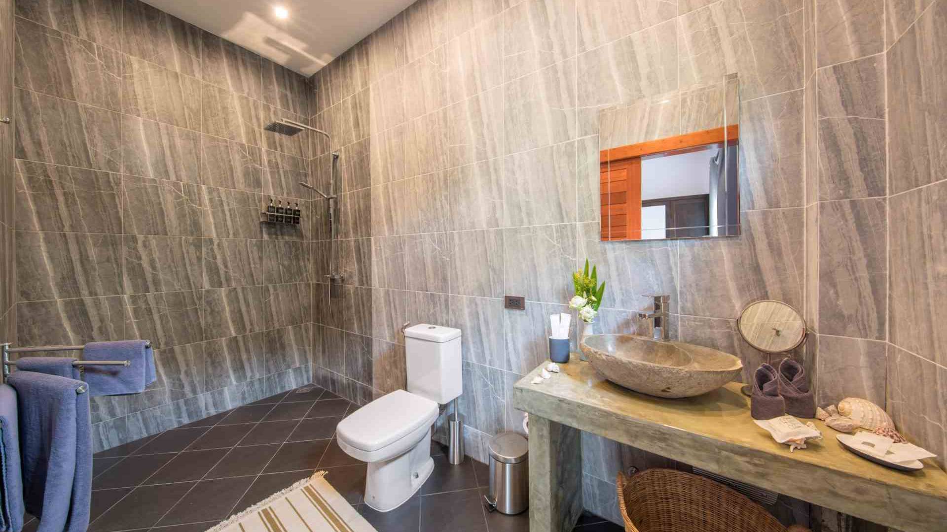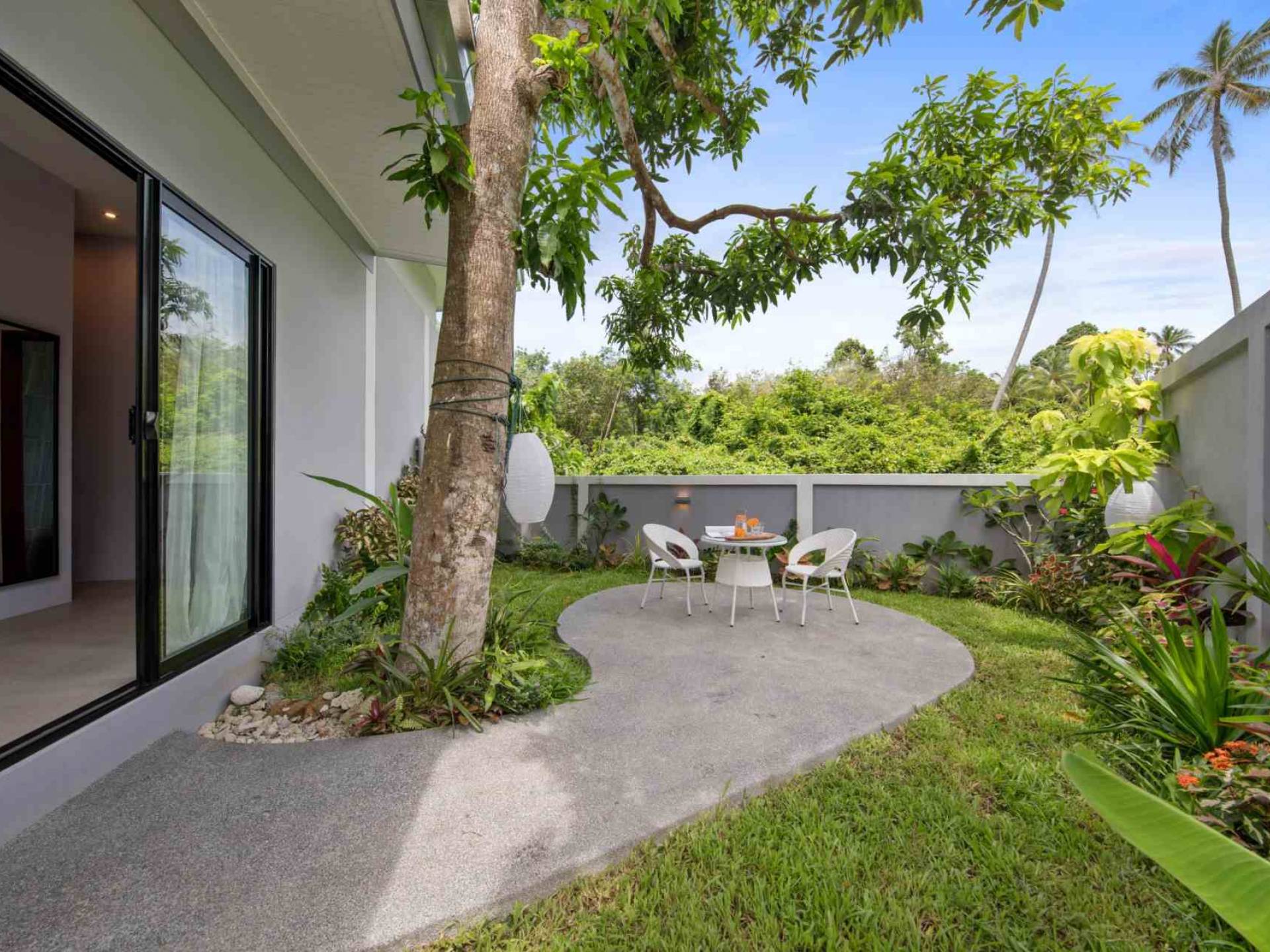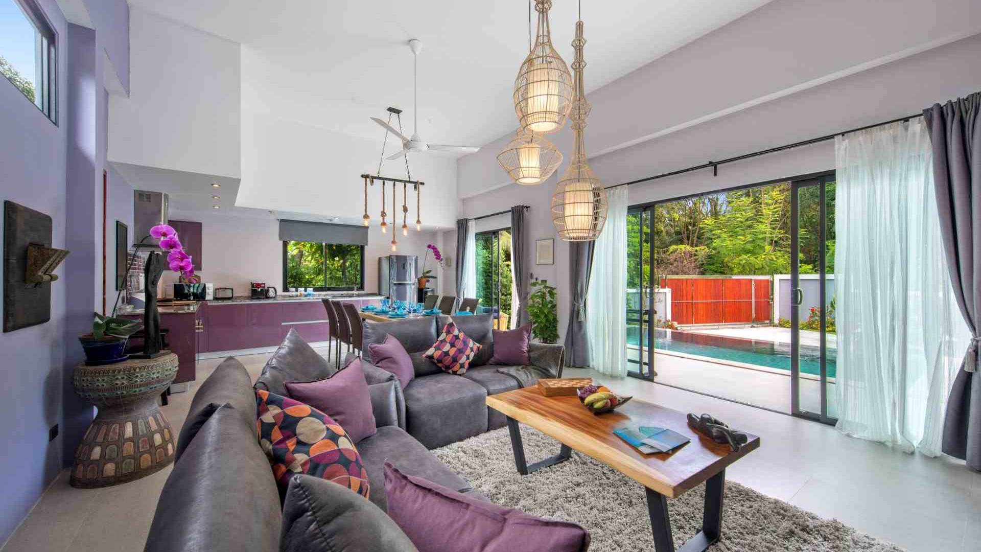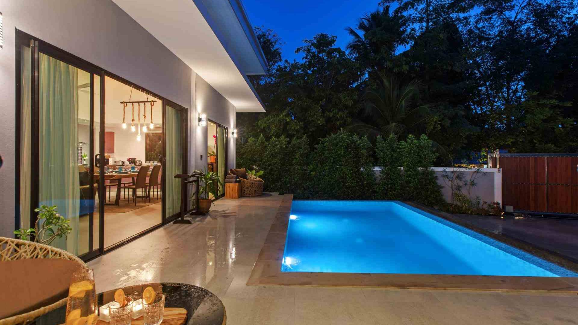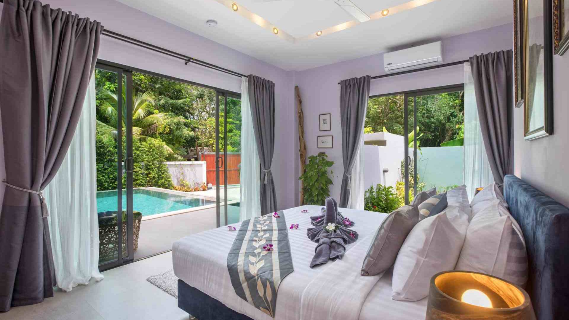 Baan Suaan Bua Villa Samui es una villa de lujo en alquiler con 3 dormitorios y piscina privada. Pool villa Baan Suaan Bua se encuentra en una tranquila zona tropical en el sur de la isla. Esta villa con todos los servicios está cerca no de 1, sino de 3 hermosas playas naturales e idílicas. Playa Leam Sor (500 m), playa Put Tal (150 m) y playa Thong Krut (300 m). Baan Suaan Bua Villa Samui tiene 3 dormitorios con baño. 2 de los cuales tienen sus propios jardines privados. Sala de estar espaciosa con cómodos sofás, televisor de pantalla grande y una moderna cocina / comedor totalmente equipada.