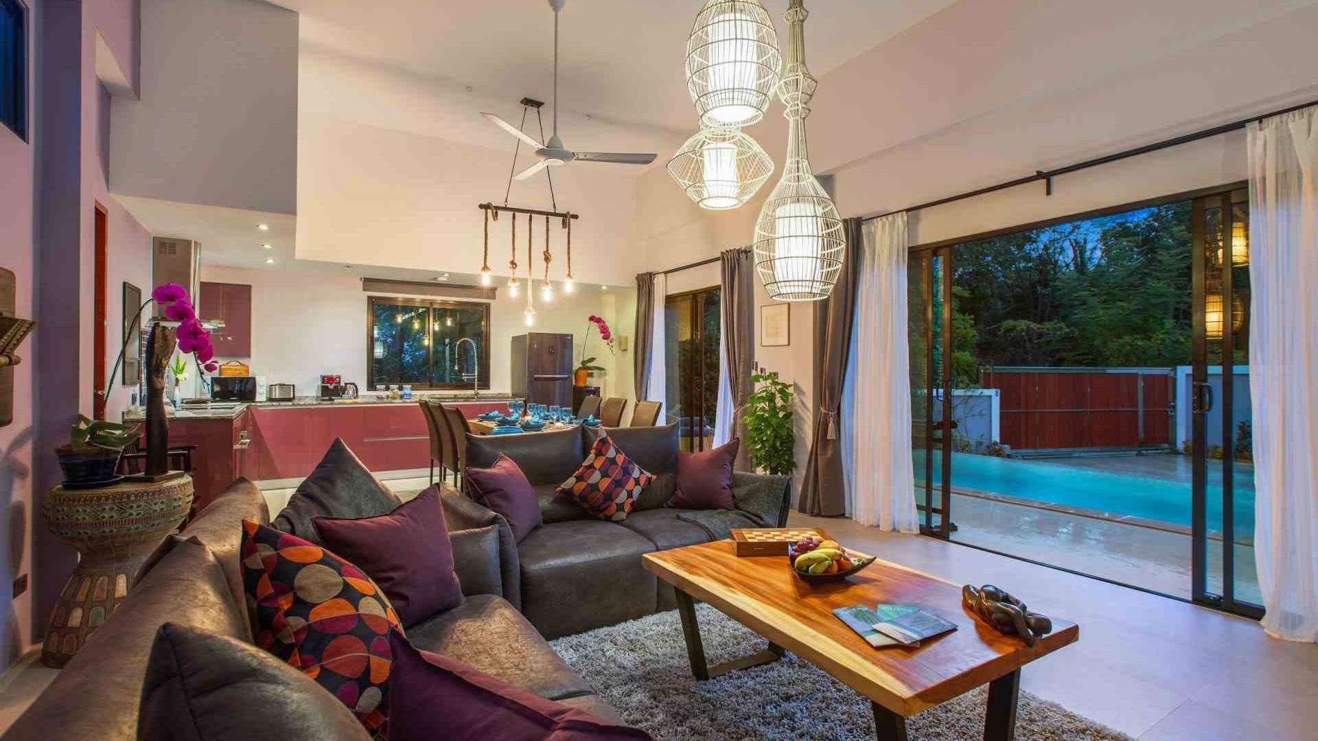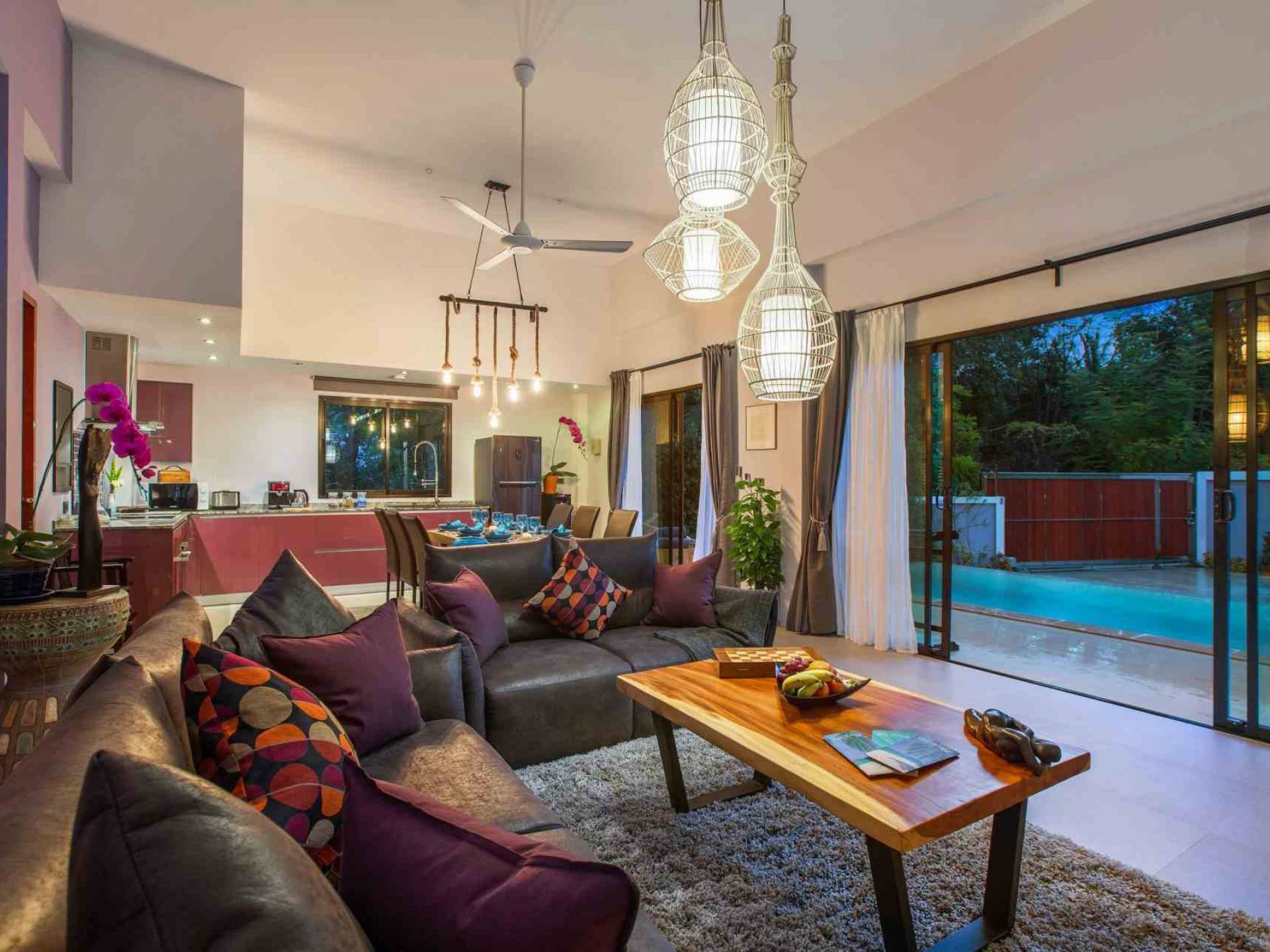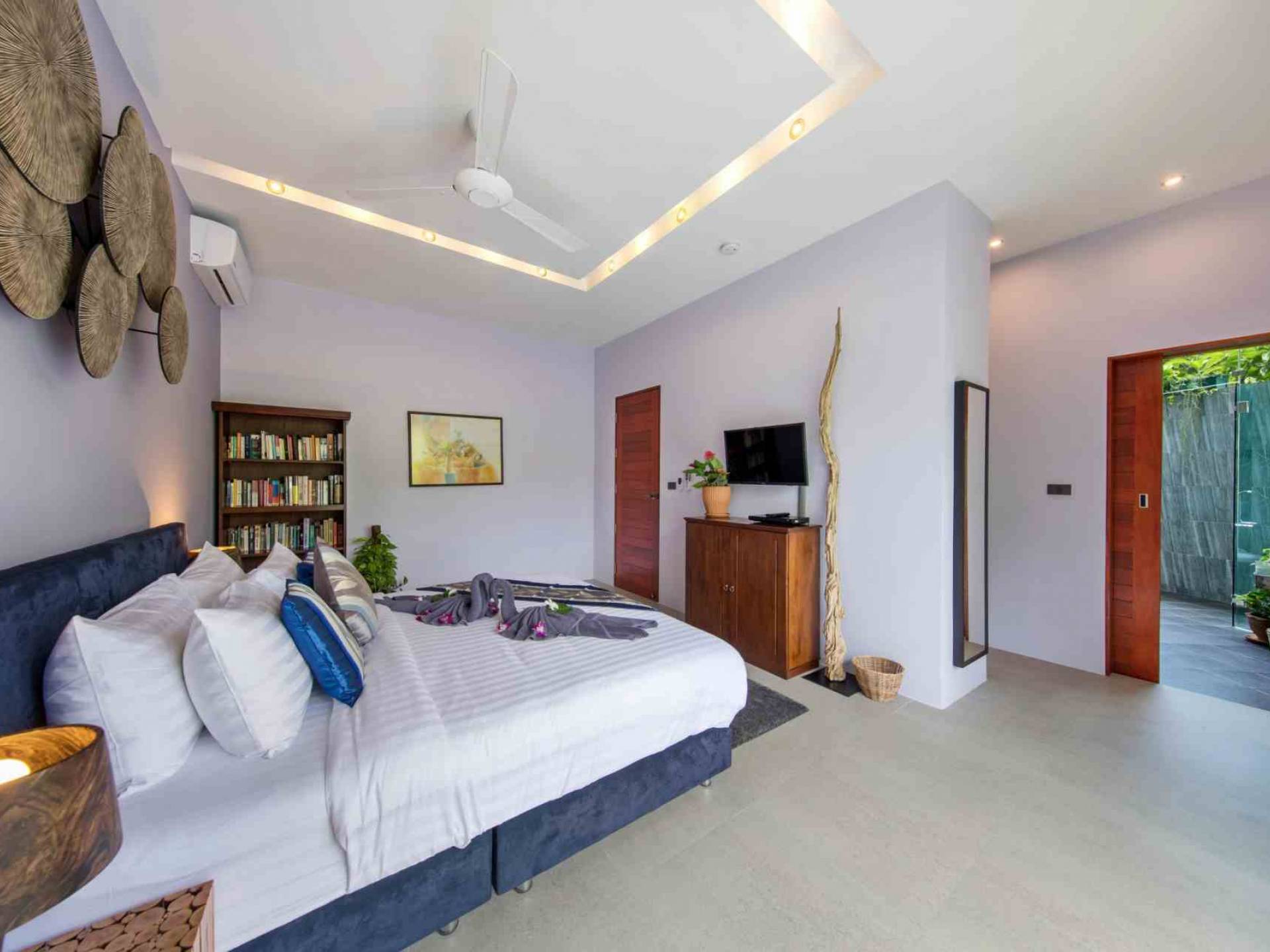 Todas las habitaciones tienen baño. Dos de los dormitorios tienen camas king-size (se puede colocar una cama / cuna adicional en cualquiera de ellos). Estos dos dormitorios también cuentan con sus propios jardines privados al aire libre. La sala de estar es abierta, con un televisor “SMART” de pantalla plana de 50 pulgadas con más de 300 canales internacionales en 5 idiomas. Se proporcionan reproductor de DVD y DVD. La villa es espaciosa, pero cómoda, con vistas a la terraza exterior y a la piscina de agua salada.