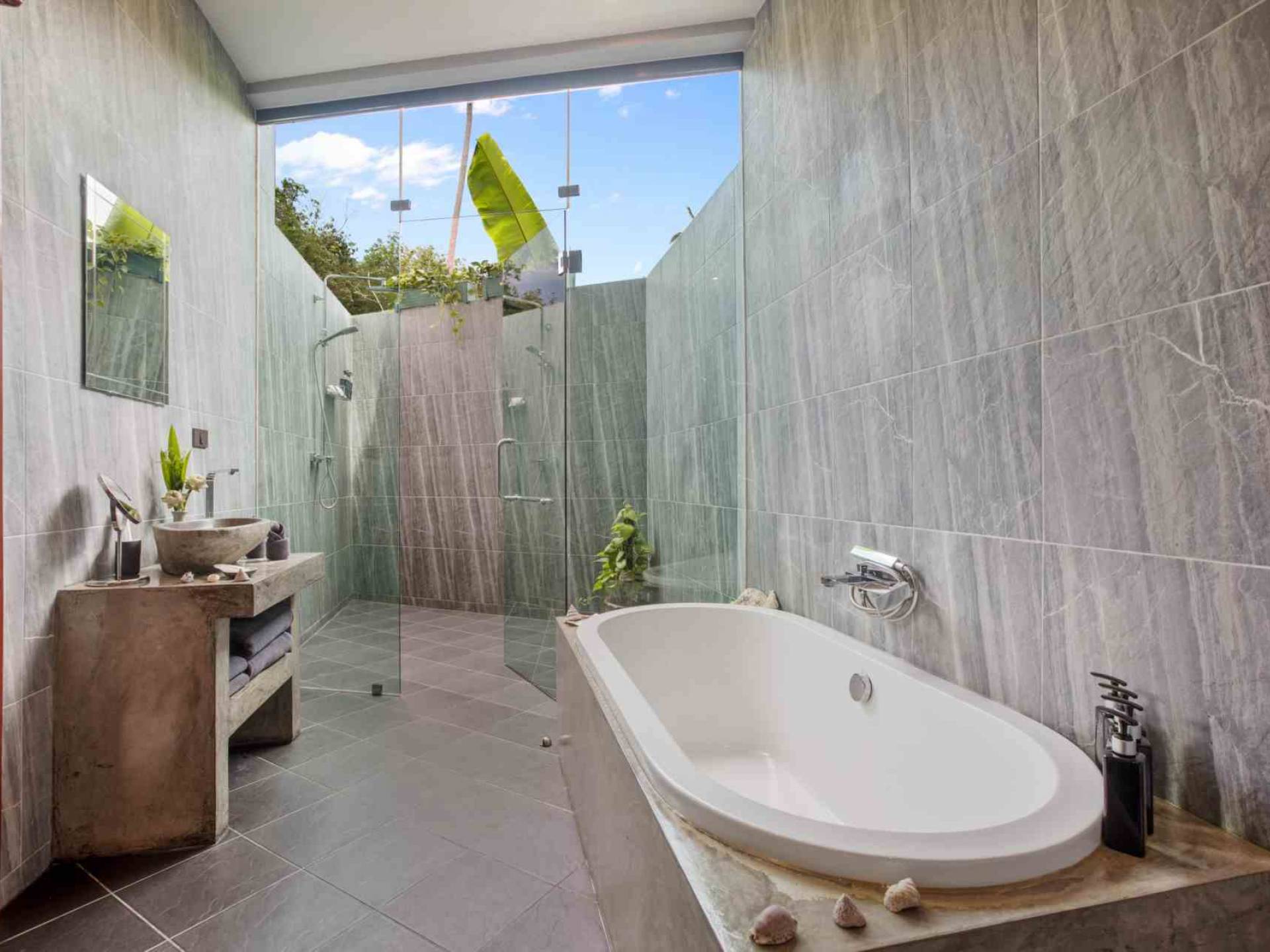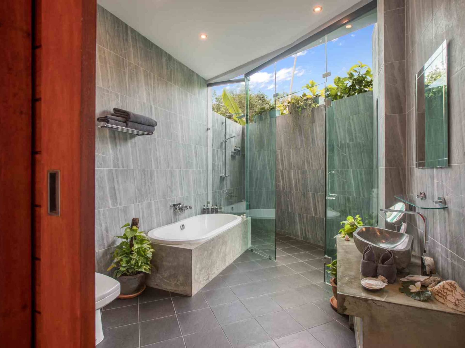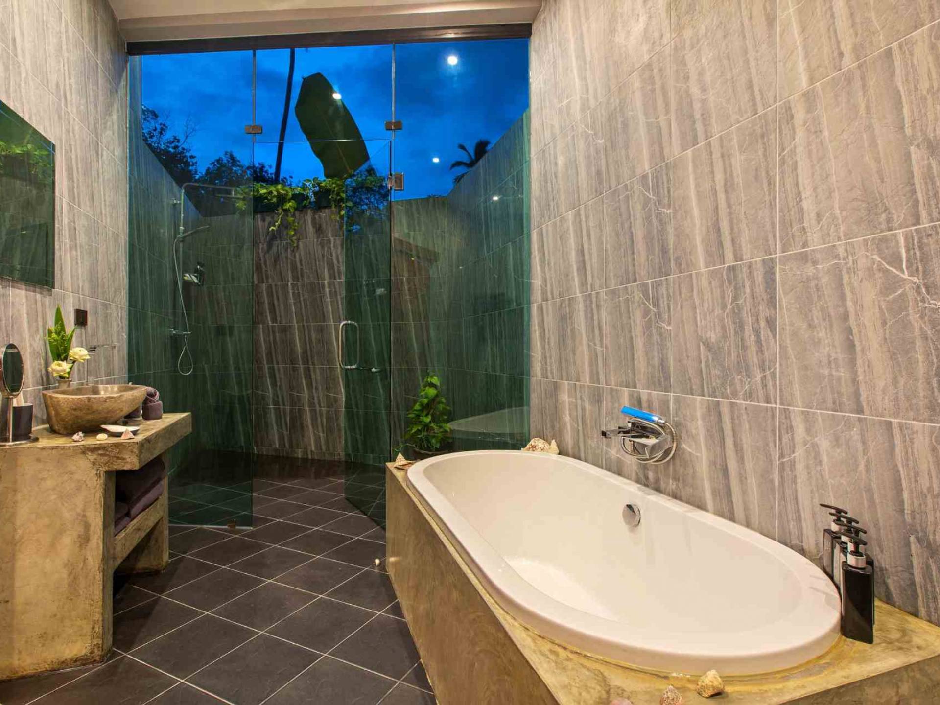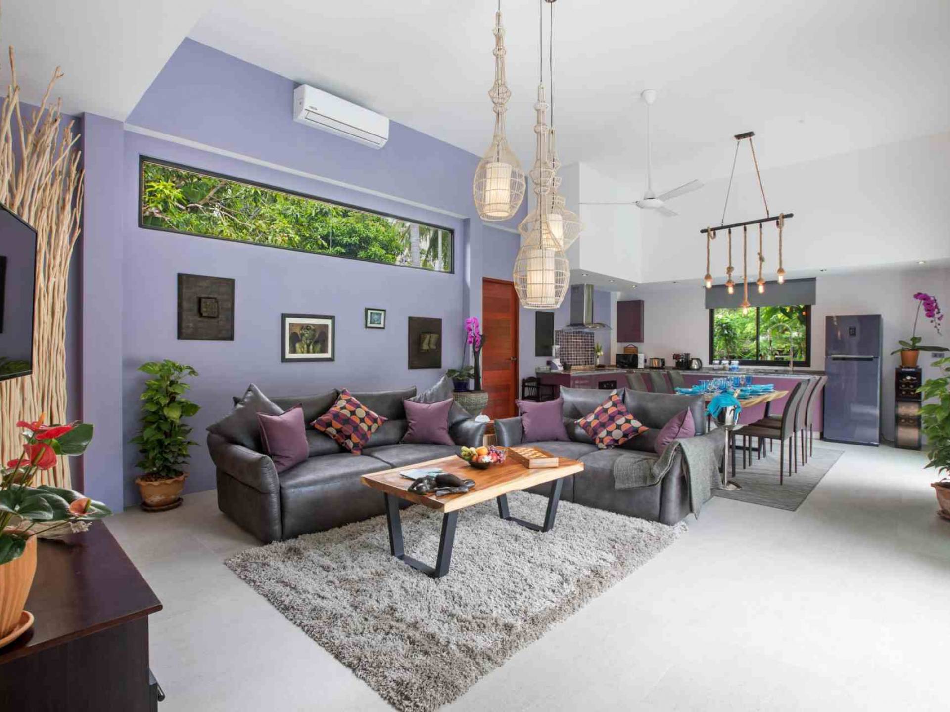 Todas las habitaciones tienen baño. Dos de los dormitorios tienen camas king-size (se puede colocar una cama / cuna adicional en cualquiera de ellos). Estos dos dormitorios también cuentan con sus propios jardines privados al aire libre. La sala de estar es abierta, con un televisor “SMART” de pantalla plana de 50 pulgadas con más de 300 canales internacionales en 5 idiomas. Se proporcionan reproductor de DVD y DVD. La villa es espaciosa, pero cómoda, con vistas a la terraza exterior y a la piscina de agua salada.