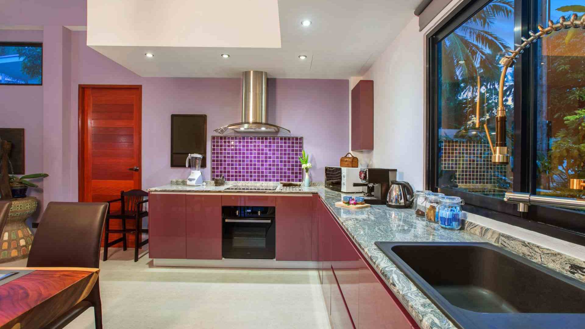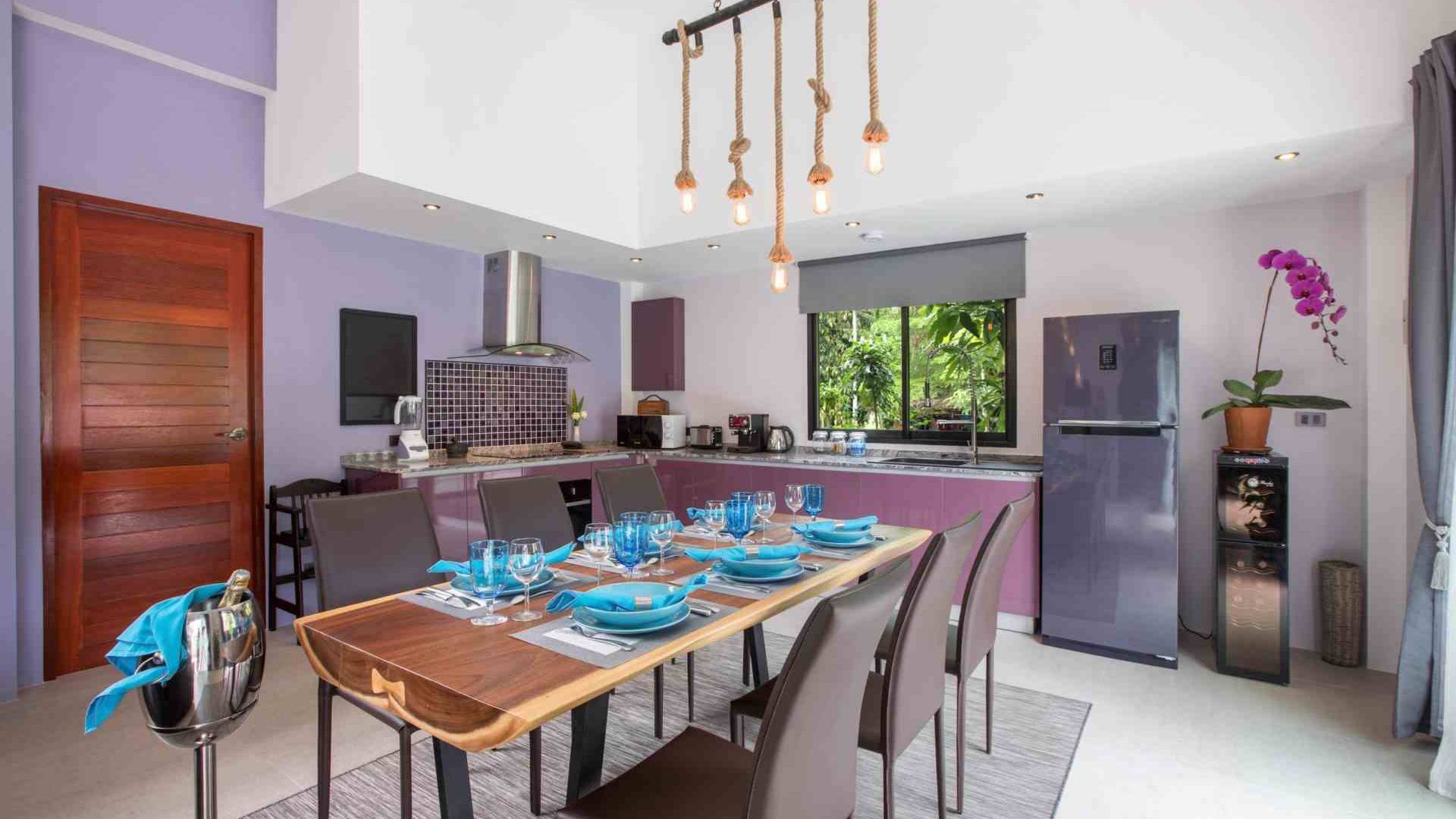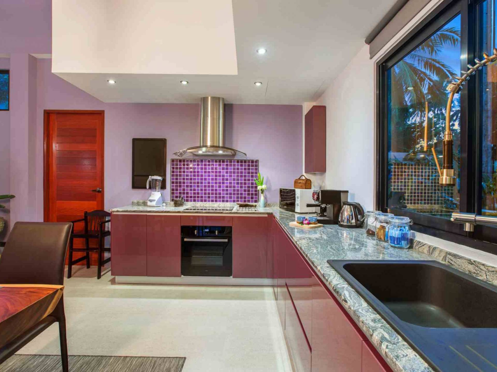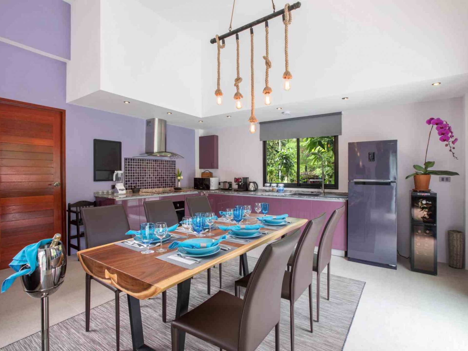 La cocina es moderna, está totalmente equipada e incluye su propia máquina de café espresso. Baan Suaan Bua Villa Samui tiene una nevera-congelador donde encontrará agua de cortesía, algunas cervezas locales (con cargo) y, por supuesto, vasos bien fríos. Hay una nevera para vinos de dos niveles con una selección de vinos a precios razonables. Se ofrecen tés, café molido e instantáneo y agua embotellada de cortesía. La ubicación es un escondite ideal, ya que es una zona muy tranquila muy cerca de tres hermosas pero tranquilas playas y del pueblo local de Thong Krut. Thong Krut tiene varios restaurantes y bares internacionales, así como algunos restaurantes y cafés tradicionales tailandeses. La localidad organiza la mayoría de las excursiones de snorkel y excursiones marítimas habituales de Samui. También tiene una selección de supermercados / tiendas de comestibles locales.