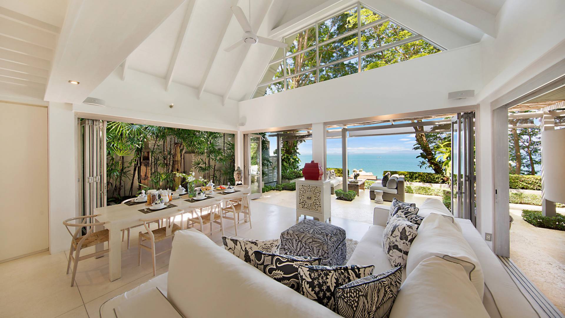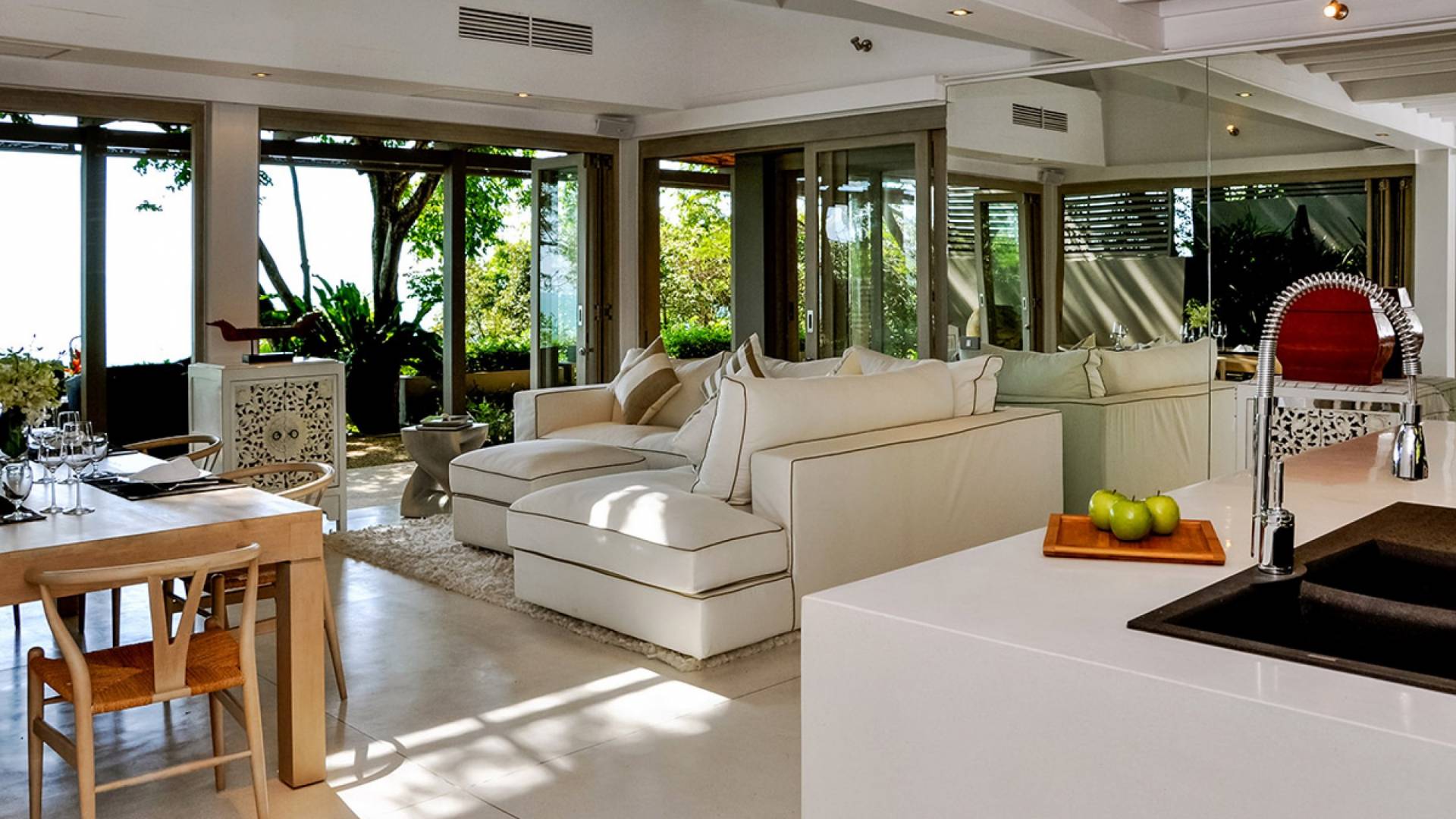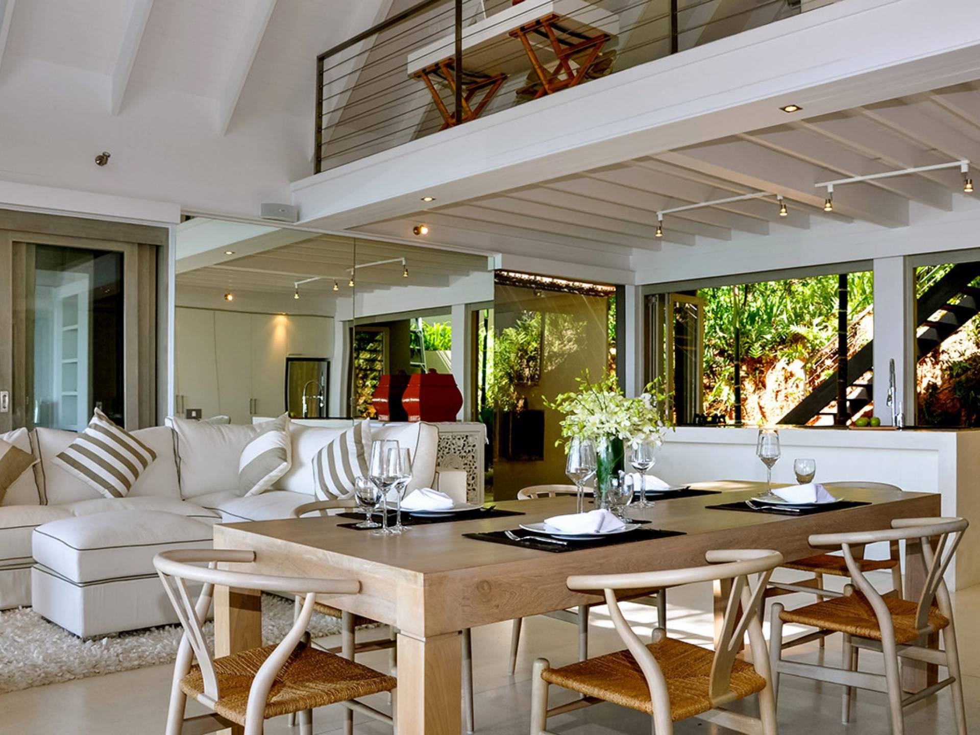 Dentro del salón, todos los lados parecen estar abiertos a la naturaleza, creando un espacio de vida muy fresco y flexible. Los cómodos sofás blancos, una mesa de comedor de madera natural, una gran pared con espejos y una cocina con isla blanca excepcional hacen de esta el área perfecta para entretenerse o relajarse. Los techos altos abovedados, con ventanas hasta los aleros, aseguran que la habitación sea luminosa y que la vista sea siempre el centro de atención. La escalera trasera de madera y metal conduce a un balcón y a la entrada al entrepiso. Las estatuas de Buda de bienvenida se sientan a ambos lados de la puerta que conduce a la elegante y cómoda sala de televisión que da al salón y al océano.