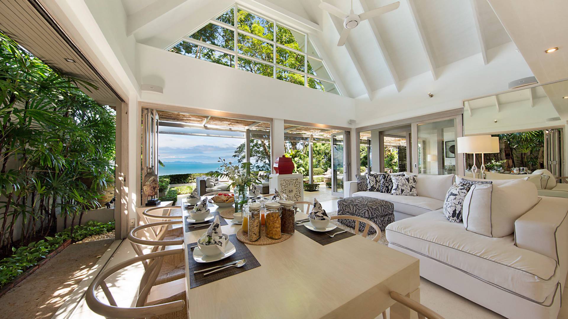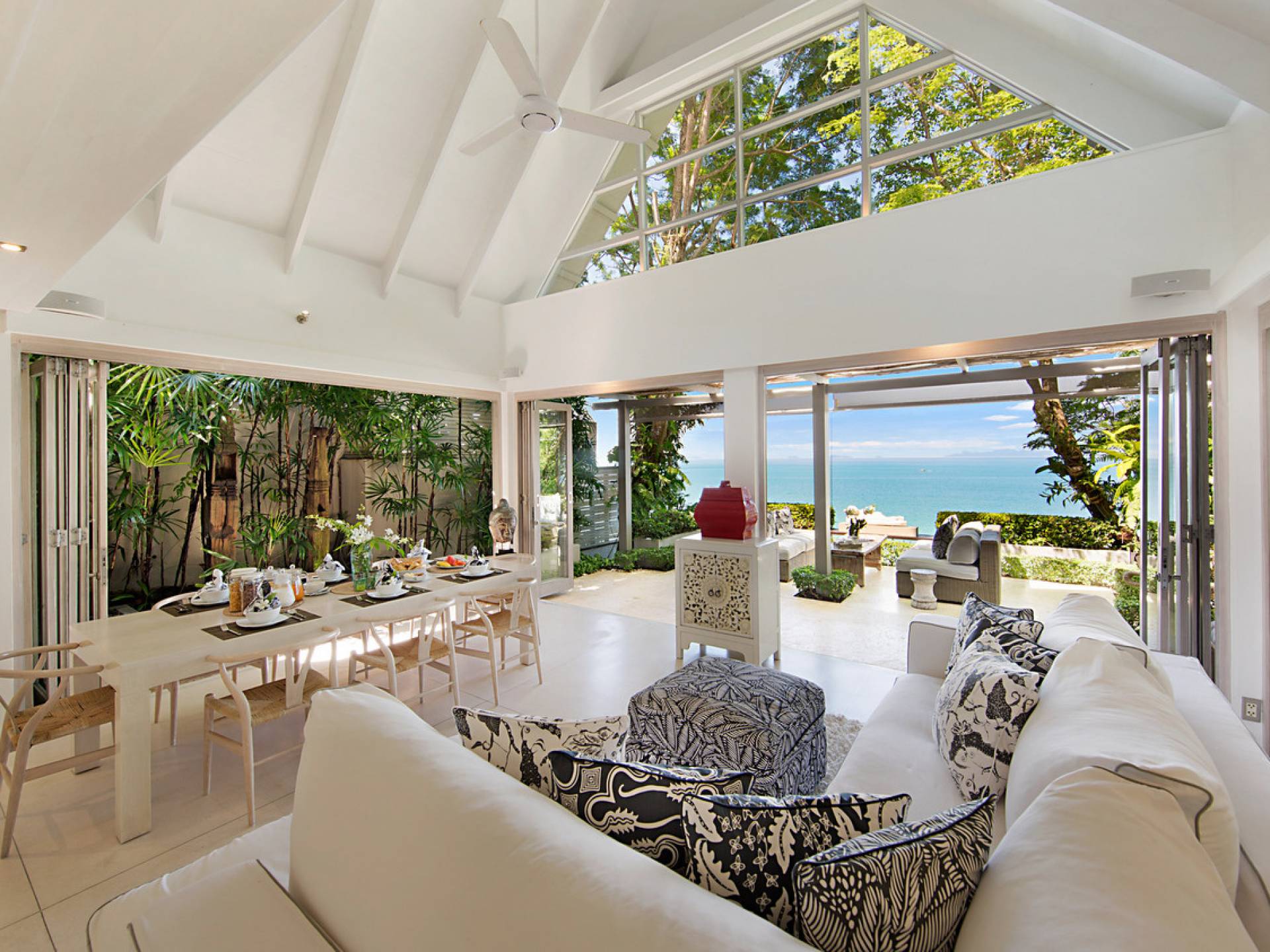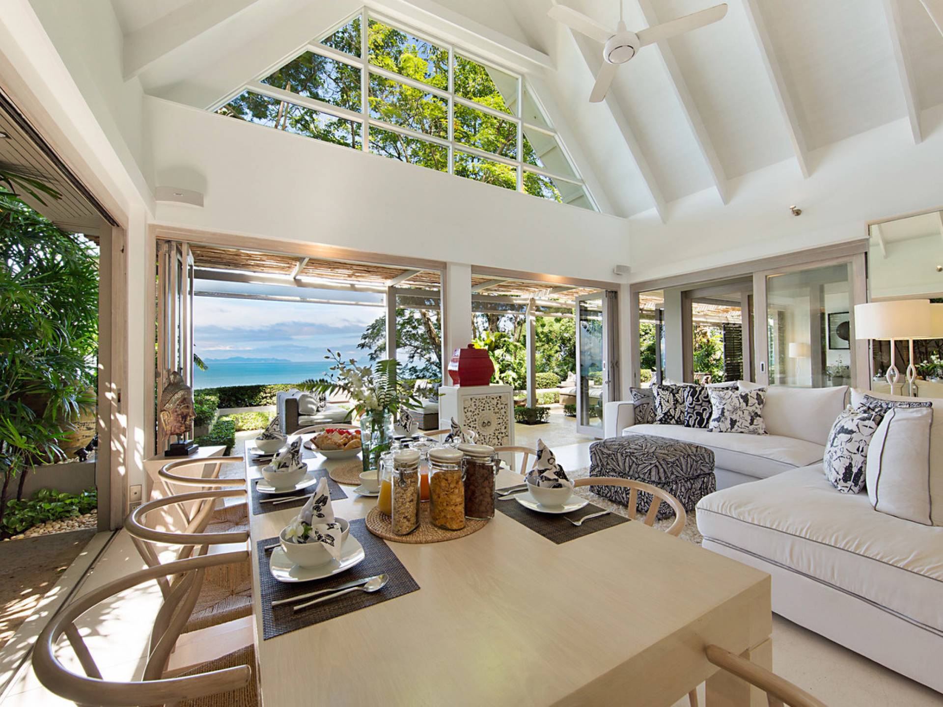 Dentro del salón, todos los lados parecen estar abiertos a la naturaleza, creando un espacio de vida muy fresco y flexible. Los cómodos sofás blancos, una mesa de comedor de madera natural, una gran pared con espejos y una cocina con isla blanca excepcional hacen de esta el área perfecta para entretenerse o relajarse. Los techos altos abovedados, con ventanas hasta los aleros, aseguran que la habitación sea luminosa y que la vista sea siempre el centro de atención. La escalera trasera de madera y metal conduce a un balcón y a la entrada al entrepiso. Las estatuas de Buda de bienvenida se sientan a ambos lados de la puerta que conduce a la elegante y cómoda sala de televisión que da al salón y al océano.