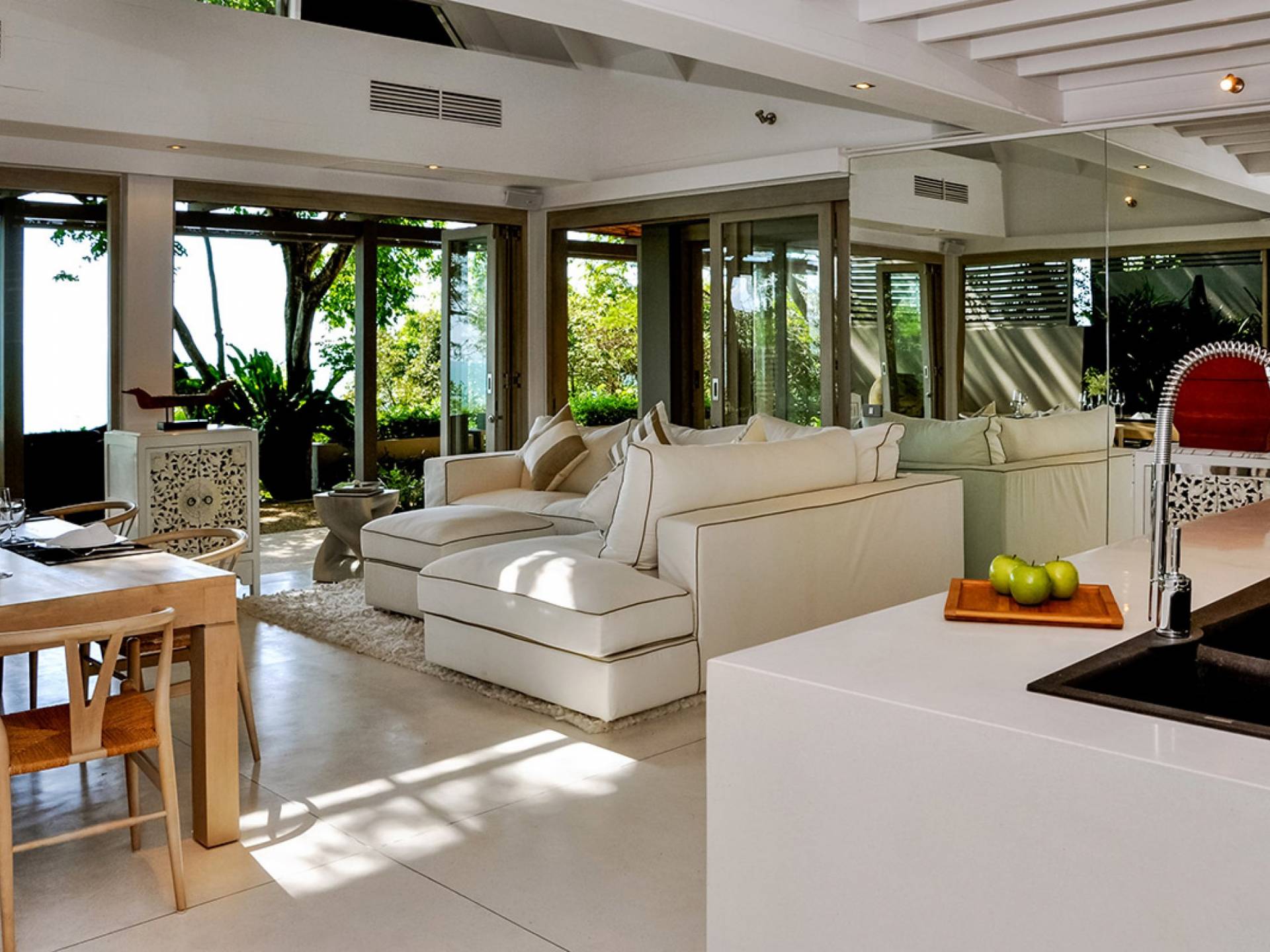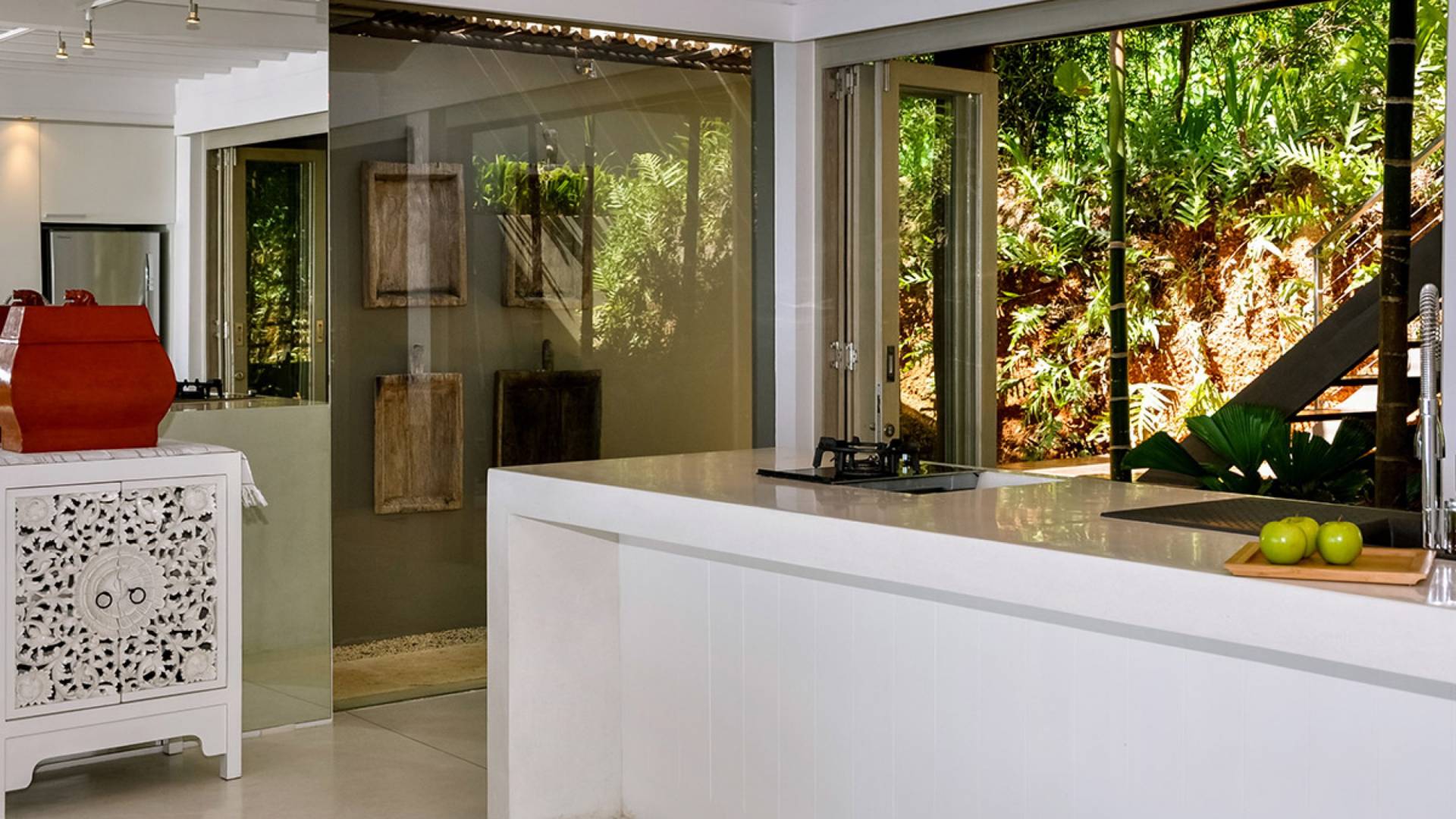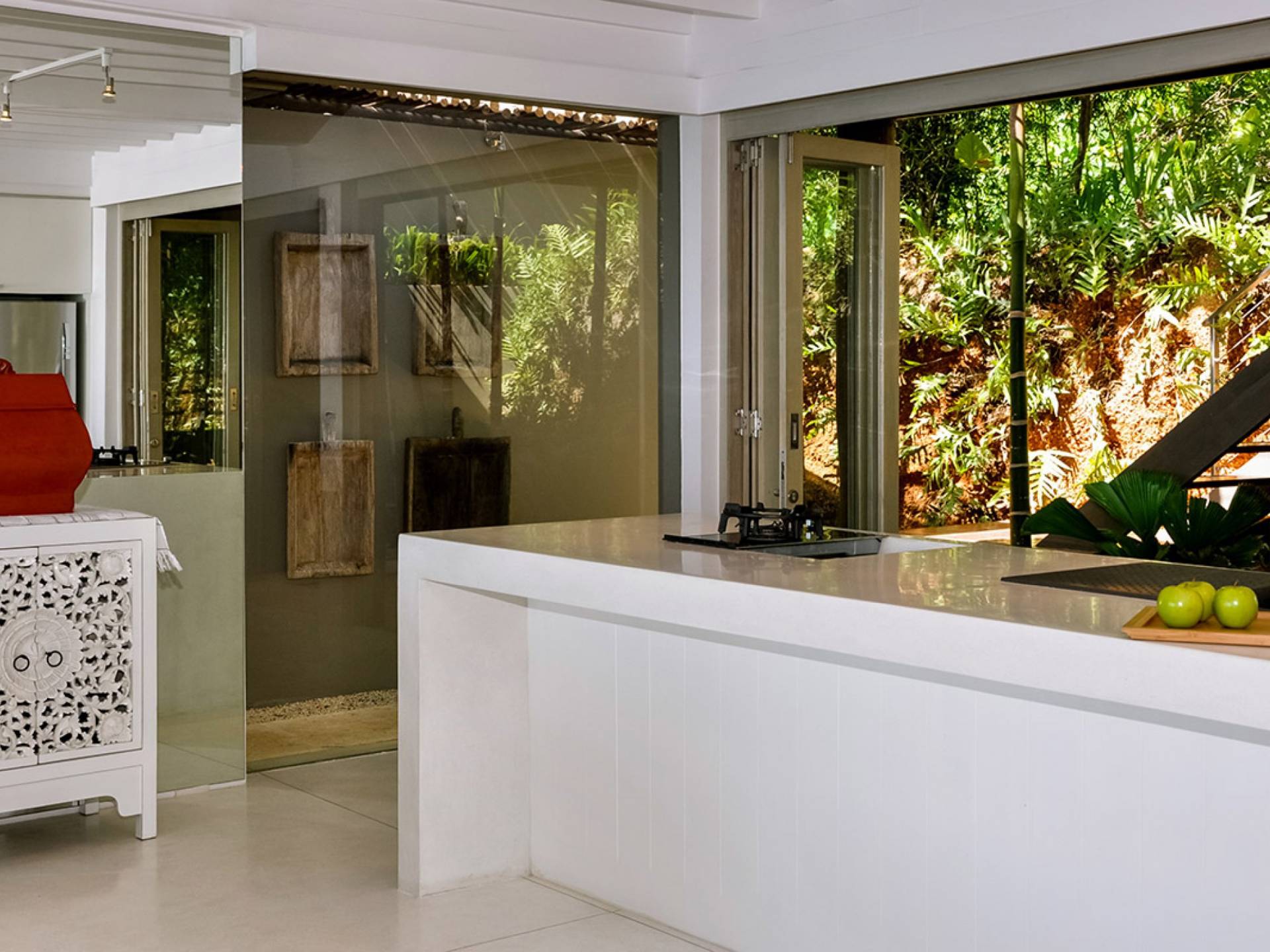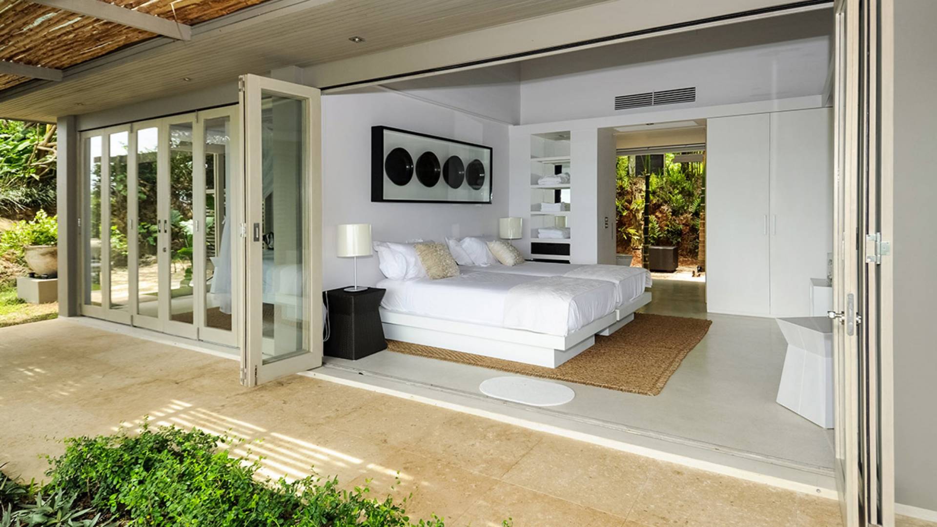 En la terraza corrediza, se pueden usar paneles de tocador de madera para separar las habitaciones del jardín y las áreas de comedor al aire libre y se pueden ver más detalles en el banco de madera tallado en un cocodrilo. Lo que se nota al instante, tanto en los jardines como en el interior de la villa, es lo genial que es. El diseño permite un flujo de aire natural y esto funciona muy bien, lo que le permite disfrutar del estilo de vida interior / exterior sin tener que cerrar todas las ventanas y usar el aire acondicionado. La primera habitación es la suite principal que se abre completamente desde la terraza delantera hasta el jardín trasero. Las superficies blancas se complementan con una impresionante cama con dosel con drapeados blancos y la habitación está decorada con sutiles tonos de verde. El baño en suite combina con el estilo blanco y sencillo y cuenta con una gran ducha de lluvia. Adyacente a esta habitación se encuentra el segundo dormitorio, que es una imagen especular del maestro. Sin embargo, esta habitación ha sido amueblada con dos camas individuales. Ambos dormitorios disfrutan de una vista excepcional. Un pequeño pasaje separa los dormitorios de la sala de estar y conduce a un baño de visitas y escaleras al entrepiso sobre el salón.