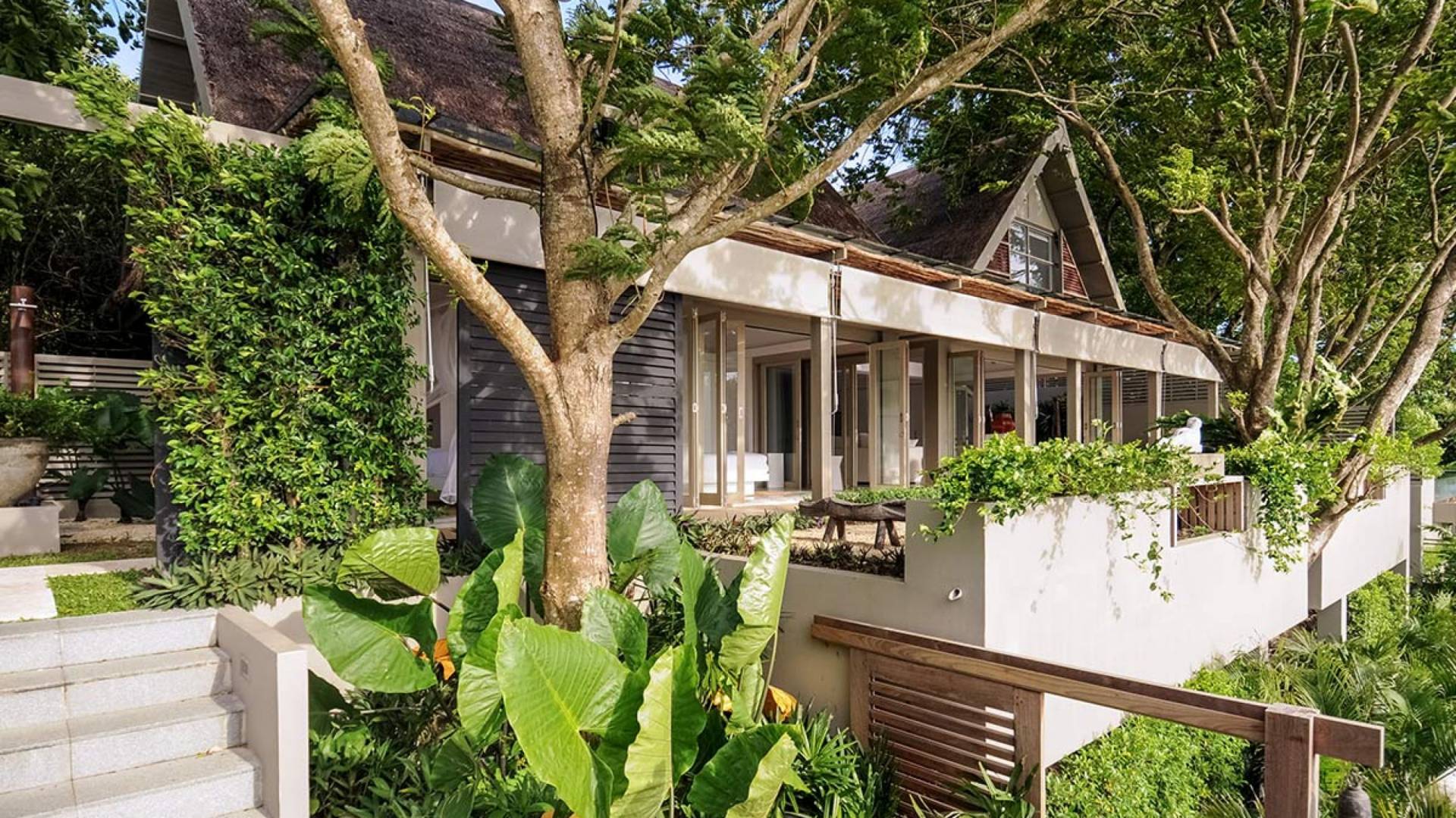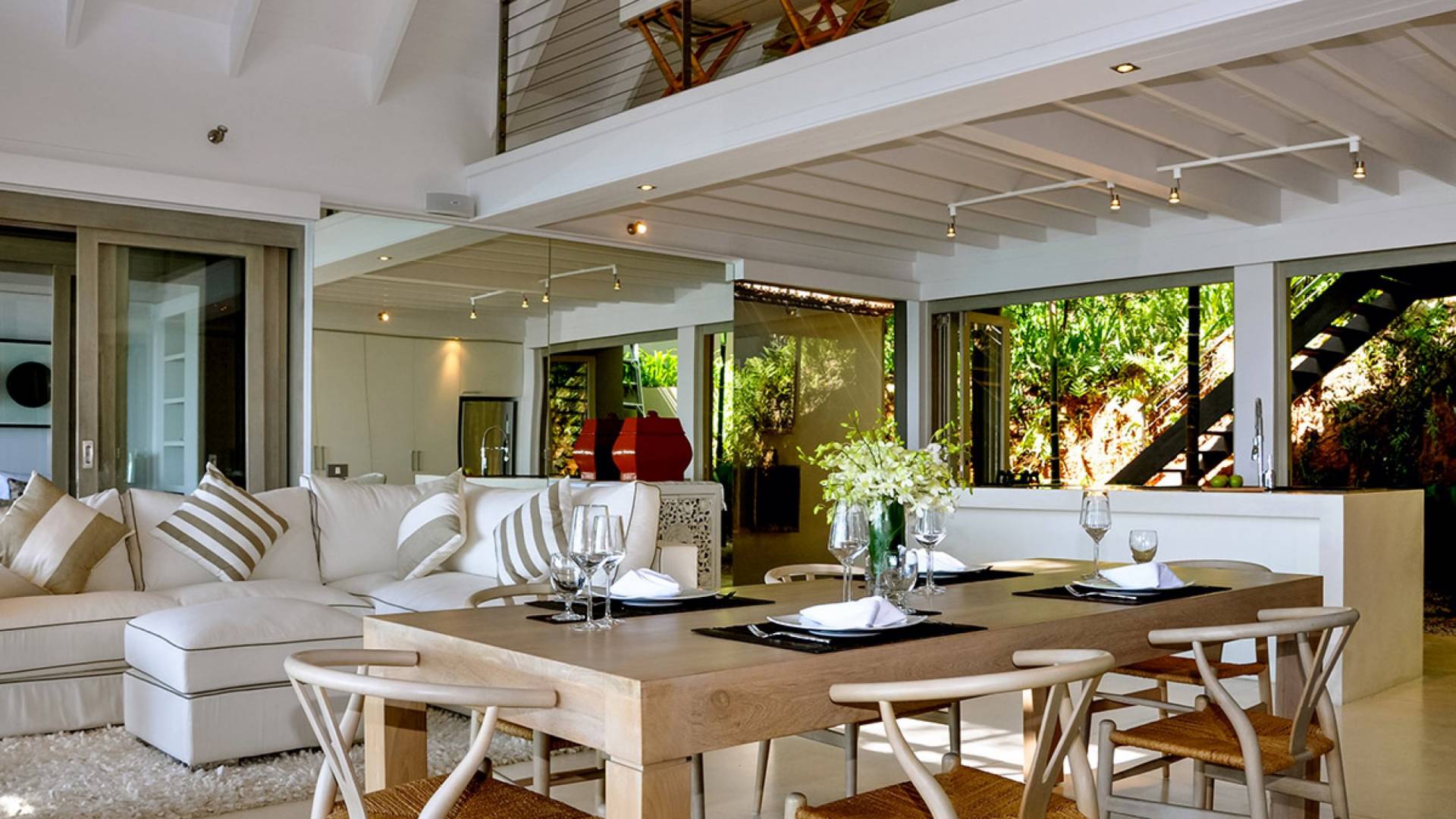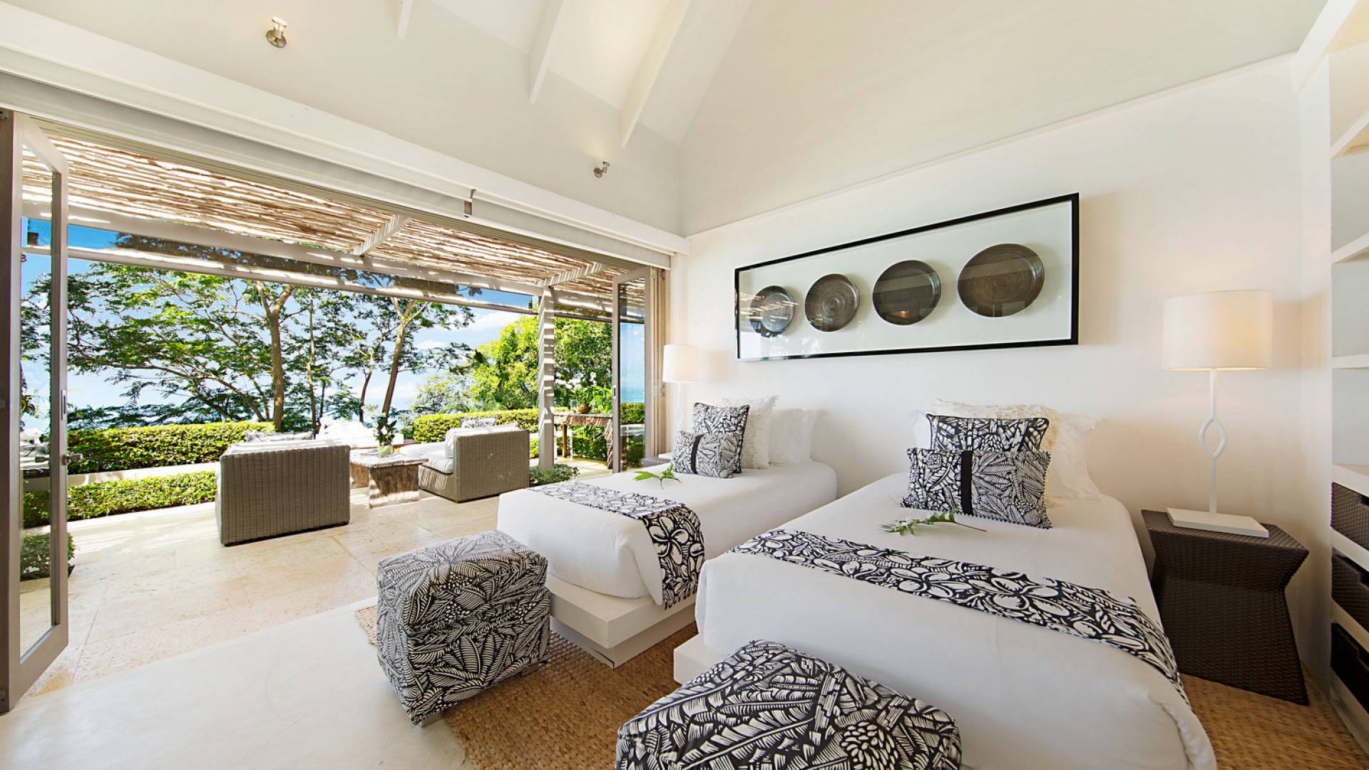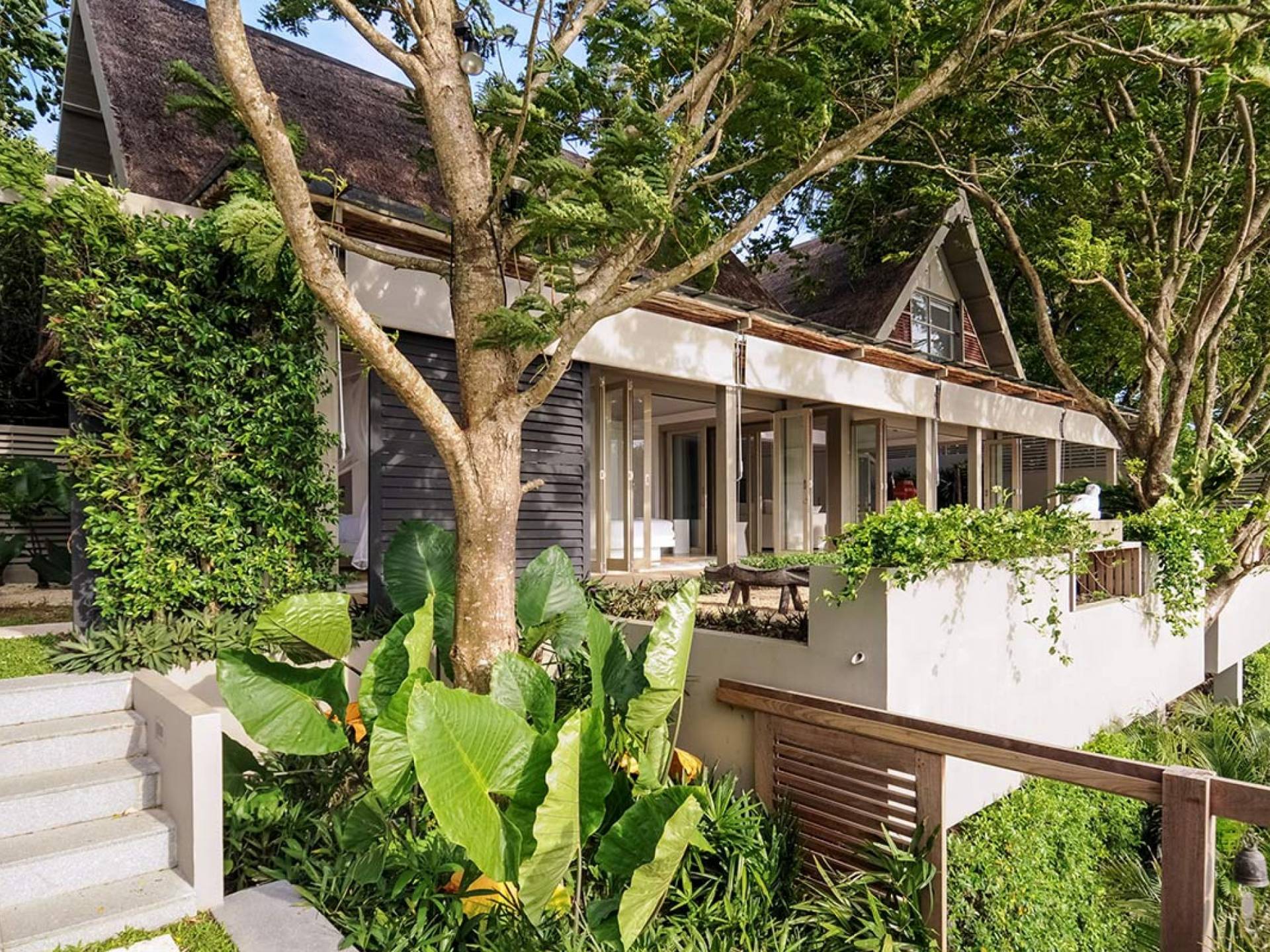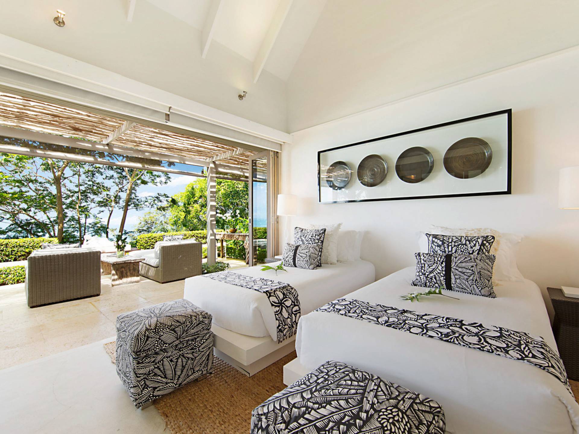 En la terraza corrediza, se pueden usar paneles de tocador de madera para separar las habitaciones del jardín y las áreas de comedor al aire libre y se pueden ver más detalles en el banco de madera tallado en un cocodrilo. Lo que se nota al instante, tanto en los jardines como en el interior de la villa, es lo genial que es. El diseño permite un flujo de aire natural y esto funciona muy bien, lo que le permite disfrutar del estilo de vida interior / exterior sin tener que cerrar todas las ventanas y usar el aire acondicionado. La primera habitación es la suite principal que se abre completamente desde la terraza delantera hasta el jardín trasero. Las superficies blancas se complementan con una impresionante cama con dosel con drapeados blancos y la habitación está decorada con sutiles tonos de verde. El baño en suite combina con el estilo blanco y sencillo y cuenta con una gran ducha de lluvia. Adyacente a esta habitación se encuentra el segundo dormitorio, que es una imagen especular del maestro. Sin embargo, esta habitación ha sido amueblada con dos camas individuales. Ambos dormitorios disfrutan de una vista excepcional. Un pequeño pasaje separa los dormitorios de la sala de estar y conduce a un baño de visitas y escaleras al entrepiso sobre el salón.