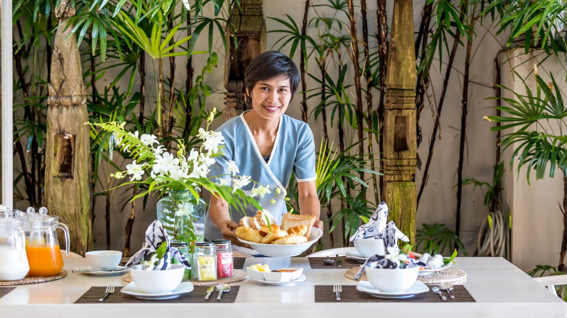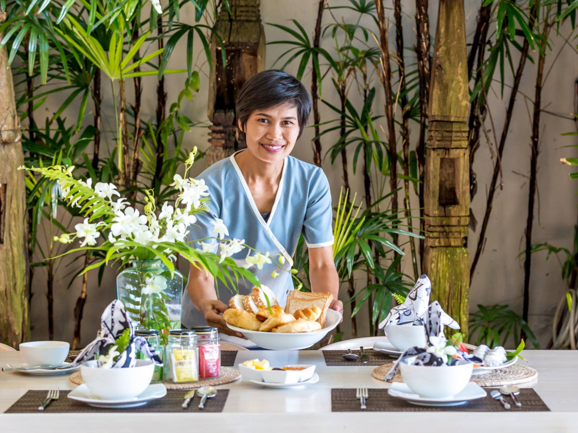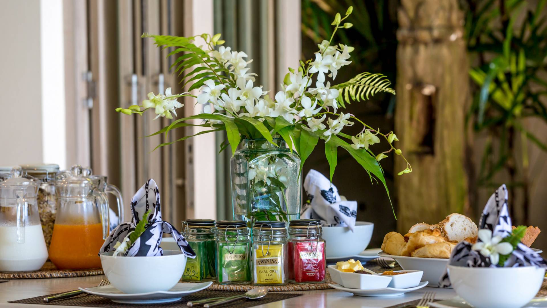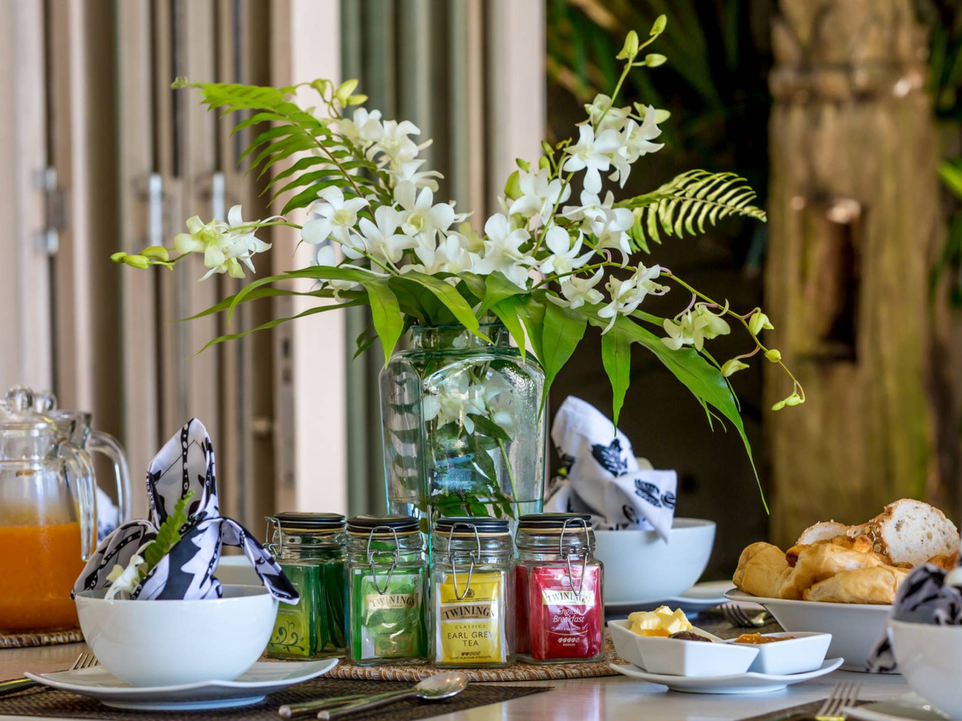 En la terraza corrediza, se pueden usar paneles de tocador de madera para separar las habitaciones del jardín y las áreas de comedor al aire libre y se pueden ver más detalles en el banco de madera tallado en un cocodrilo. Lo que se nota al instante, tanto en los jardines como en el interior de la villa, es lo genial que es. El diseño permite un flujo de aire natural y esto funciona muy bien, lo que le permite disfrutar del estilo de vida interior / exterior sin tener que cerrar todas las ventanas y usar el aire acondicionado. La primera habitación es la suite principal que se abre completamente desde la terraza delantera hasta el jardín trasero. Las superficies blancas se complementan con una impresionante cama con dosel con drapeados blancos y la habitación está decorada con sutiles tonos de verde. El baño en suite combina con el estilo blanco y sencillo y cuenta con una gran ducha de lluvia. Adyacente a esta habitación se encuentra el segundo dormitorio, que es una imagen especular del maestro. Sin embargo, esta habitación ha sido amueblada con dos camas individuales. Ambos dormitorios disfrutan de una vista excepcional. Un pequeño pasaje separa los dormitorios de la sala de estar y conduce a un baño de visitas y escaleras al entrepiso sobre el salón.