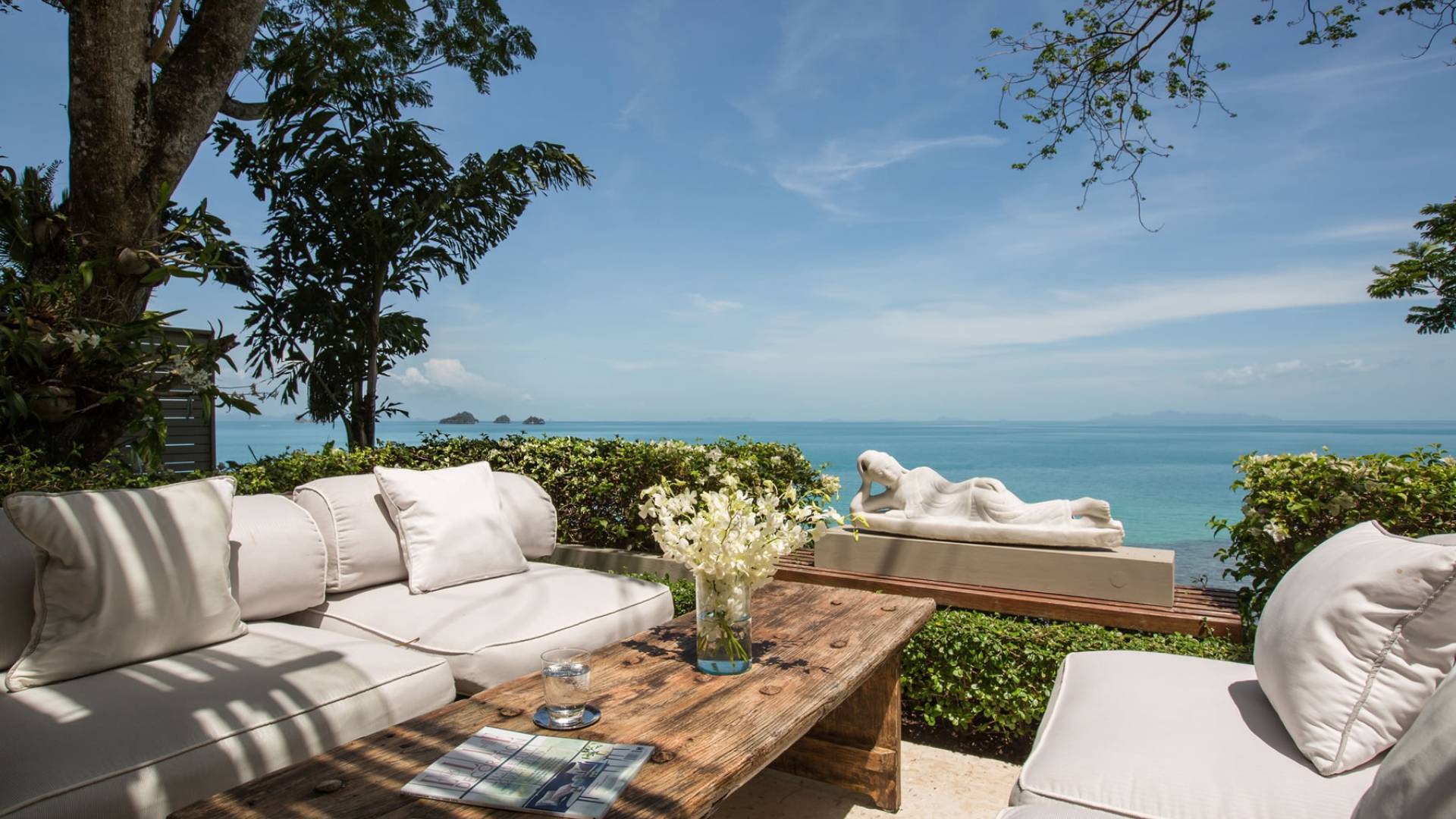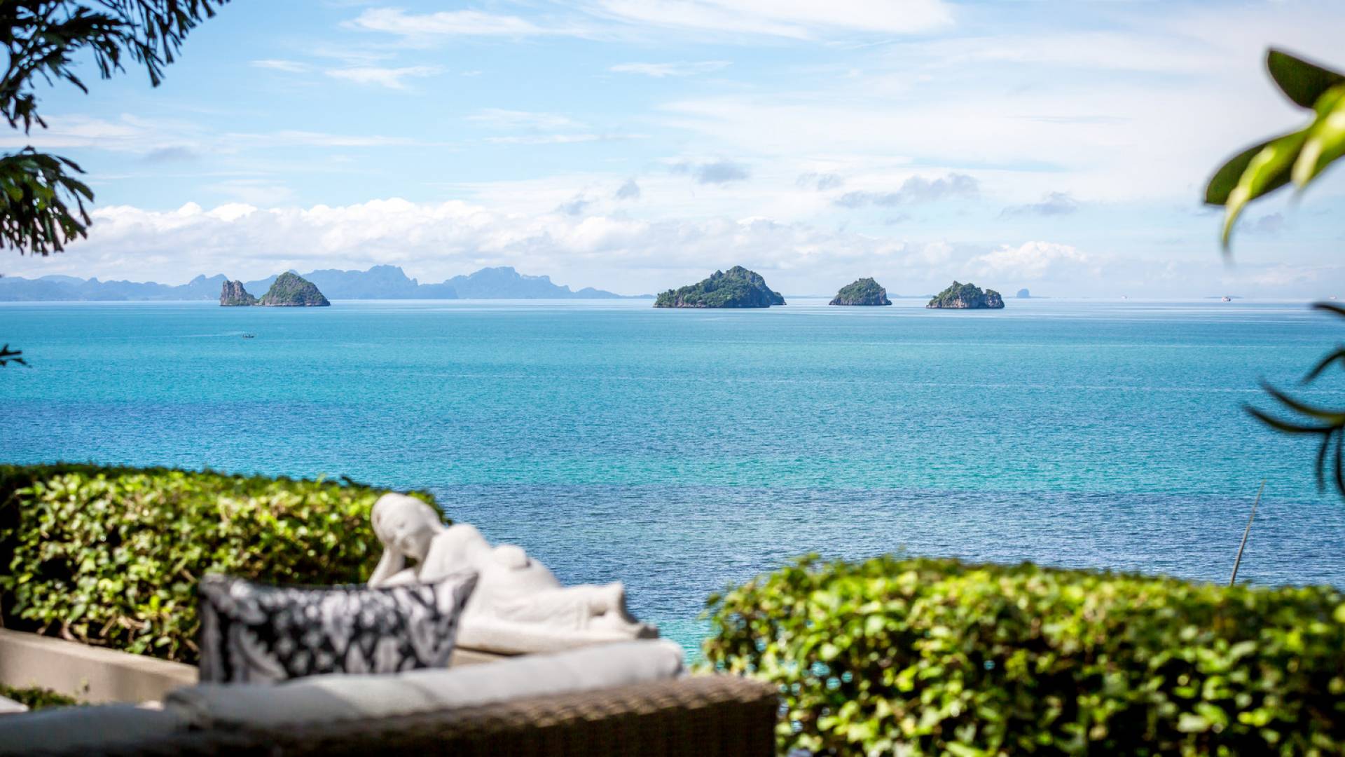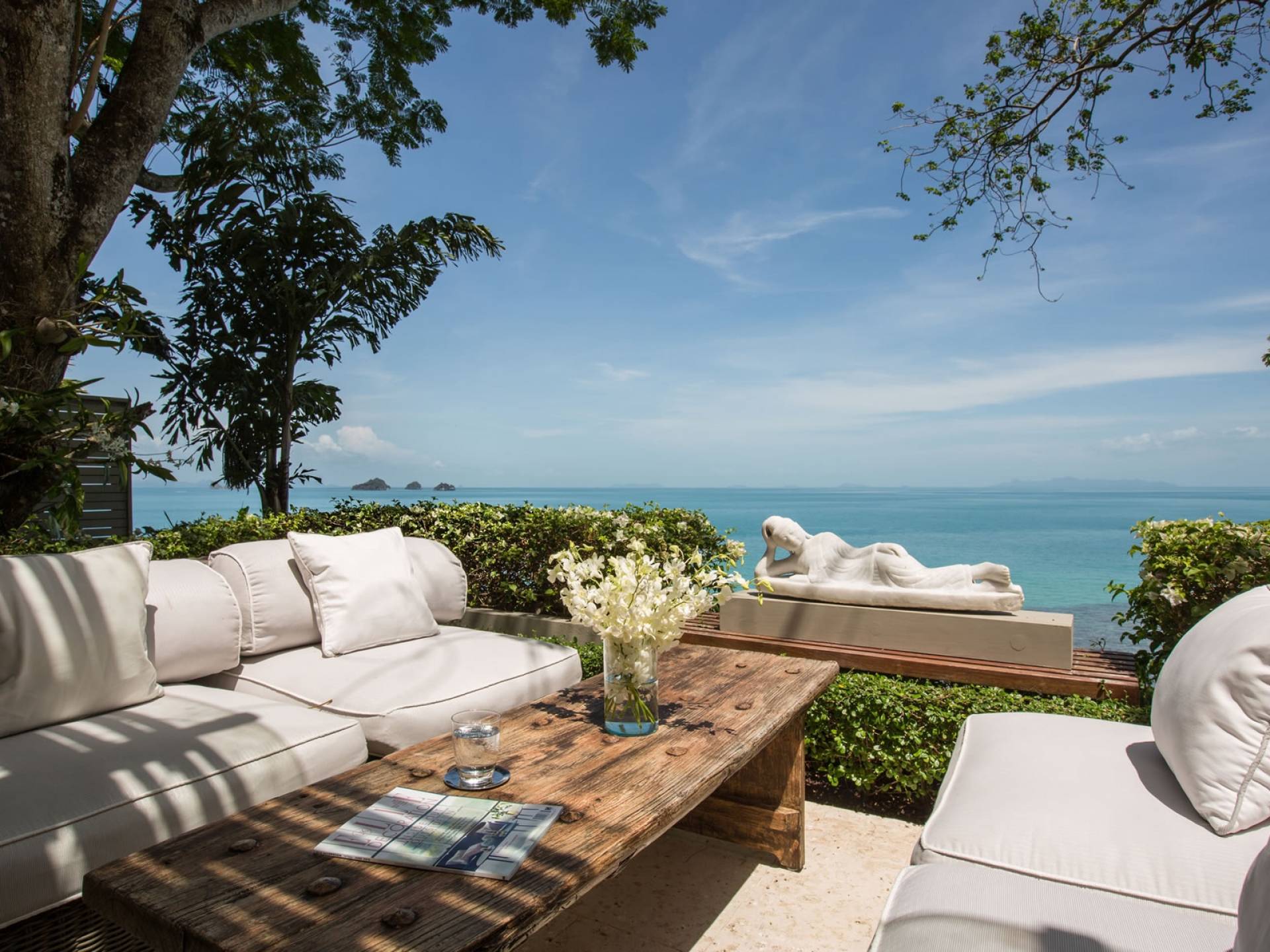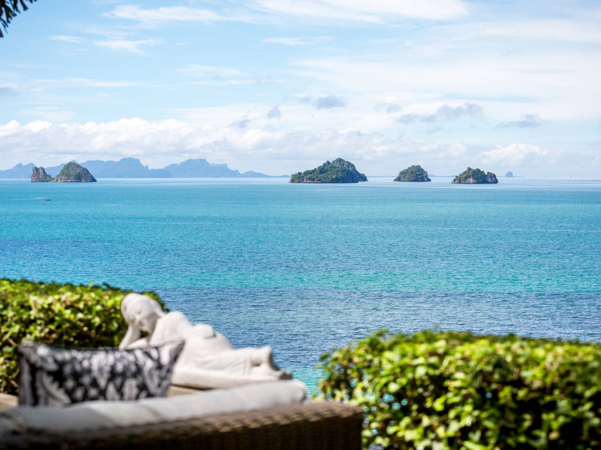 La entrada es sutil, como la propia villa, que ha sido diseñada para complementar su excepcional entorno natural. Unos pocos escalones conducen hasta una piscina infinita privada con azulejos azules que es paralela a lo que a menudo se describe como la mejor vista de Samui. Desde la piscina, podrá relajarse y disfrutar de las vistas de las cinco islas y también del parque marino nacional de Ang Thong. Es tan pacífico, silencioso y sereno que fácilmente podría creer que es la única persona en un paraíso tropical desierto. Detrás de la piscina, las rocas naturales y el paisaje forman el telón de fondo y el jardín que conduce a la villa. Otros pasos conducen a través de otra entrada cerrada y aquí es donde se hace evidente la increíble atención al detalle. Las manijas de las puertas son geckos de metal esculpidos y cuando entras te enfrentas a una maceta de gran tamaño, a la derecha está la villa y la terraza y el área del jardín que atraviesa el frente de la propiedad, lo que garantiza que las vistas sean siempre prominentes.