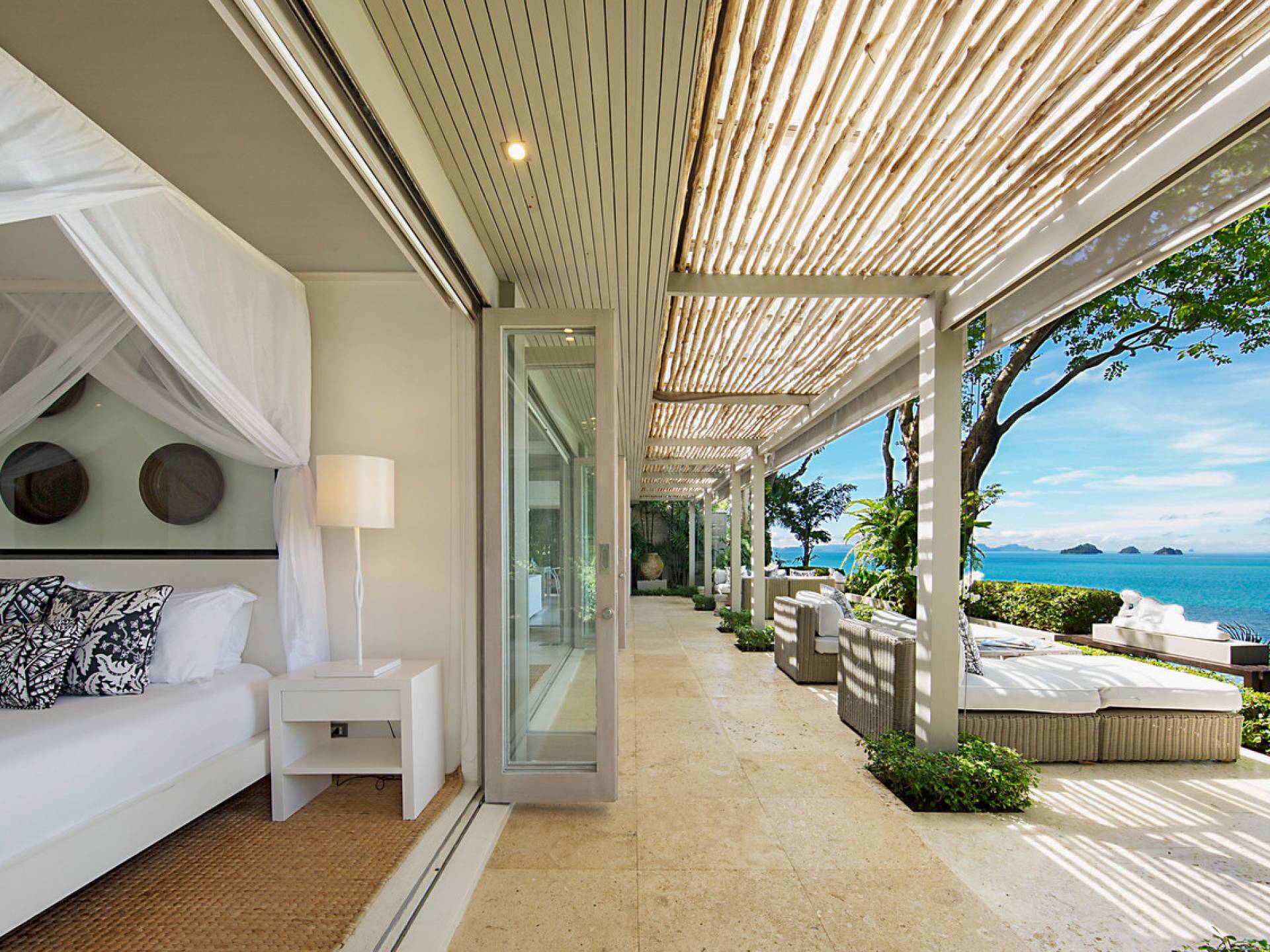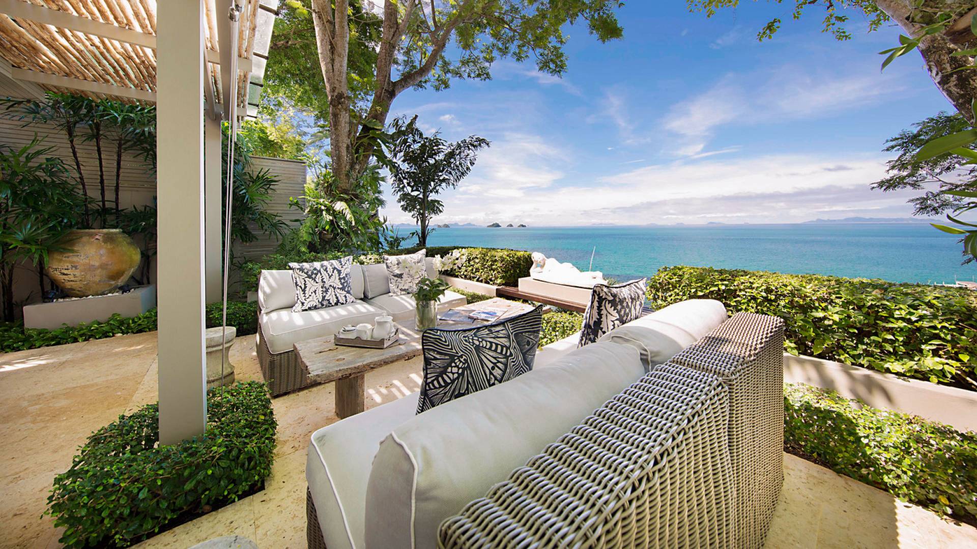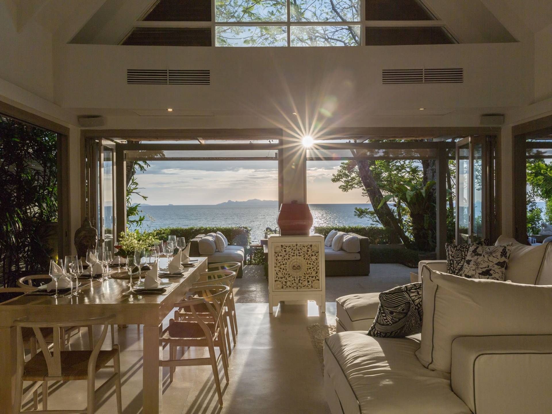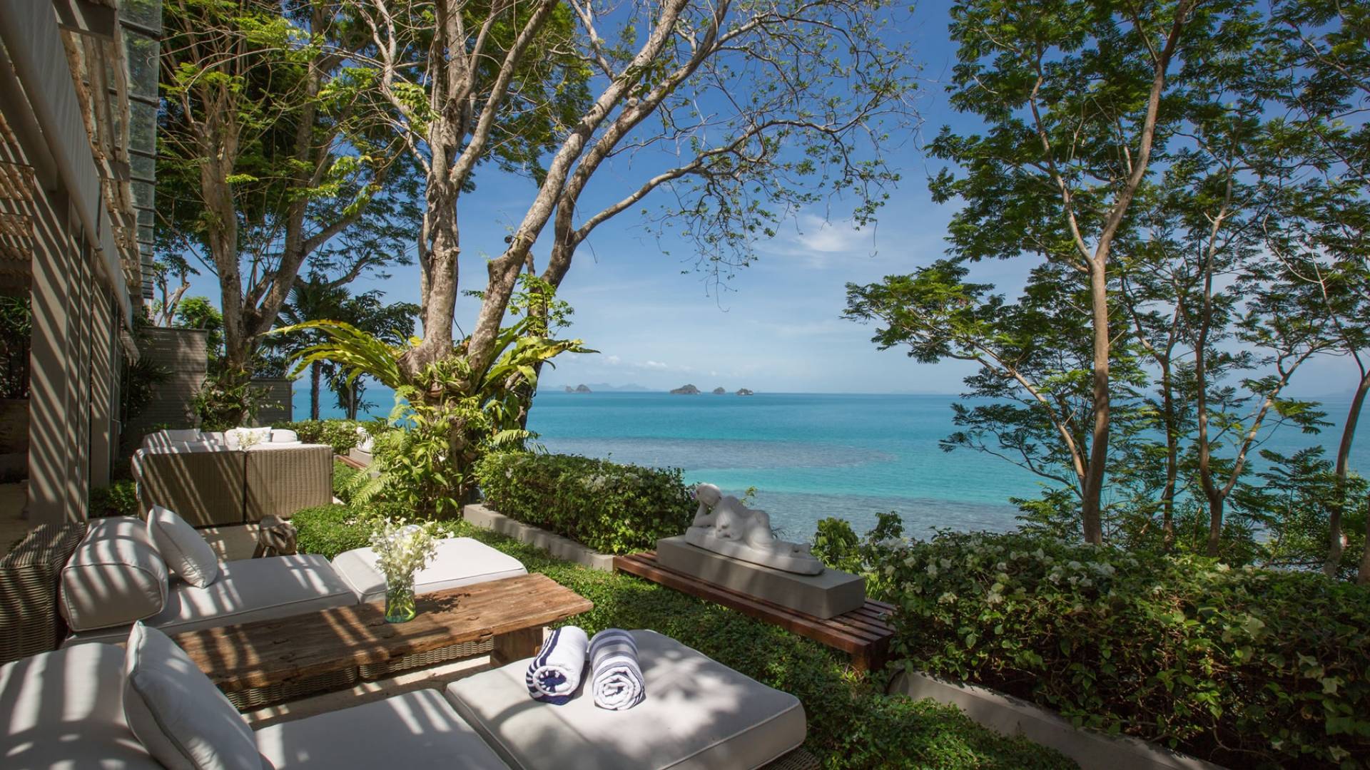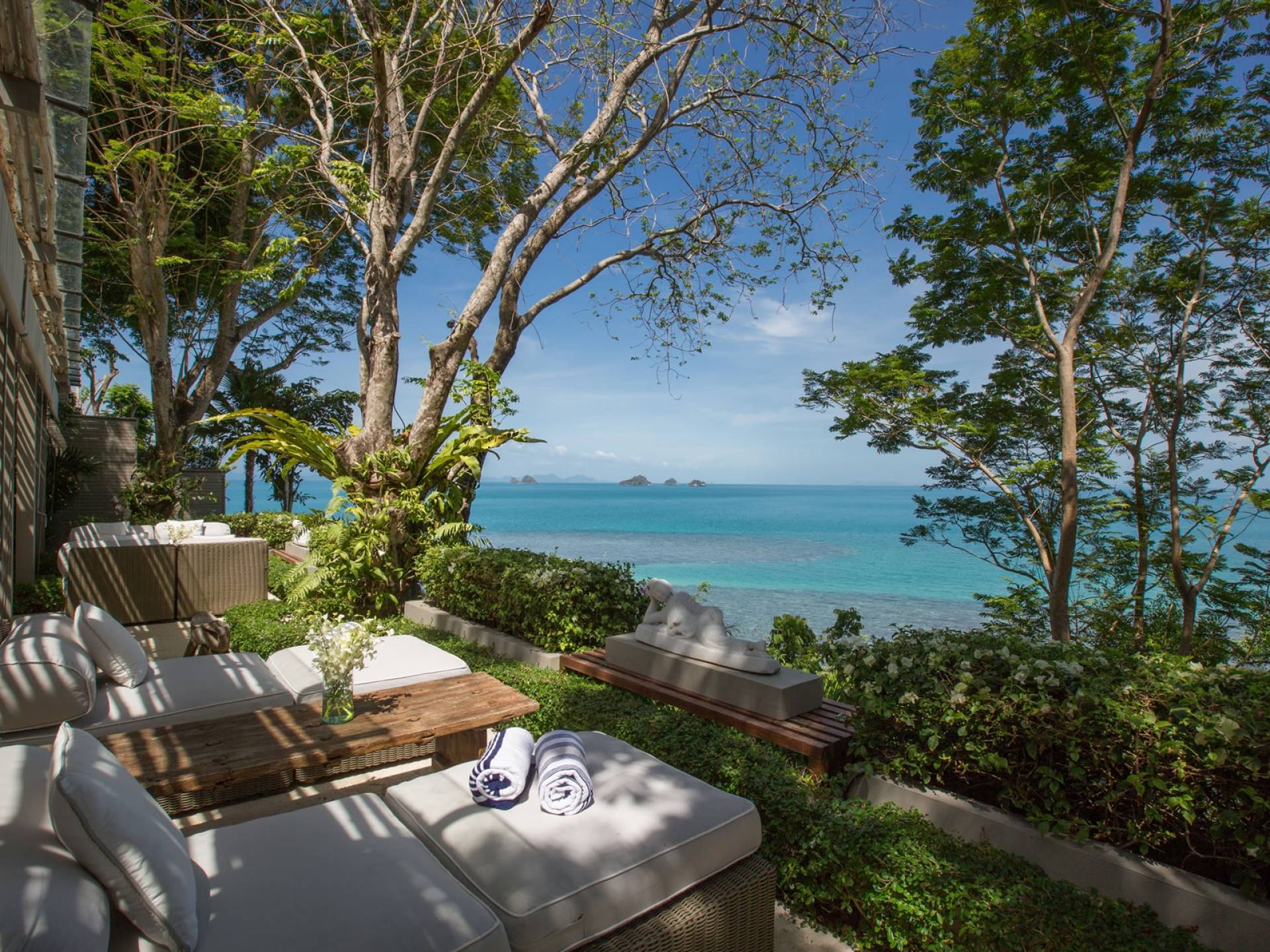 La entrada es sutil, como la propia villa, que ha sido diseñada para complementar su excepcional entorno natural. Unos pocos escalones conducen hasta una piscina infinita privada con azulejos azules que es paralela a lo que a menudo se describe como la mejor vista de Samui. Desde la piscina, podrá relajarse y disfrutar de las vistas de las cinco islas y también del parque marino nacional de Ang Thong. Es tan pacífico, silencioso y sereno que fácilmente podría creer que es la única persona en un paraíso tropical desierto. Detrás de la piscina, las rocas naturales y el paisaje forman el telón de fondo y el jardín que conduce a la villa. Otros pasos conducen a través de otra entrada cerrada y aquí es donde se hace evidente la increíble atención al detalle. Las manijas de las puertas son geckos de metal esculpidos y cuando entras te enfrentas a una maceta de gran tamaño, a la derecha está la villa y la terraza y el área del jardín que atraviesa el frente de la propiedad, lo que garantiza que las vistas sean siempre prominentes.