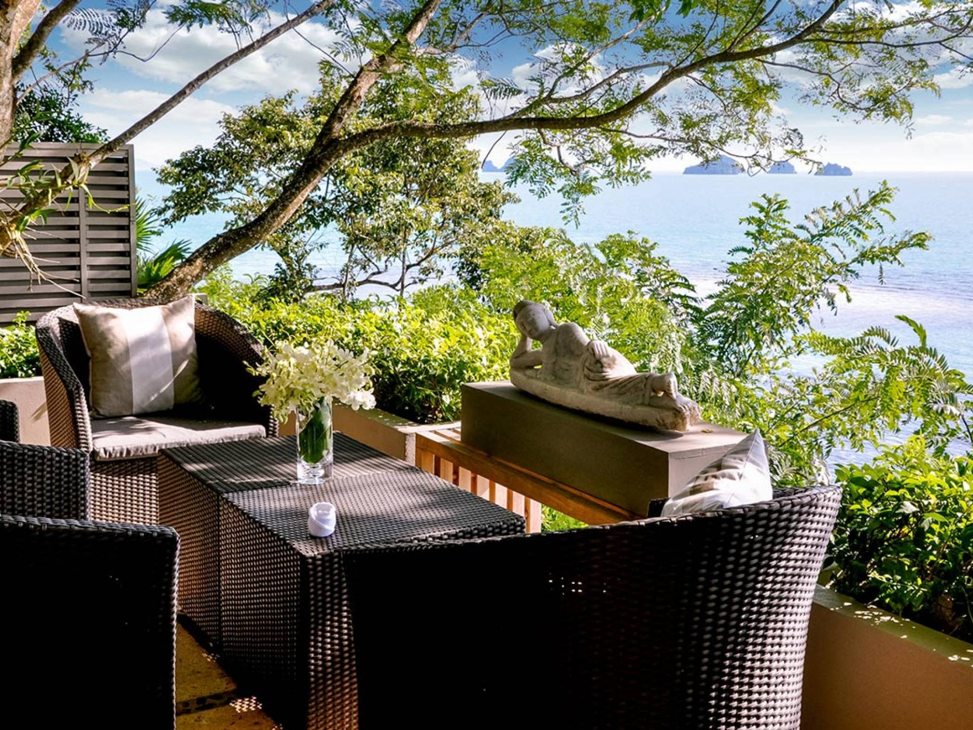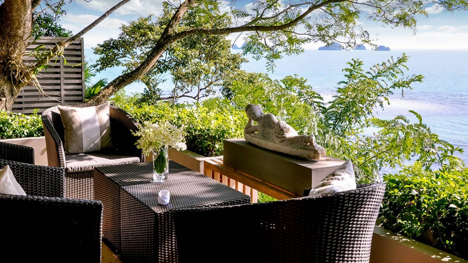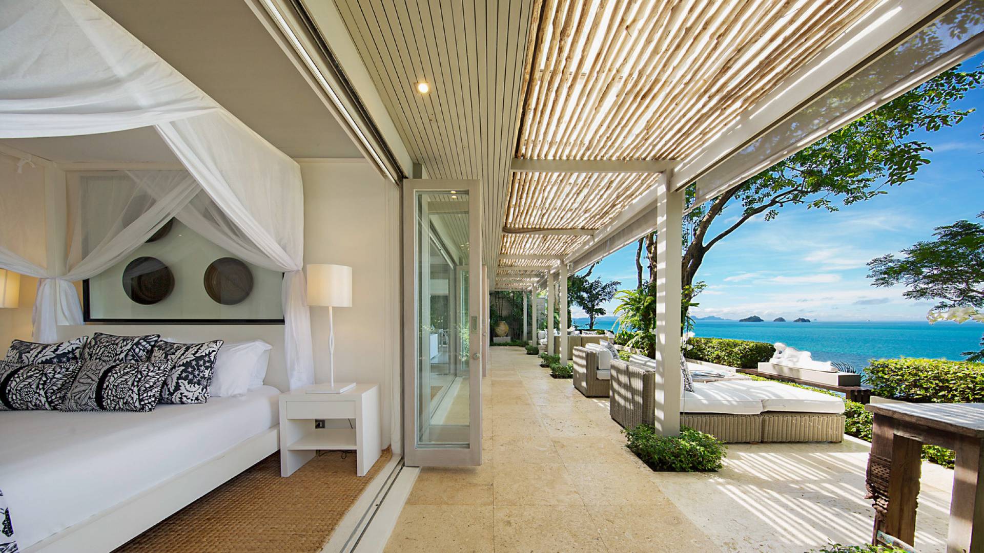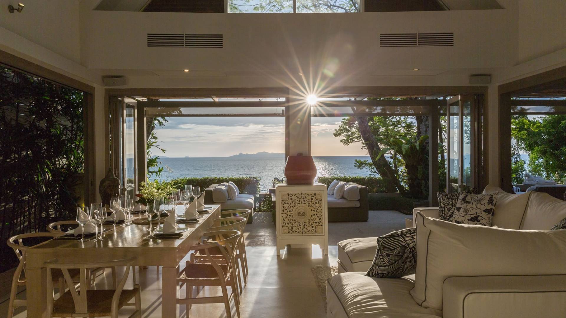 La entrada es sutil, como la propia villa, que ha sido diseñada para complementar su excepcional entorno natural. Unos pocos escalones conducen hasta una piscina infinita privada con azulejos azules que es paralela a lo que a menudo se describe como la mejor vista de Samui. Desde la piscina, podrá relajarse y disfrutar de las vistas de las cinco islas y también del parque marino nacional de Ang Thong. Es tan pacífico, silencioso y sereno que fácilmente podría creer que es la única persona en un paraíso tropical desierto. Detrás de la piscina, las rocas naturales y el paisaje forman el telón de fondo y el jardín que conduce a la villa. Otros pasos conducen a través de otra entrada cerrada y aquí es donde se hace evidente la increíble atención al detalle. Las manijas de las puertas son geckos de metal esculpidos y cuando entras te enfrentas a una maceta de gran tamaño, a la derecha está la villa y la terraza y el área del jardín que atraviesa el frente de la propiedad, lo que garantiza que las vistas sean siempre prominentes.