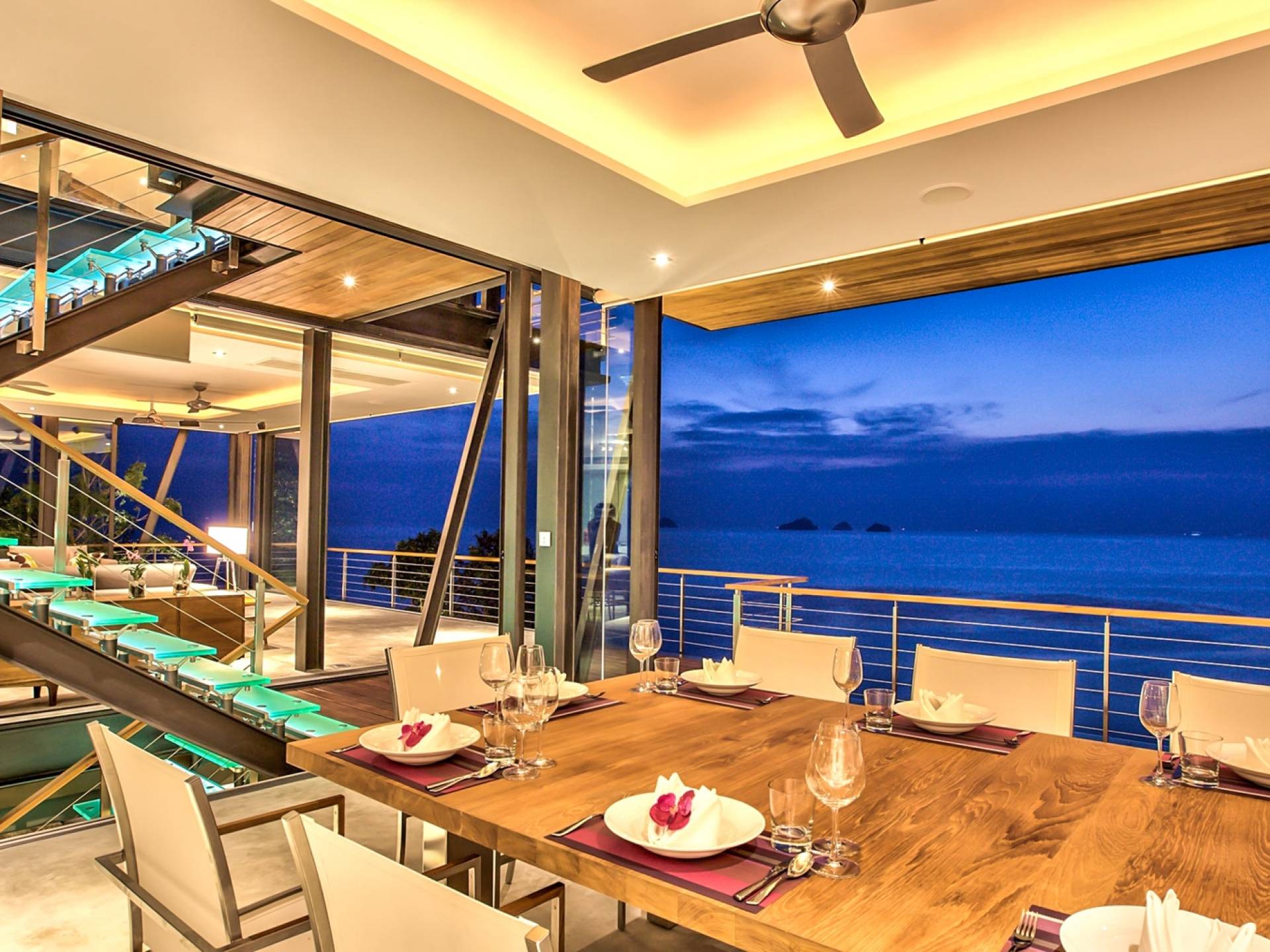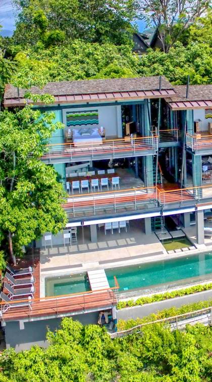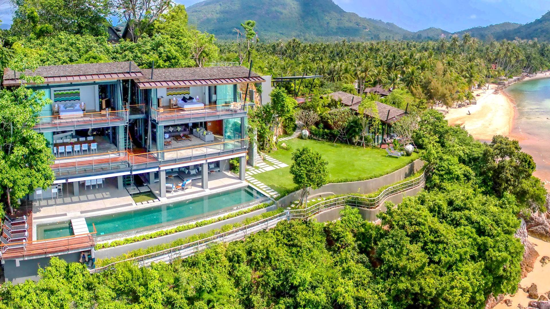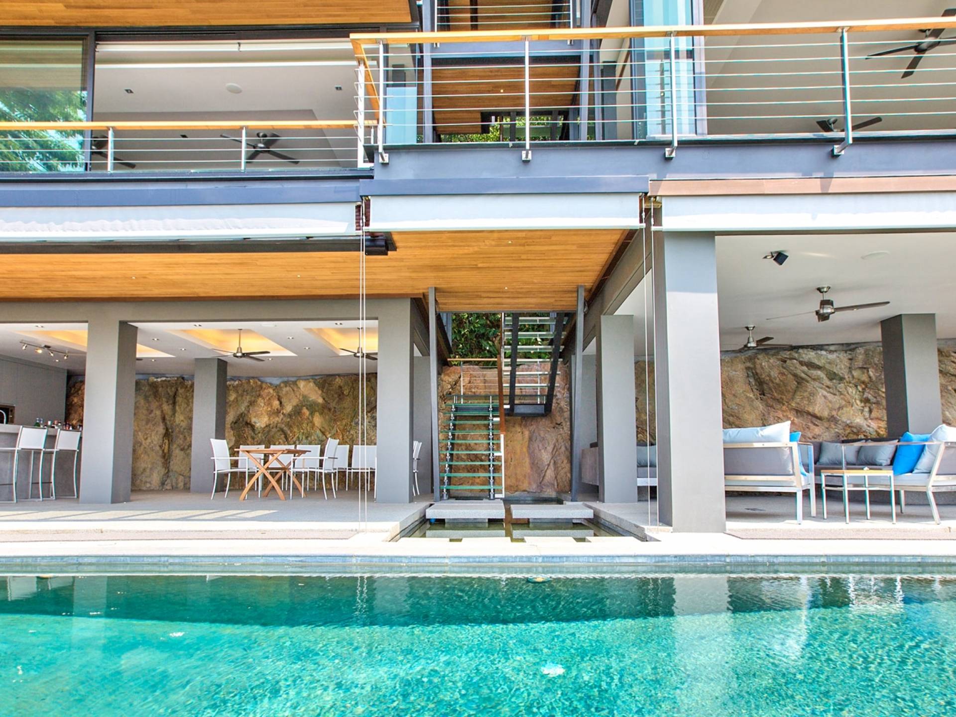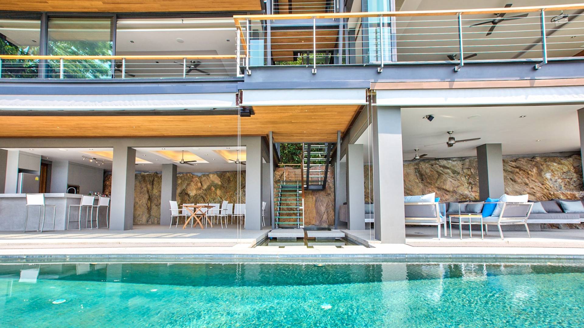 Un estudio en vidrio, acero, madera y cemento, The View Samui no se parece a nada que hayas visto antes. Llamada así por sus impresionantes vistas desde lo alto de los acantilados sobre la costa oeste de Koh Samui, esta villa de cinco habitaciones gana cada pedacito de su exageración y rayas con sus vistas de 180 grados desde cada una de sus habitaciones y salas de estar con puertas de vidrio de cuerpo entero, acantilado natural ajuste de la cara, alojamiento para niños a medida, jardín tropical y áreas al aire libre ultra-chic que incluso incluye un estanque completo con cascada.