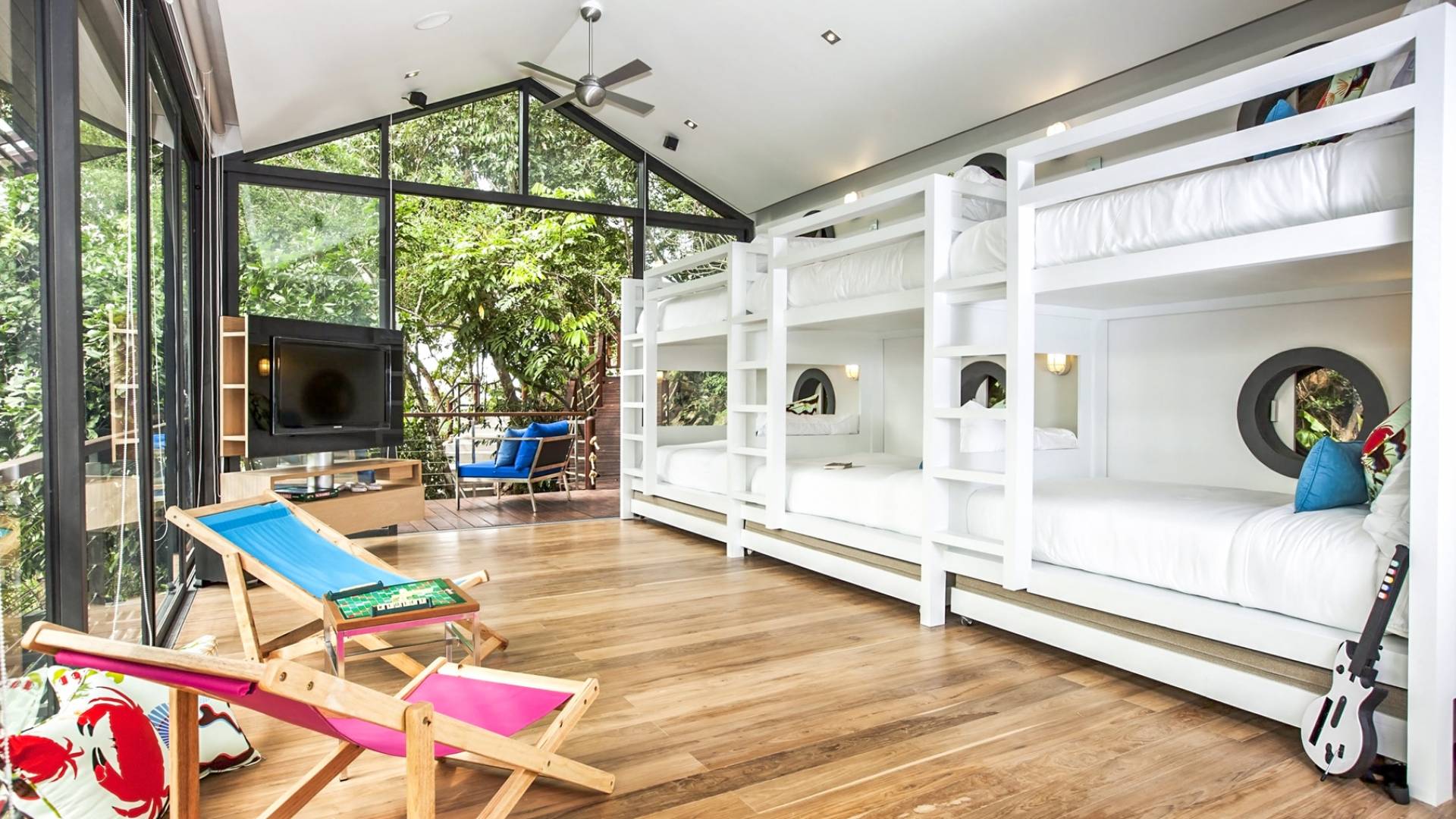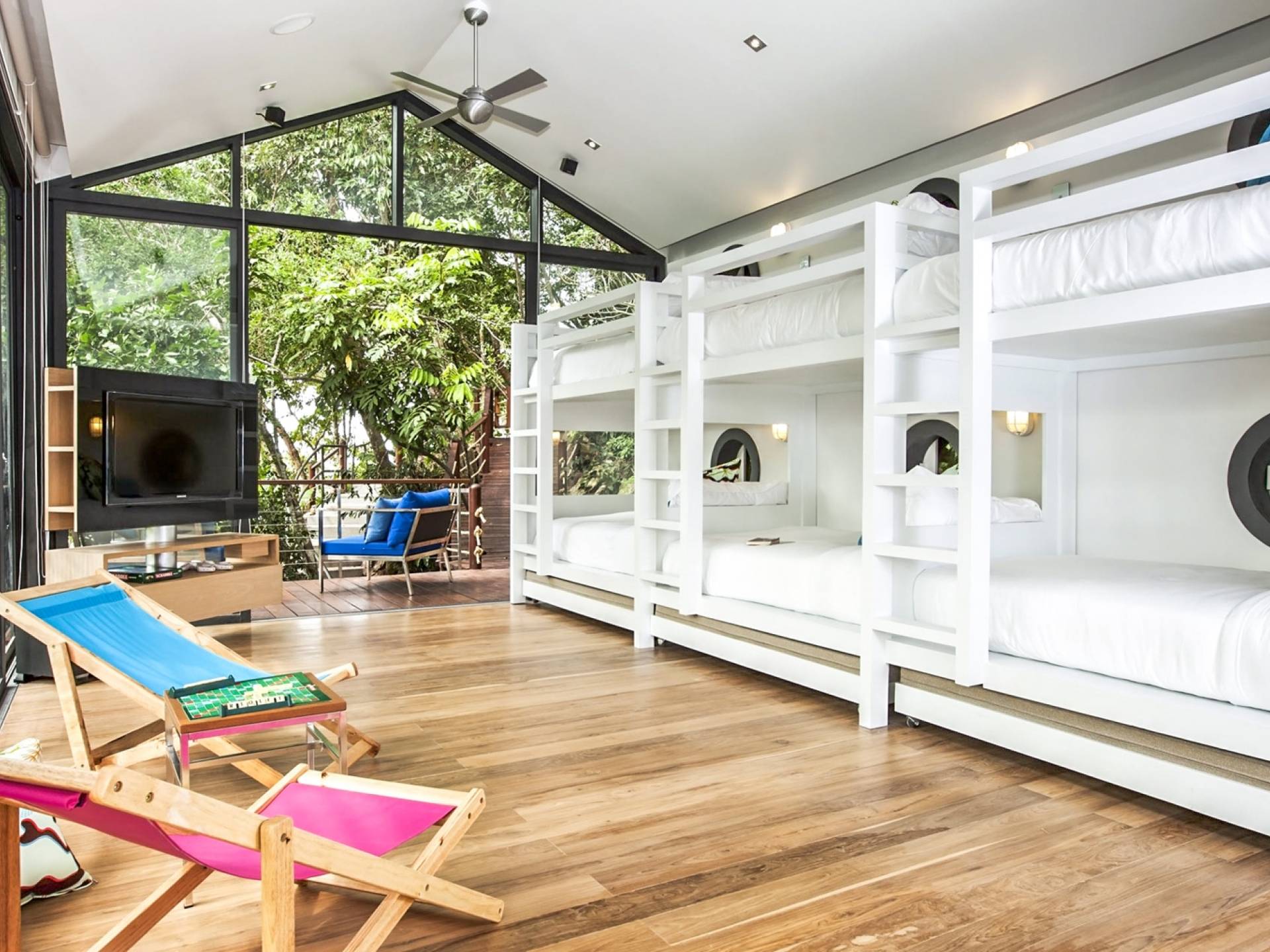 ¿Terraza, bar y más salas de estar? También tendrá muchas opciones con respecto a las habitaciones de invitados: hay dos suites principales tamaño king que vienen con grandes baños en suite, mientras que otras dos habitaciones con baño también son tamaño king, una habitación doble y como si eso no fuera suficiente, un dormitorio infantil especialmente diseñado que puede acomodar tres literas y tres camas plegables, o una cama tamaño king o gemelas. Todas las habitaciones cuentan con balcones privados, ventanas y puertas de vidrio del piso al techo, luces y persianas operadas de forma remota, una pantalla plana de 32", Apple TV, reproductor de DVD, acceso a Internet, una estación de conexión para iPod, además del AV central. feed del sistema. No estamos seguros de que quieras irte.