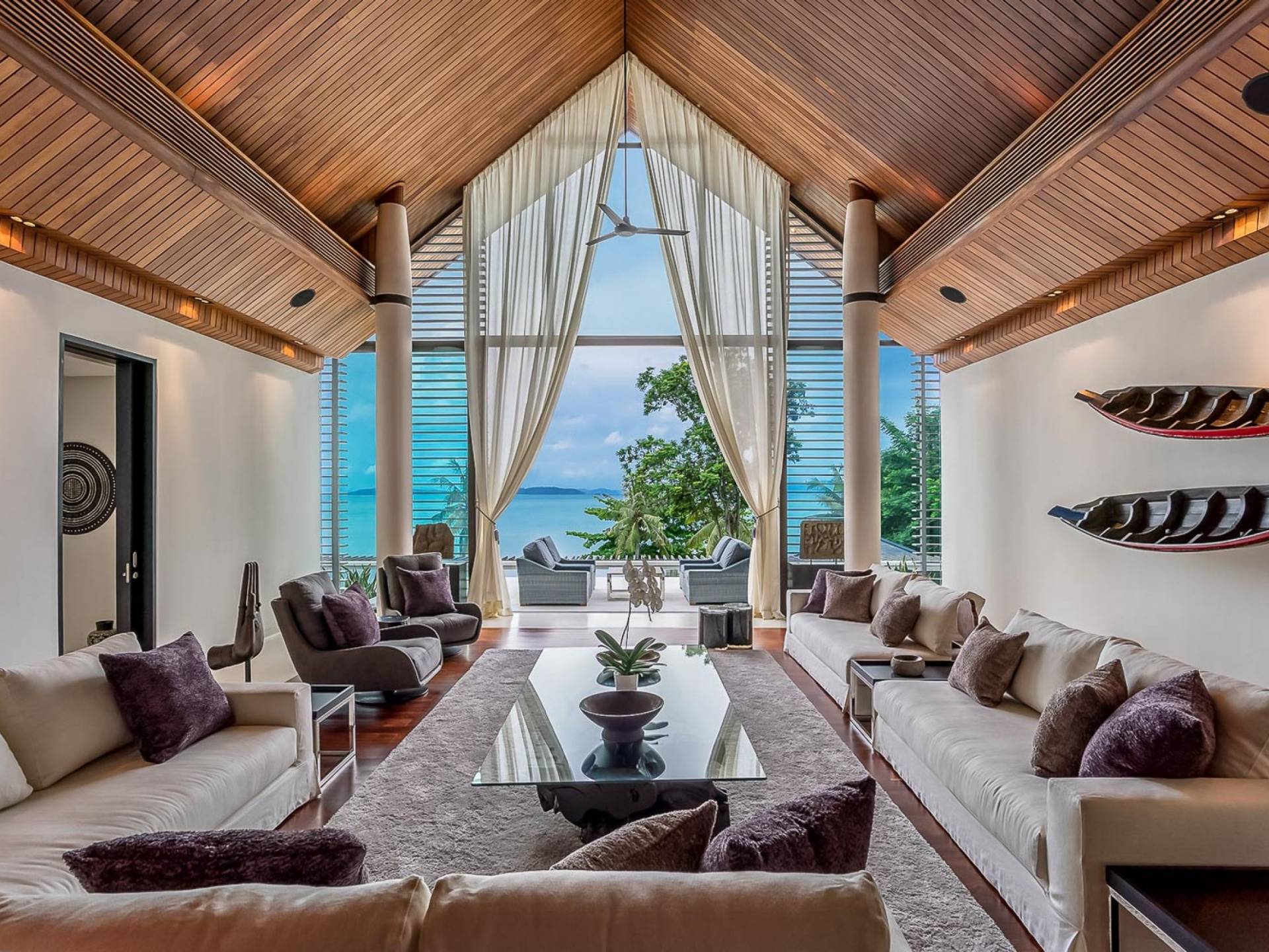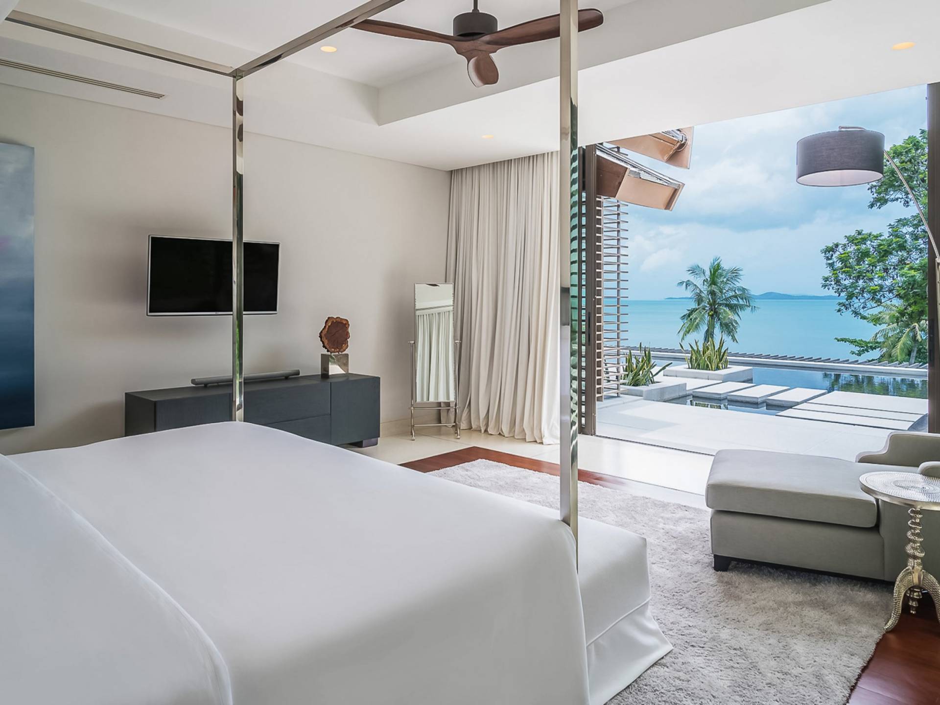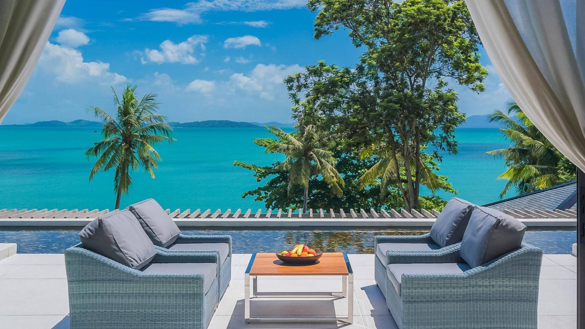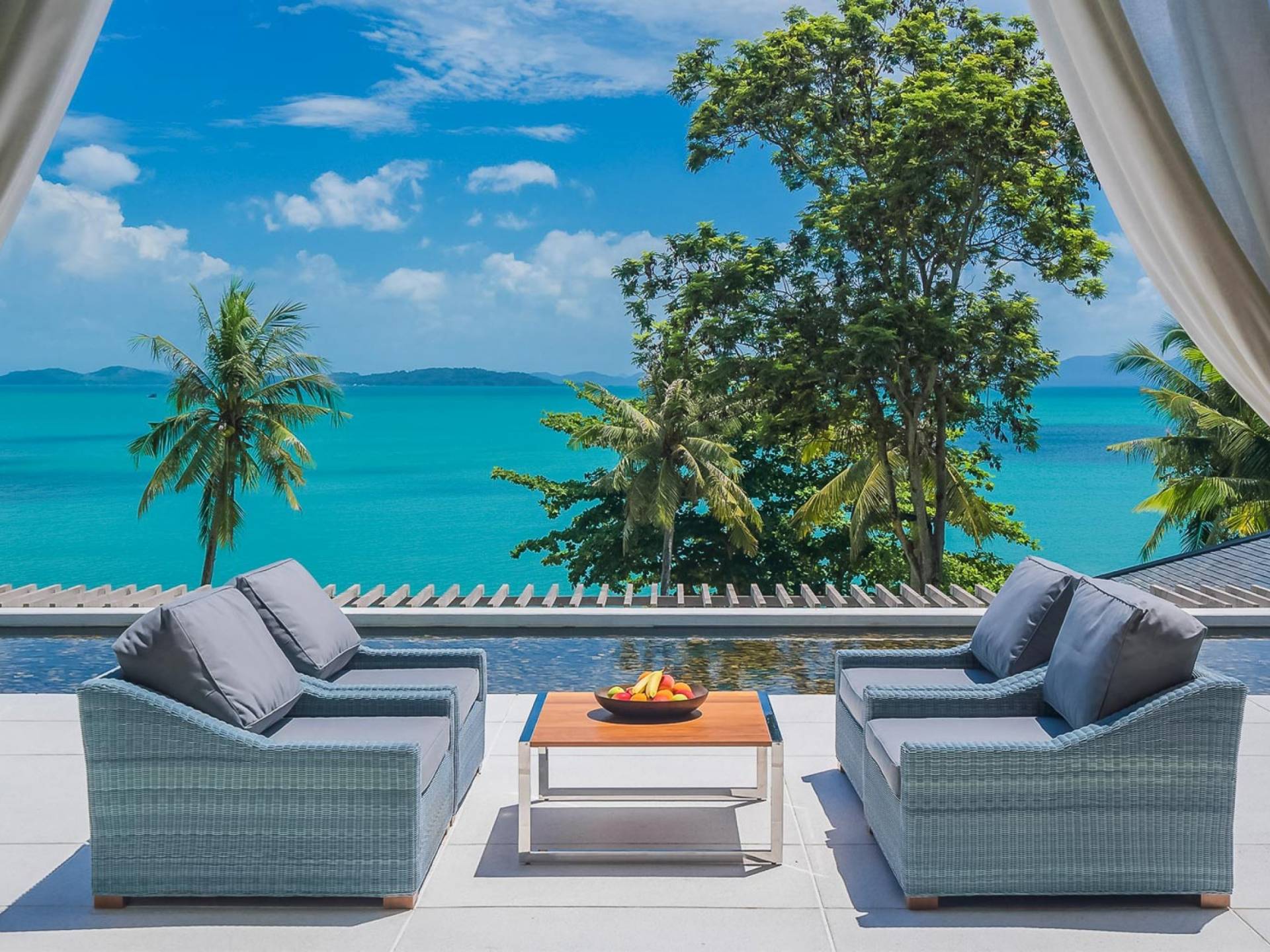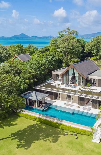 Las 4 luminosas habitaciones con baño disfrutan de vistas cinematográficas. Imagínese despertarse por la mañana y pasar unos momentos en la cama mientras contempla las espectaculares vistas. Villa Naam ofrece lujosos espacios para vivir y comer, mientras que su piscina infinita privada de 30 metros de largo con su bar en la piscina lo dejará asombrado. Amplios jardines con césped y altas palmeras aíslan la villa y ofrecen total privacidad a sus huéspedes. El amable equipo de personal incluye un chef ejecutivo, asistentes de limpieza, personal de servicio y seguridad.