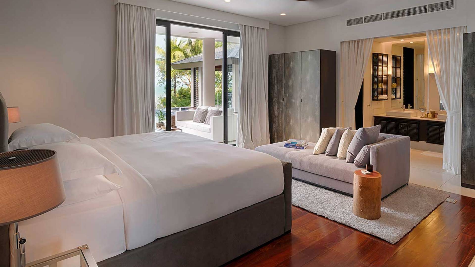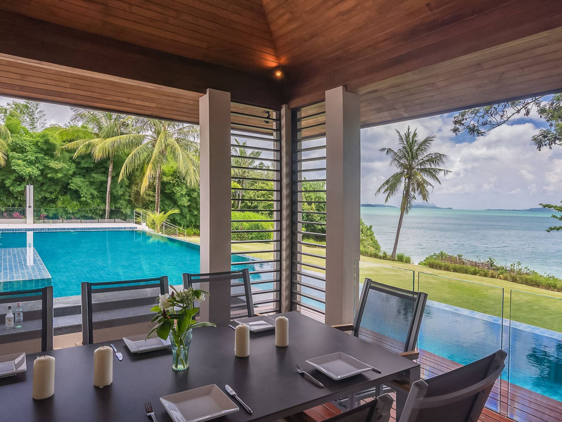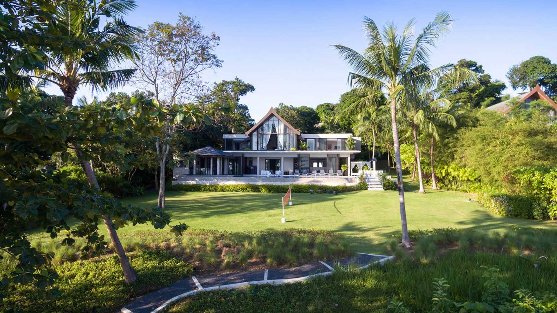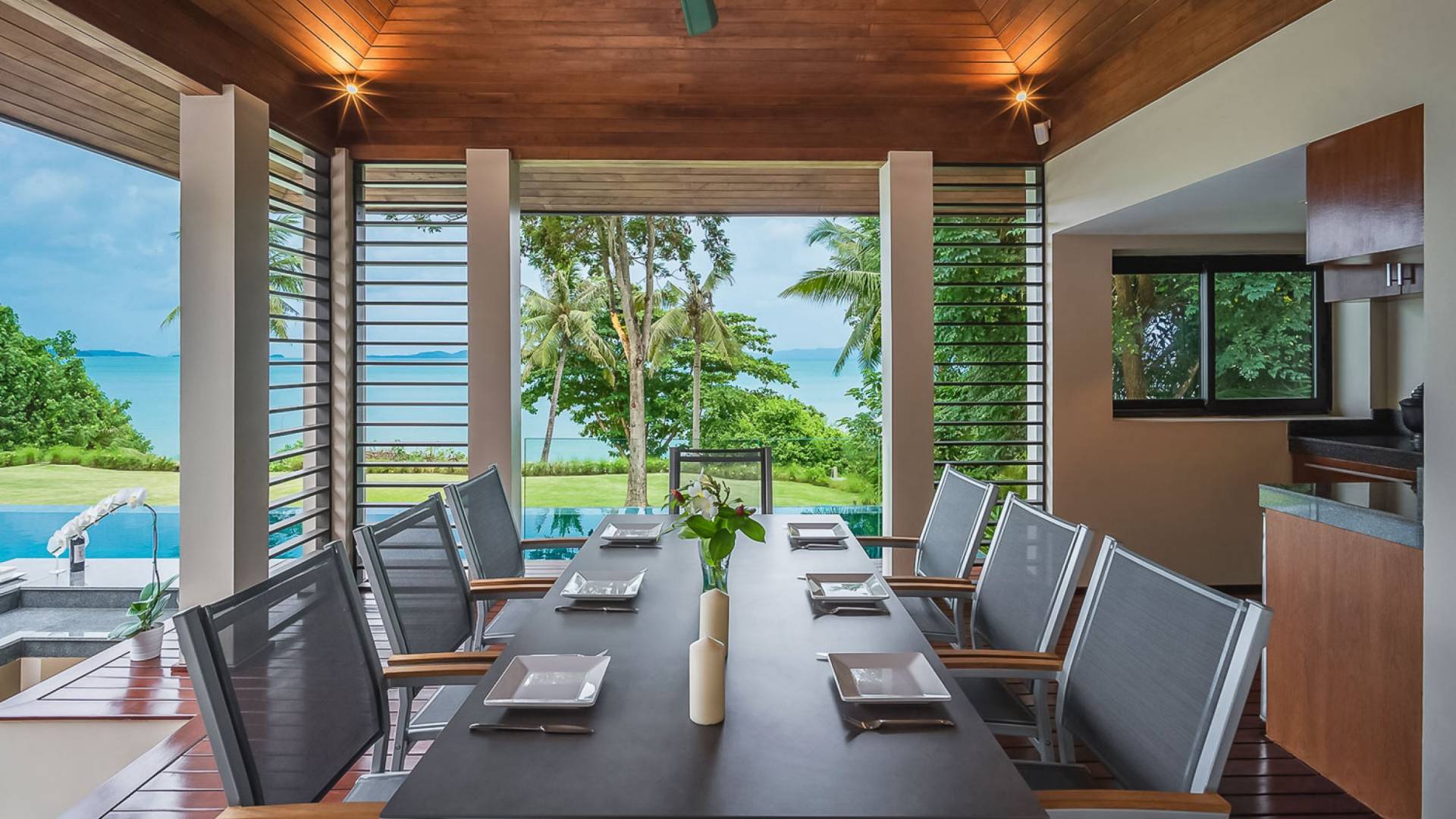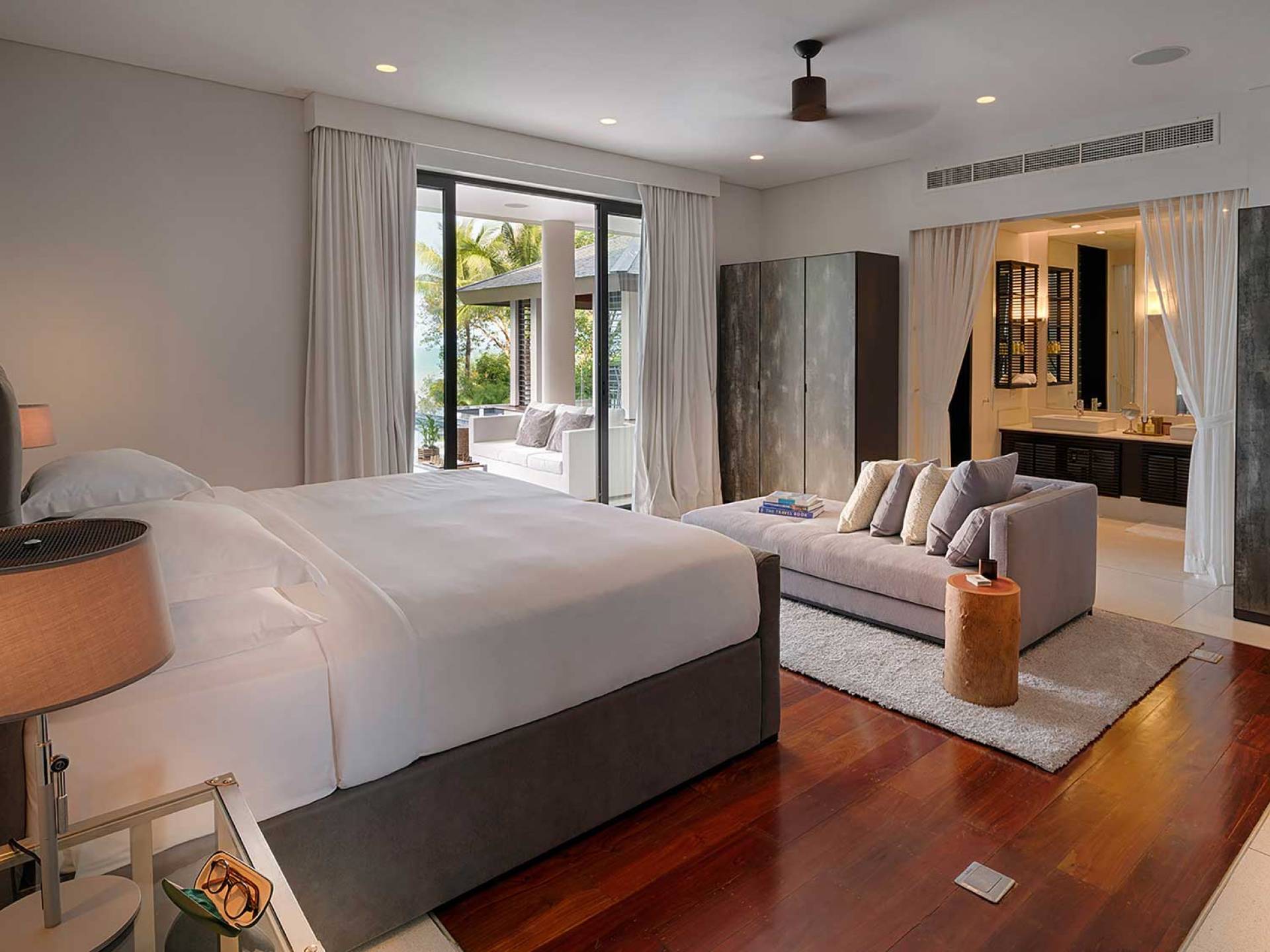 Las 4 luminosas habitaciones con baño disfrutan de vistas cinematográficas. Imagínese despertarse por la mañana y pasar unos momentos en la cama mientras contempla las espectaculares vistas. Villa Naam ofrece lujosos espacios para vivir y comer, mientras que su piscina infinita privada de 30 metros de largo con su bar en la piscina lo dejará asombrado. Amplios jardines con césped y altas palmeras aíslan la villa y ofrecen total privacidad a sus huéspedes. El amable equipo de personal incluye un chef ejecutivo, asistentes de limpieza, personal de servicio y seguridad.