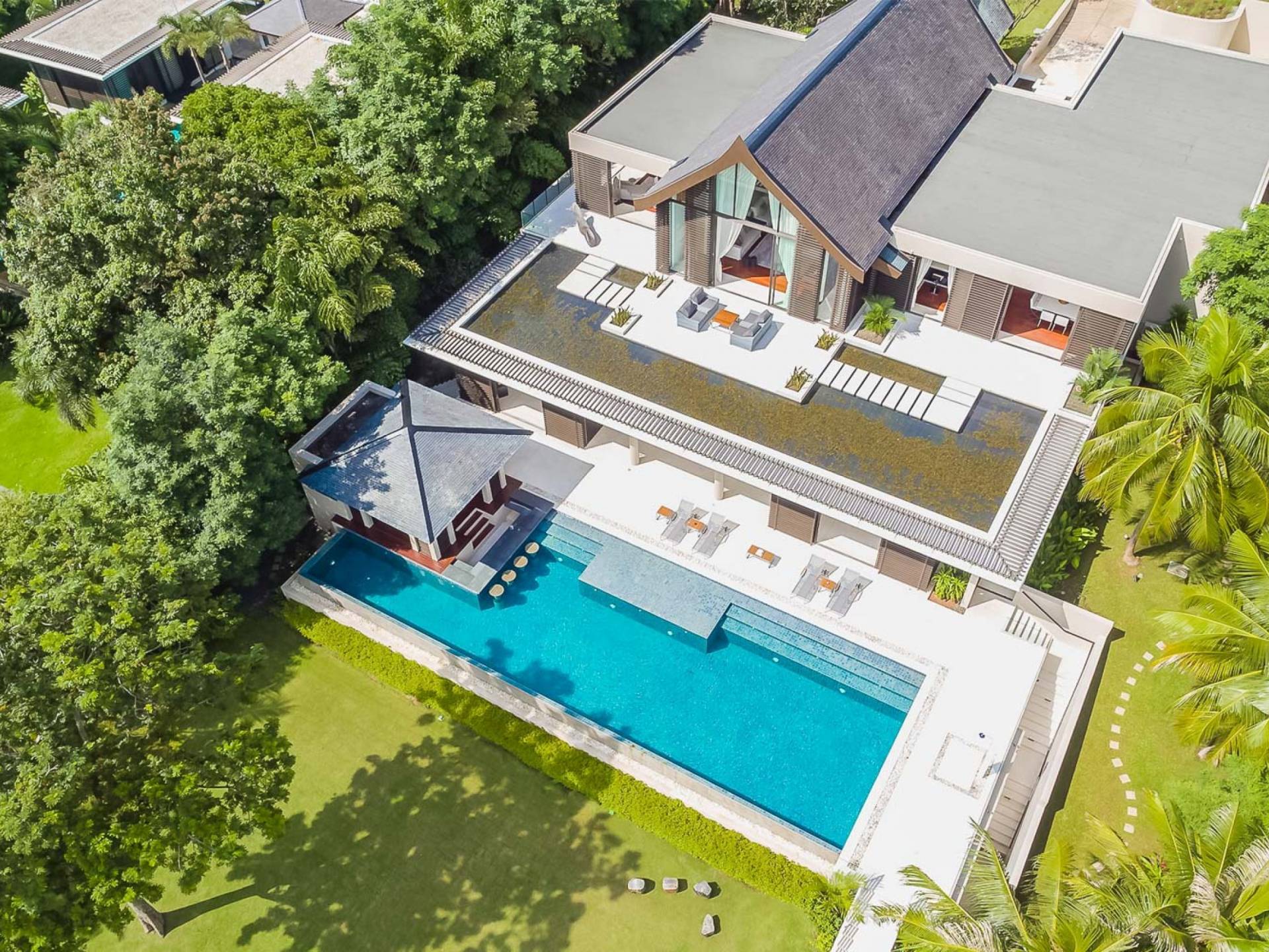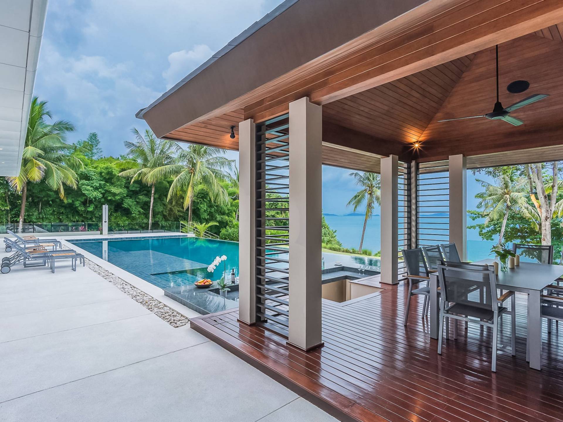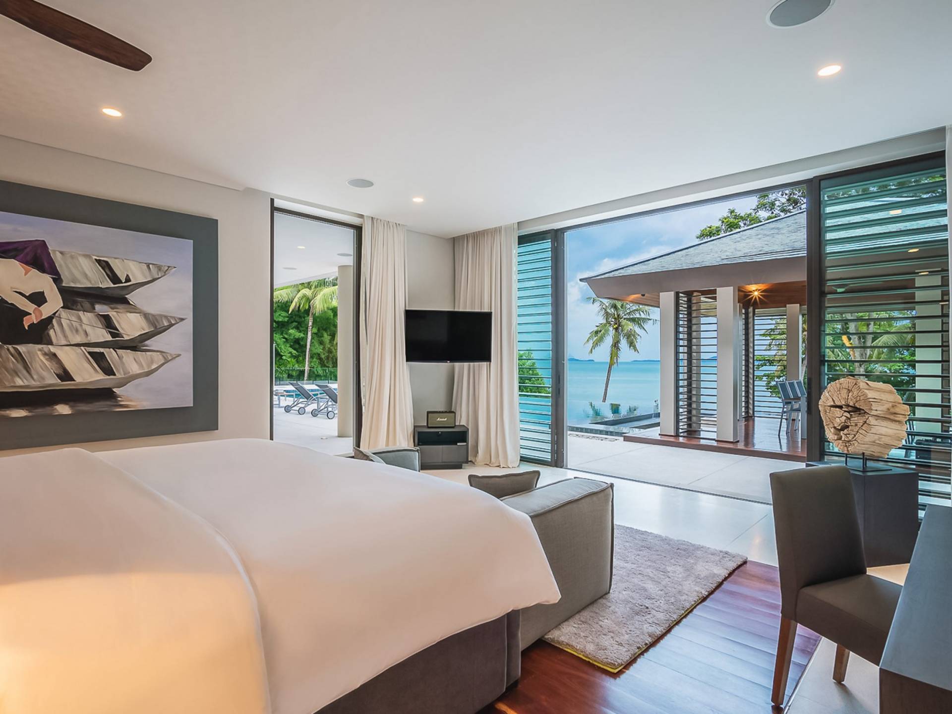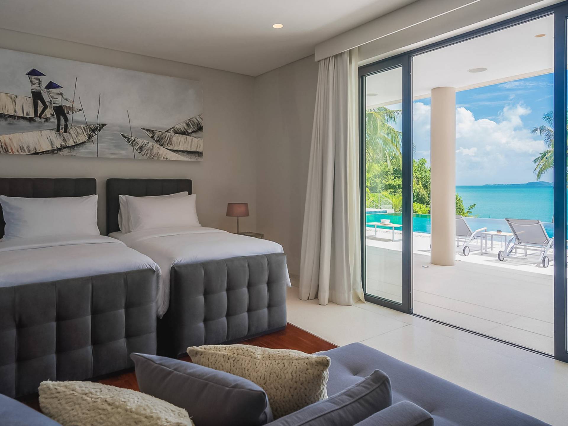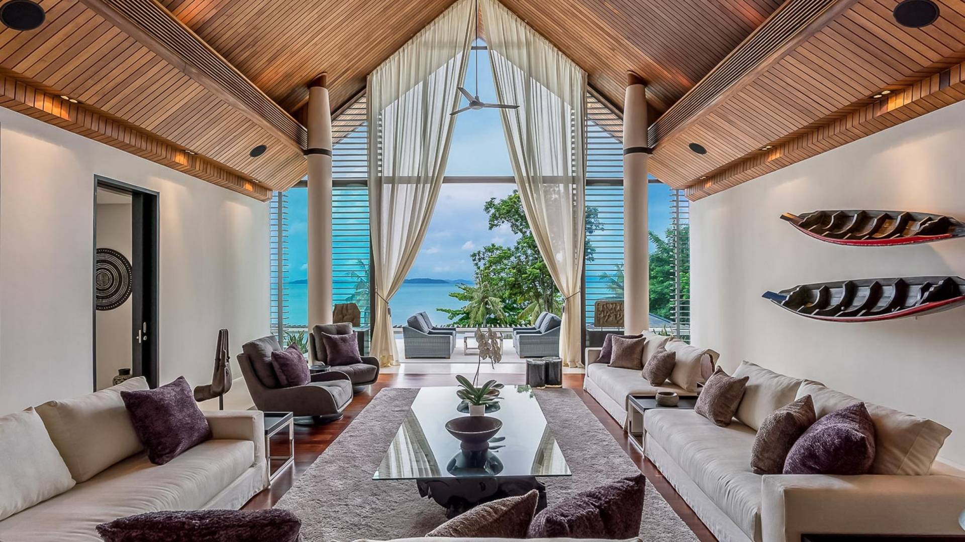 Las 4 luminosas habitaciones con baño disfrutan de vistas cinematográficas. Imagínese despertarse por la mañana y pasar unos momentos en la cama mientras contempla las espectaculares vistas. Villa Naam ofrece lujosos espacios para vivir y comer, mientras que su piscina infinita privada de 30 metros de largo con su bar en la piscina lo dejará asombrado. Amplios jardines con césped y altas palmeras aíslan la villa y ofrecen total privacidad a sus huéspedes. El amable equipo de personal incluye un chef ejecutivo, asistentes de limpieza, personal de servicio y seguridad.