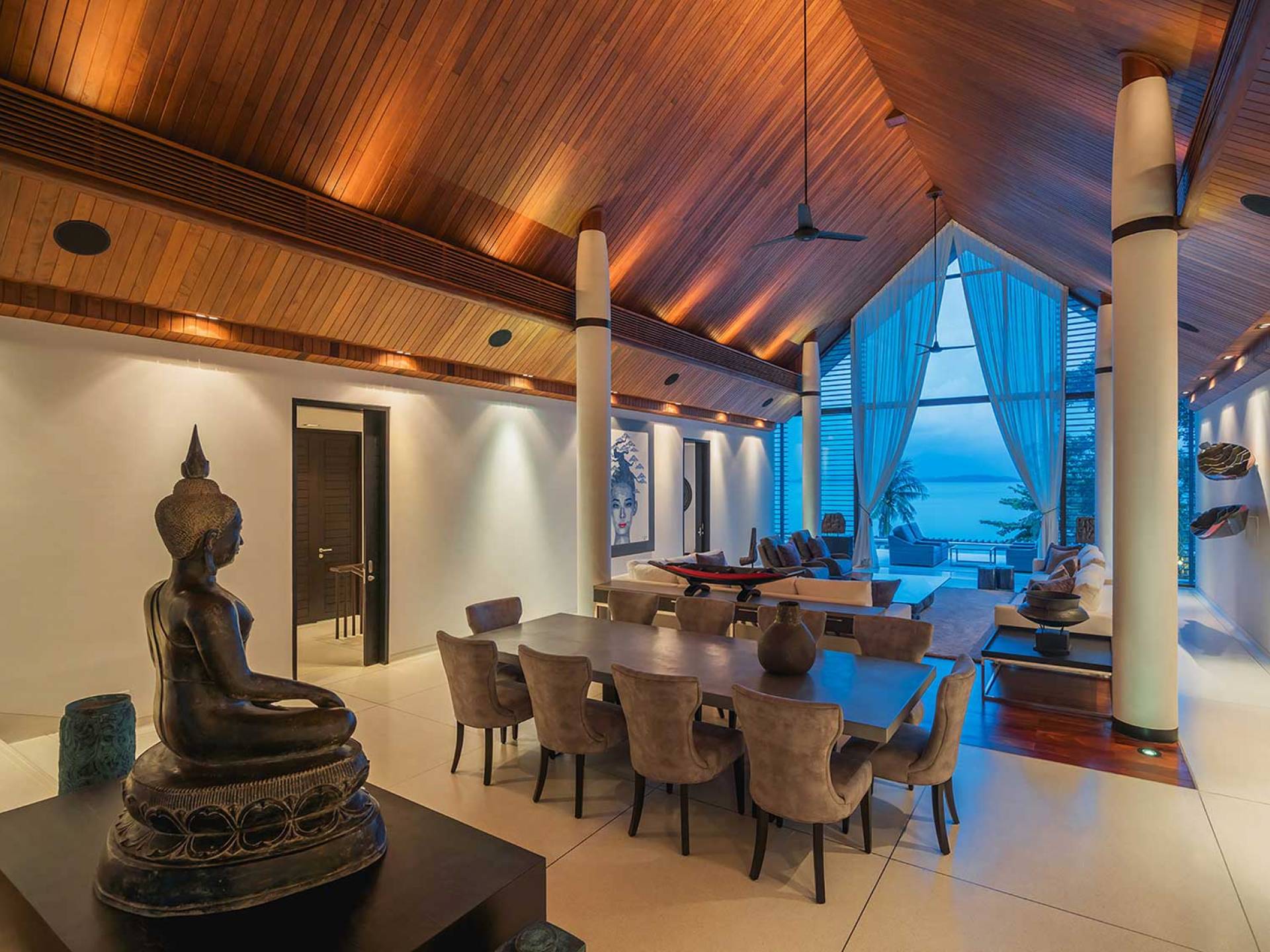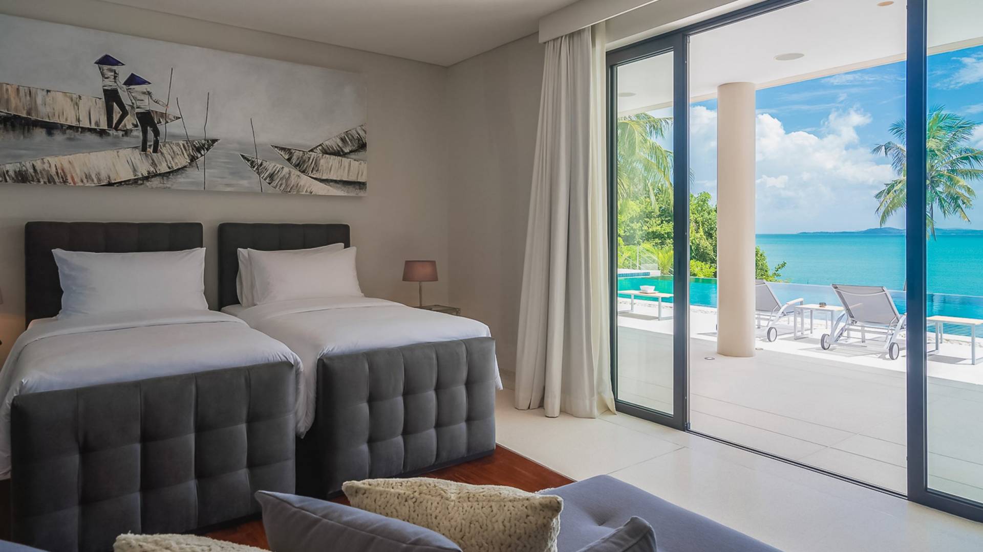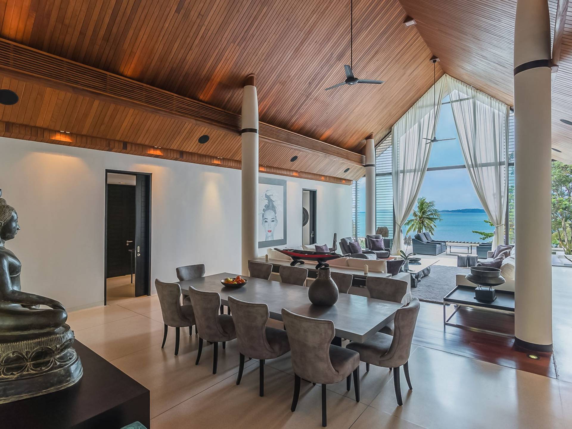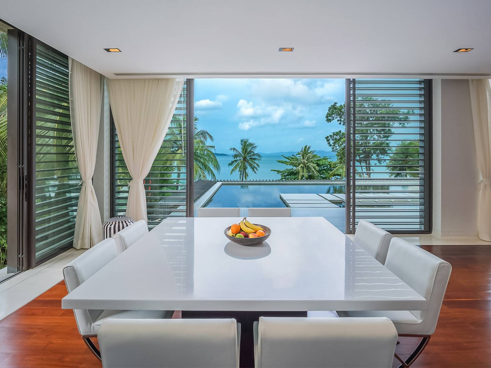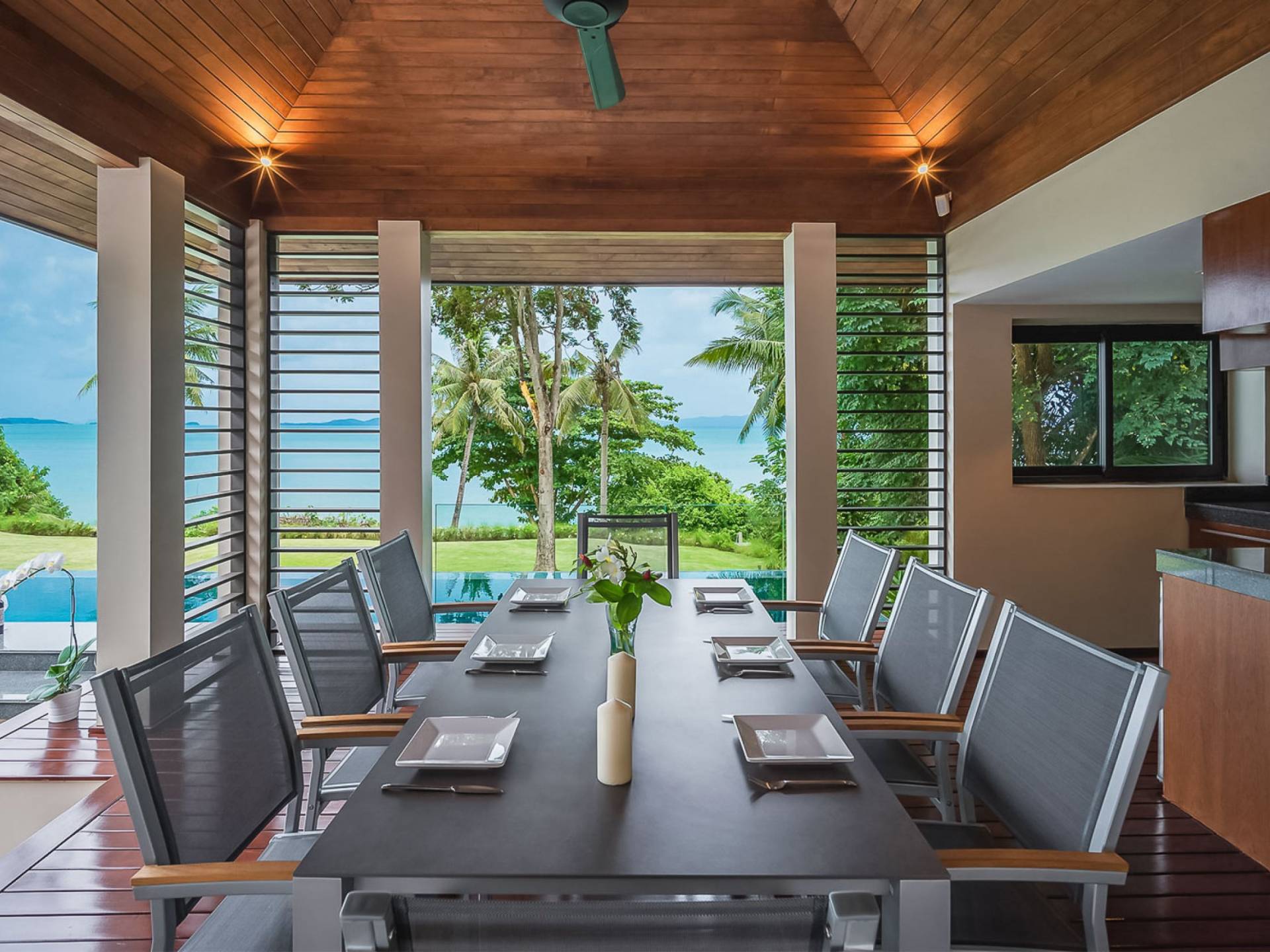 Las 4 luminosas habitaciones con baño disfrutan de vistas cinematográficas. Imagínese despertarse por la mañana y pasar unos momentos en la cama mientras contempla las espectaculares vistas. Villa Naam ofrece lujosos espacios para vivir y comer, mientras que su piscina infinita privada de 30 metros de largo con su bar en la piscina lo dejará asombrado. Amplios jardines con césped y altas palmeras aíslan la villa y ofrecen total privacidad a sus huéspedes. El amable equipo de personal incluye un chef ejecutivo, asistentes de limpieza, personal de servicio y seguridad.