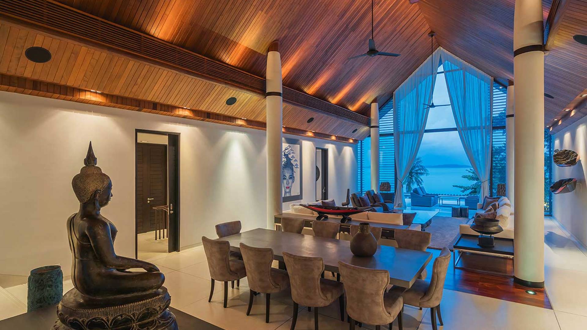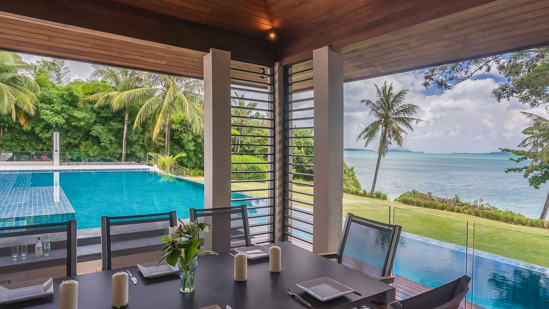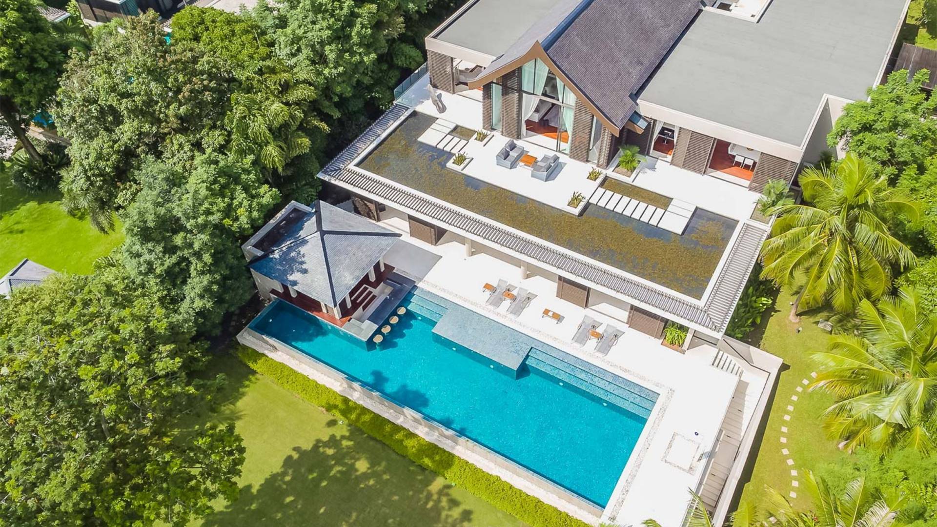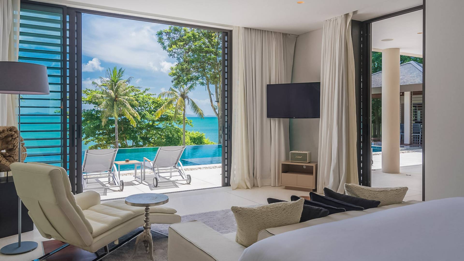 Las 4 luminosas habitaciones con baño disfrutan de vistas cinematográficas. Imagínese despertarse por la mañana y pasar unos momentos en la cama mientras contempla las espectaculares vistas. Villa Naam ofrece lujosos espacios para vivir y comer, mientras que su piscina infinita privada de 30 metros de largo con su bar en la piscina lo dejará asombrado. Amplios jardines con césped y altas palmeras aíslan la villa y ofrecen total privacidad a sus huéspedes. El amable equipo de personal incluye un chef ejecutivo, asistentes de limpieza, personal de servicio y seguridad.