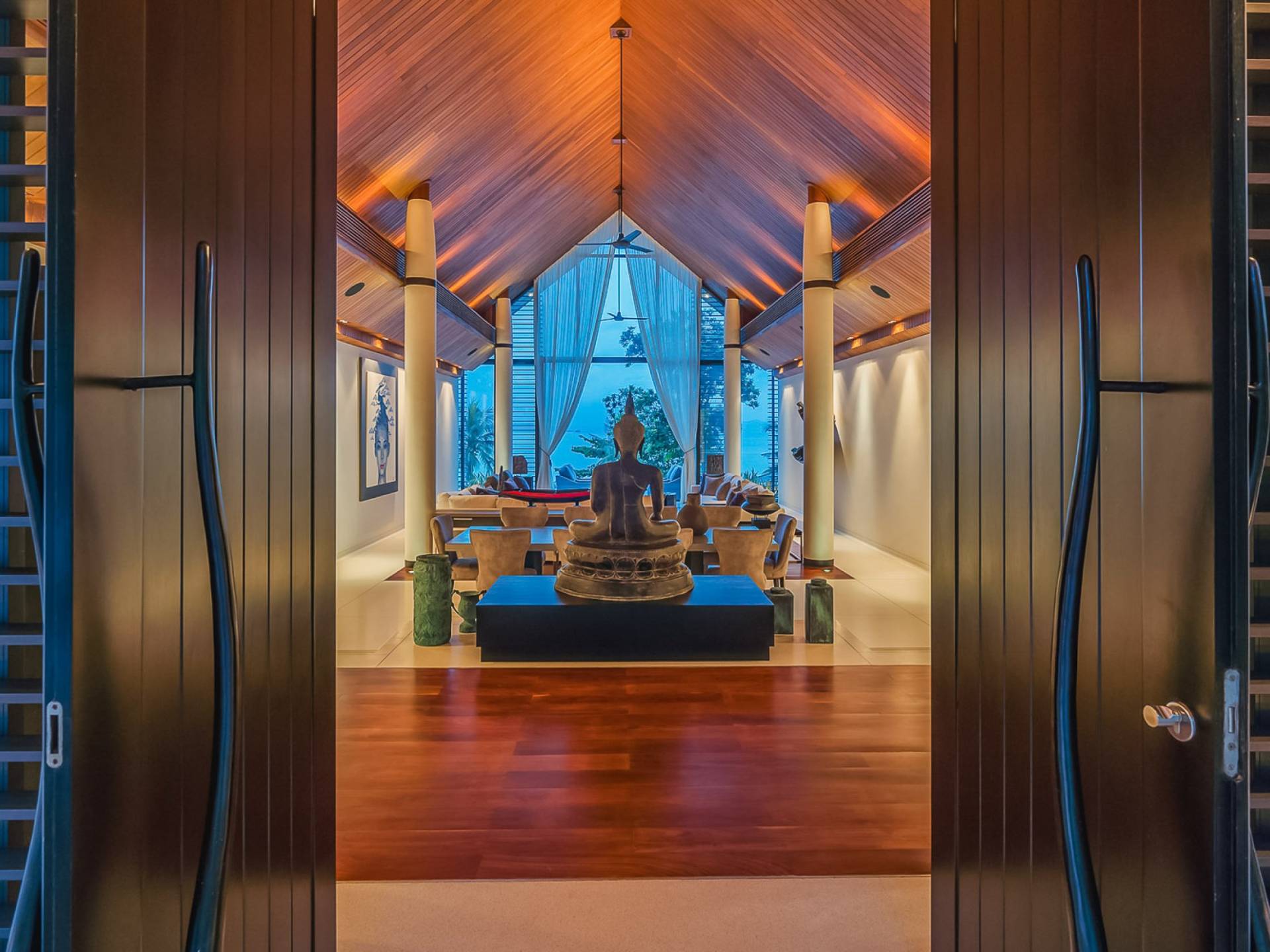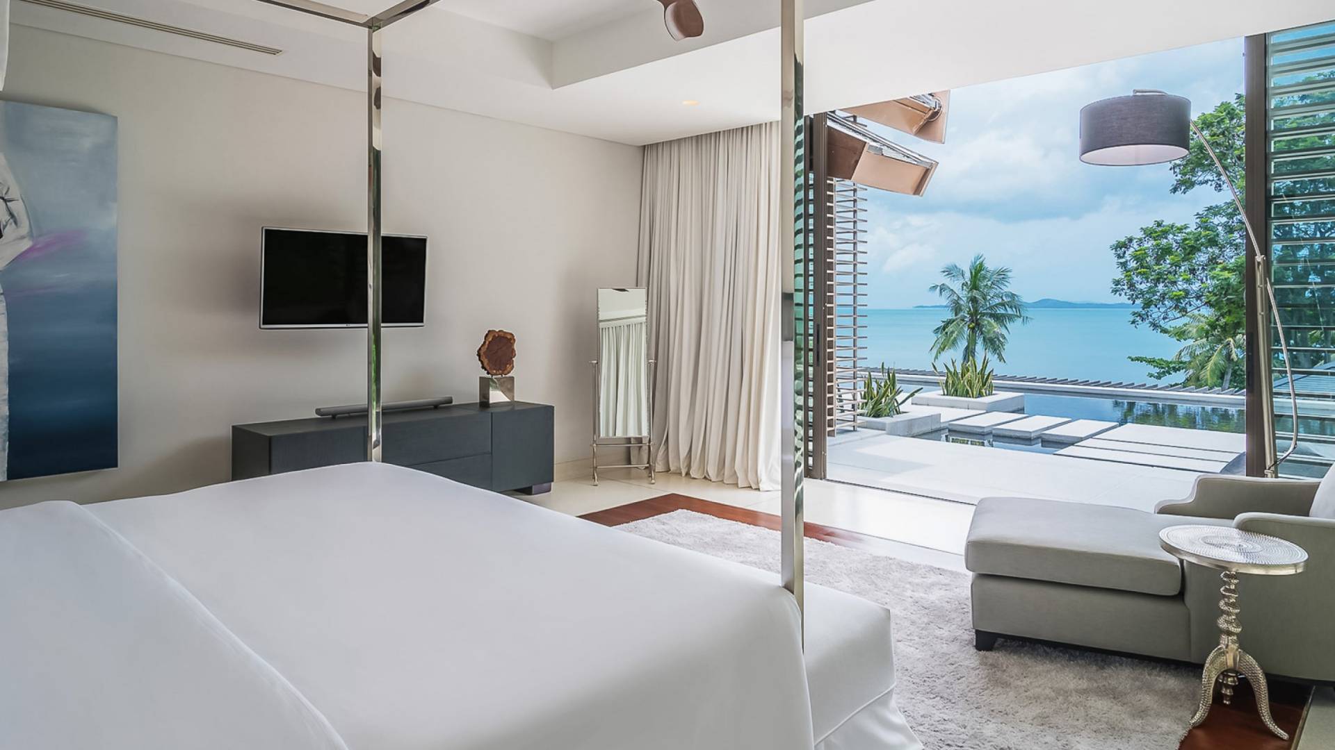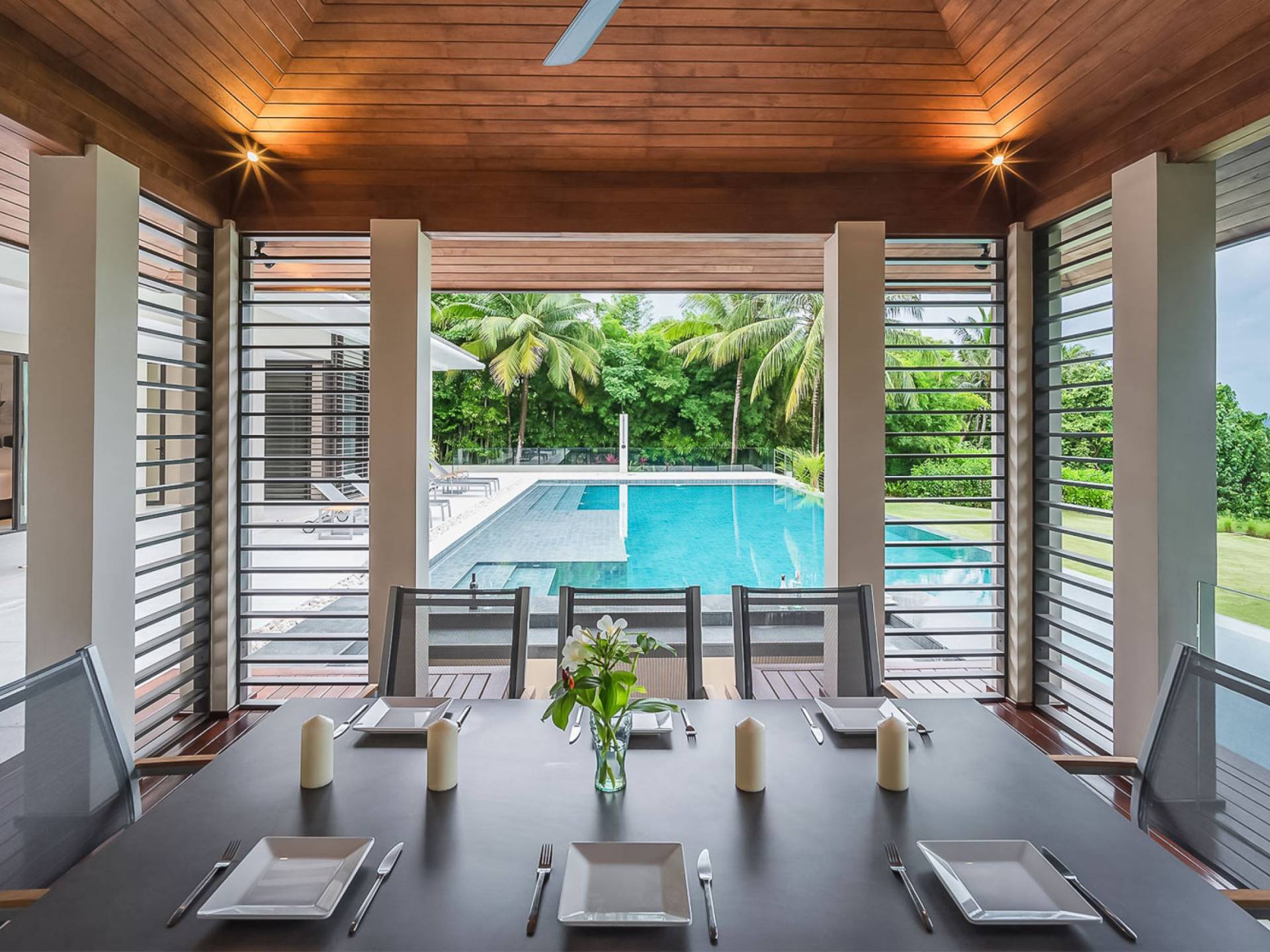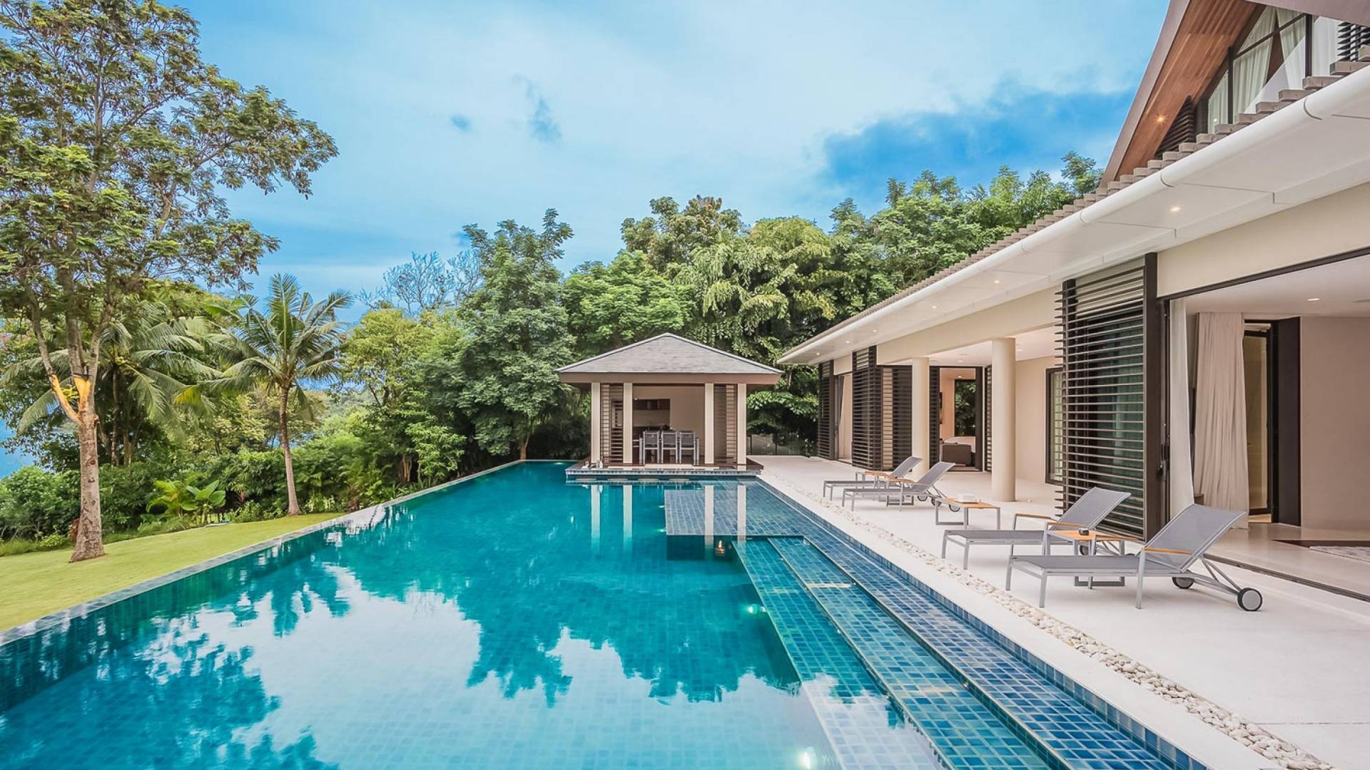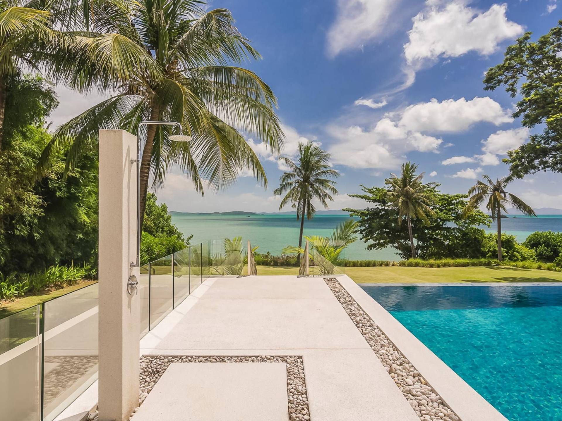 Las 4 luminosas habitaciones con baño disfrutan de vistas cinematográficas. Imagínese despertarse por la mañana y pasar unos momentos en la cama mientras contempla las espectaculares vistas. Villa Naam ofrece lujosos espacios para vivir y comer, mientras que su piscina infinita privada de 30 metros de largo con su bar en la piscina lo dejará asombrado. Amplios jardines con césped y altas palmeras aíslan la villa y ofrecen total privacidad a sus huéspedes. El amable equipo de personal incluye un chef ejecutivo, asistentes de limpieza, personal de servicio y seguridad.
